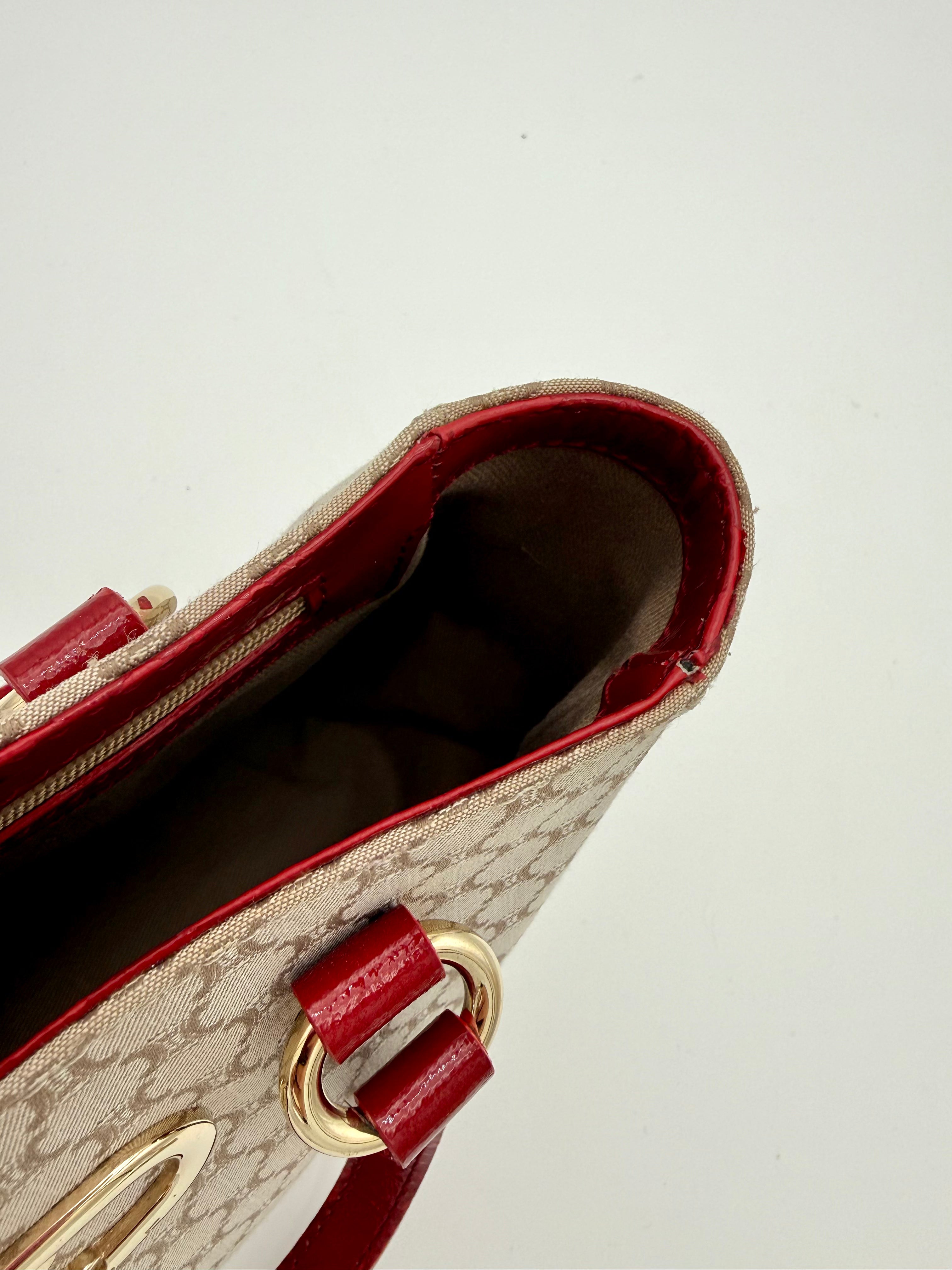 Tweedehands CELINE macadam canvas hand bag met lakleren handvaten in een mooie fel rode kleur. De tas beschikt over een binnenvakje met rits. Het item verkeert in een zeer goede vintage staat, met algemene gebruikssporen. De tas wordt geleverd in onze mooie Moon flower dustbag.