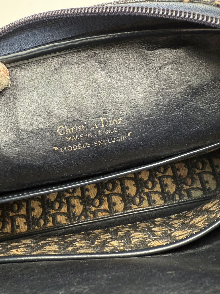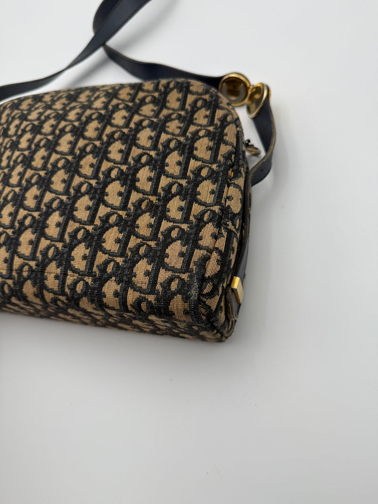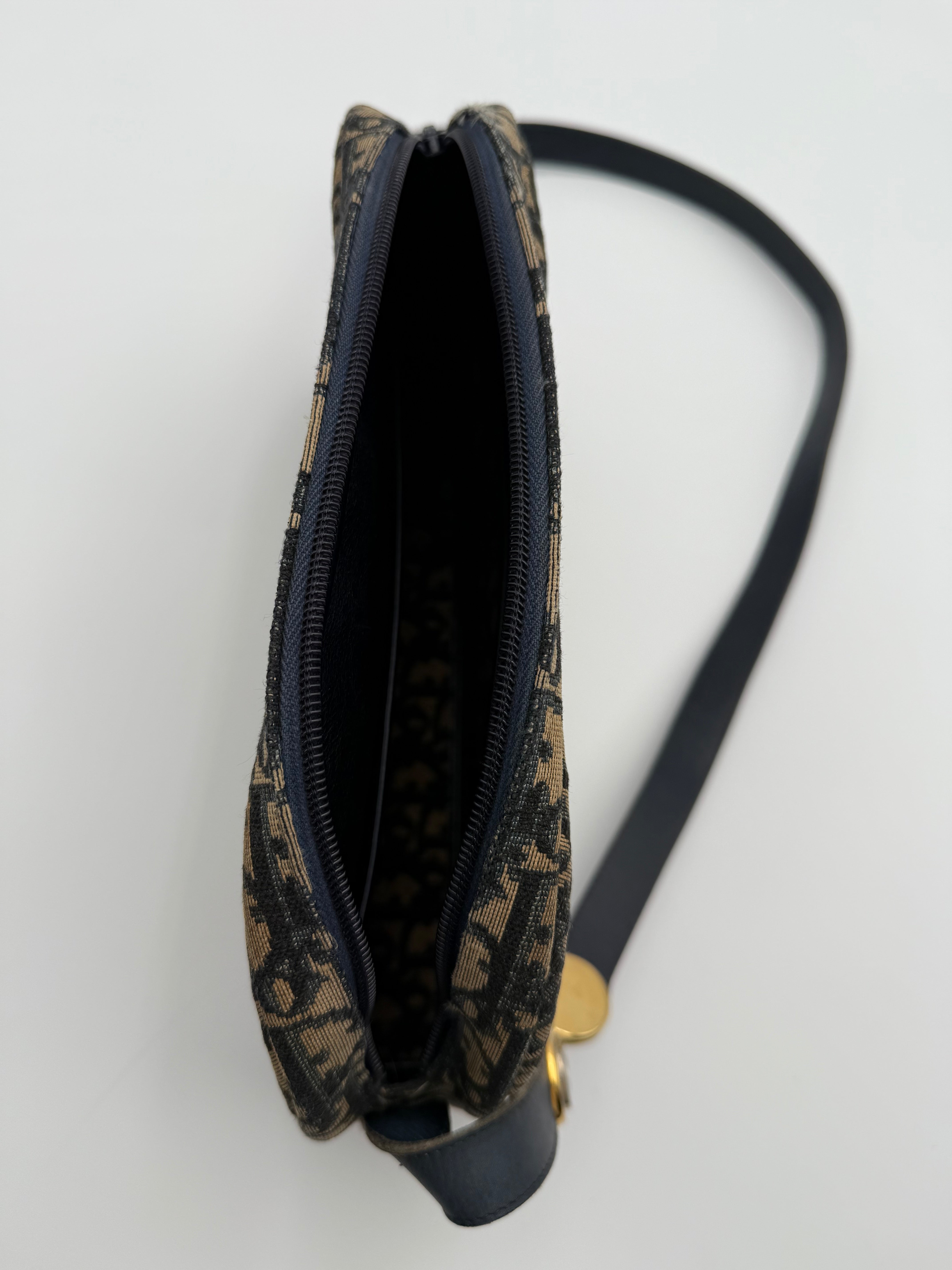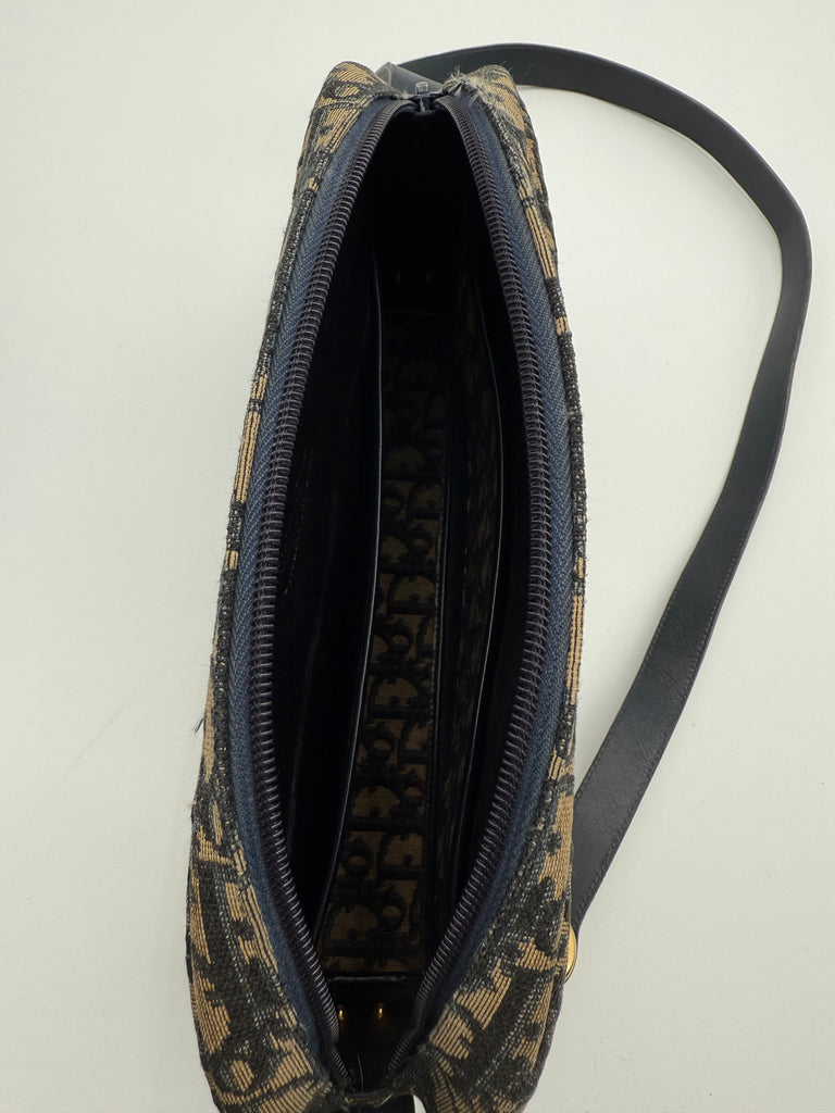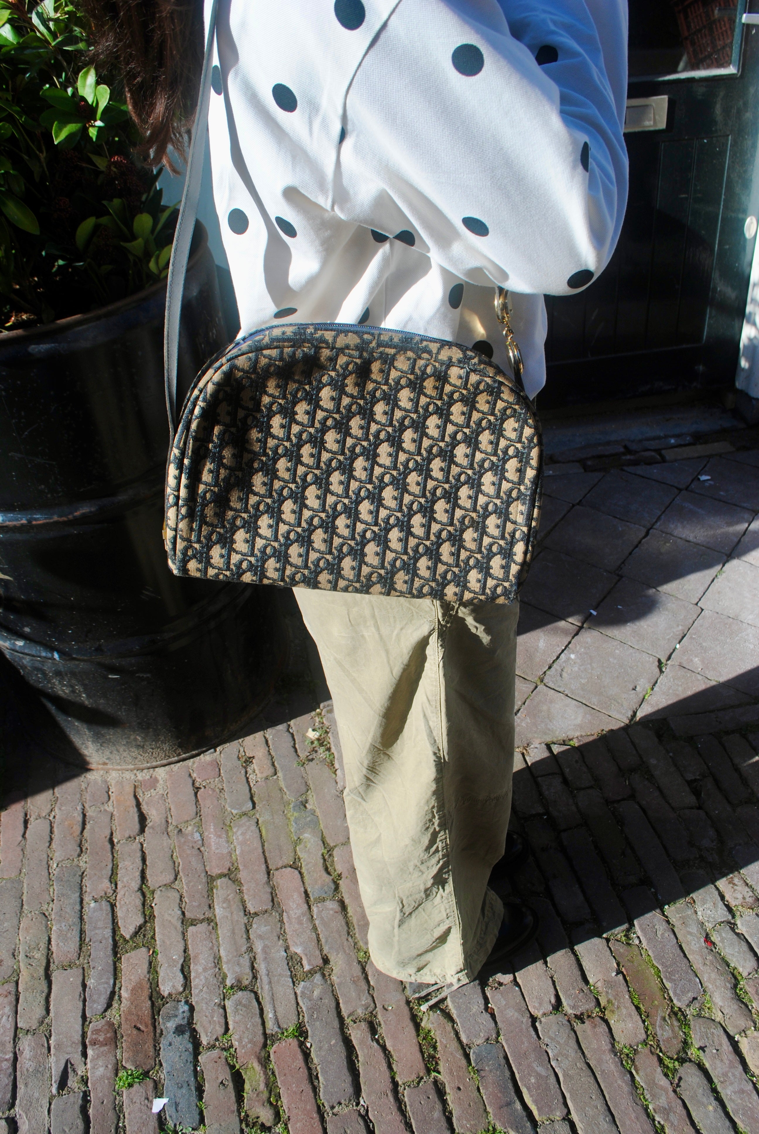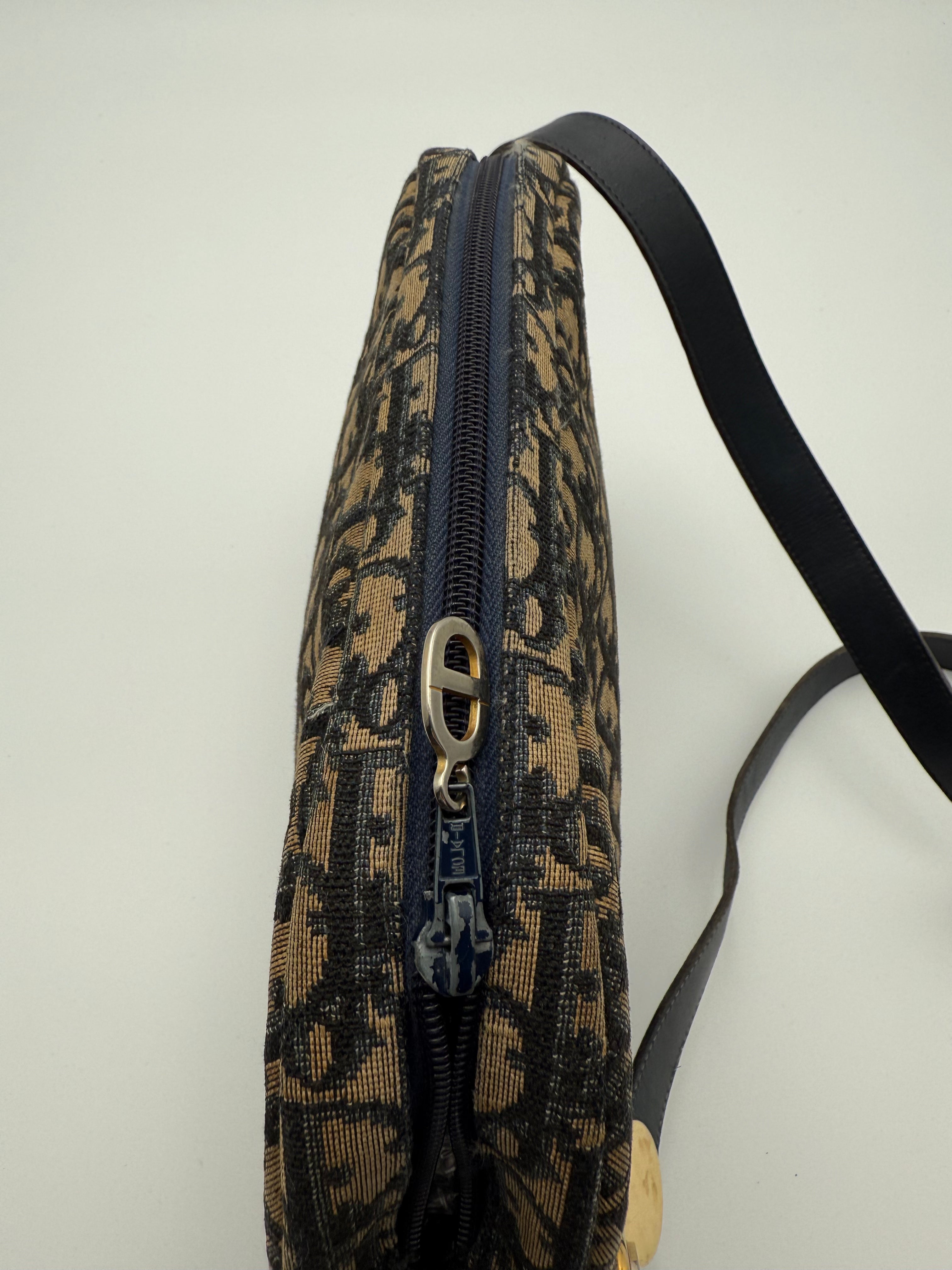 Tweedehands Christian Dior Trotter Canvas bag in de kleur blauw/beige met gouden hardware. De tas sluit met een rits en kan als schoudertas of als een crossbody gedragen worden. De tas beschikt over twee binnenvakjes. Het item verkeert in een zeer goede vintage staat, met algemene gebruikssporen. De tas wordt geleverd in onze mooie Moon flower dustbag.
