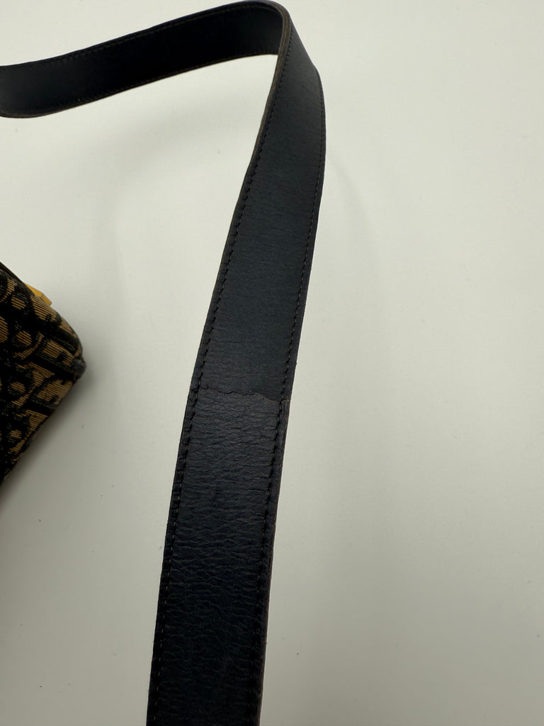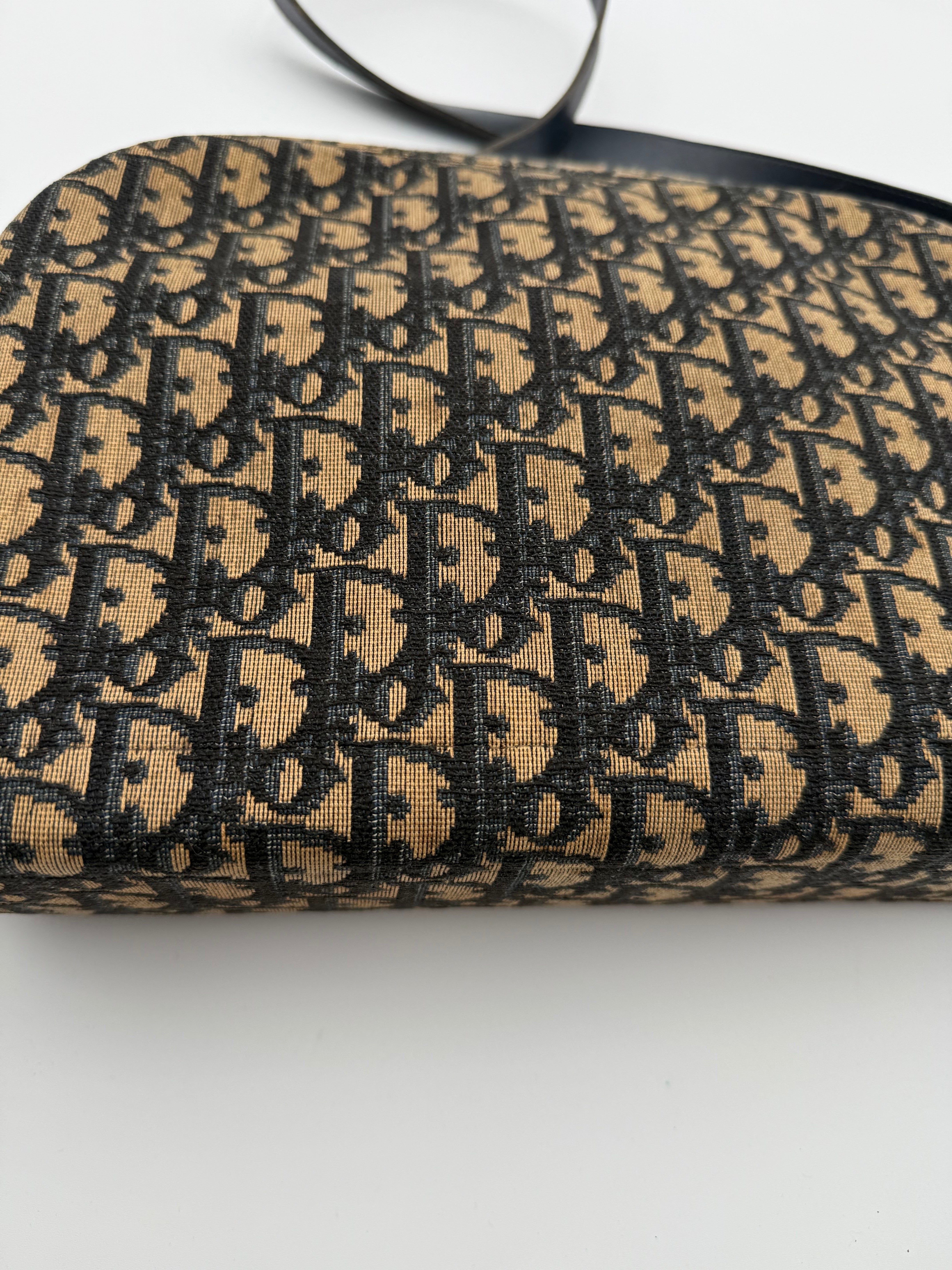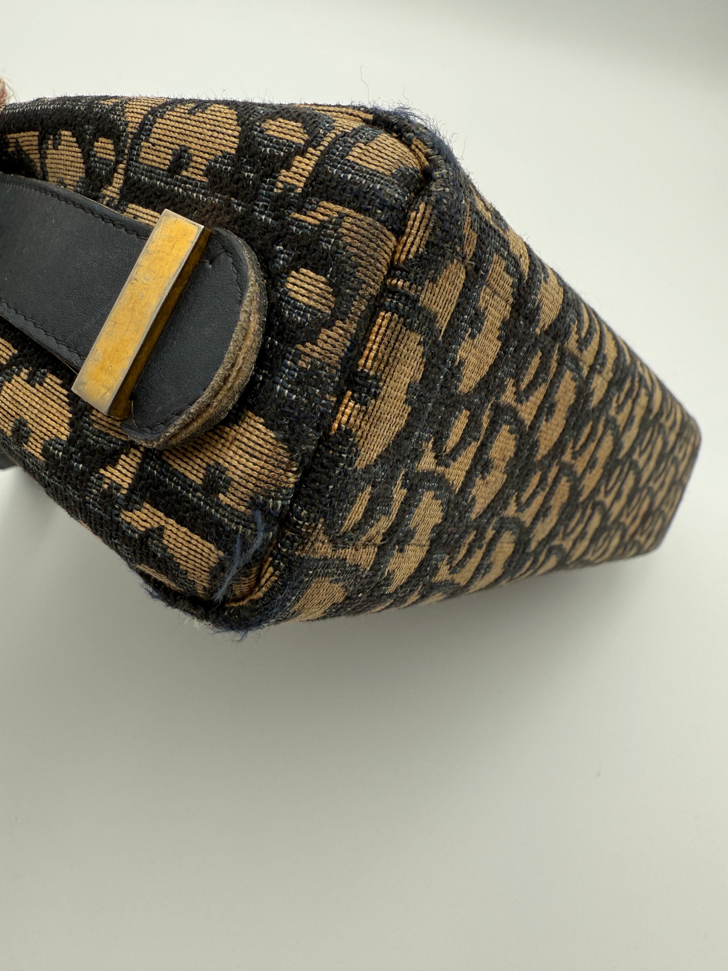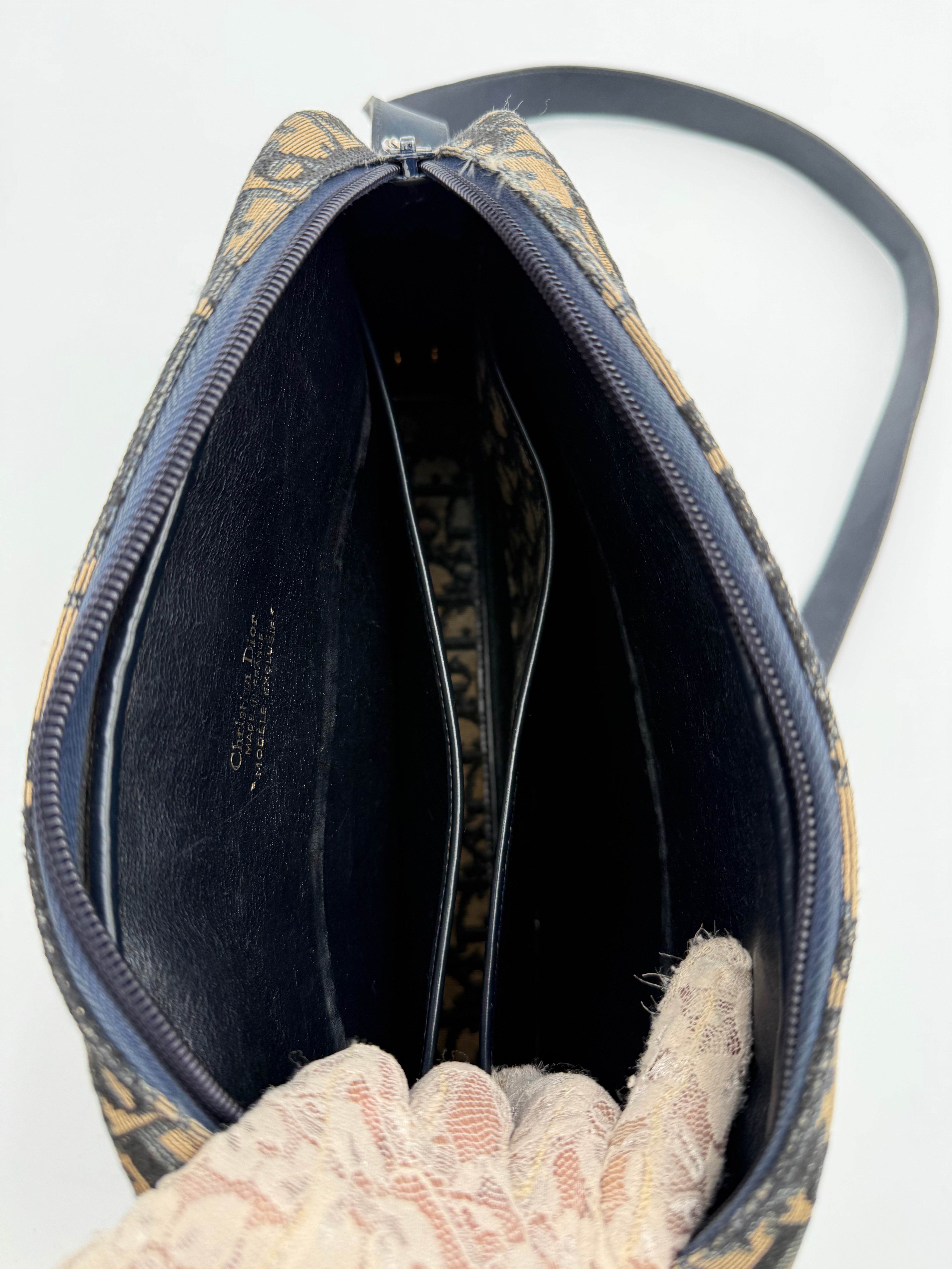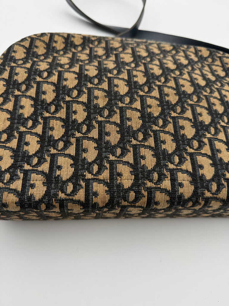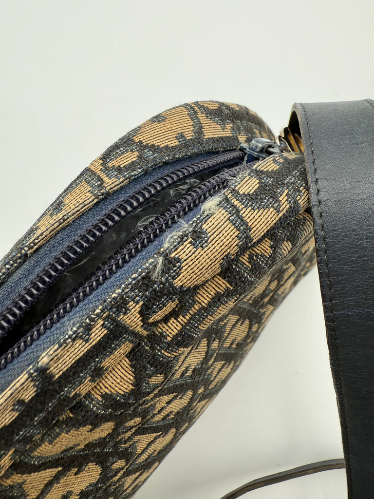 Tweedehands Christian Dior Trotter Canvas bag in de kleur blauw/beige met gouden hardware. De tas sluit met een rits en kan als schoudertas of als een crossbody gedragen worden. De tas beschikt over twee binnenvakjes. Het item verkeert in een zeer goede vintage staat, met algemene gebruikssporen. De tas wordt geleverd in onze mooie Moon flower dustbag.