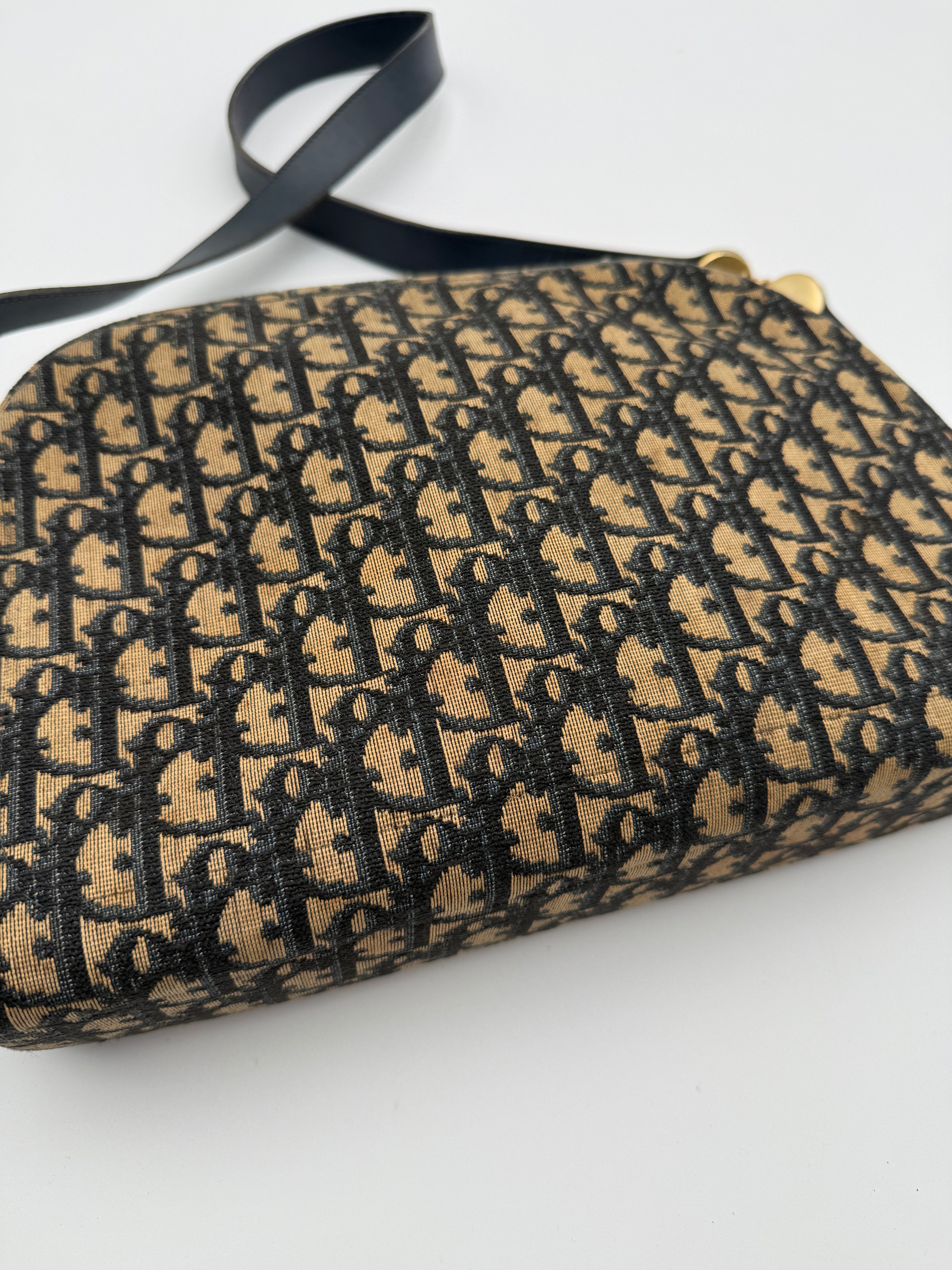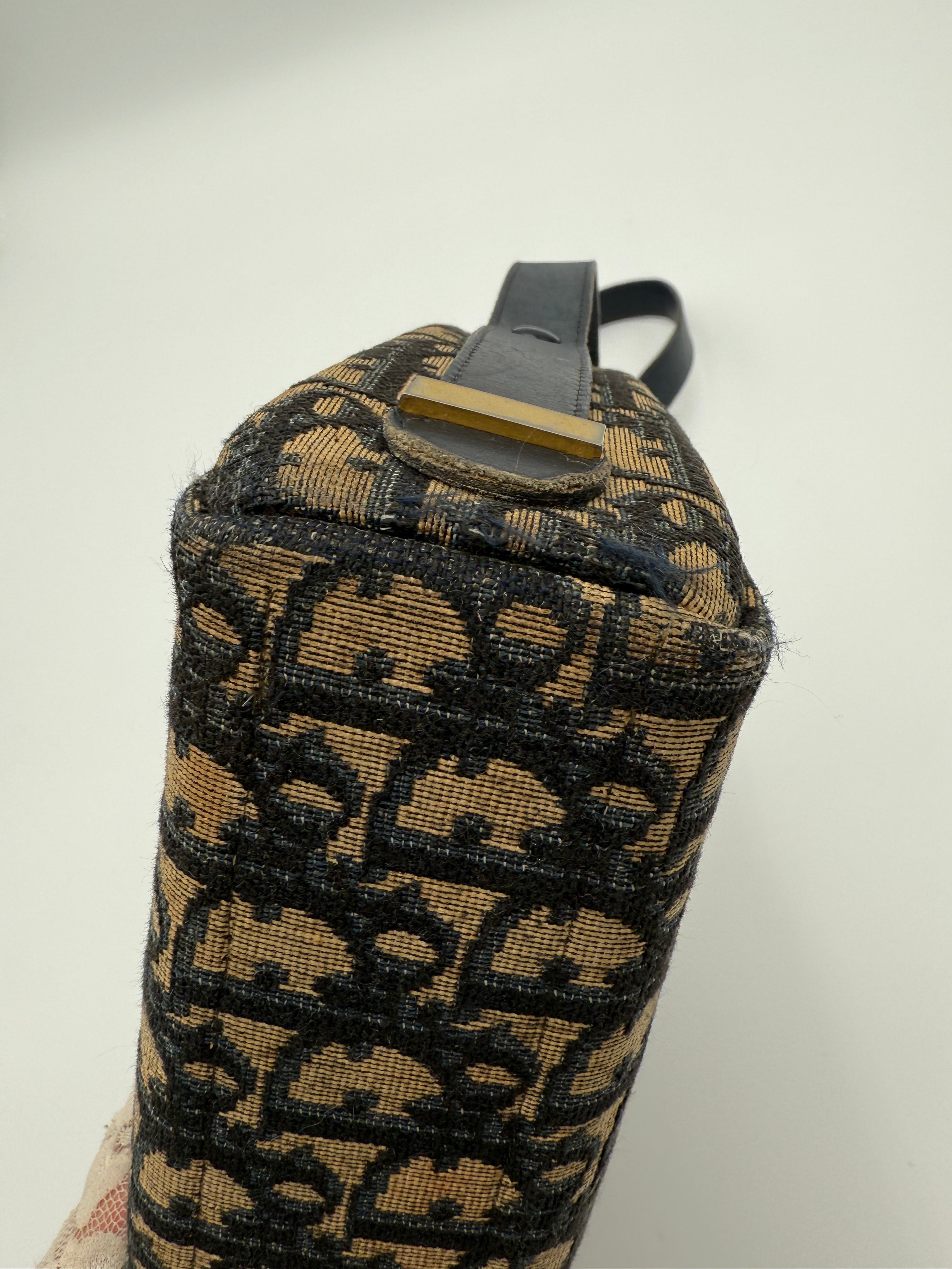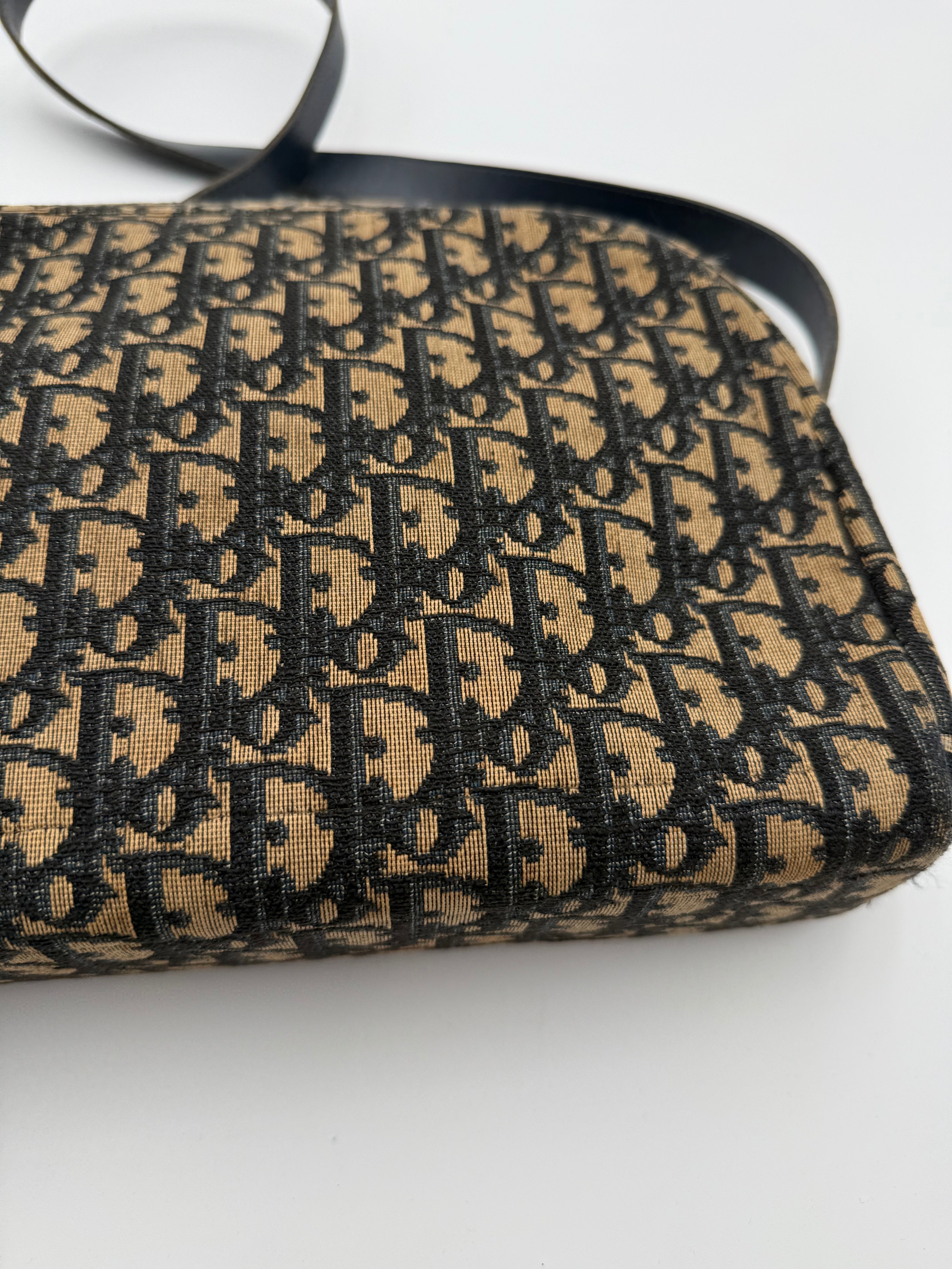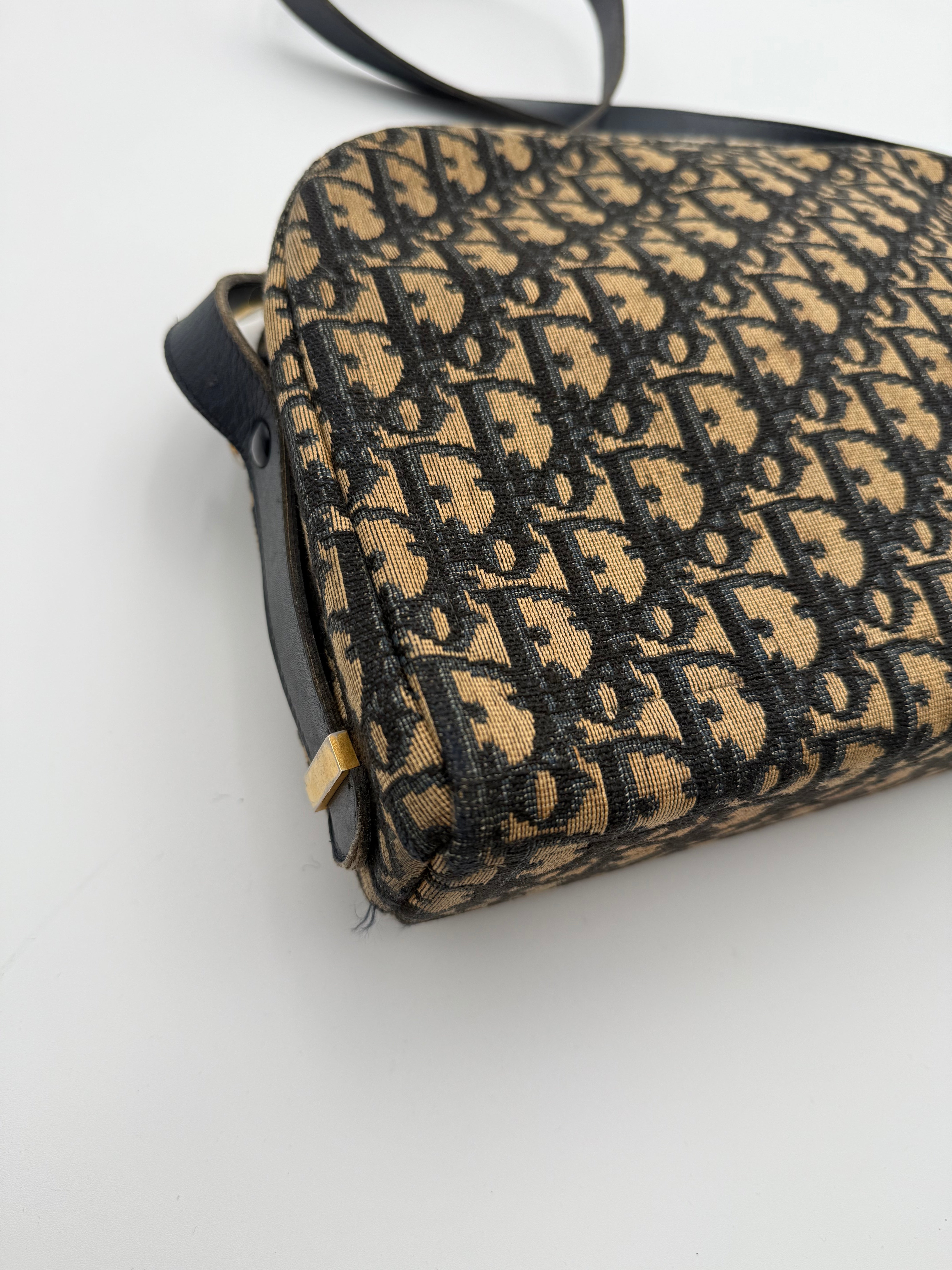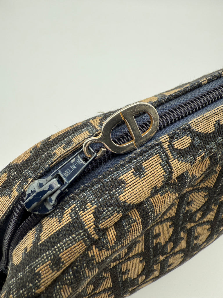 Tweedehands Christian Dior Trotter Canvas bag in de kleur blauw/beige met gouden hardware. De tas sluit met een rits en kan als schoudertas of als een crossbody gedragen worden. De tas beschikt over twee binnenvakjes. Het item verkeert in een zeer goede vintage staat, met algemene gebruikssporen. De tas wordt geleverd in onze mooie Moon flower dustbag.