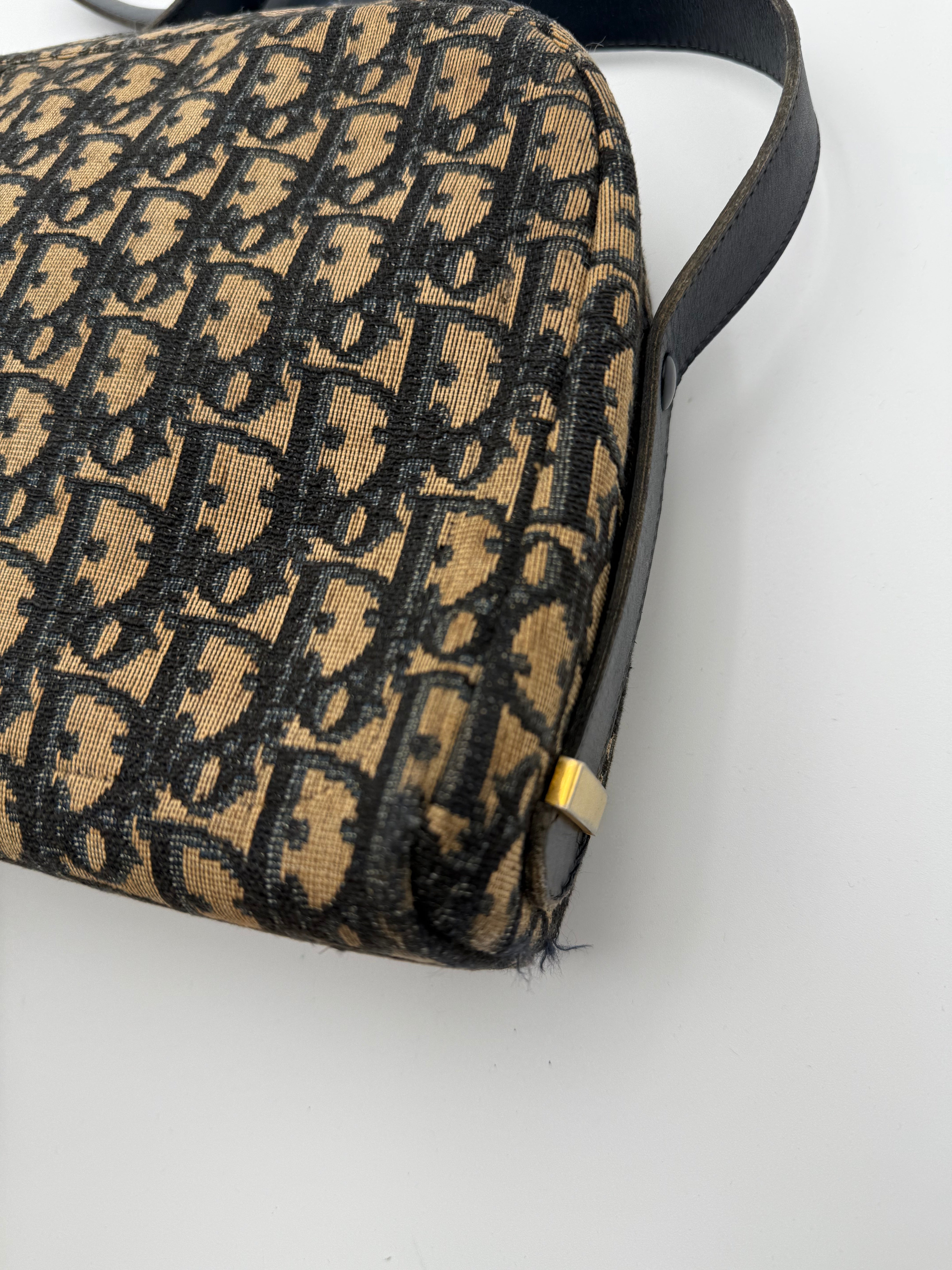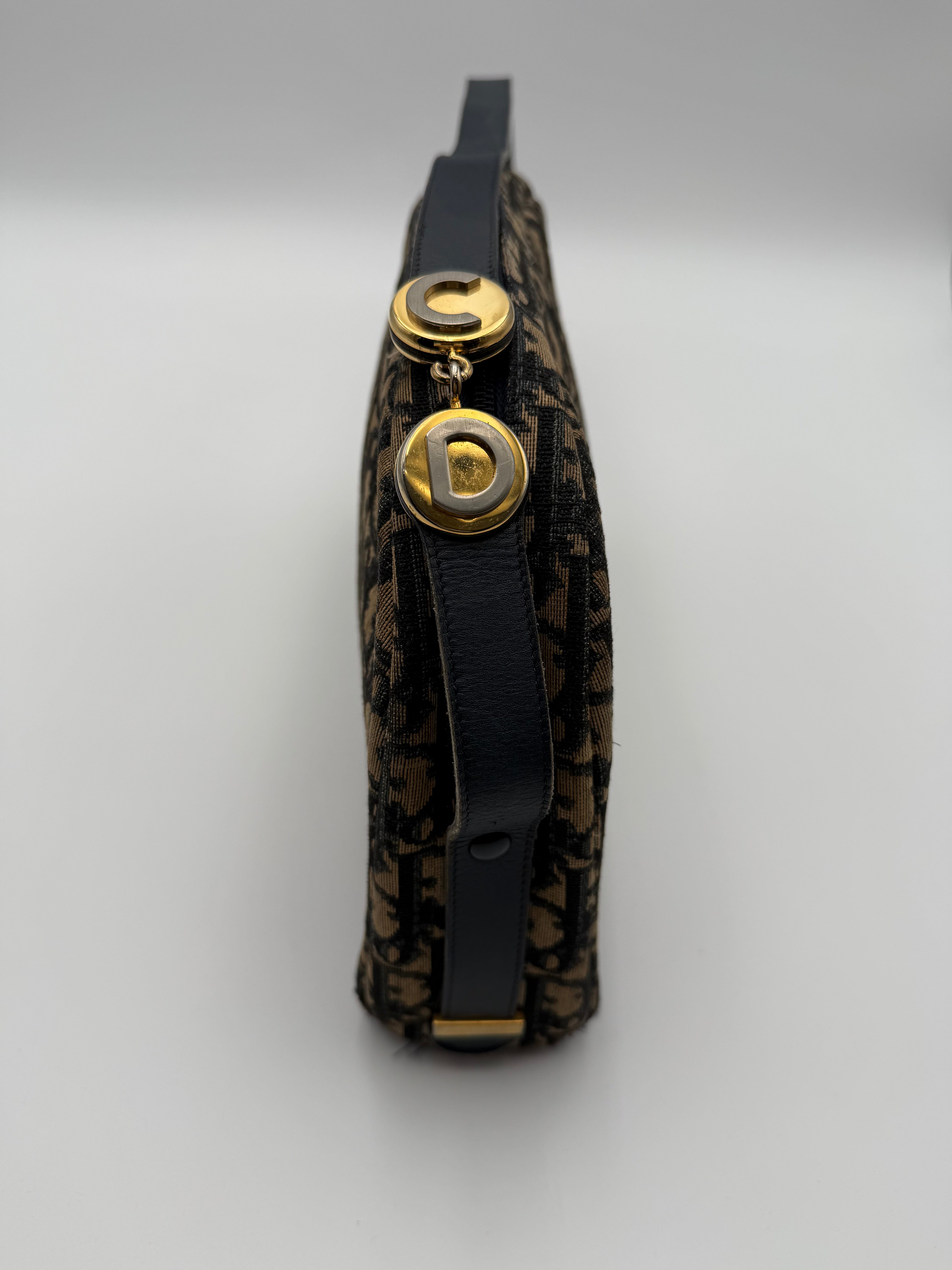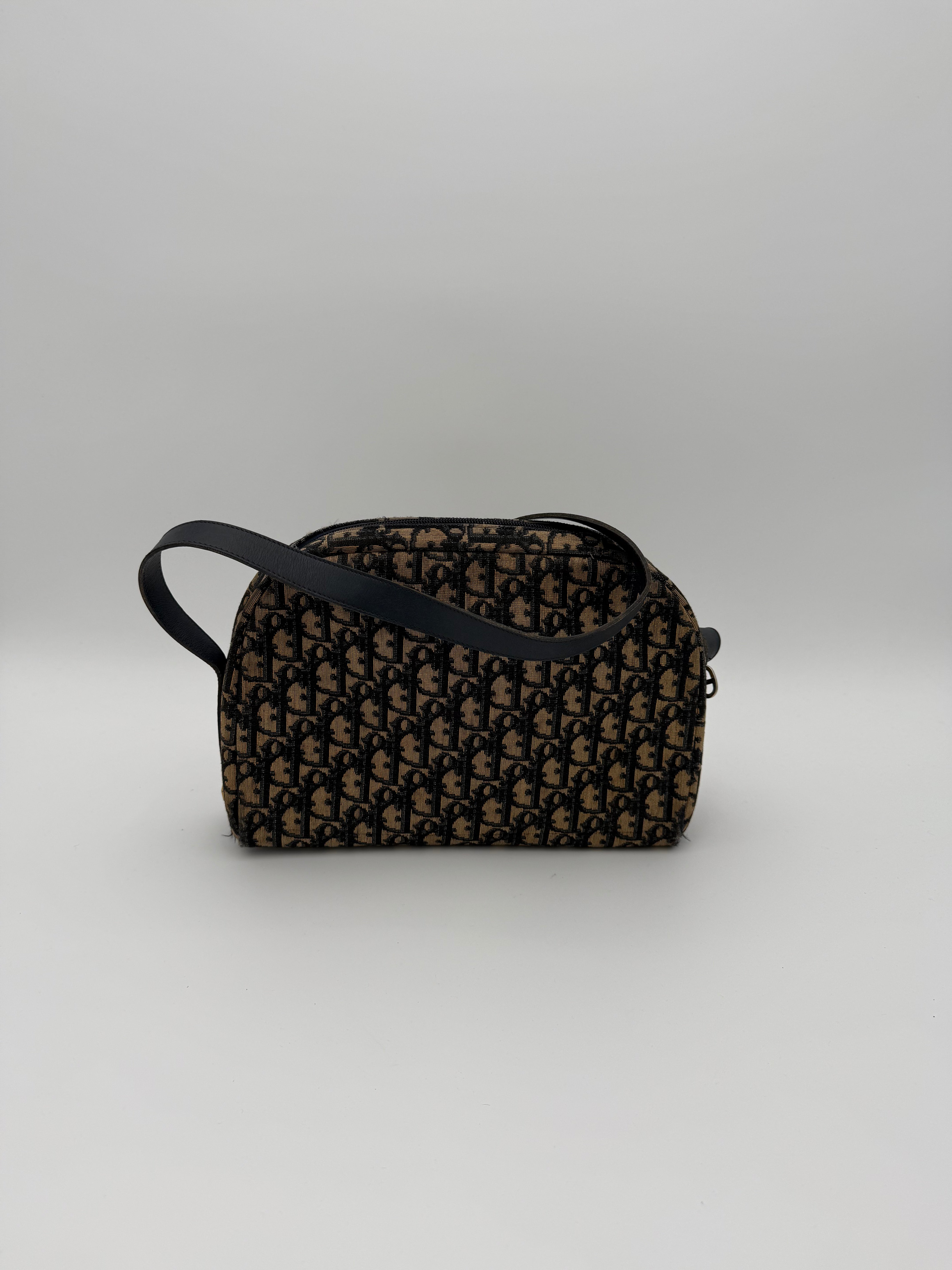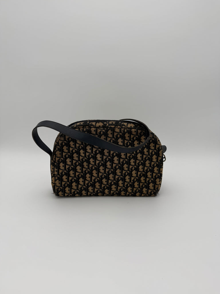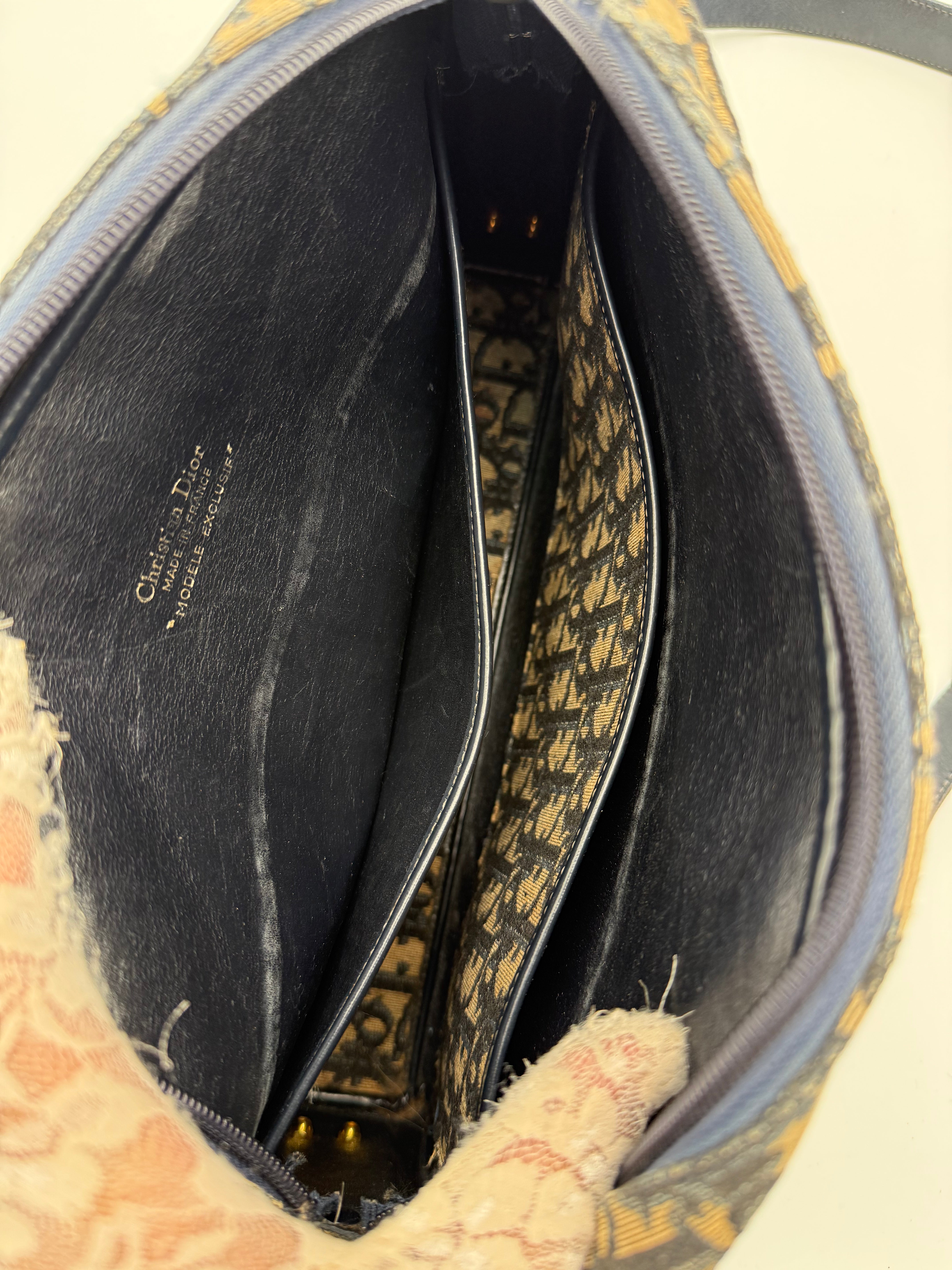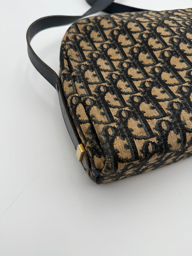 Tweedehands Christian Dior Trotter Canvas bag in de kleur blauw/beige met gouden hardware. De tas sluit met een rits en kan als schoudertas of als een crossbody gedragen worden. De tas beschikt over twee binnenvakjes. Het item verkeert in een zeer goede vintage staat, met algemene gebruikssporen. De tas wordt geleverd in onze mooie Moon flower dustbag.