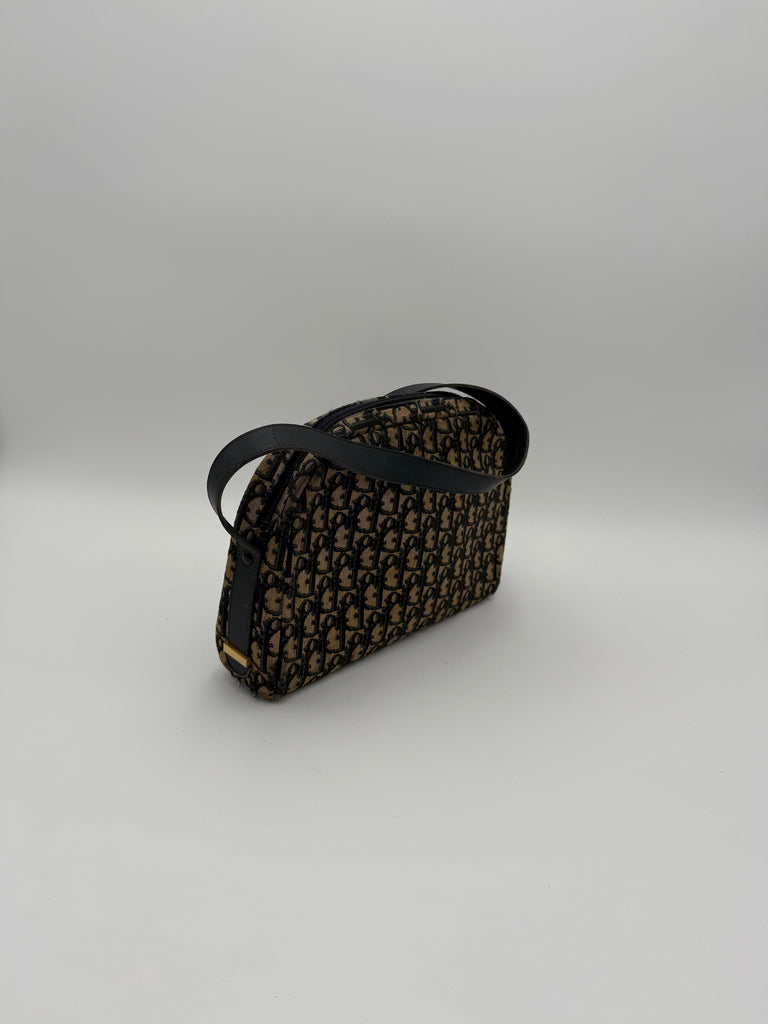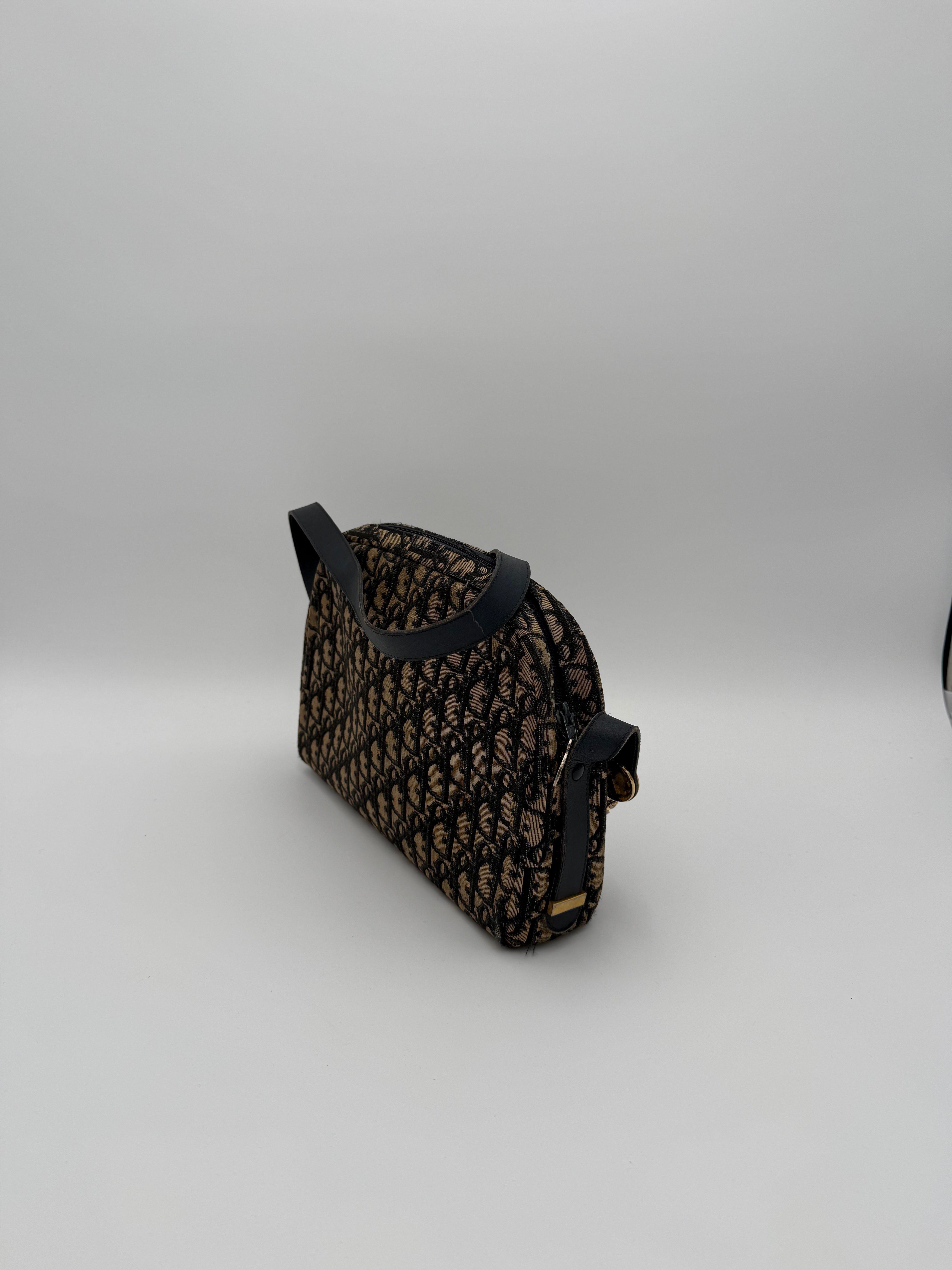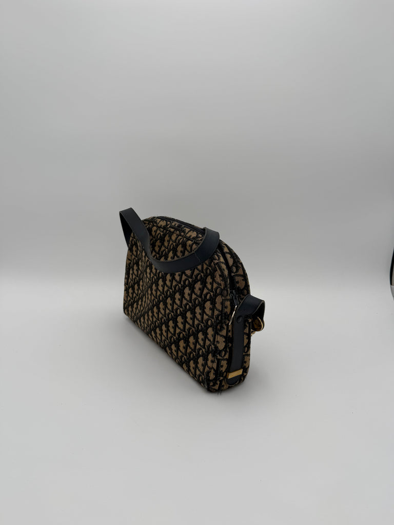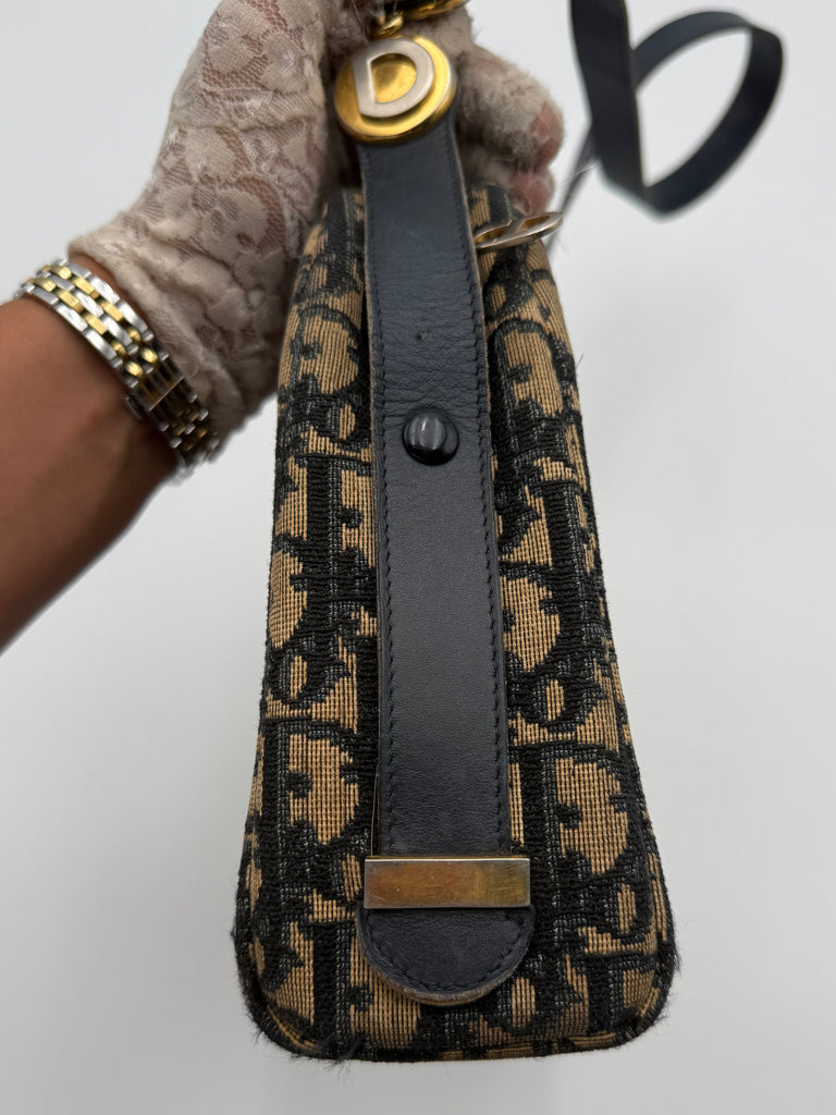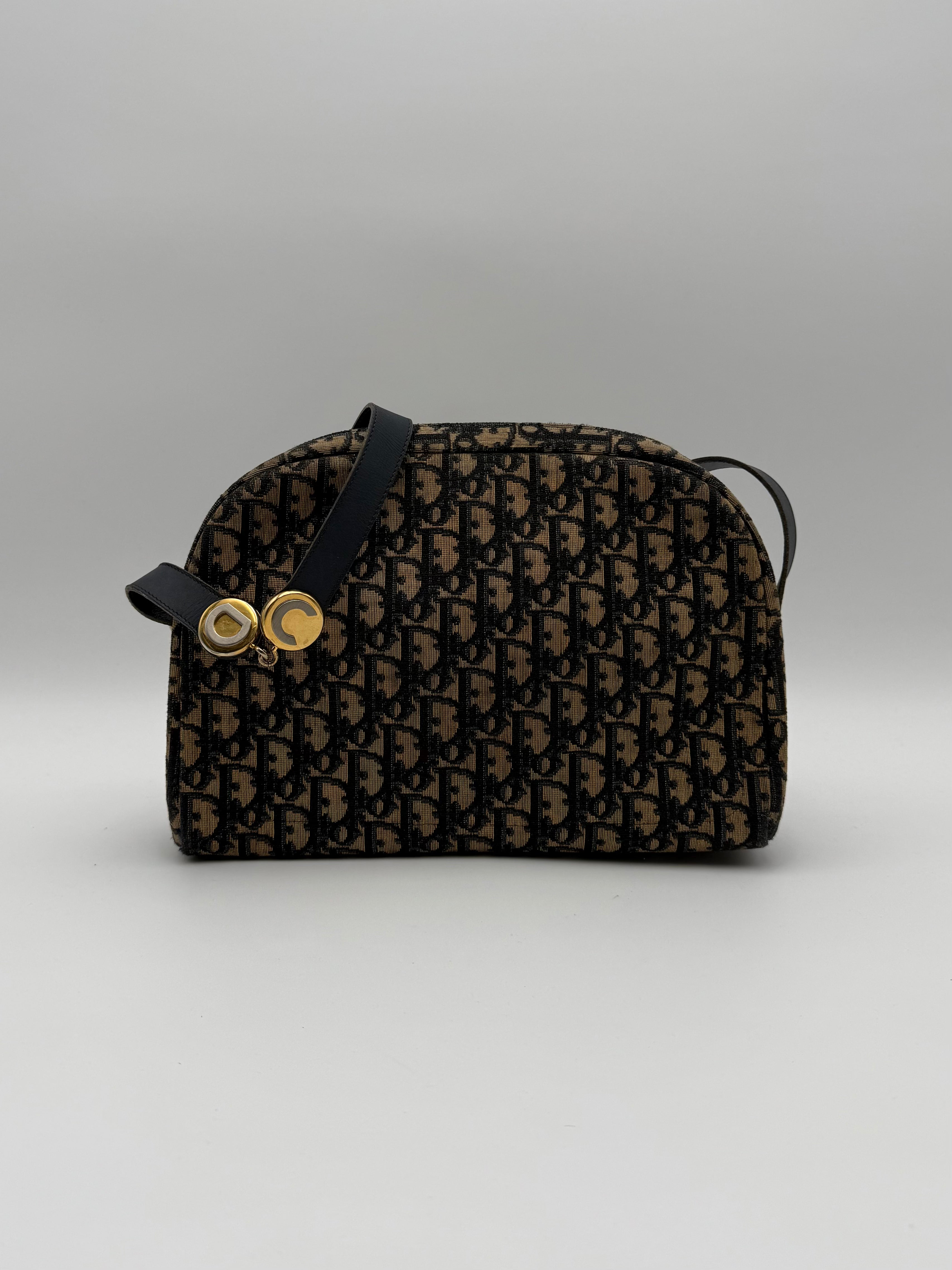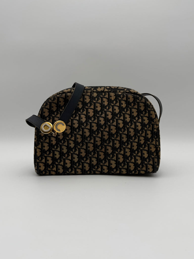 Tweedehands Christian Dior Trotter Canvas bag in de kleur blauw/beige met gouden hardware. De tas sluit met een rits en kan als schoudertas of als een crossbody gedragen worden. De tas beschikt over twee binnenvakjes. Het item verkeert in een zeer goede vintage staat, met algemene gebruikssporen. De tas wordt geleverd in onze mooie Moon flower dustbag.