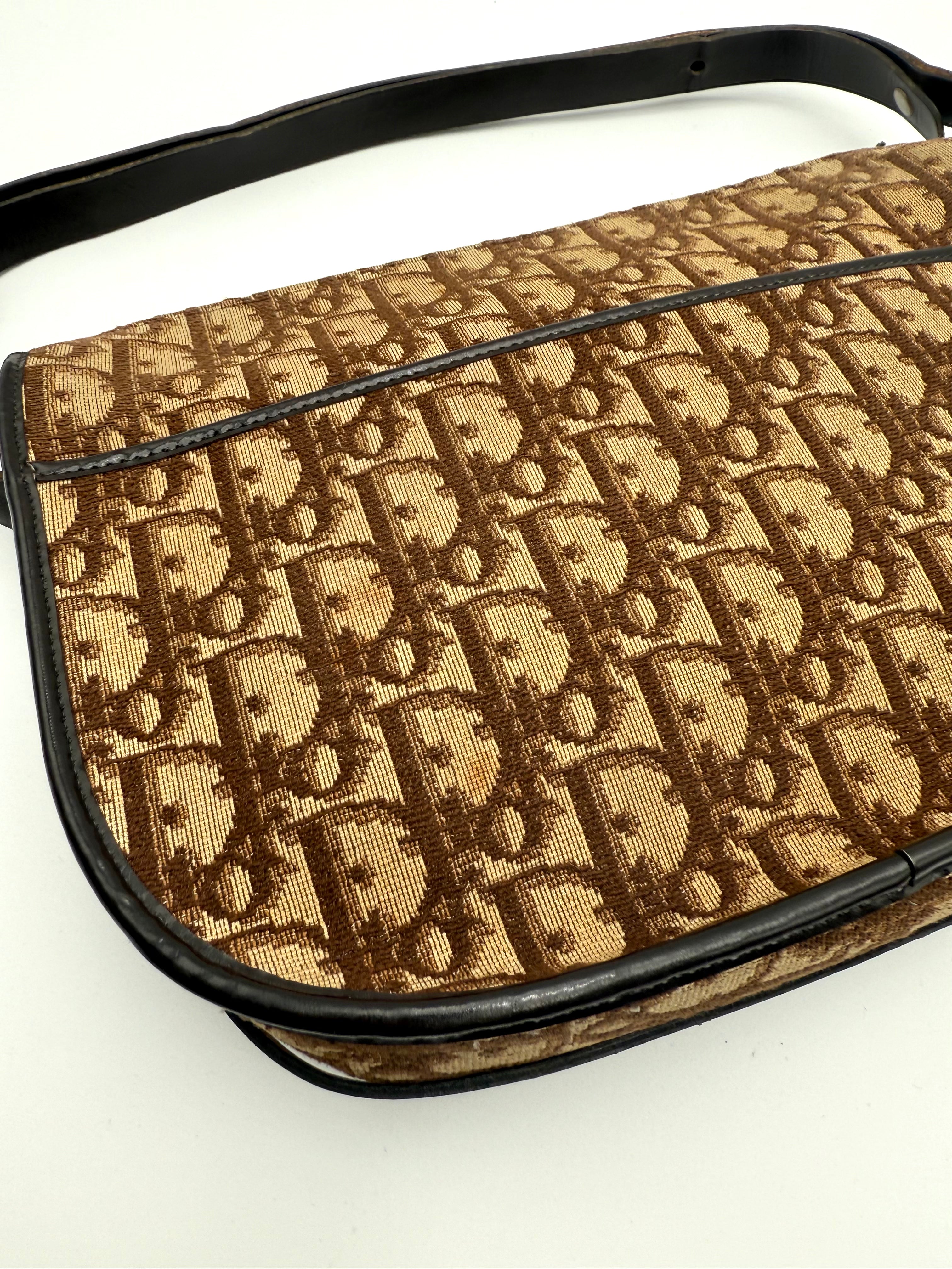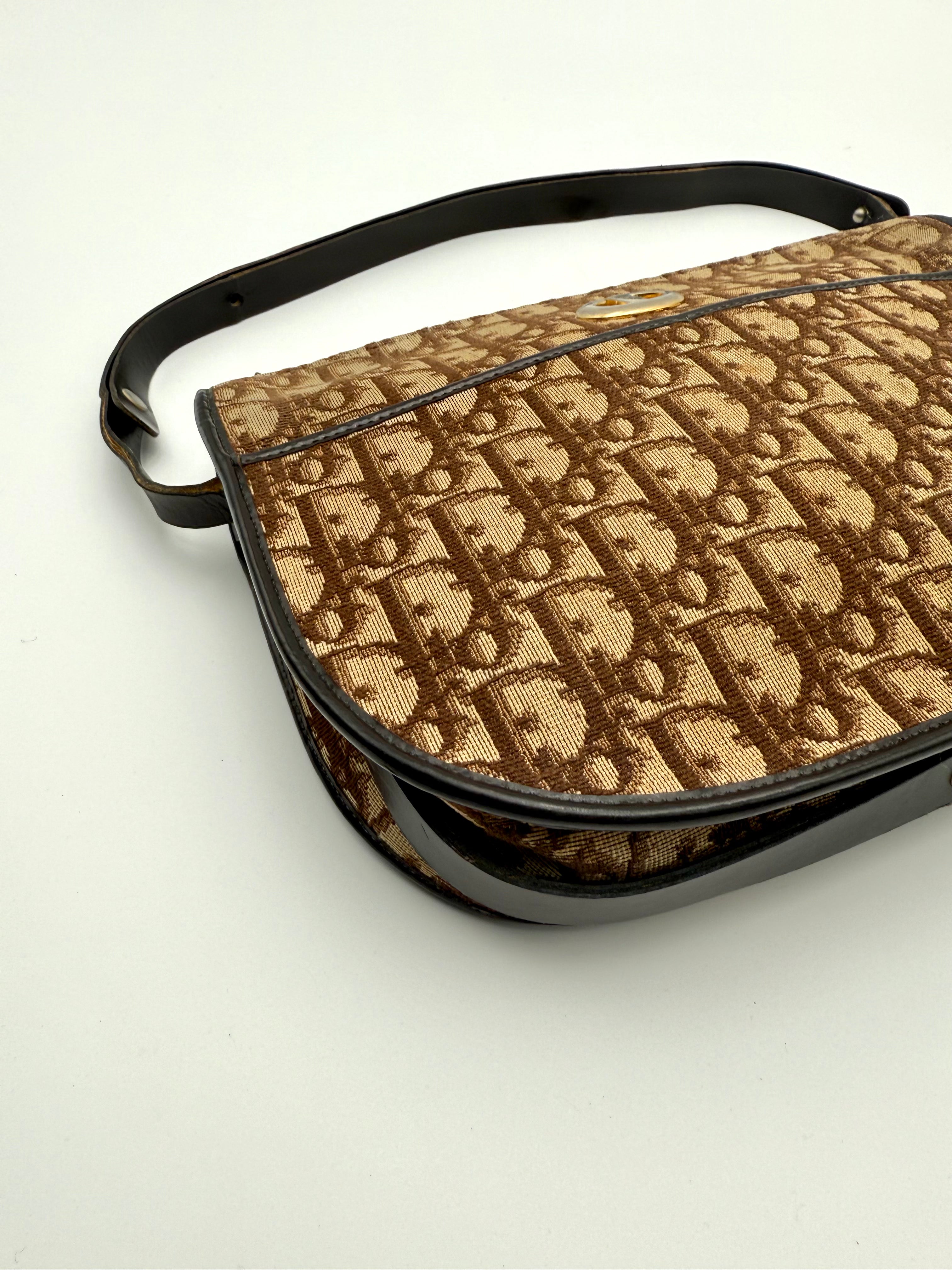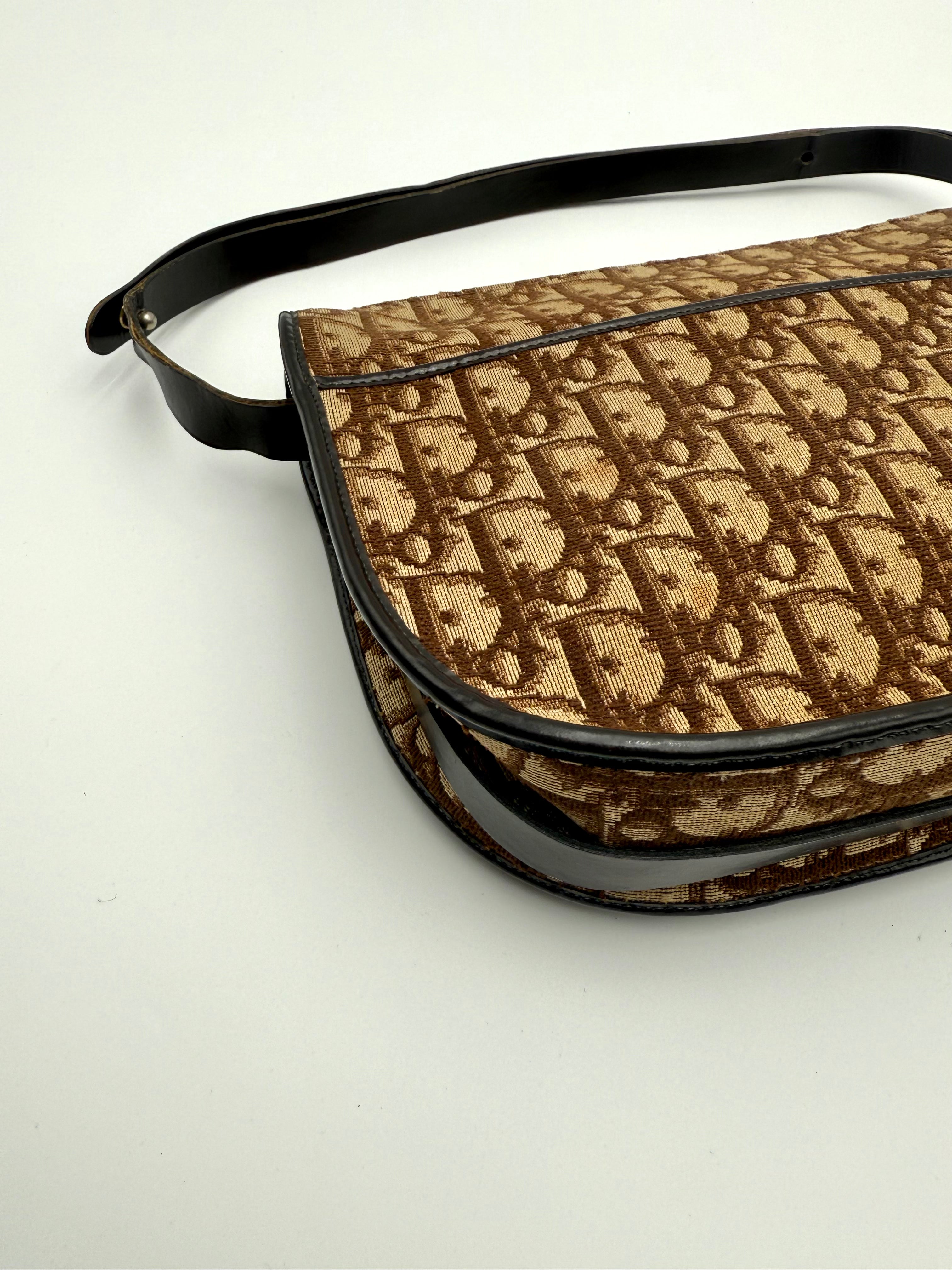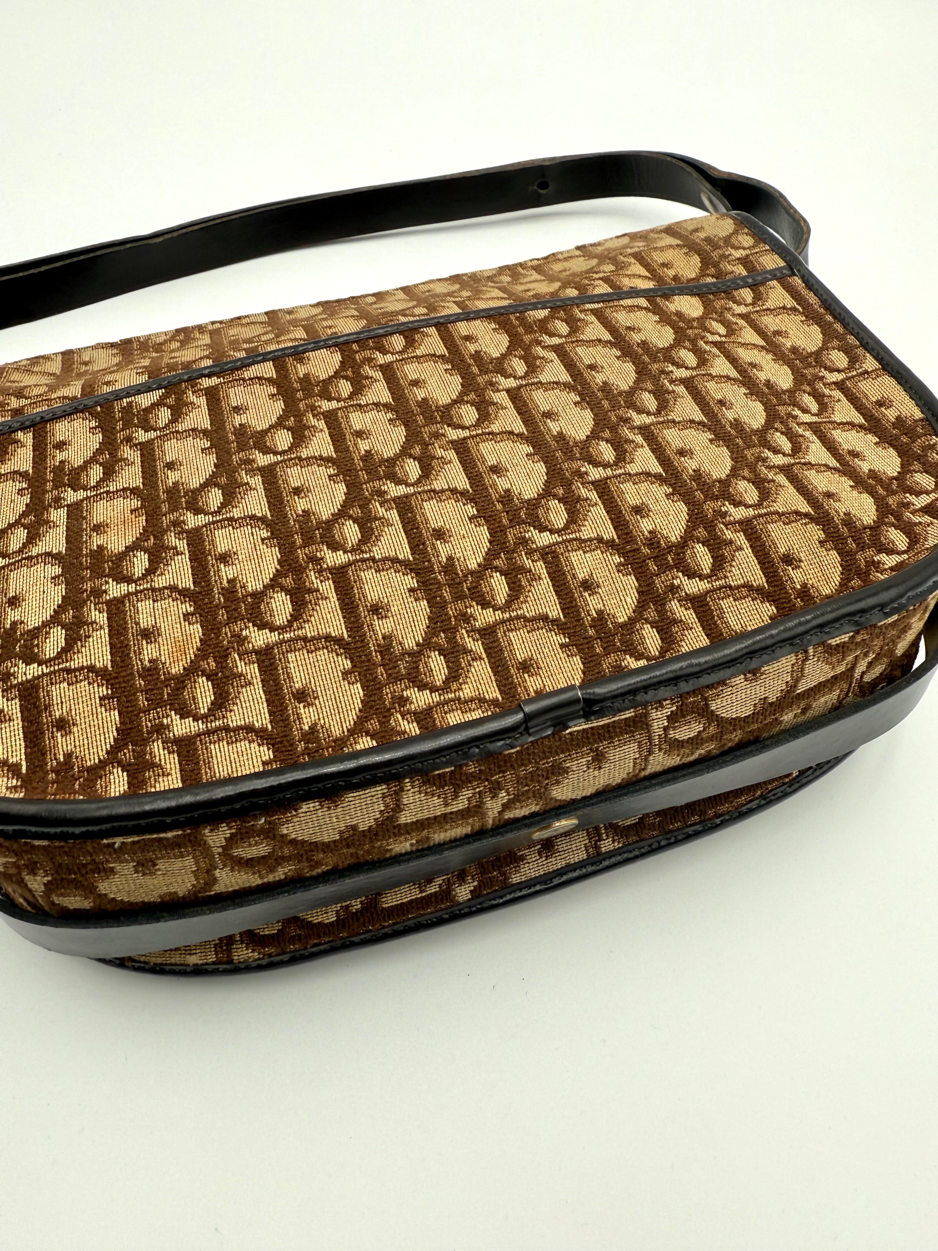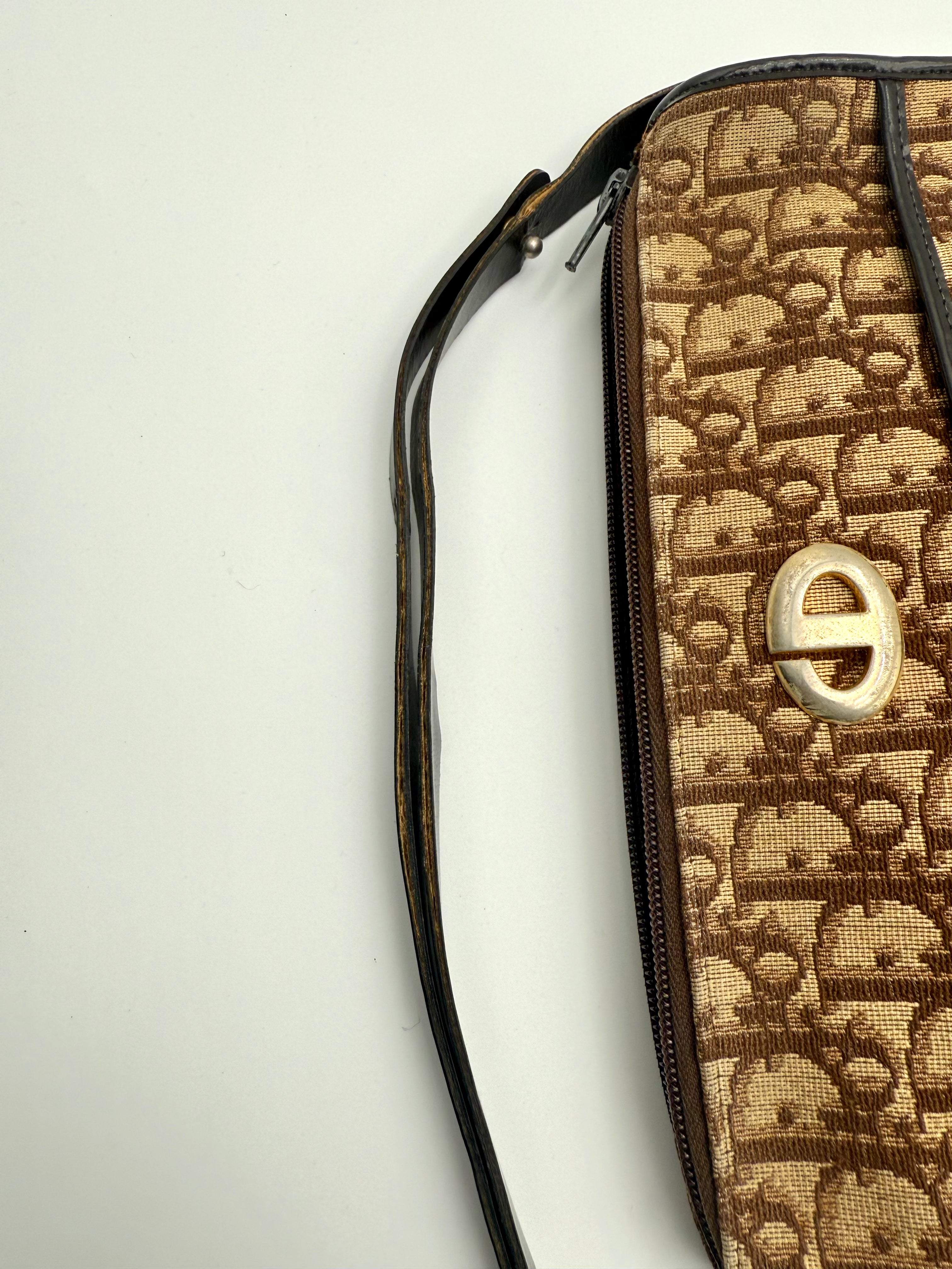 Tweedehands Christian Dior Trotter Canvas bag in de kleur bruin/beige met gouden hardware. De tas beschikt over twee voorvakjes en een achtervakje. De tas kan kort en als crossbody gedragen worden. Het item verkeert in een zeer goede vintage staat, met algemene gebruikssporen. De tas wordt geleverd in onze mooie Moon flower dustbag.