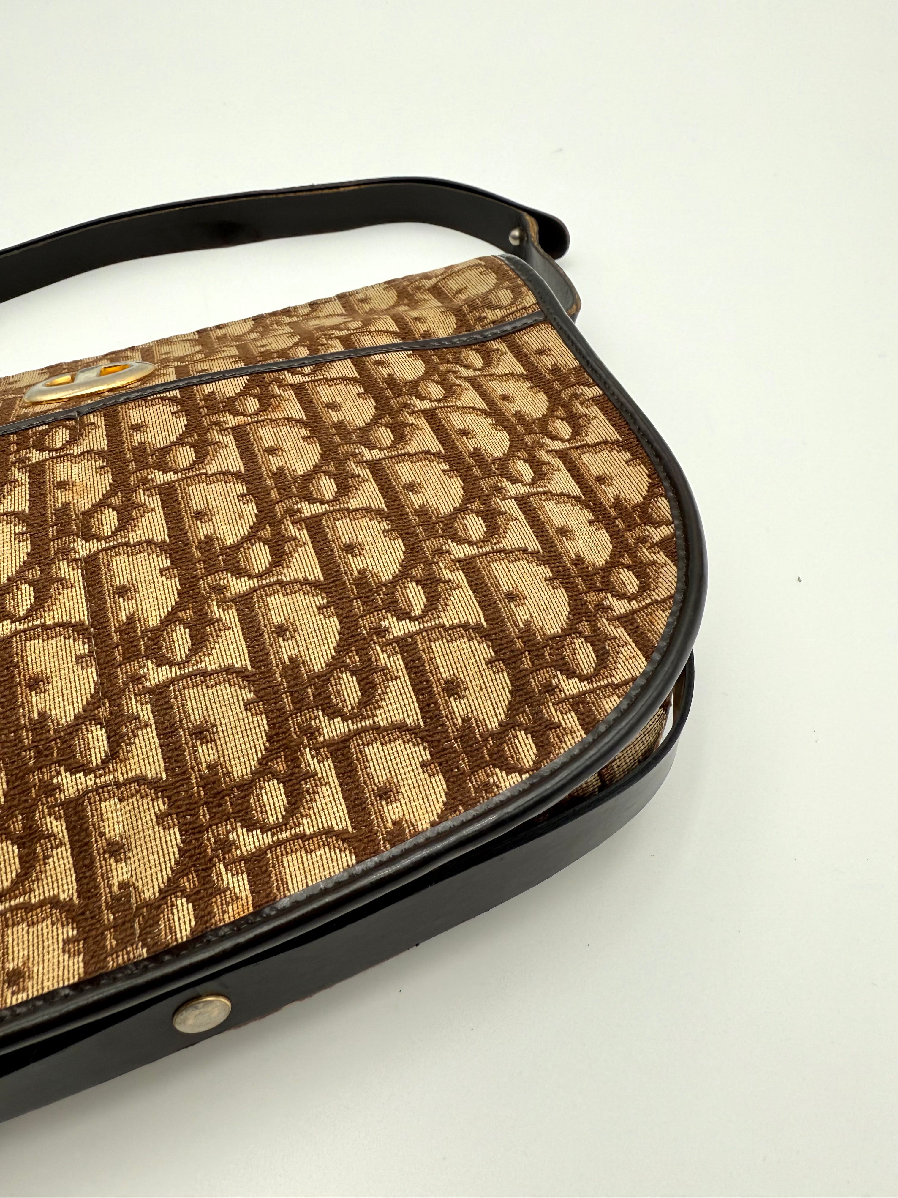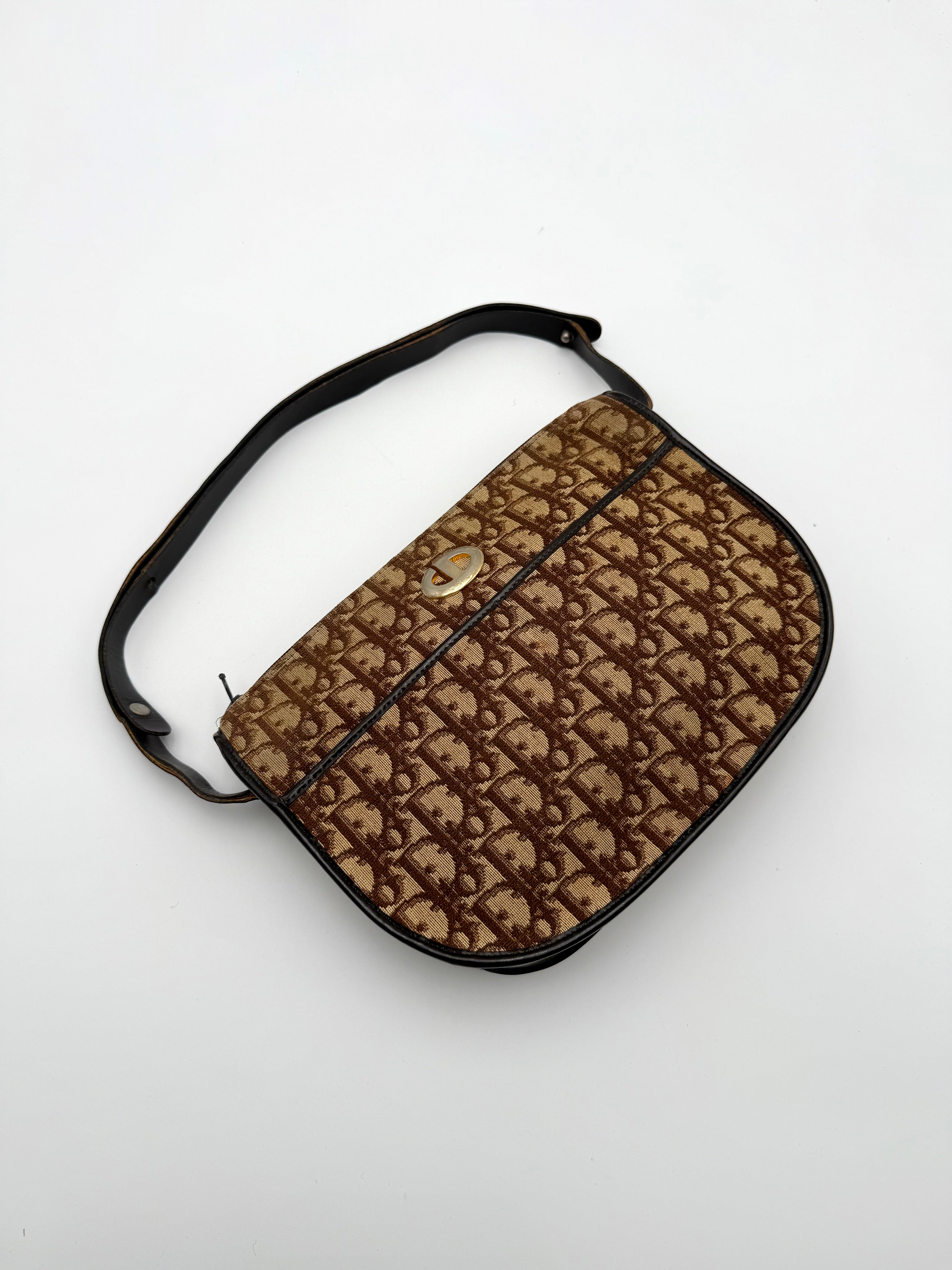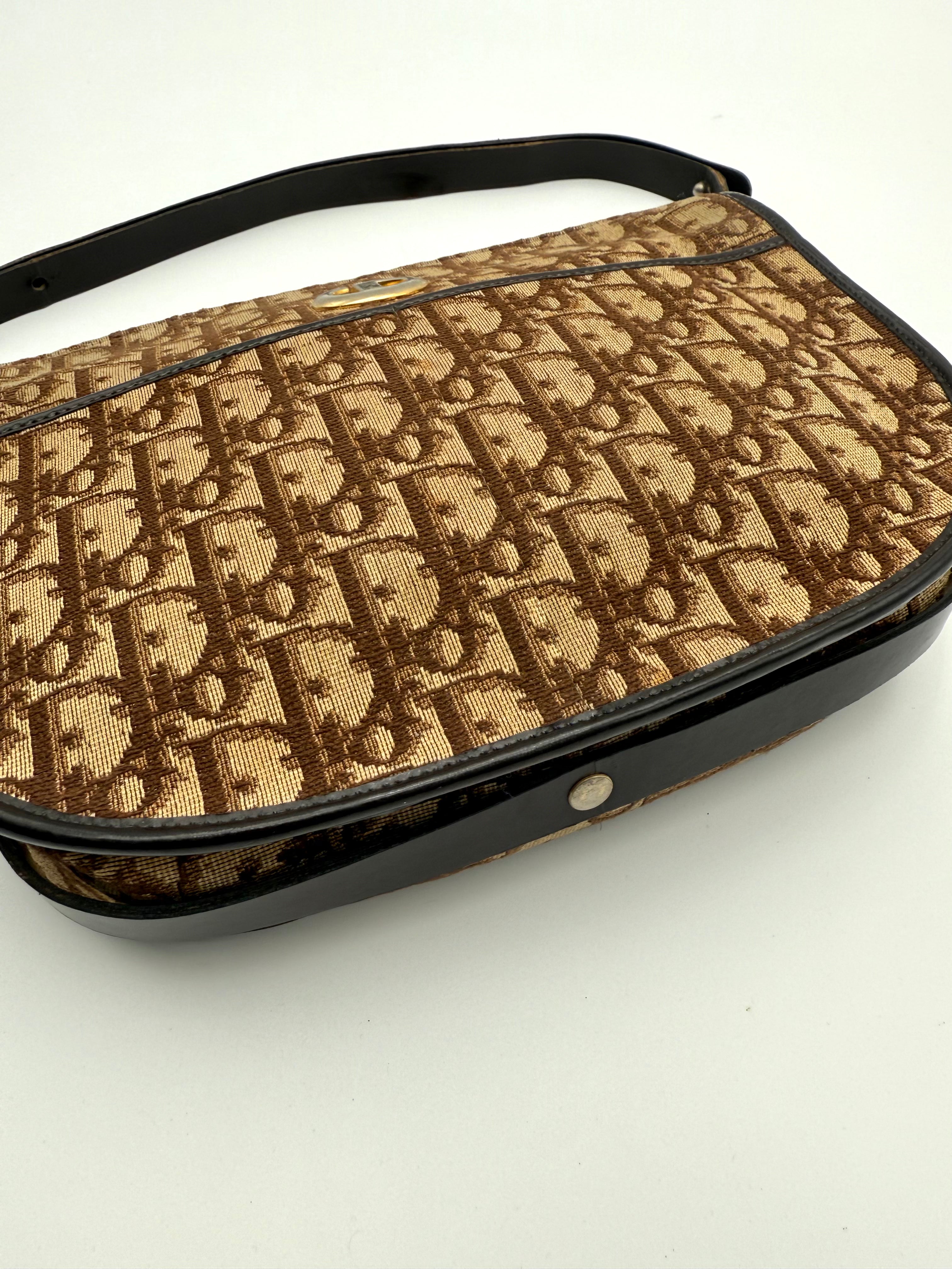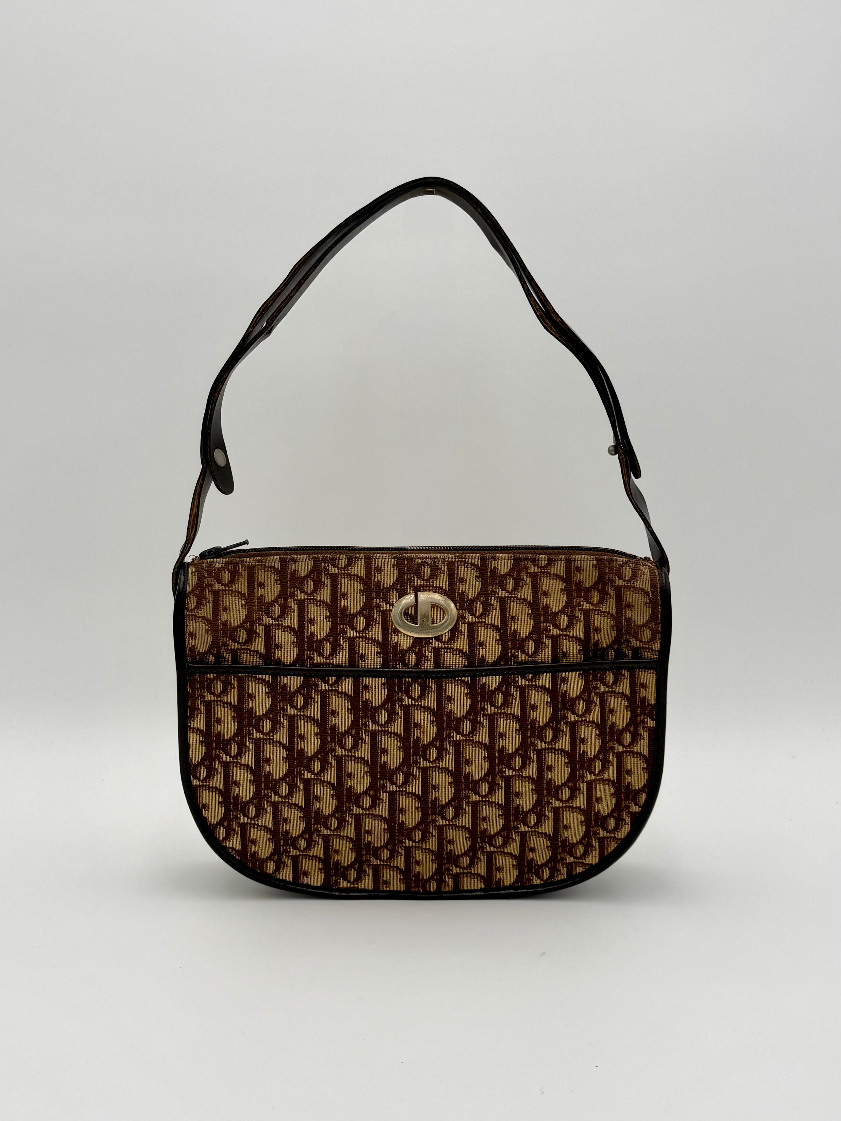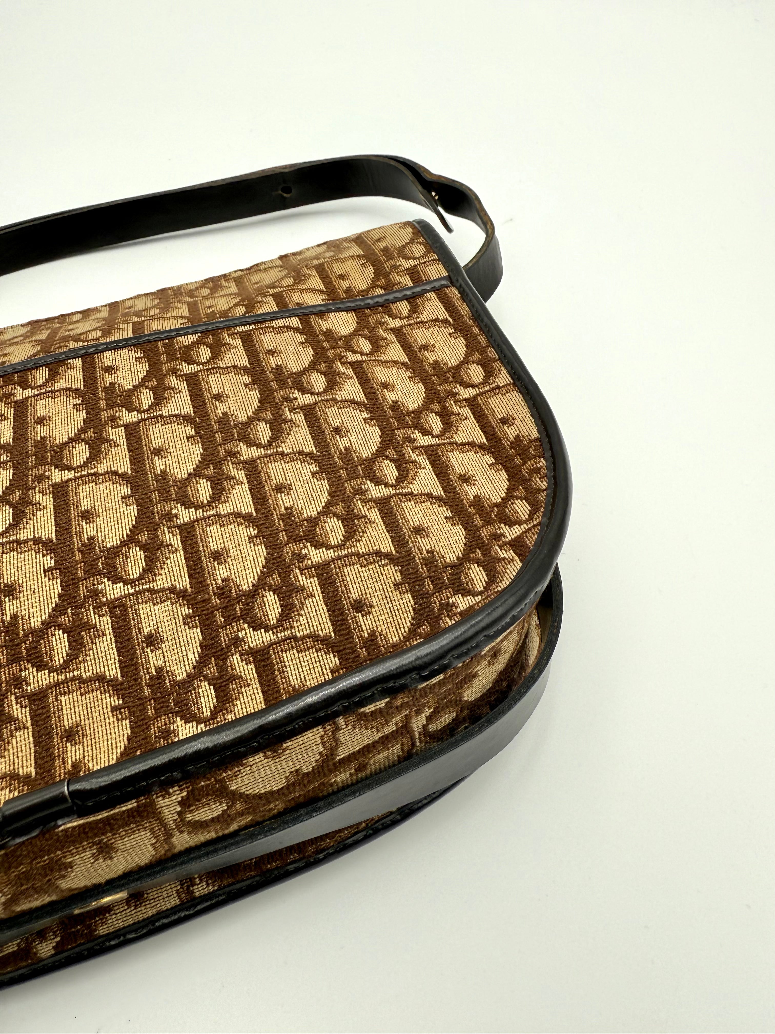 Tweedehands Christian Dior Trotter Canvas bag in de kleur bruin/beige met gouden hardware. De tas beschikt over twee voorvakjes en een achtervakje. De tas kan kort en als crossbody gedragen worden. Het item verkeert in een zeer goede vintage staat, met algemene gebruikssporen. De tas wordt geleverd in onze mooie Moon flower dustbag.