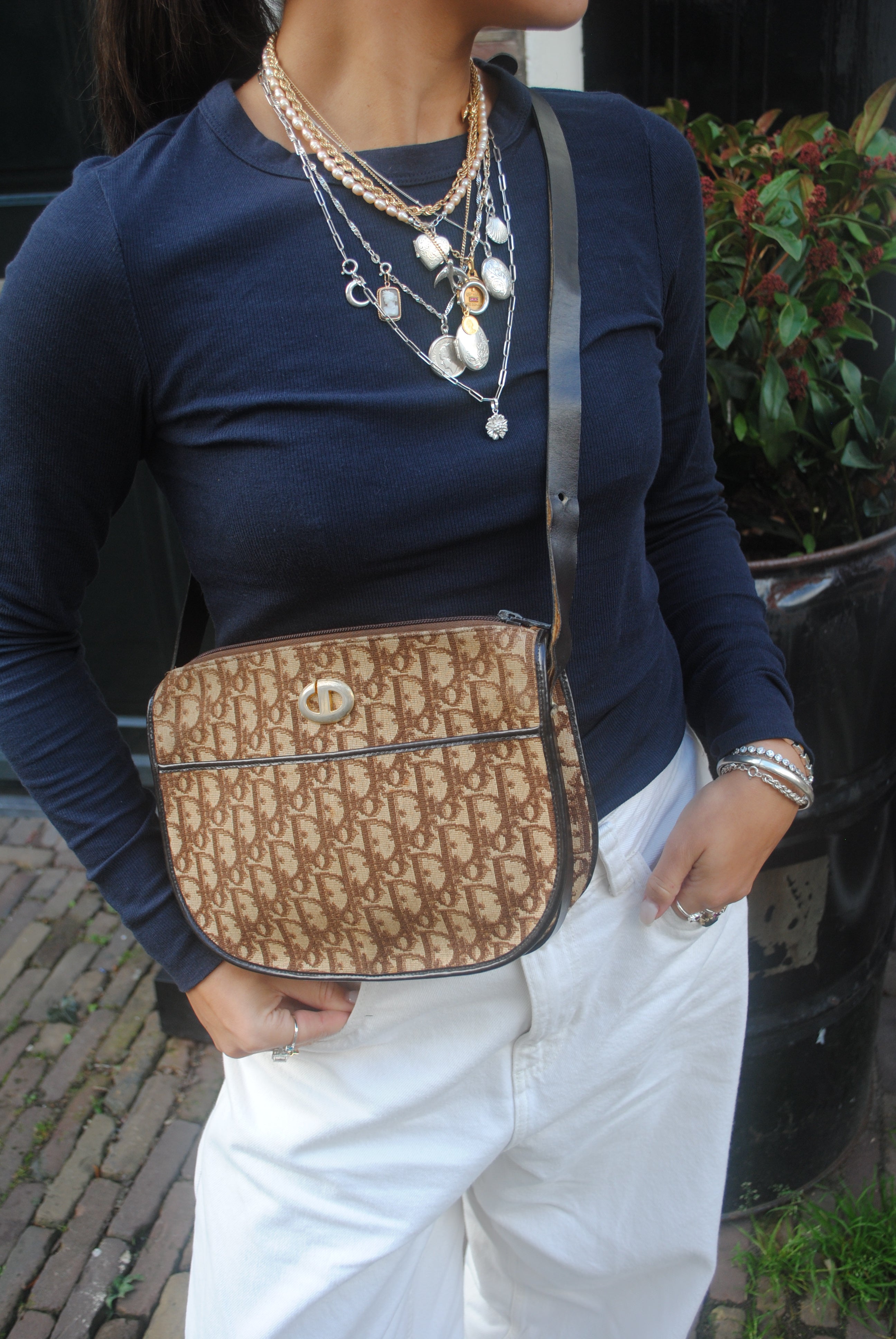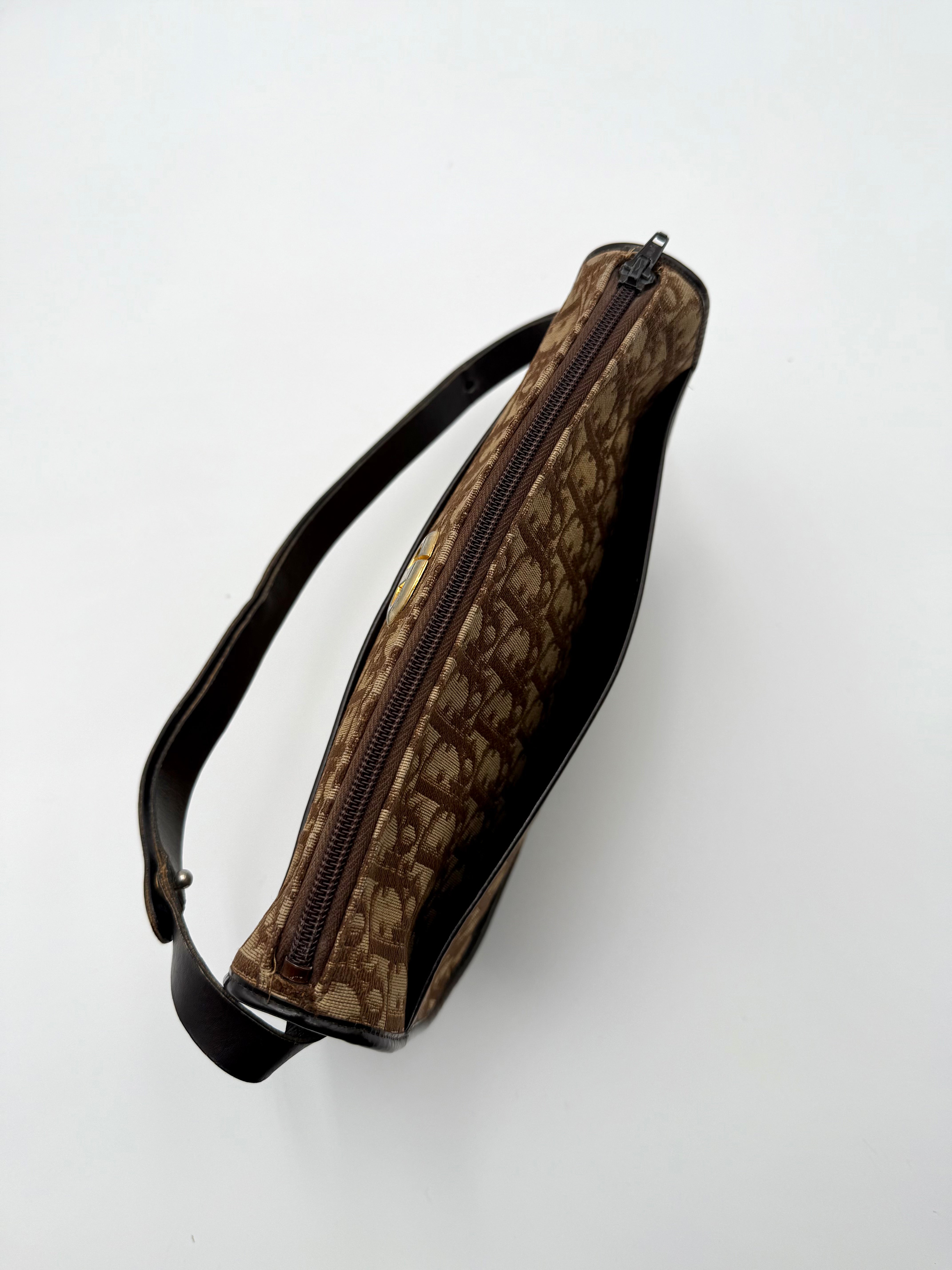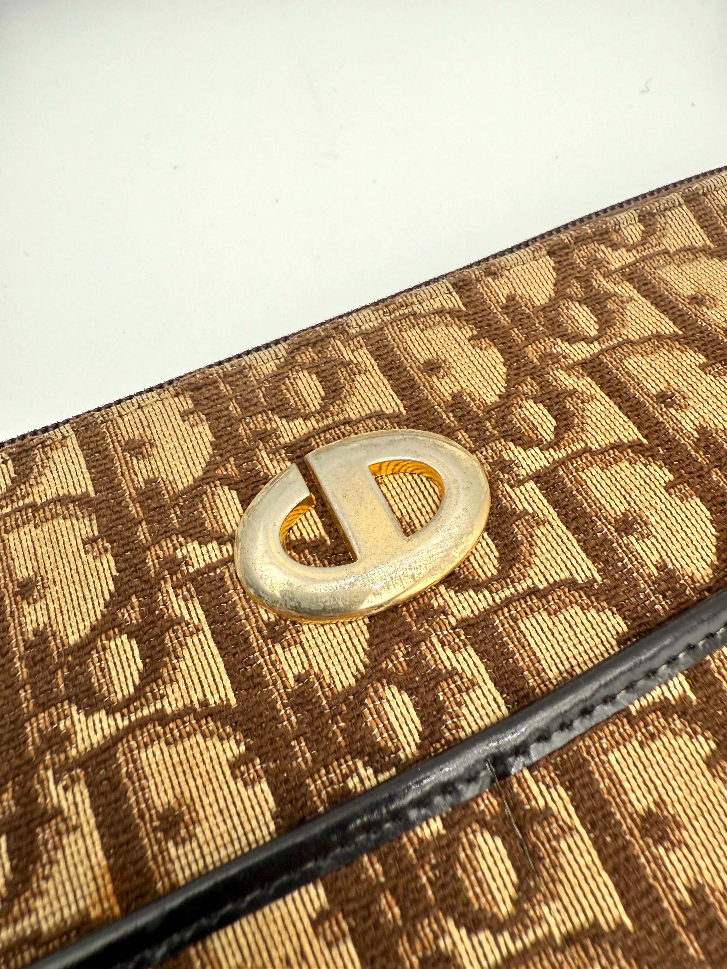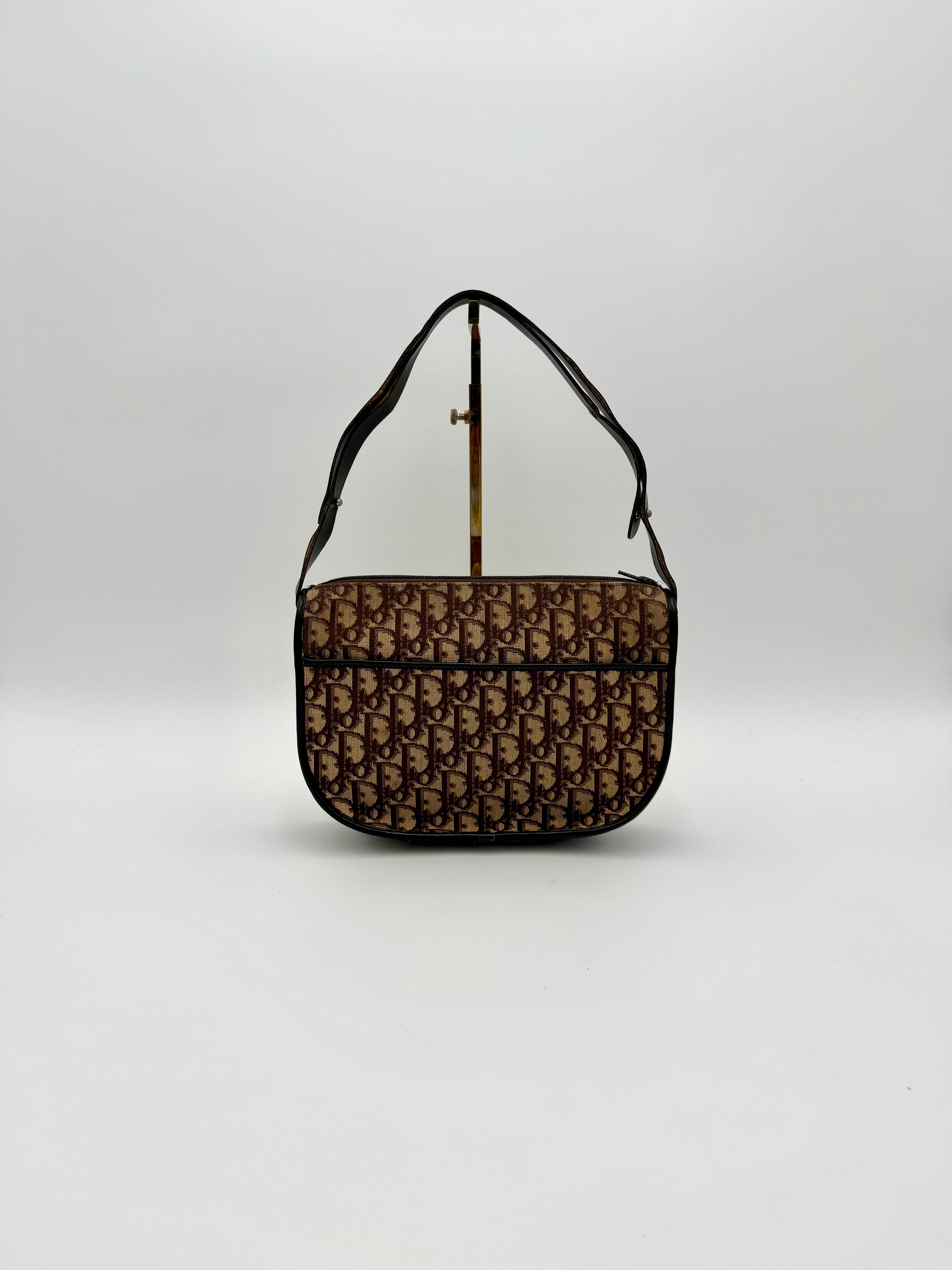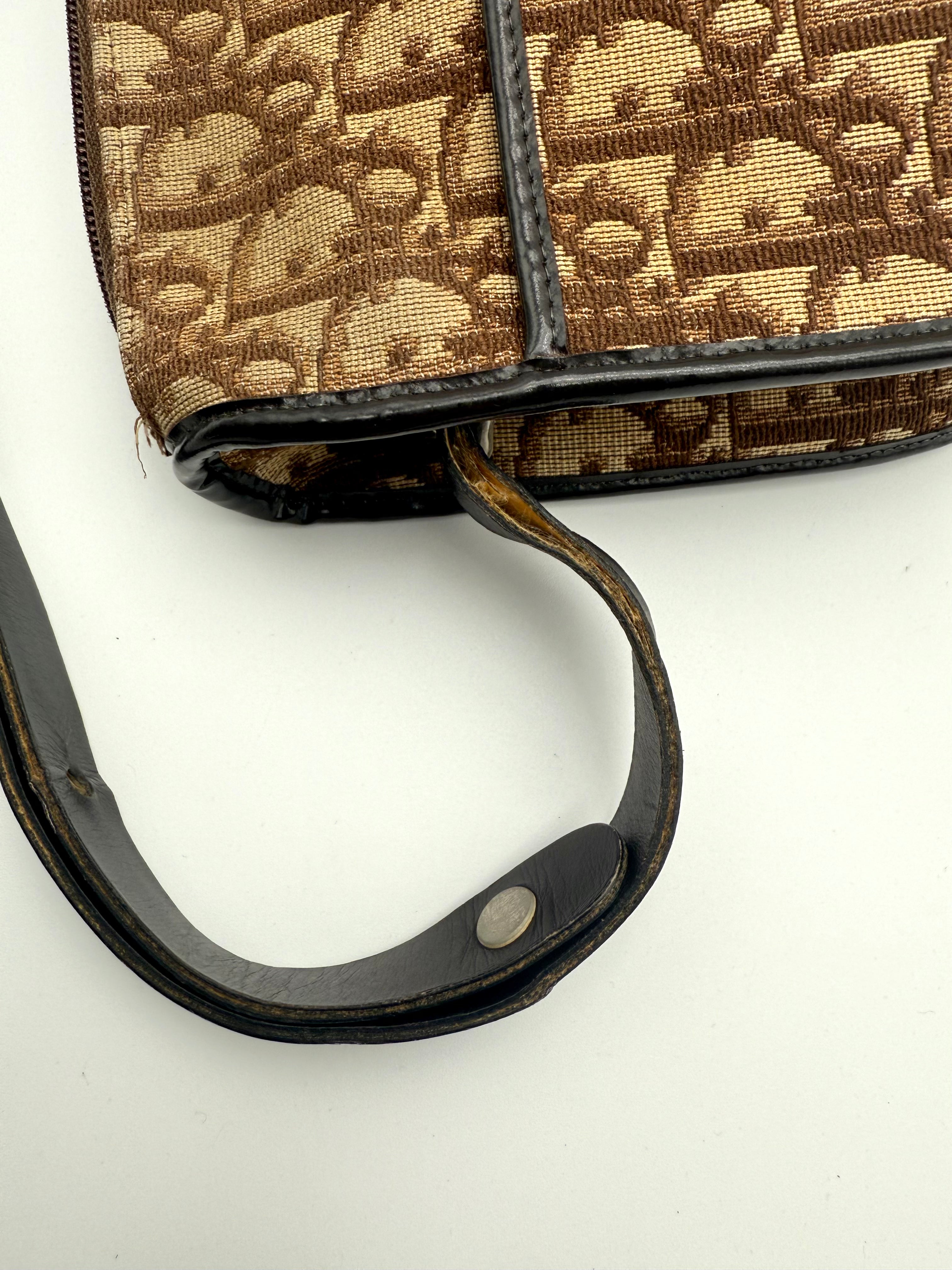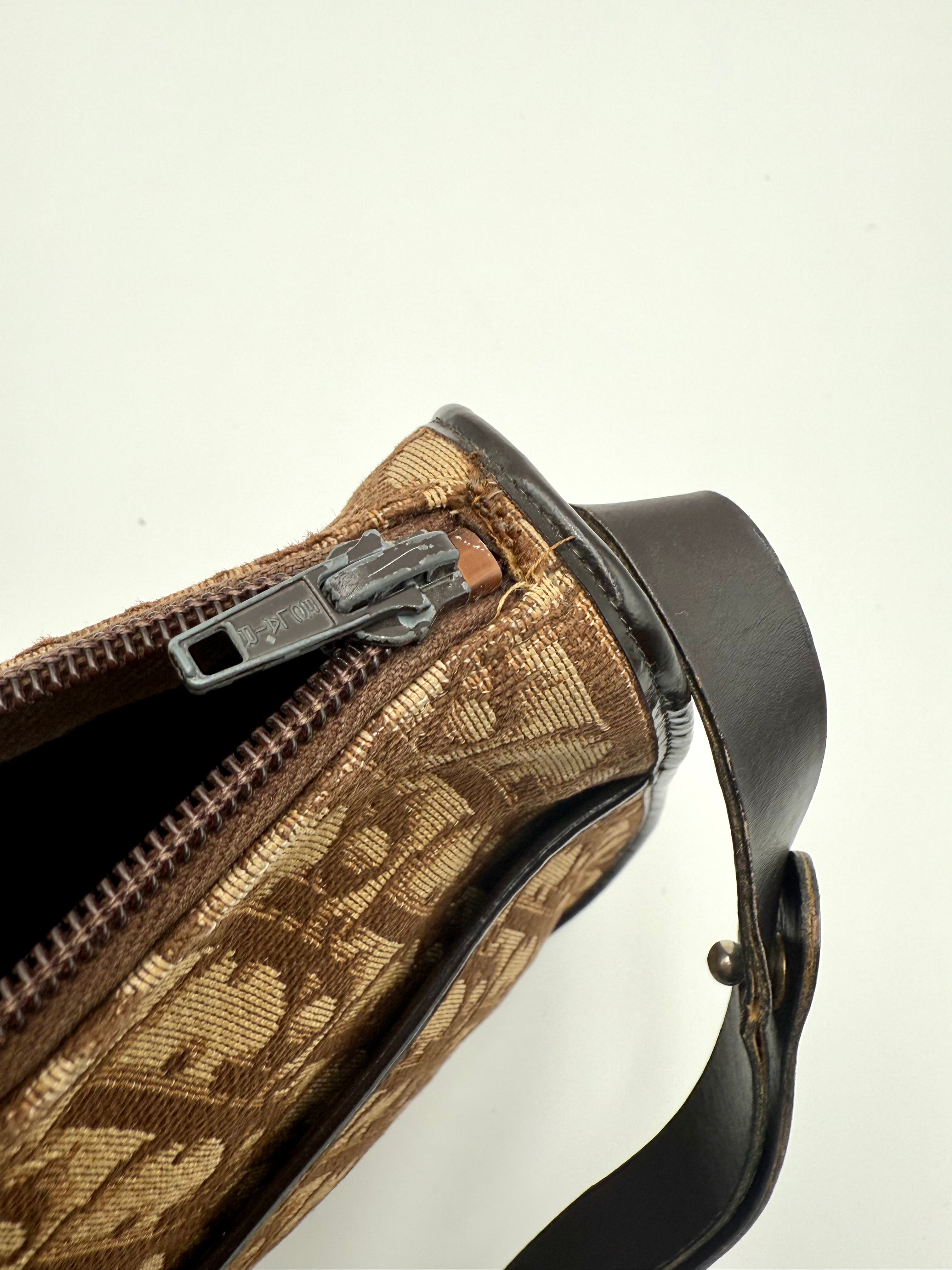 Tweedehands Christian Dior Trotter Canvas bag in de kleur bruin/beige met gouden hardware. De tas beschikt over twee voorvakjes en een achtervakje. De tas kan kort en als crossbody gedragen worden. Het item verkeert in een zeer goede vintage staat, met algemene gebruikssporen. De tas wordt geleverd in onze mooie Moon flower dustbag.