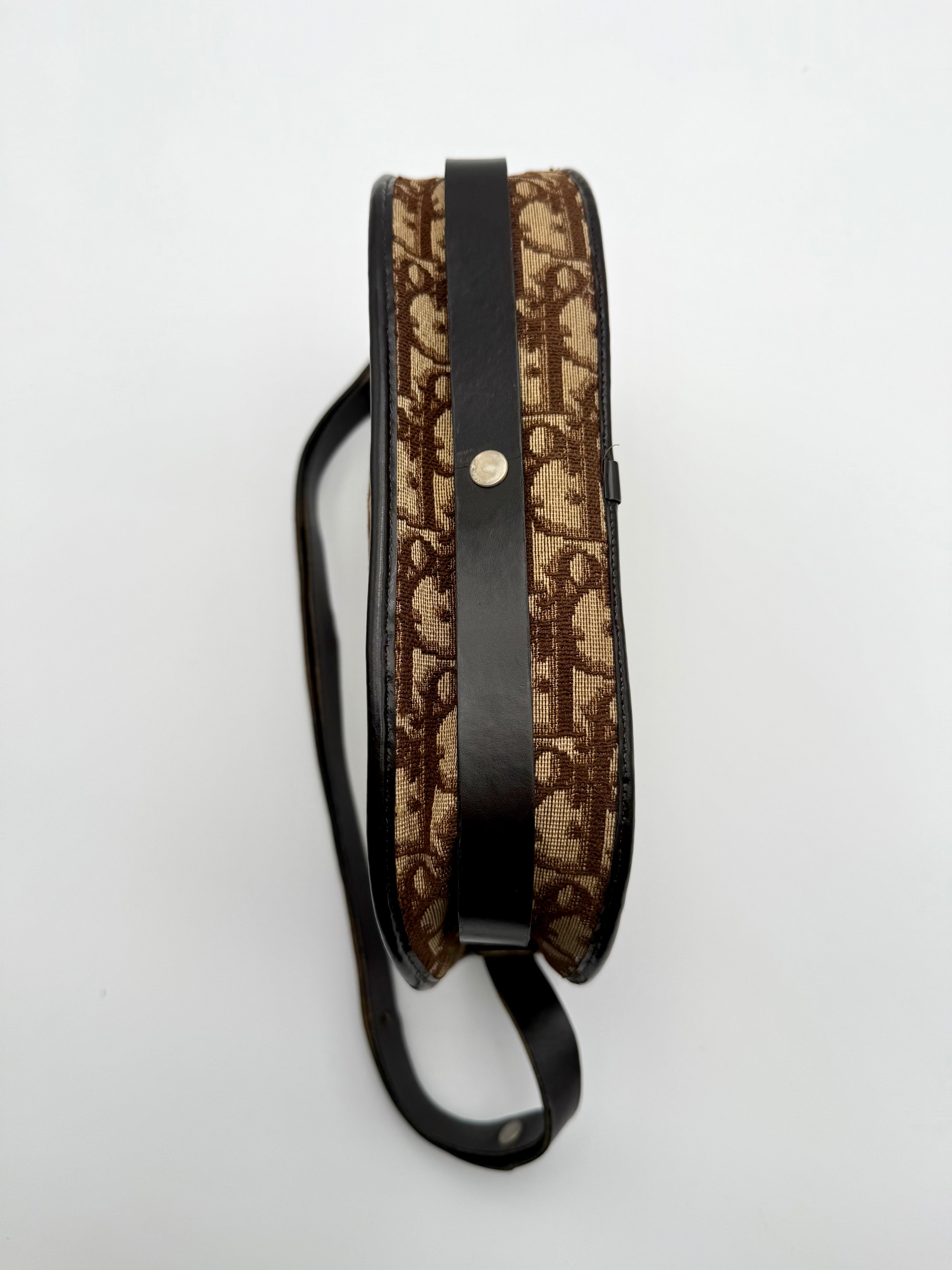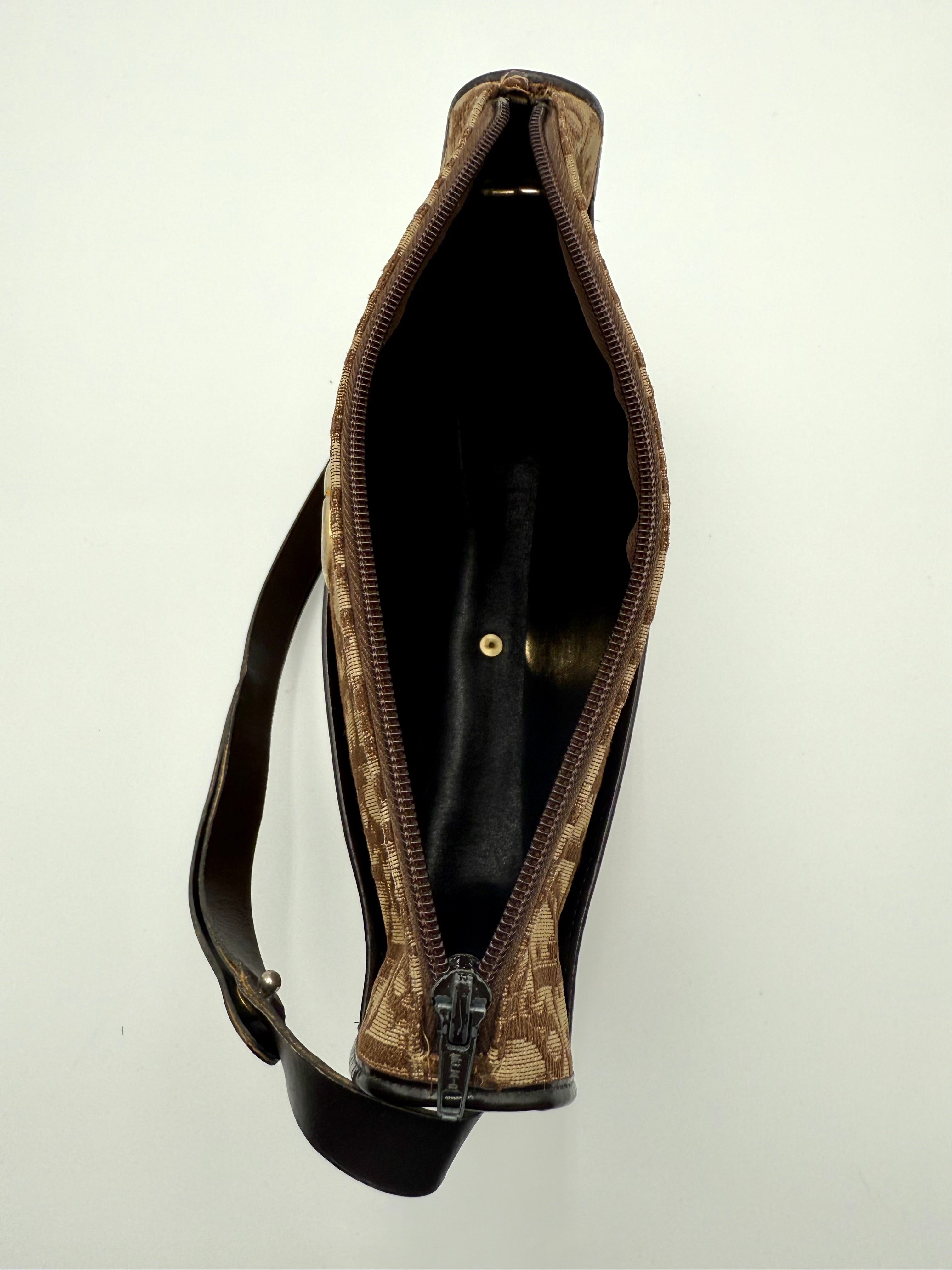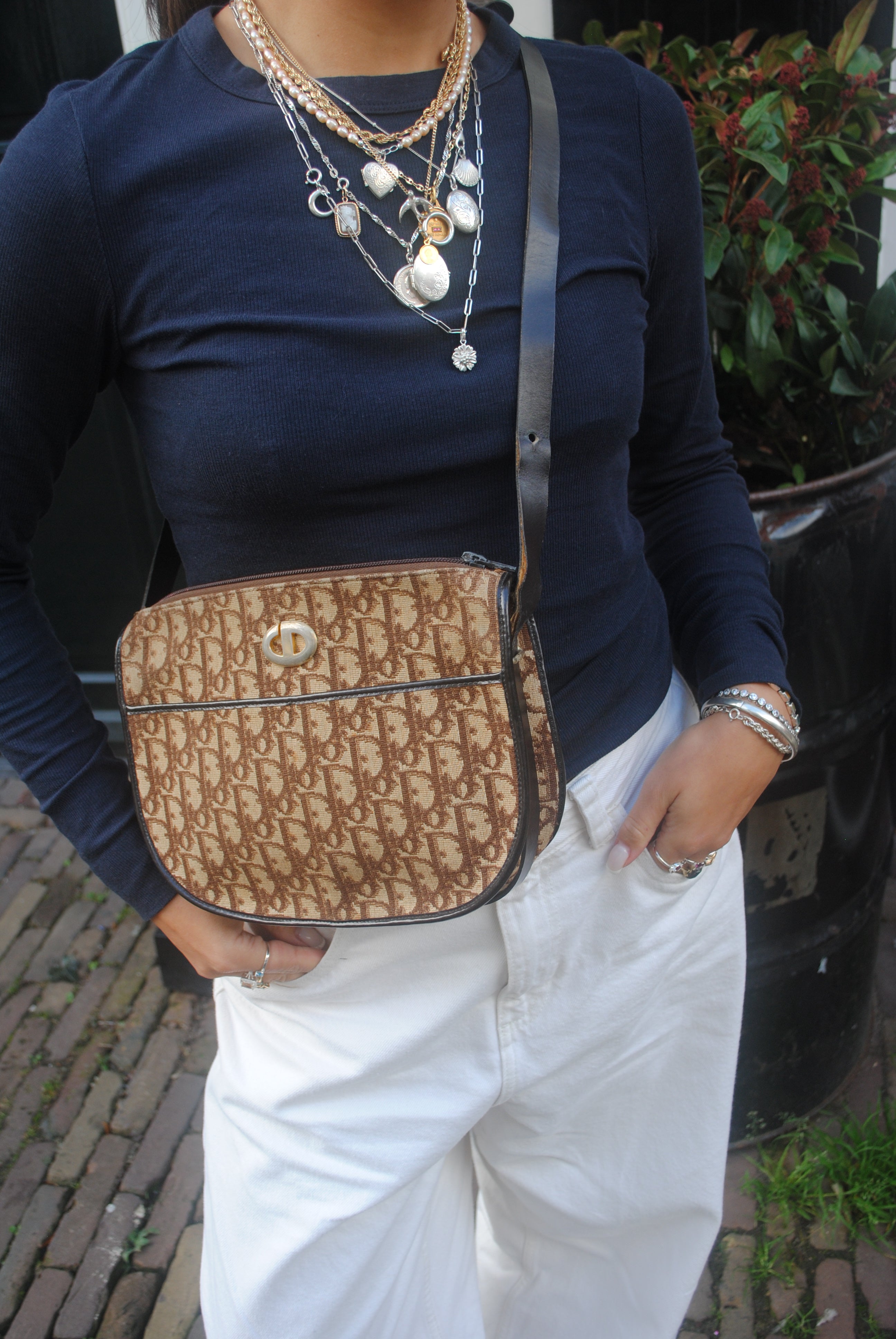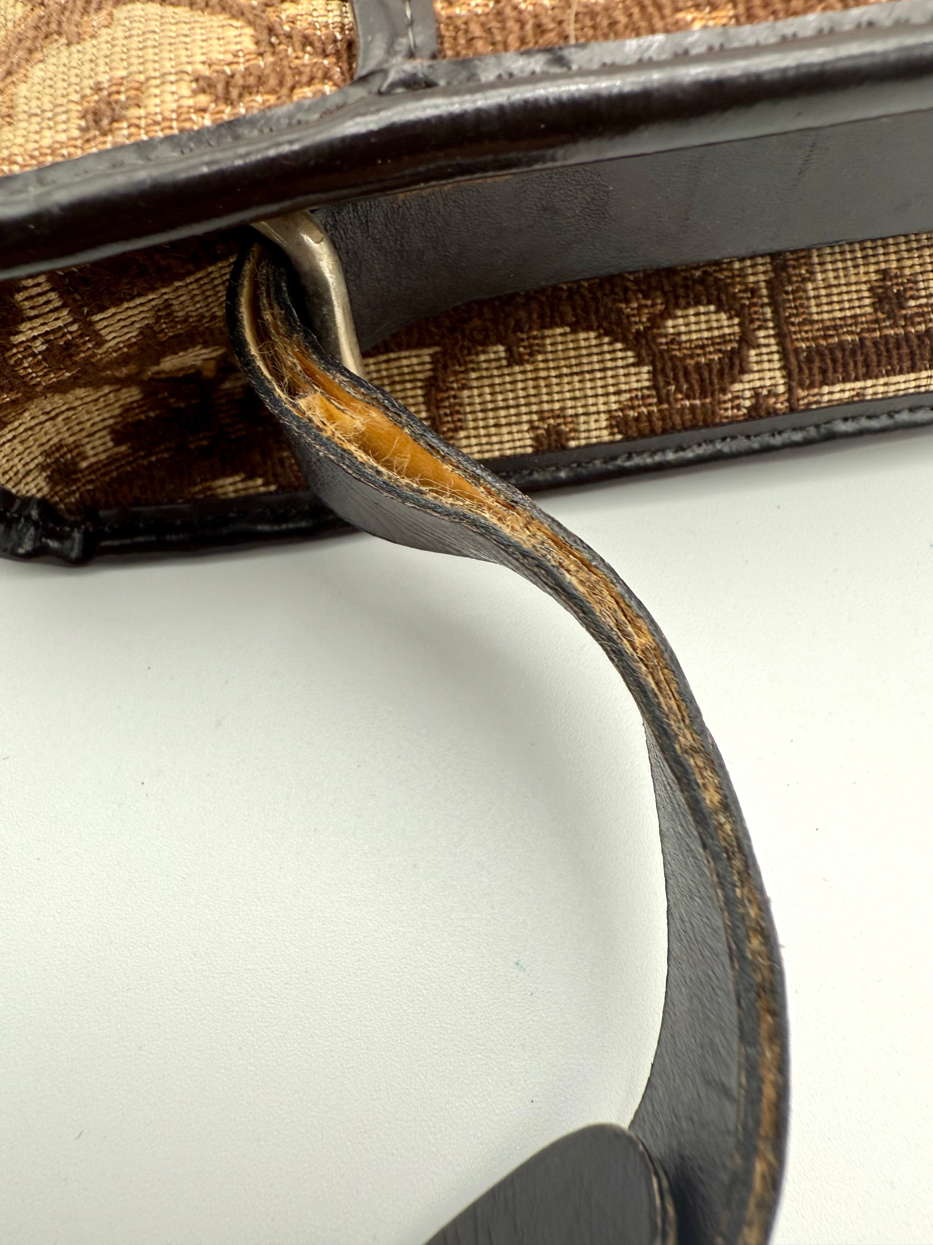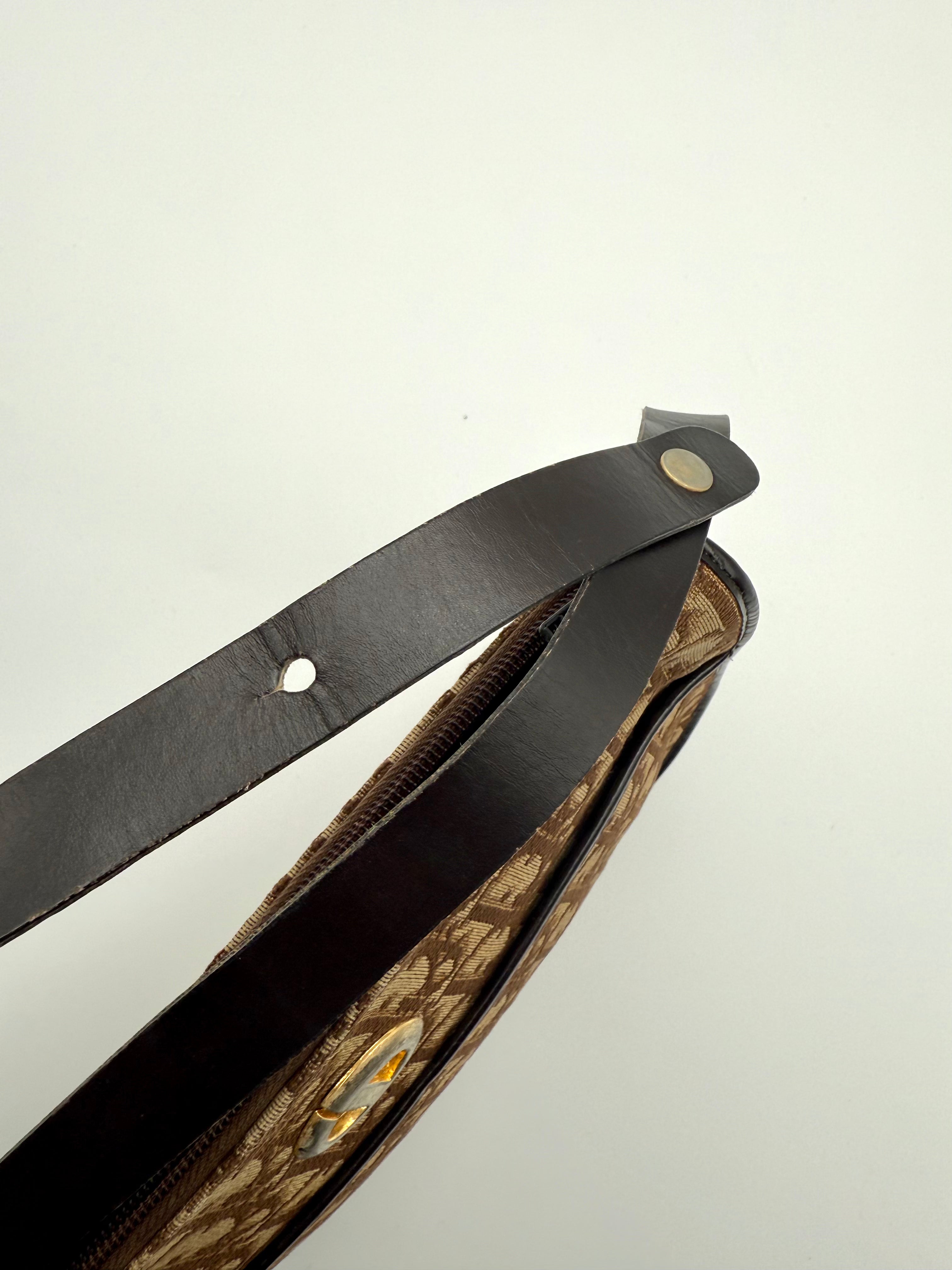 Tweedehands Christian Dior Trotter Canvas bag in de kleur bruin/beige met gouden hardware. De tas beschikt over twee voorvakjes en een achtervakje. De tas kan kort en als crossbody gedragen worden. Het item verkeert in een zeer goede vintage staat, met algemene gebruikssporen. De tas wordt geleverd in onze mooie Moon flower dustbag.