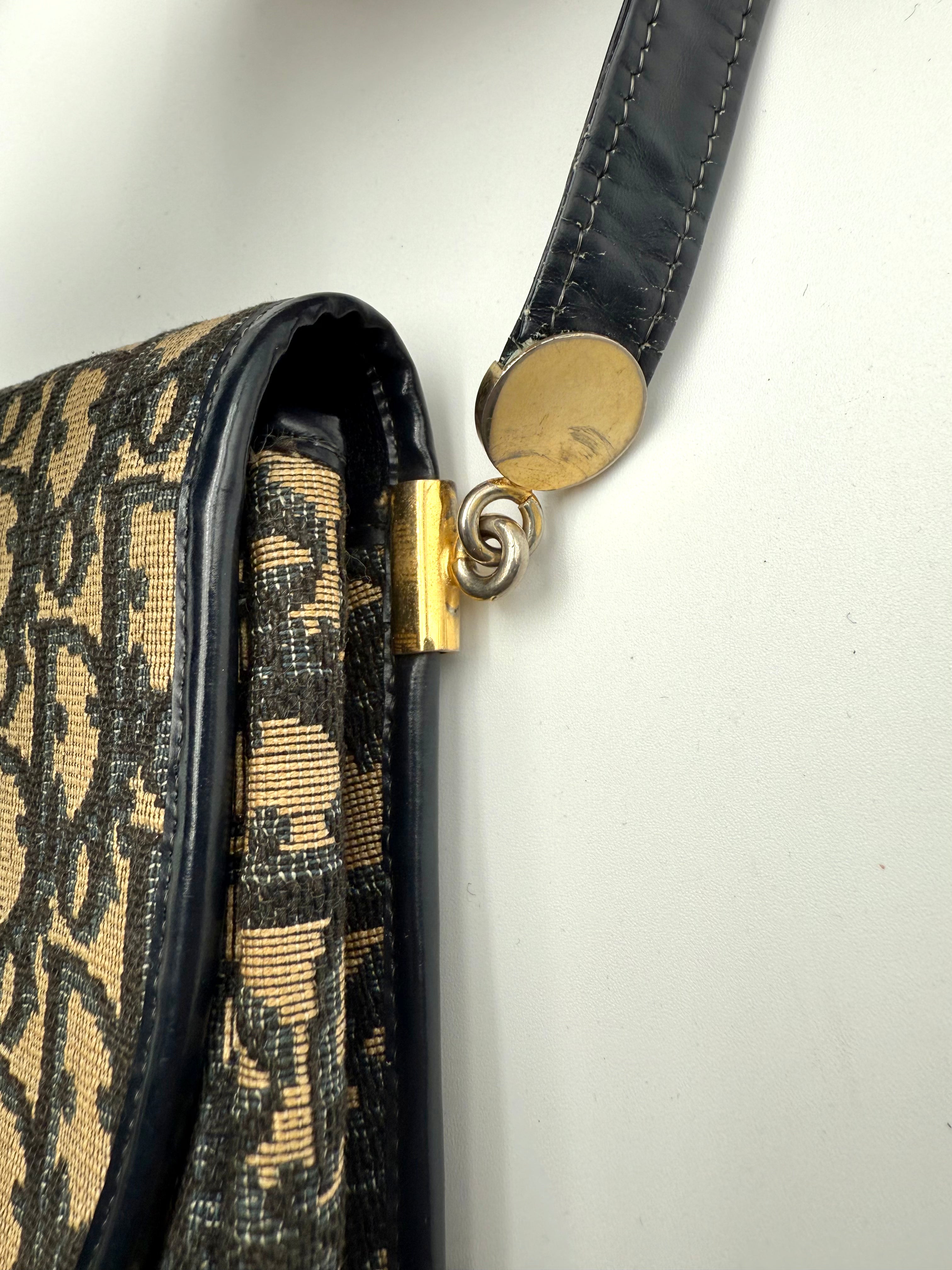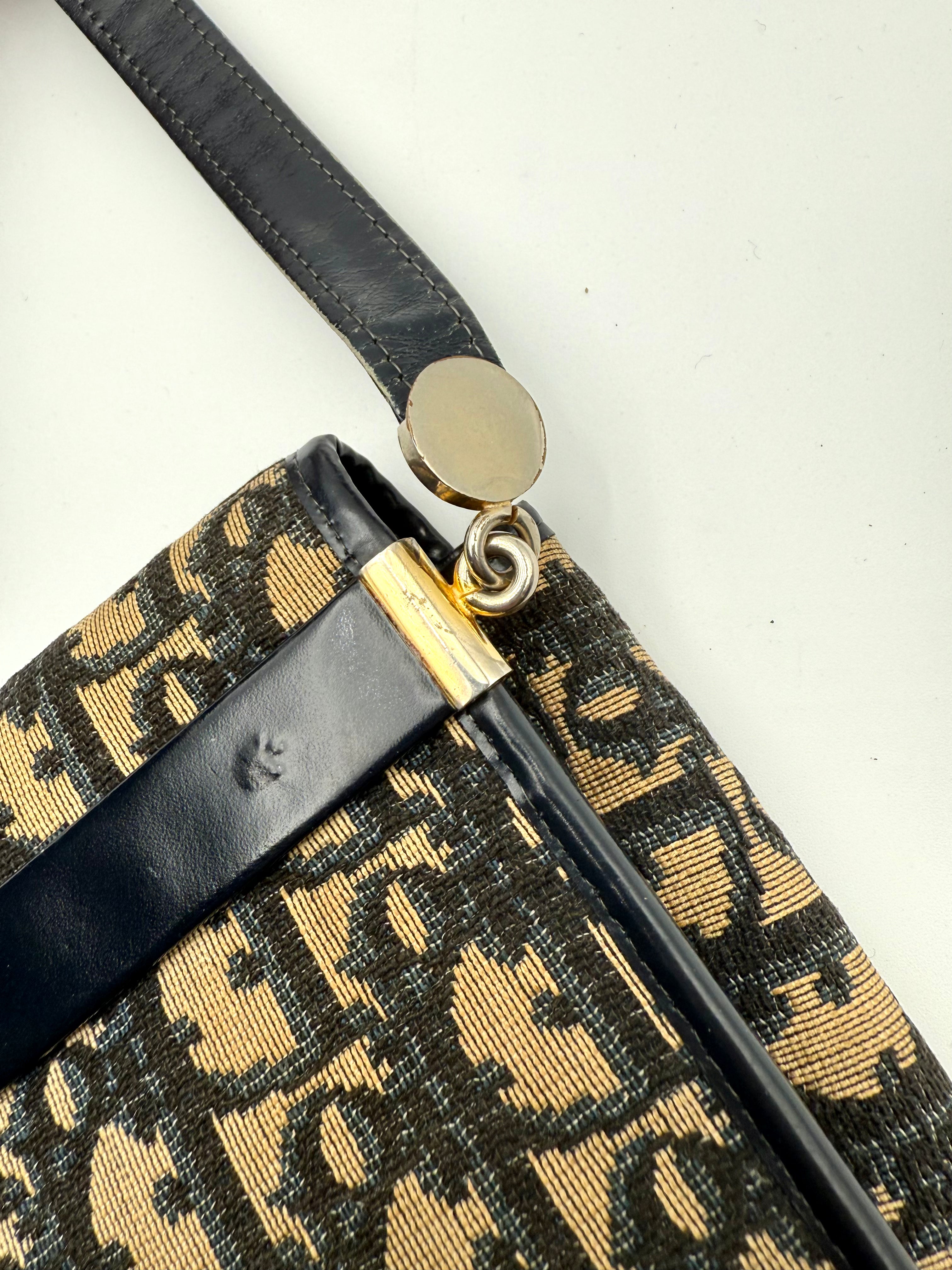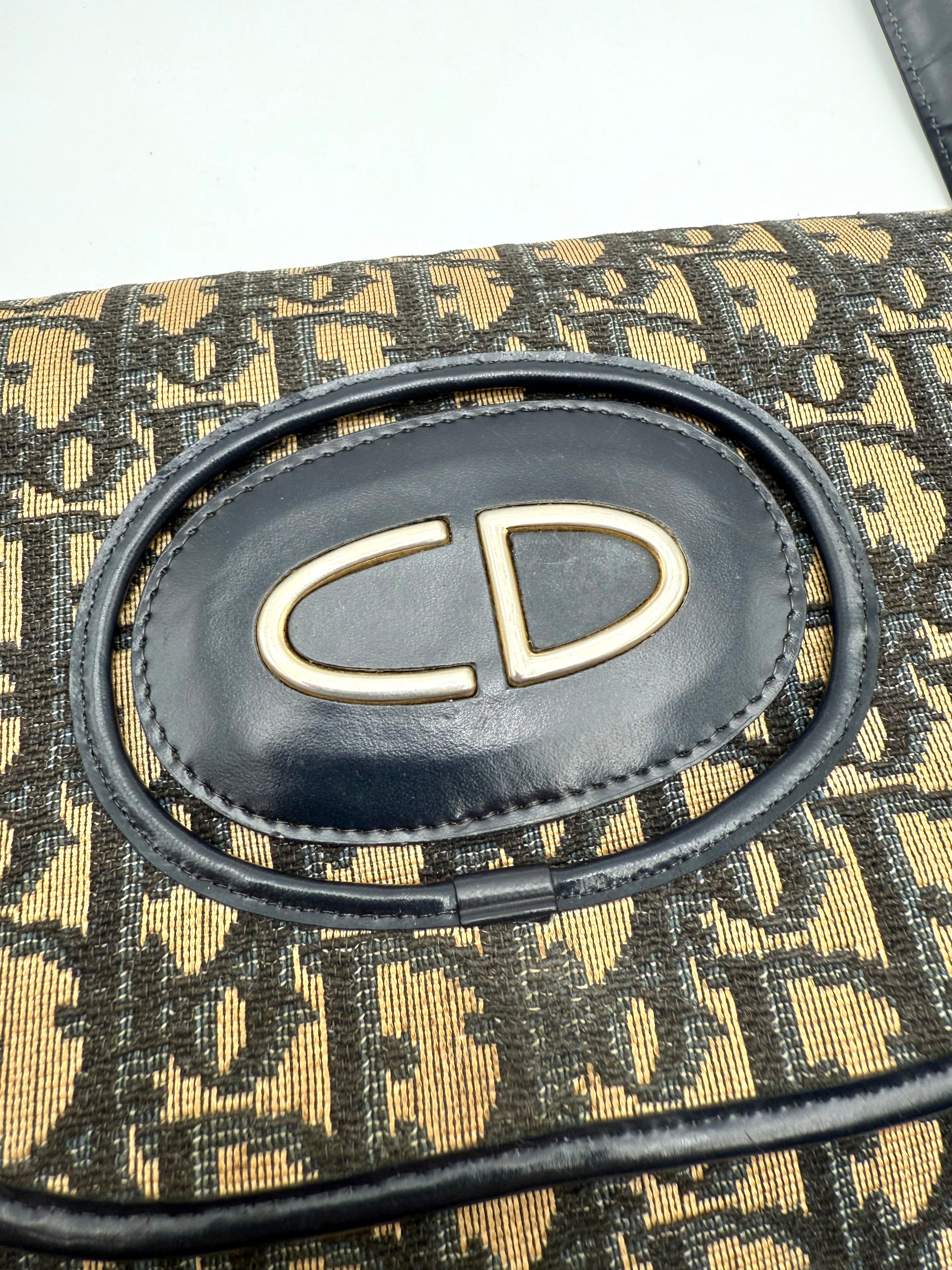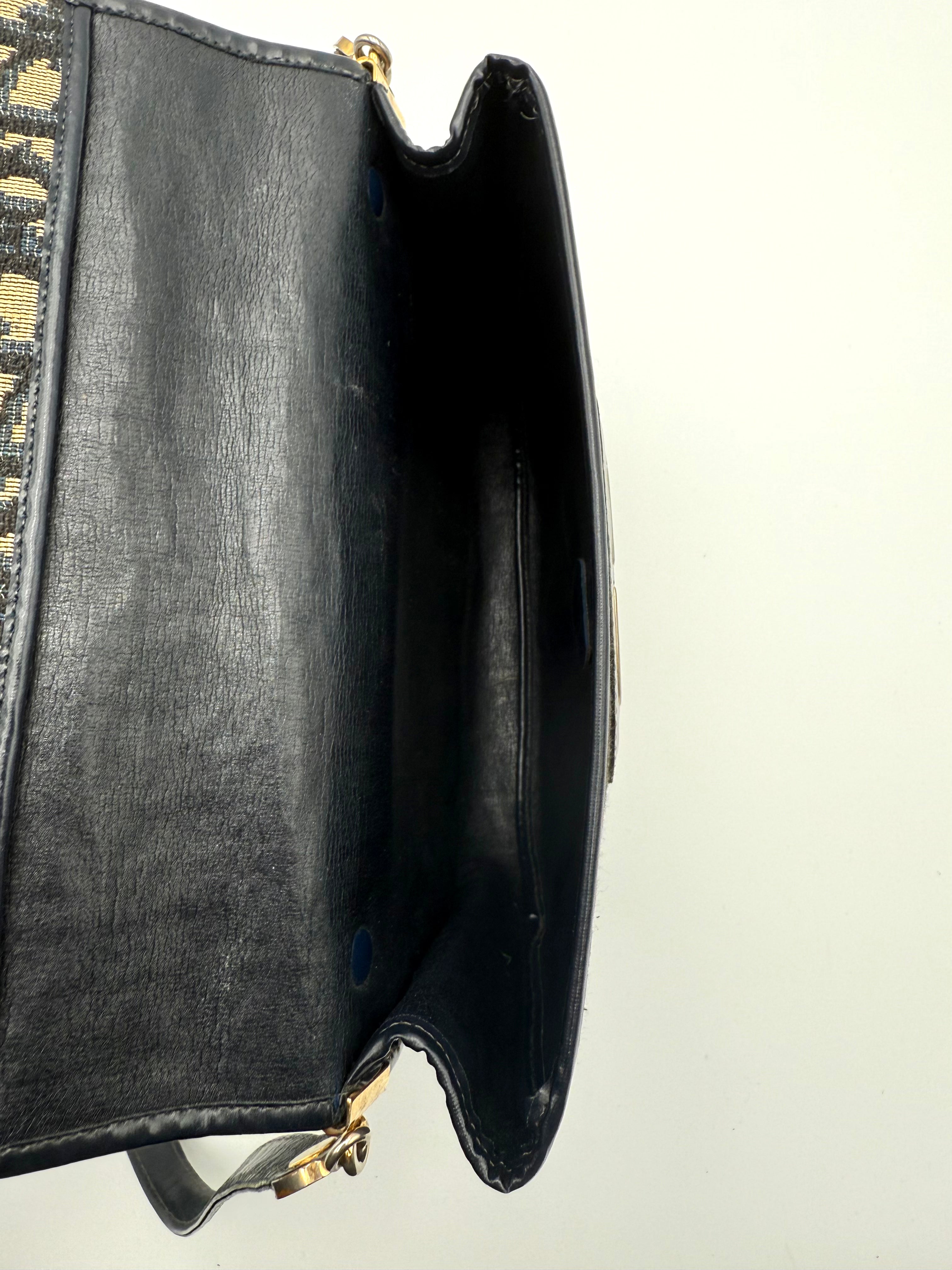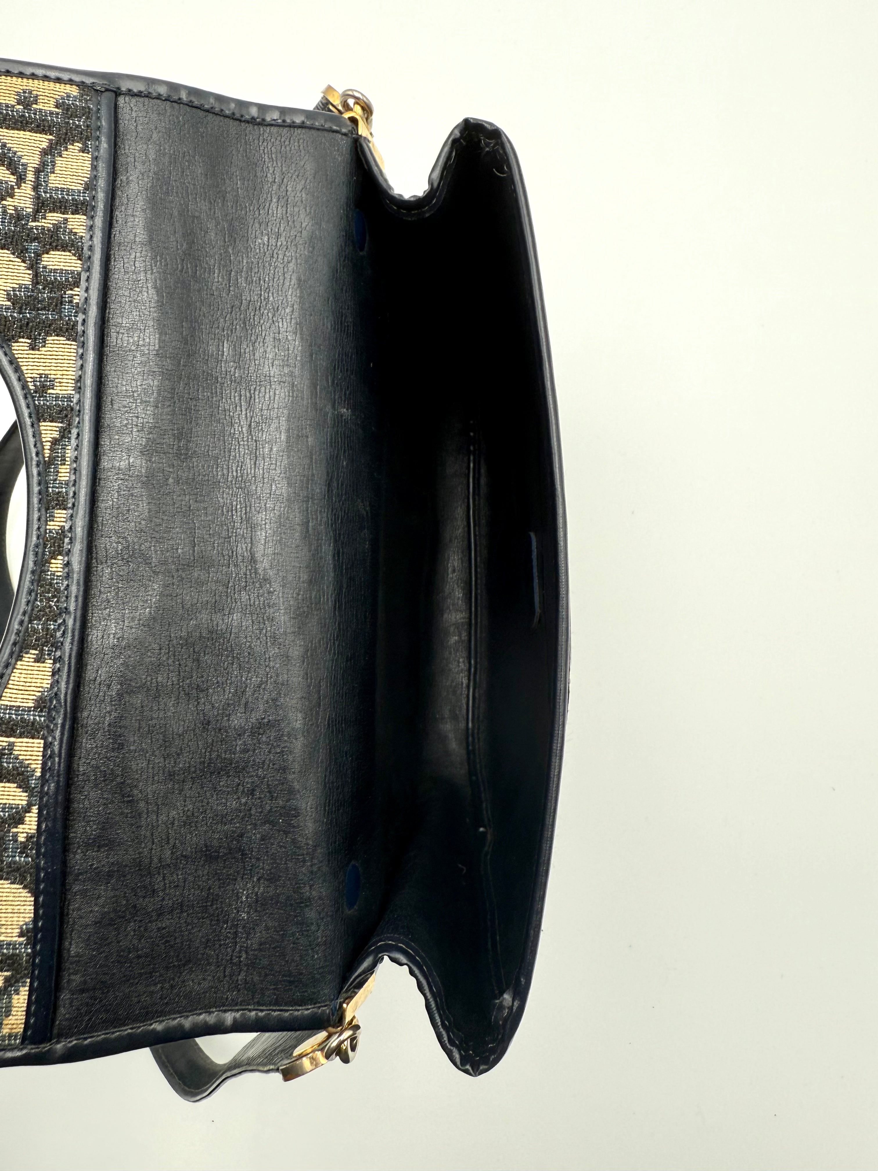 Tweedehands Christian Dior Trotter Canvas bag in de kleur blauw/beige met gouden hardware. Het item verkeert in een zeer goede vintage staat, met algemene gebruikssporen. De tas wordt geleverd in onze mooie Moon flower dustbag.
