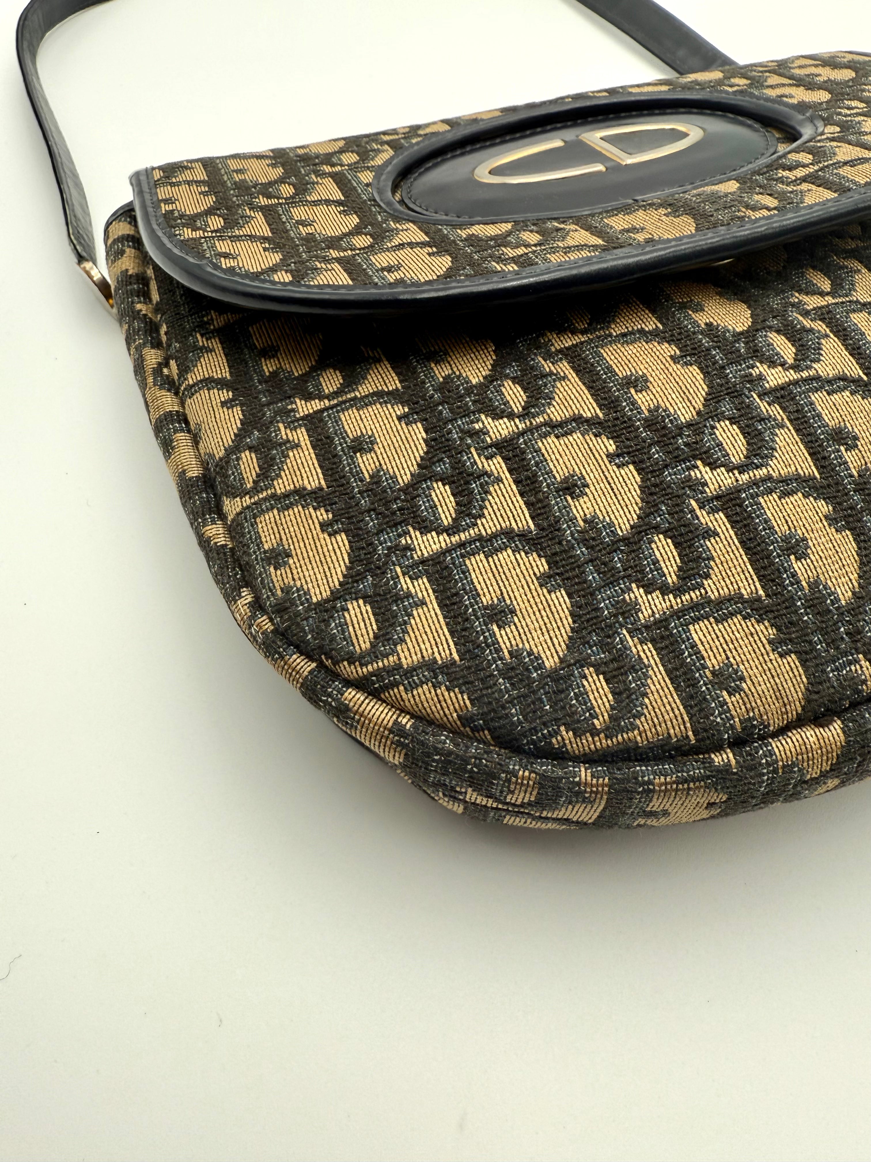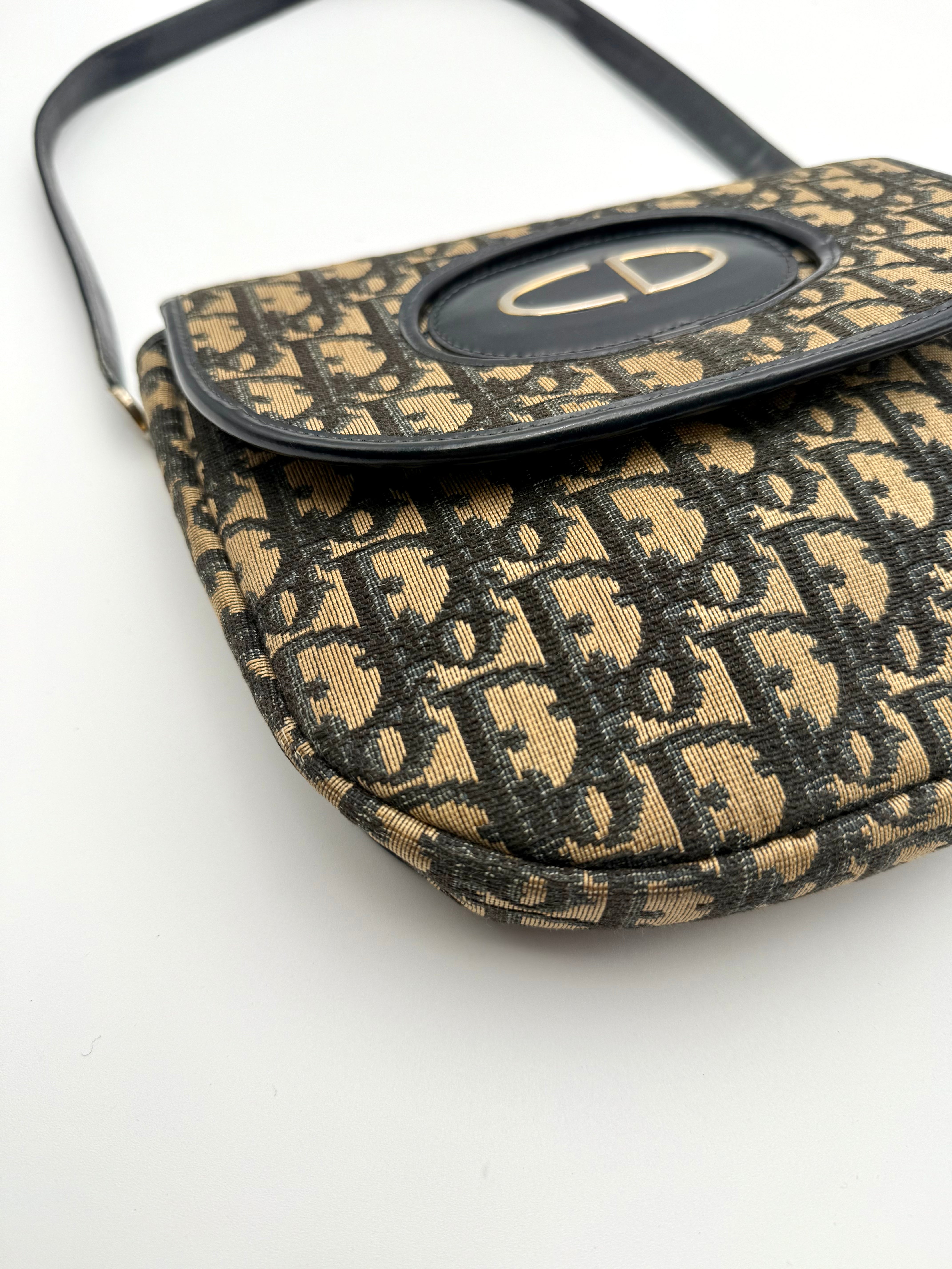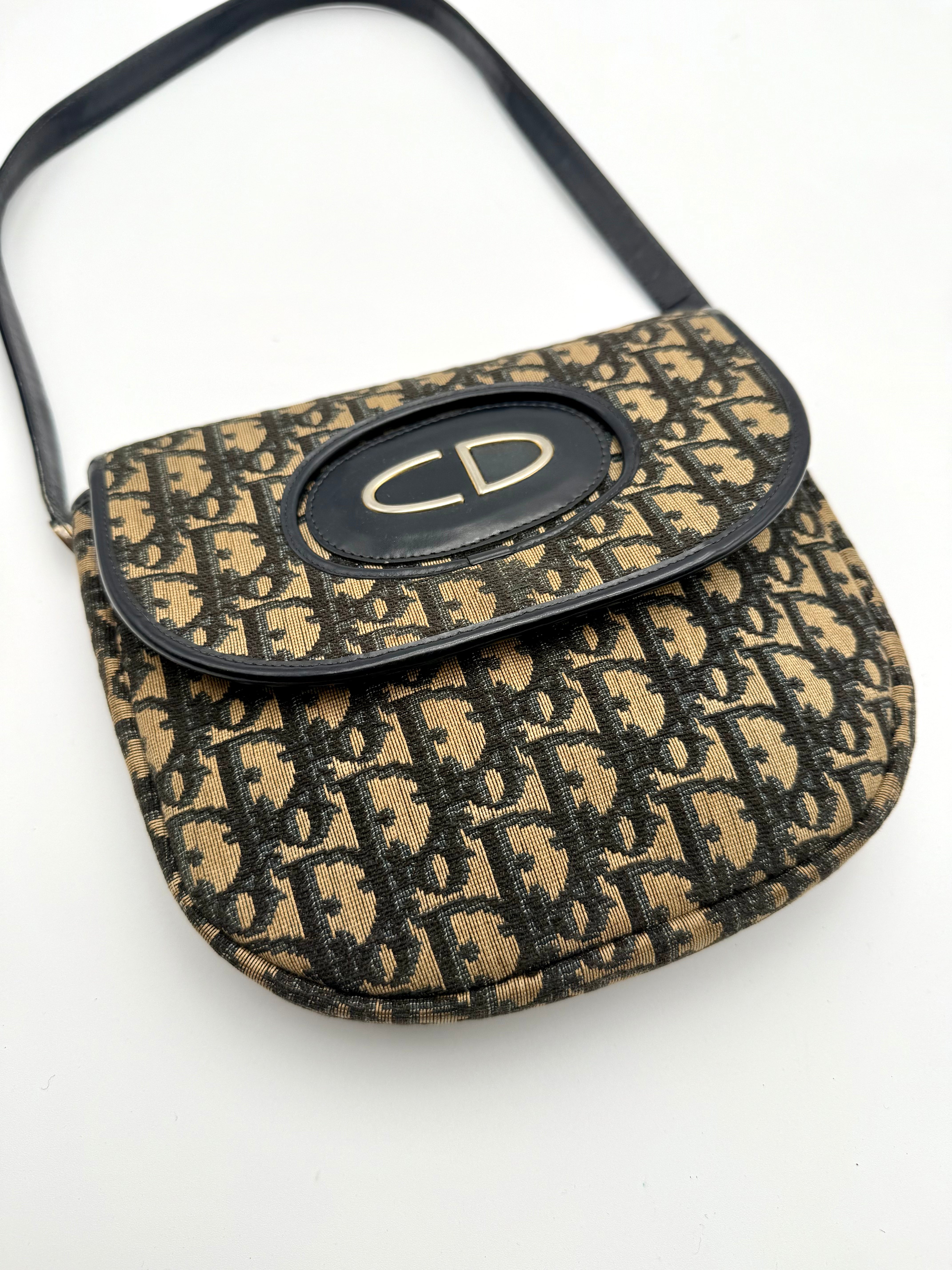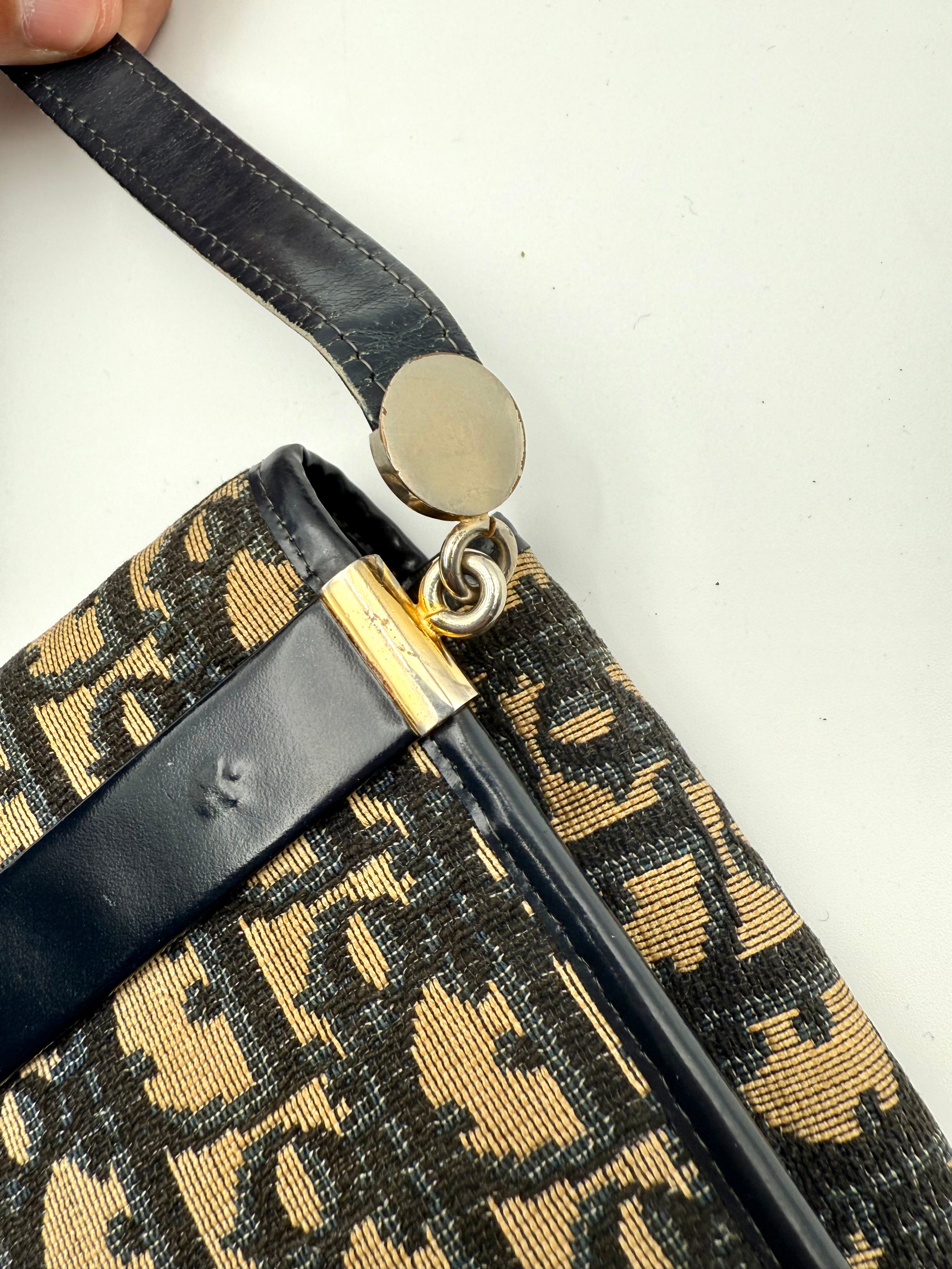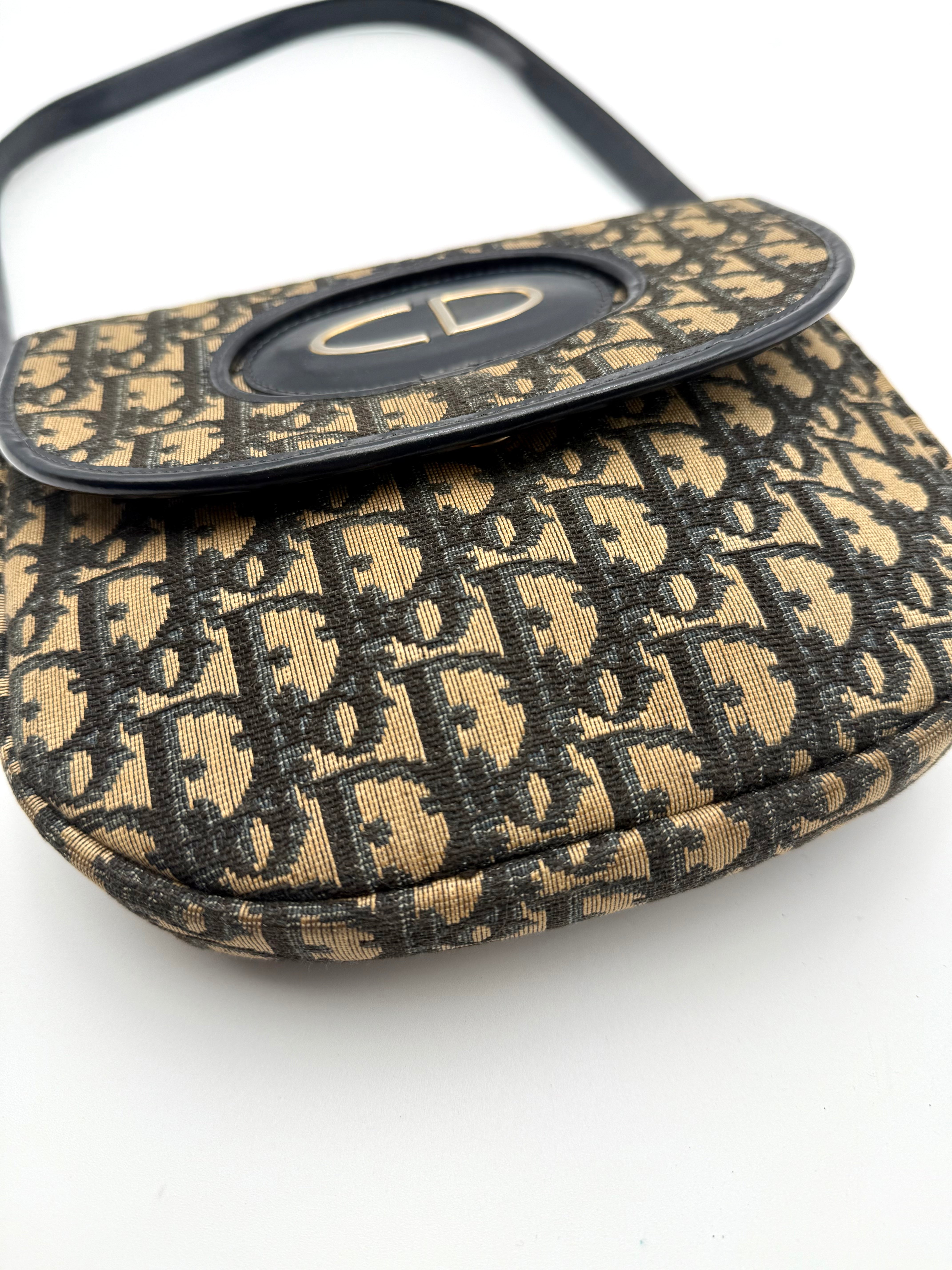 Tweedehands Christian Dior Trotter Canvas bag in de kleur blauw/beige met gouden hardware. Het item verkeert in een zeer goede vintage staat, met algemene gebruikssporen. De tas wordt geleverd in onze mooie Moon flower dustbag.