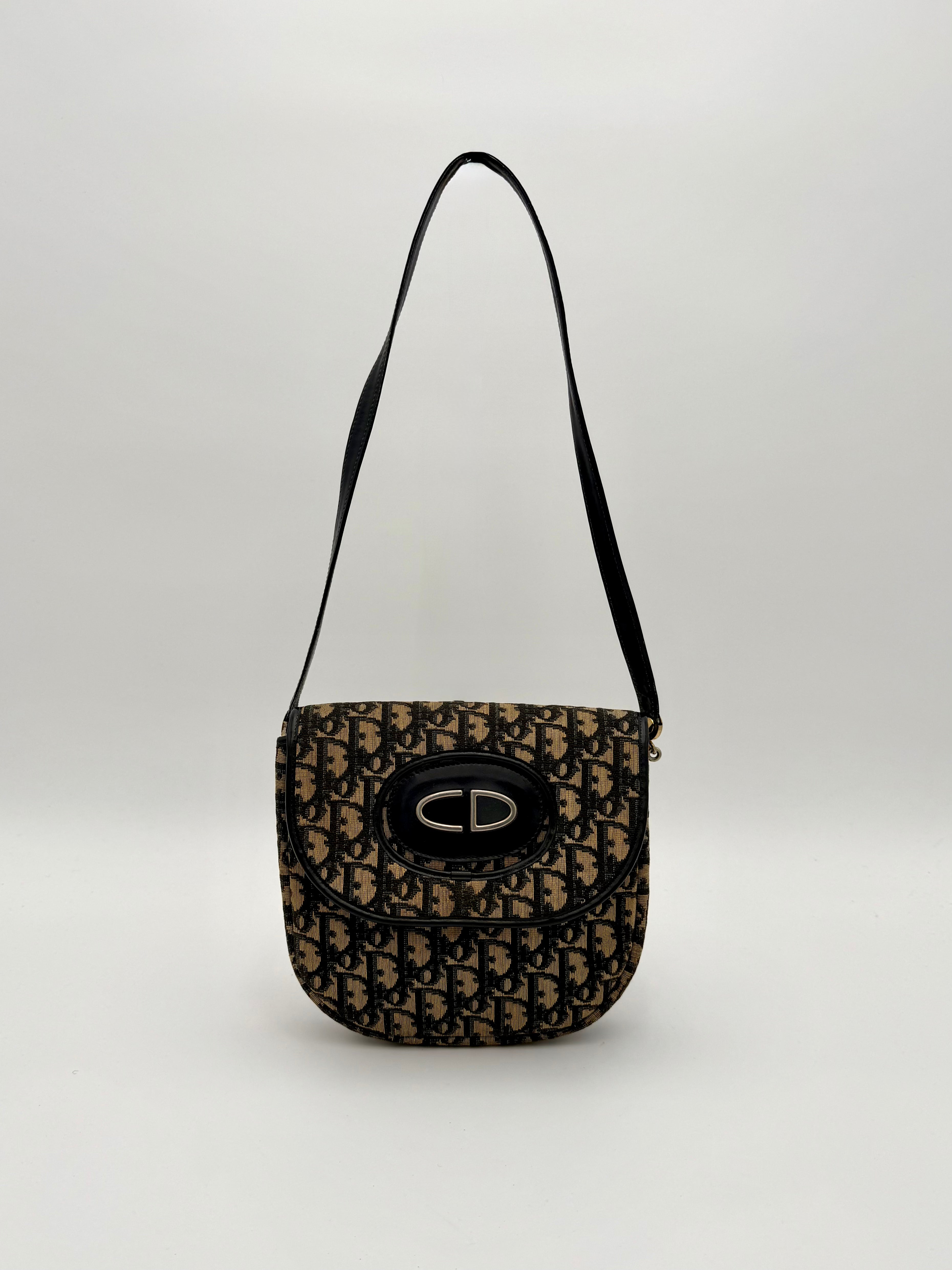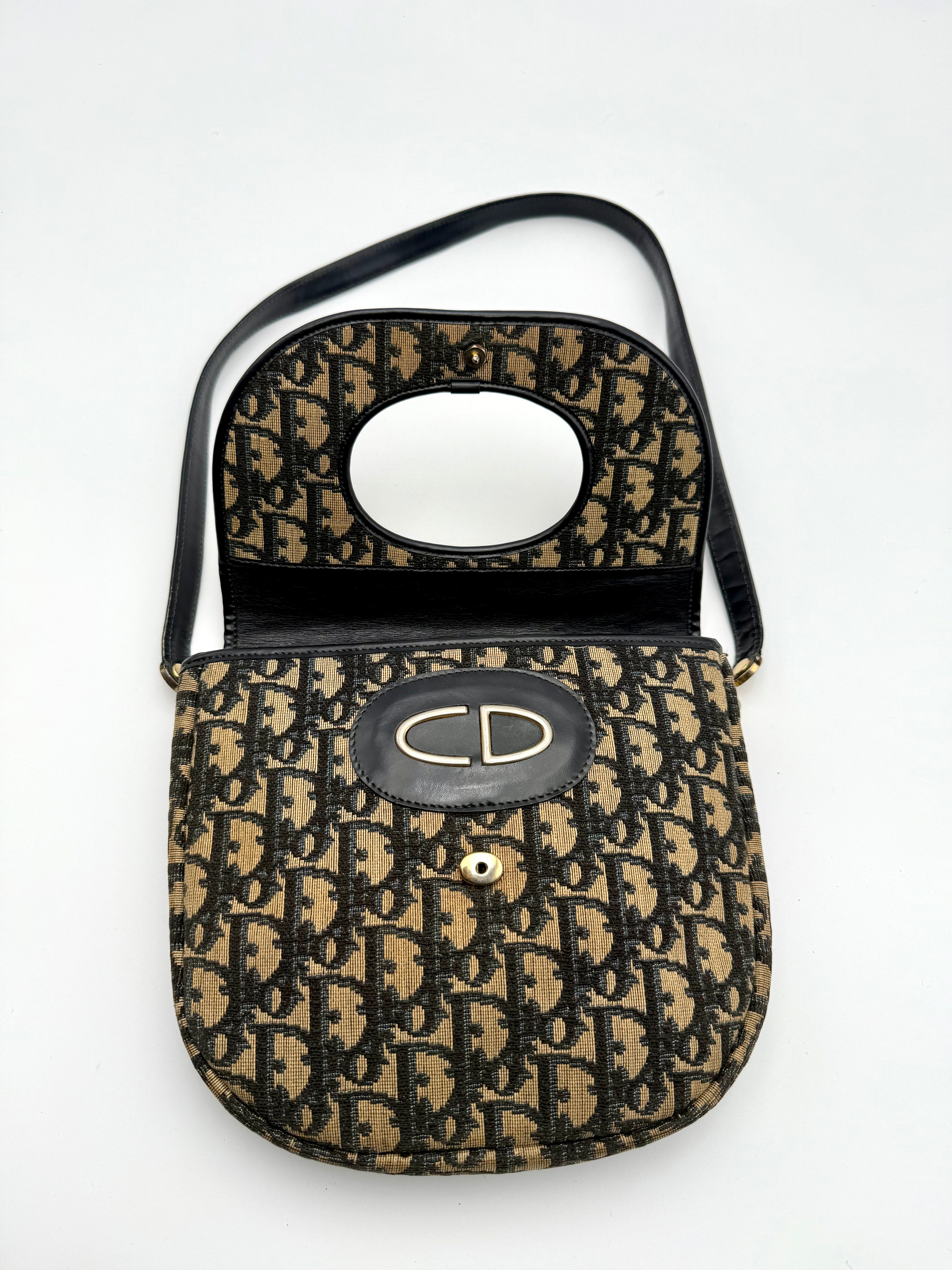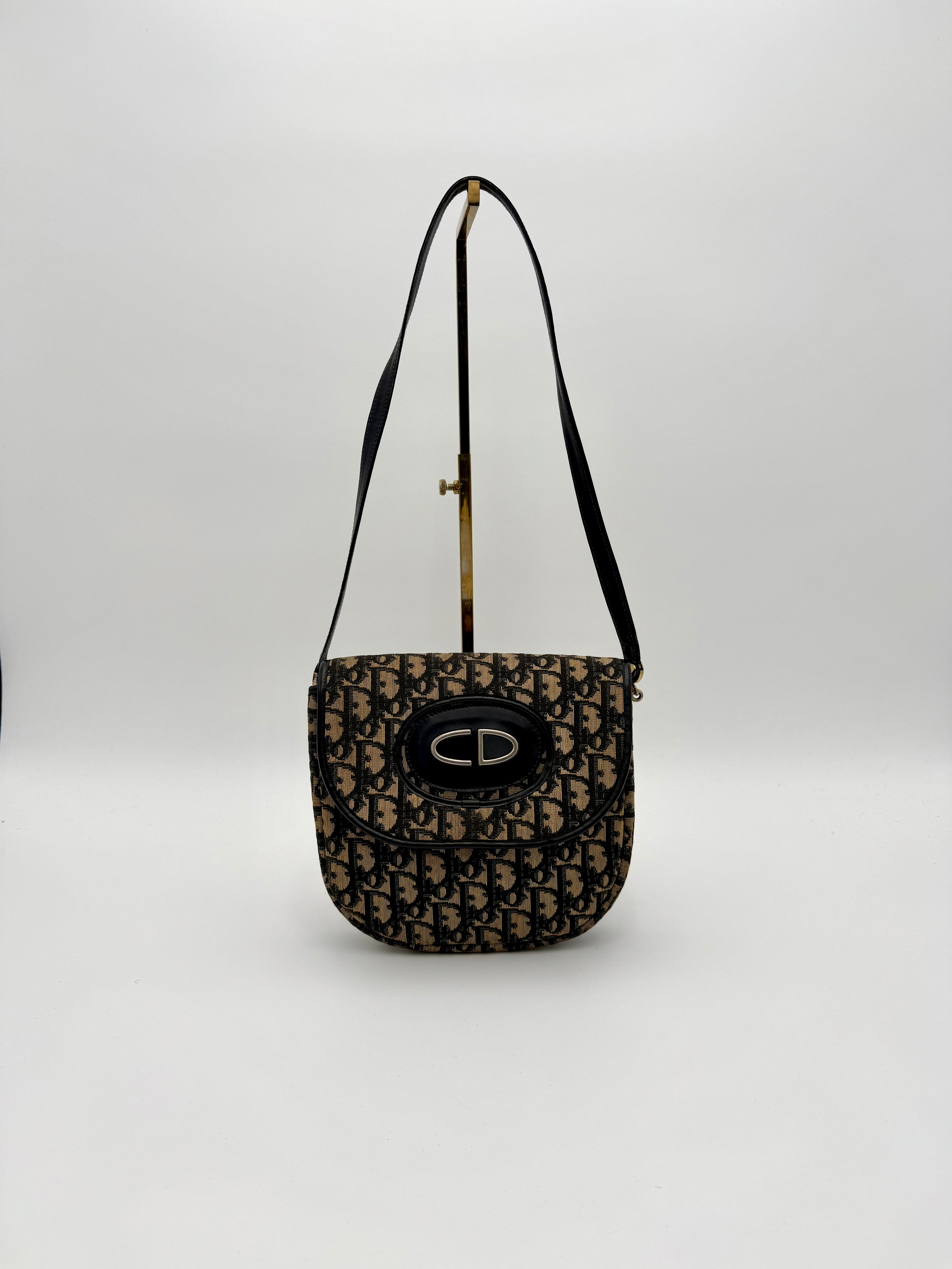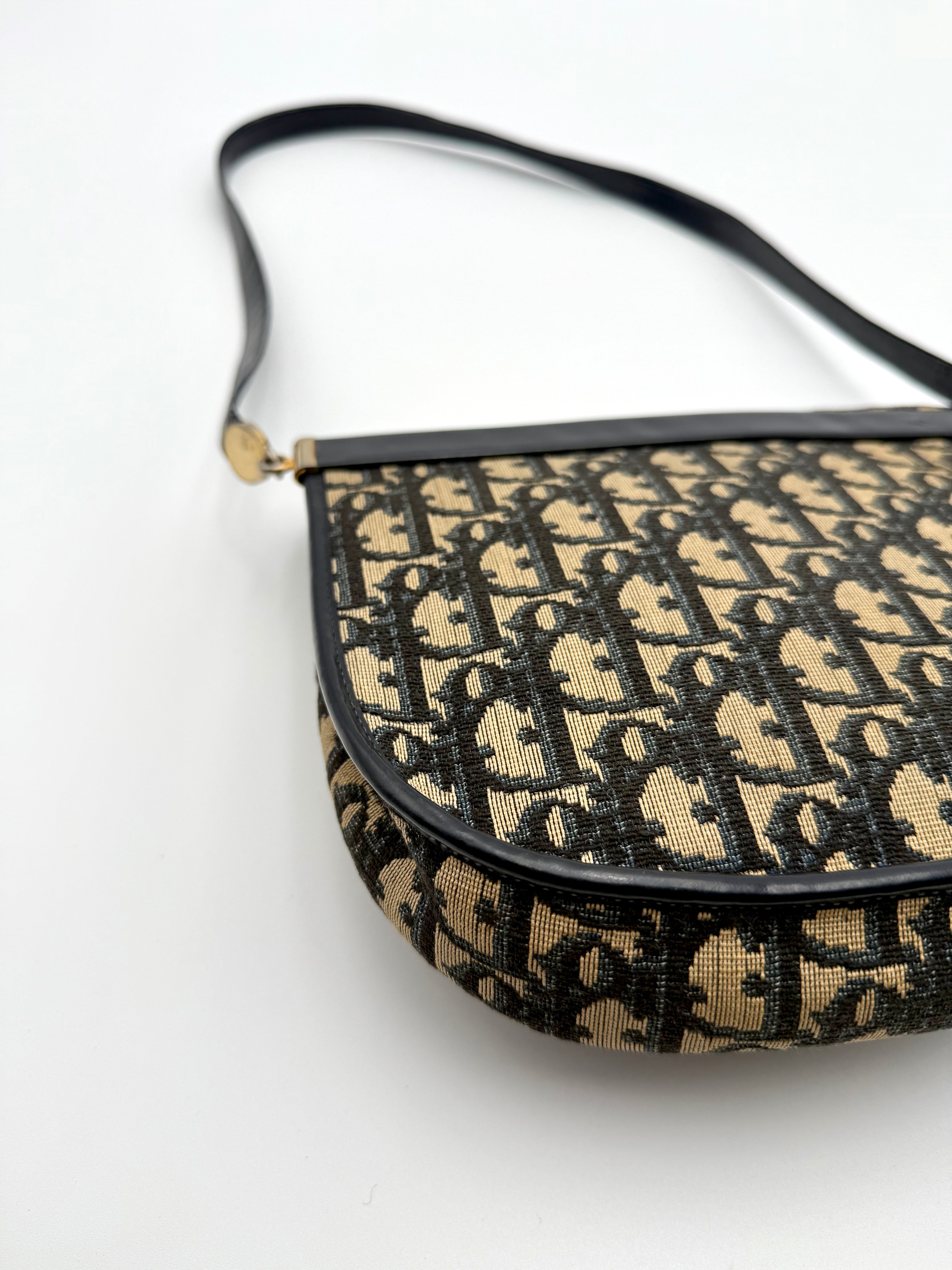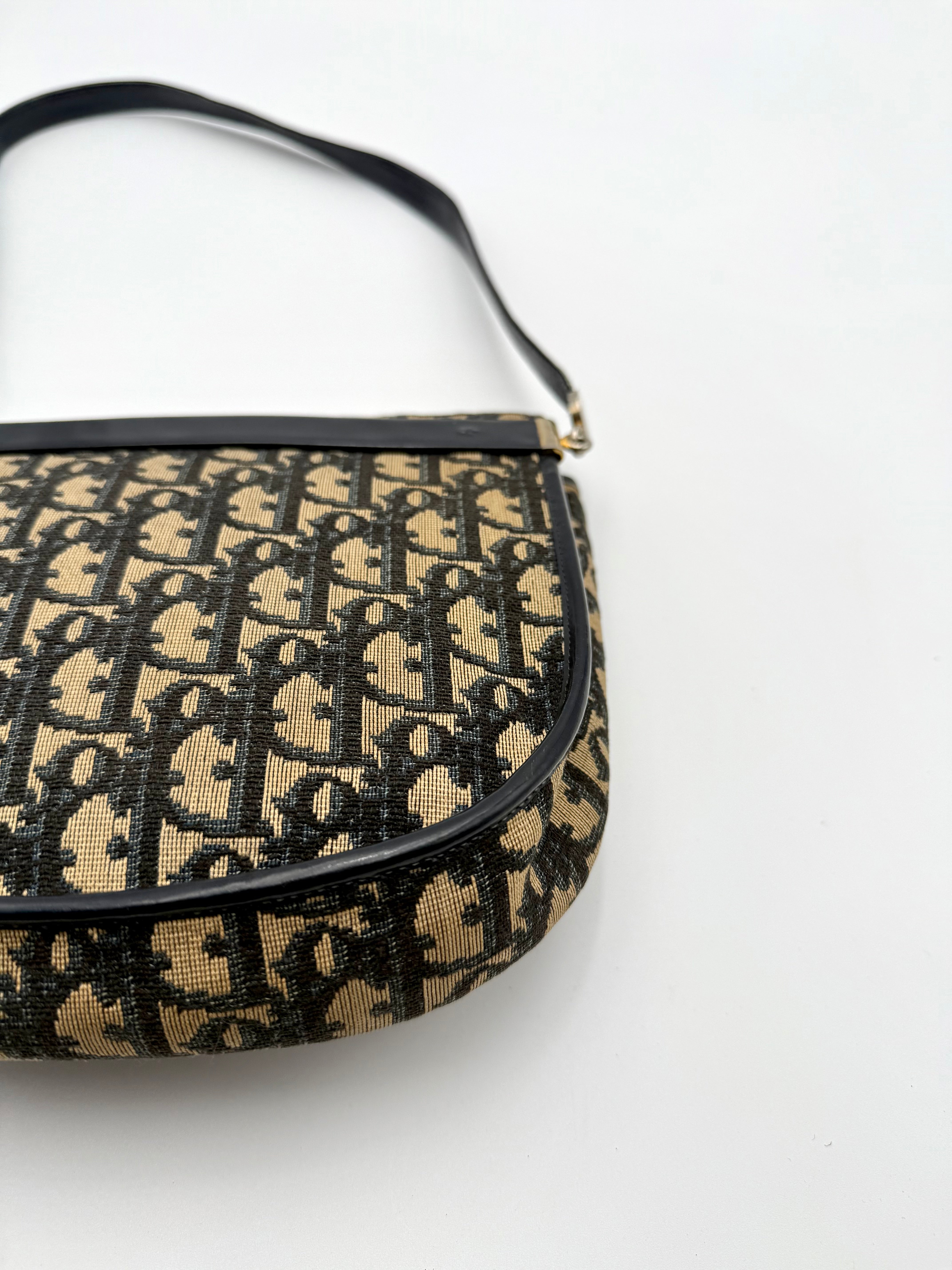 Tweedehands Christian Dior Trotter Canvas bag in de kleur blauw/beige met gouden hardware. Het item verkeert in een zeer goede vintage staat, met algemene gebruikssporen. De tas wordt geleverd in onze mooie Moon flower dustbag.