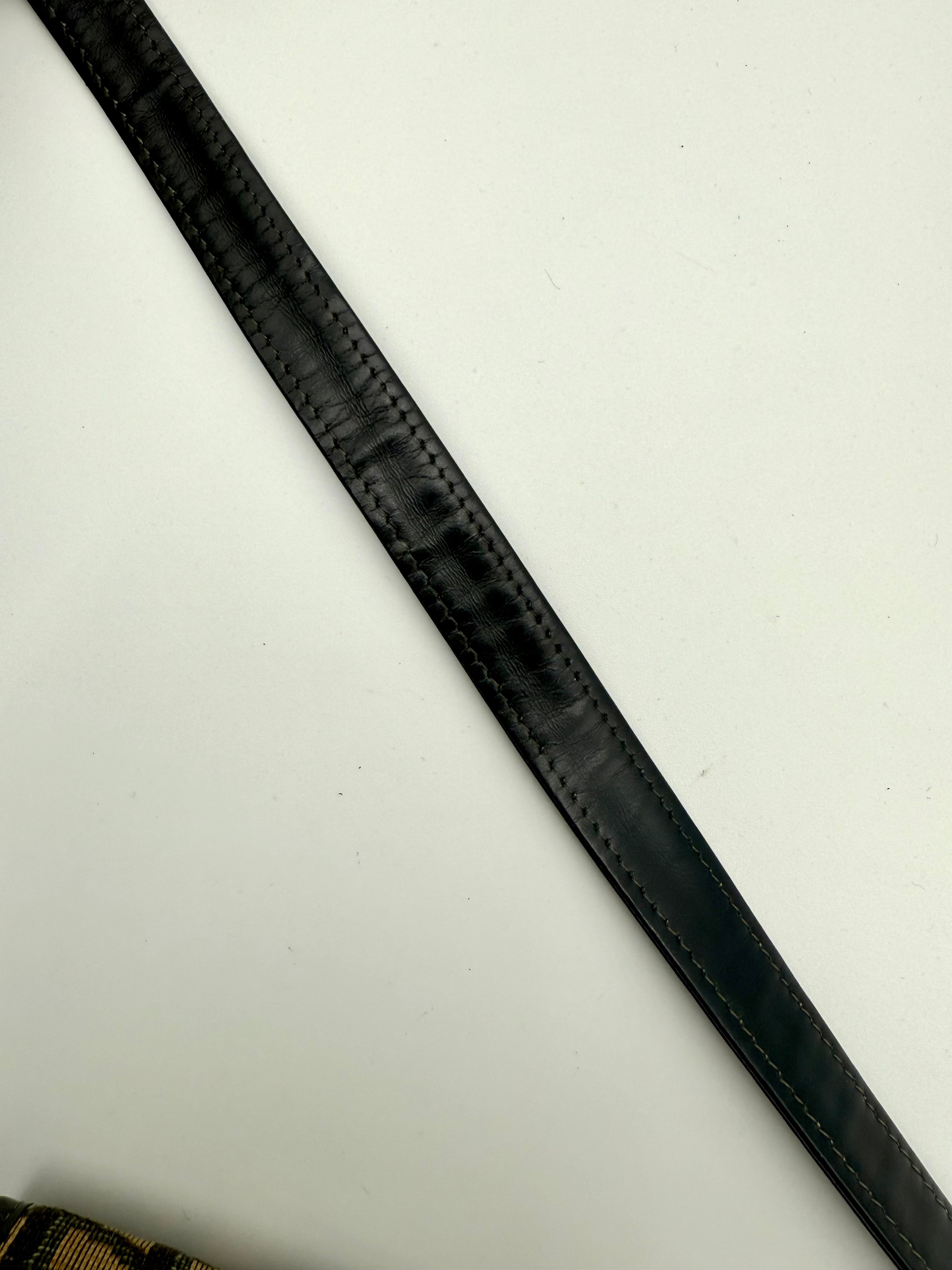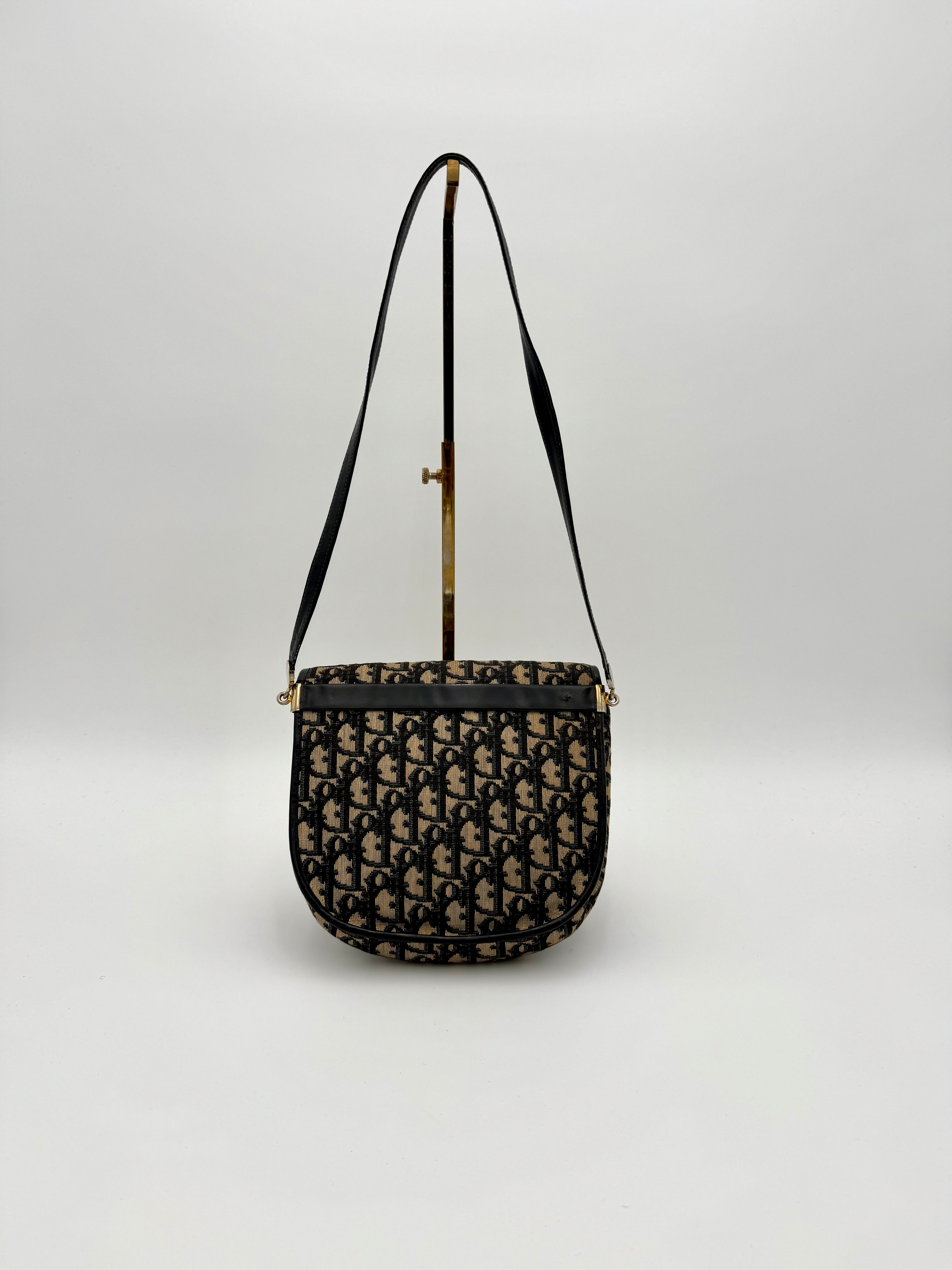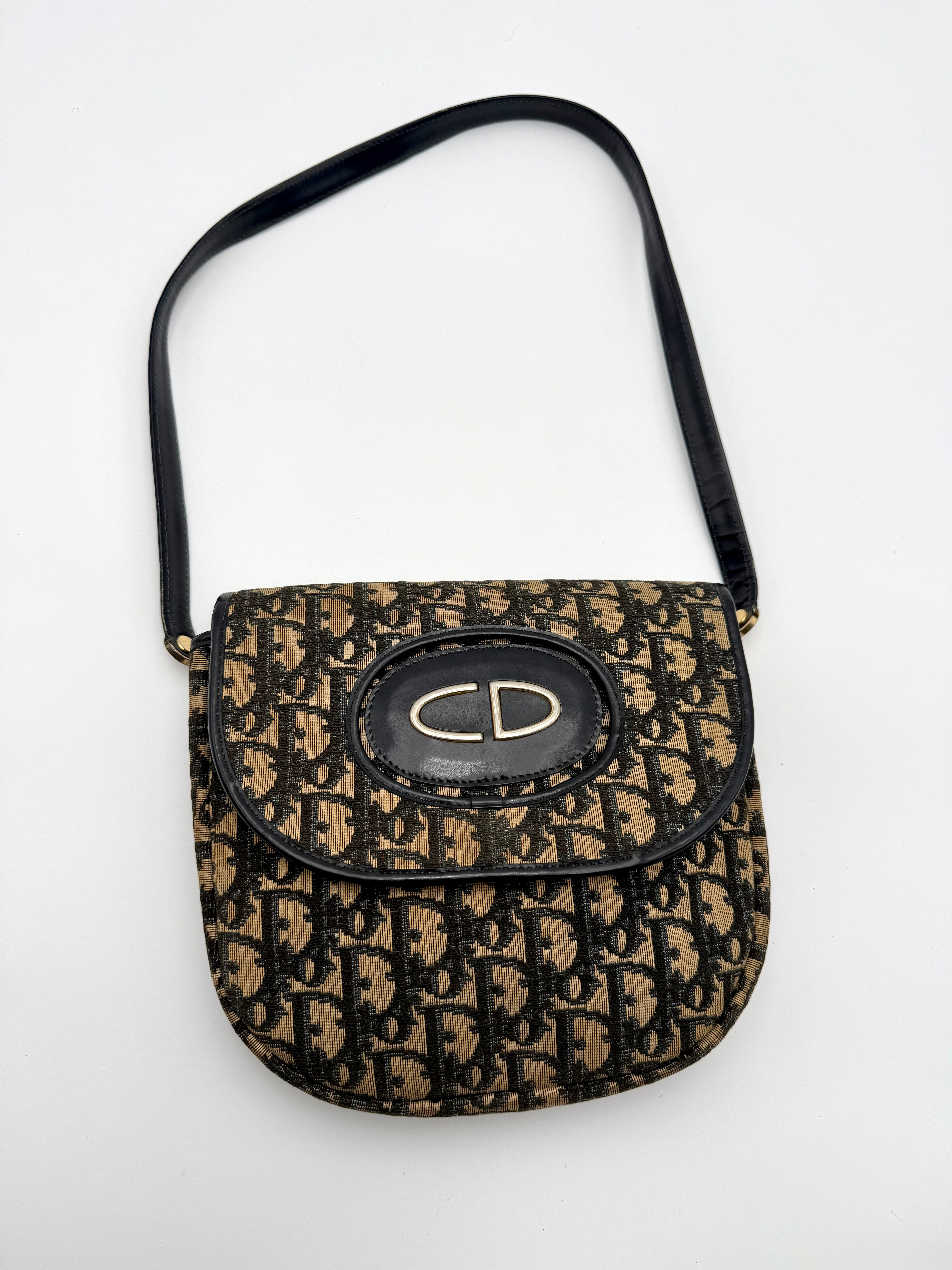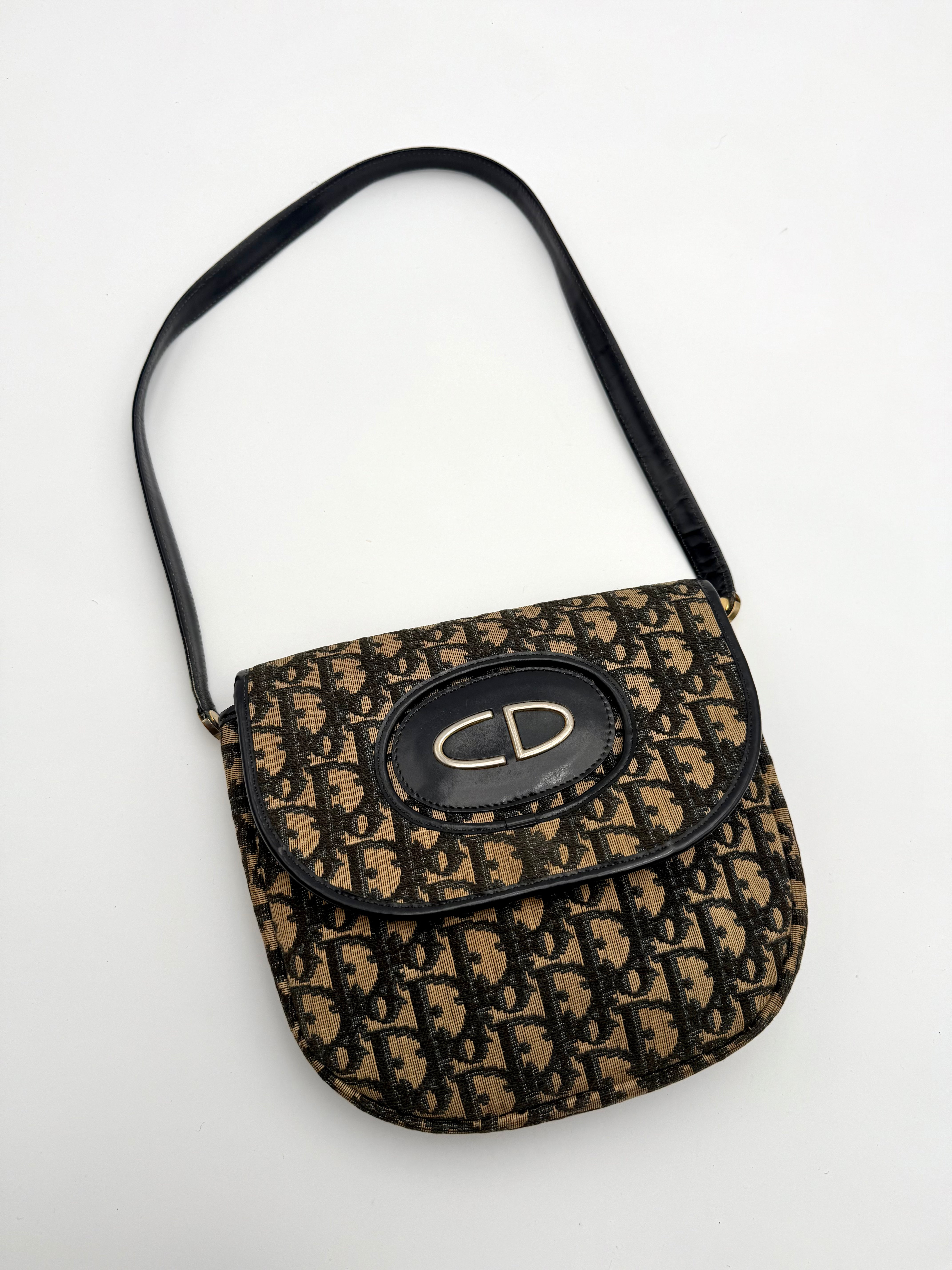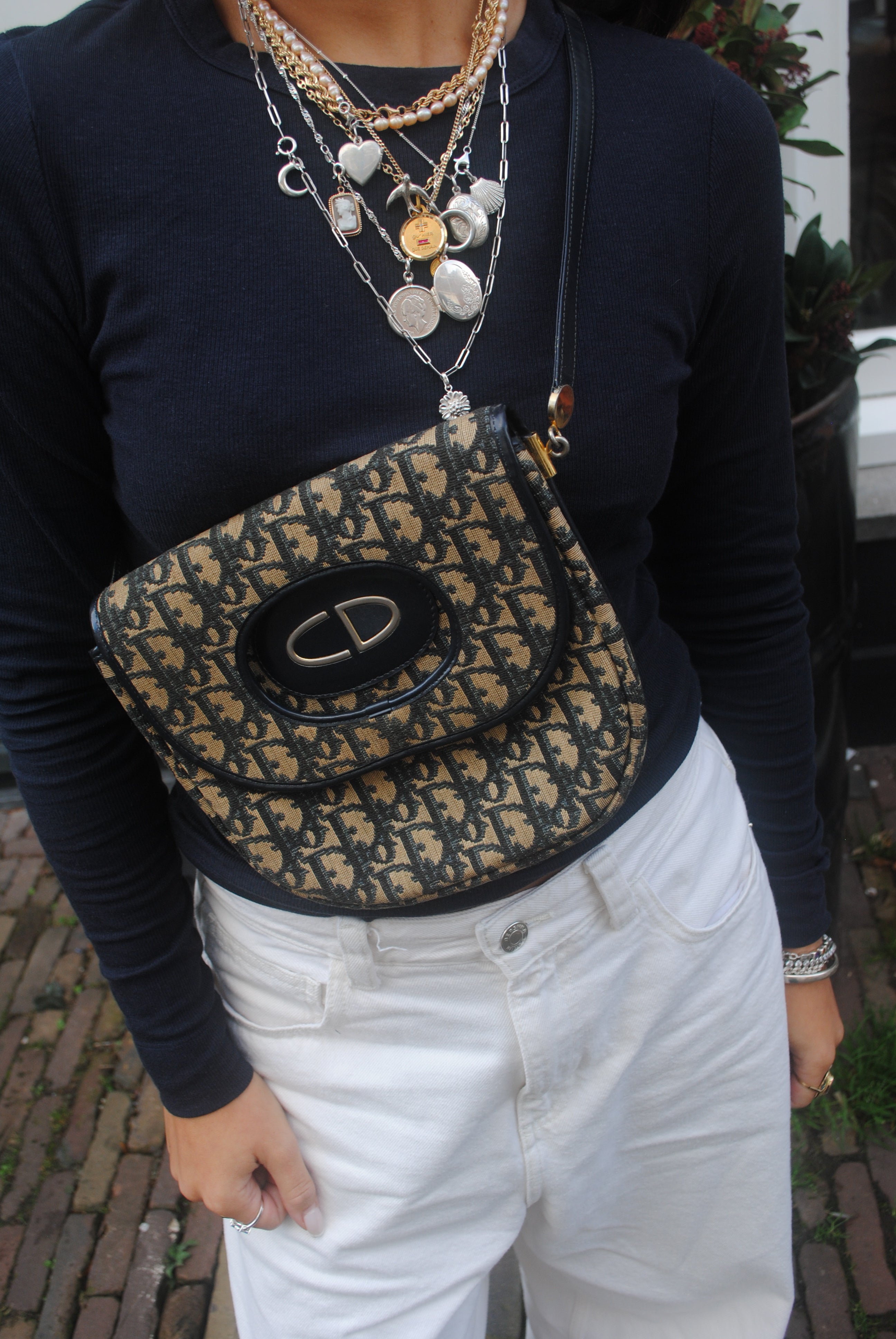 Tweedehands Christian Dior Trotter Canvas bag in de kleur blauw/beige met gouden hardware. Het item verkeert in een zeer goede vintage staat, met algemene gebruikssporen. De tas wordt geleverd in onze mooie Moon flower dustbag.