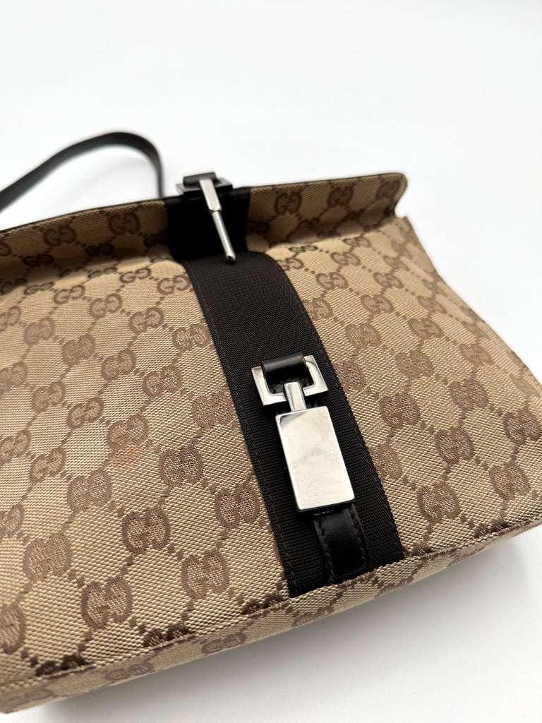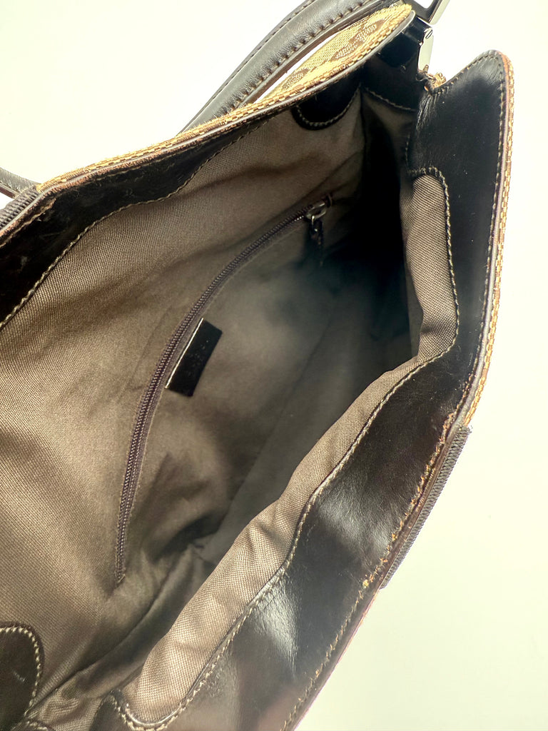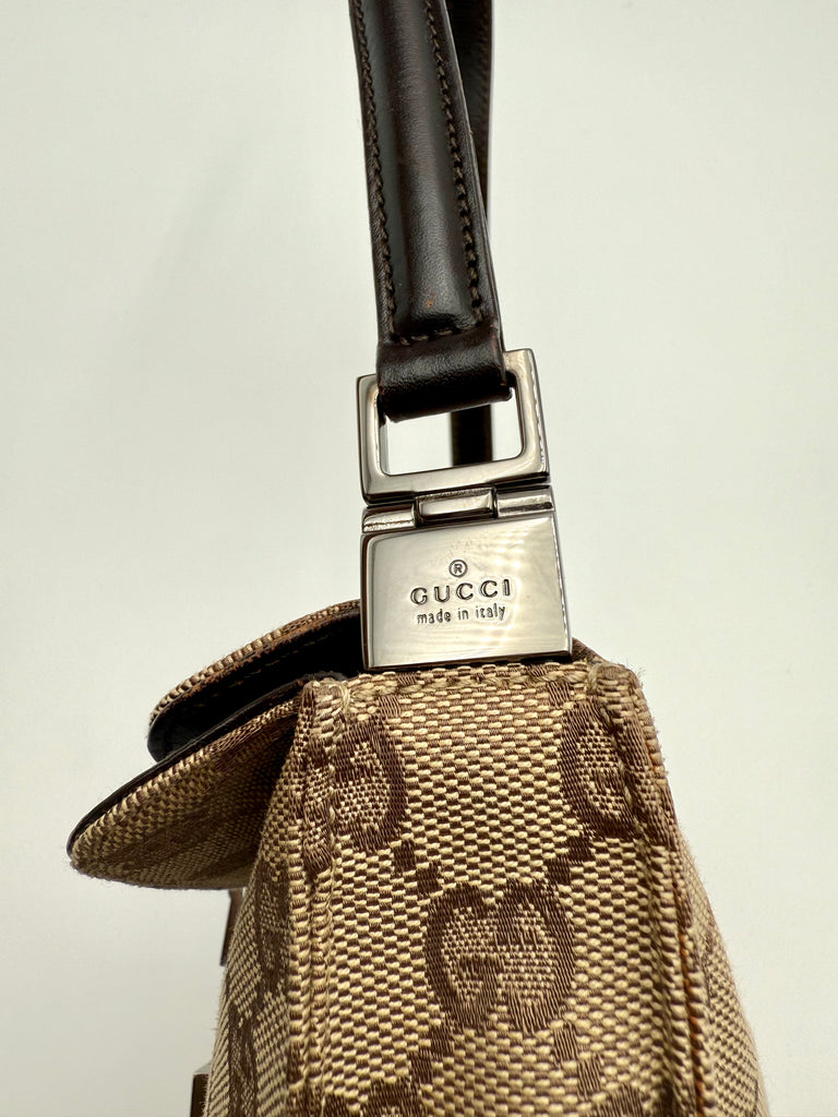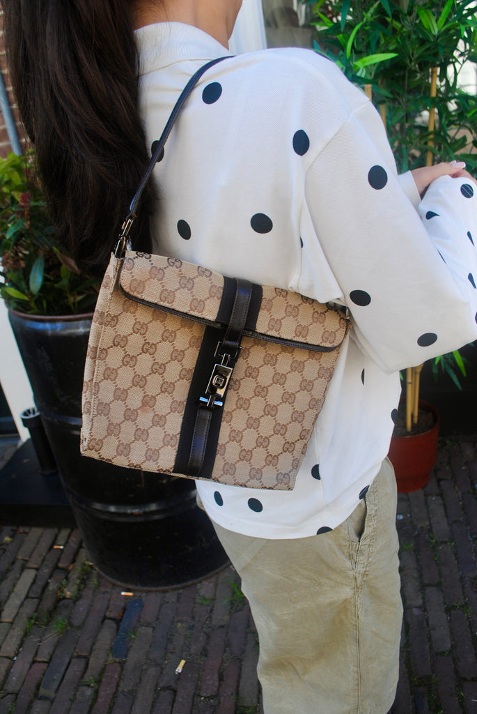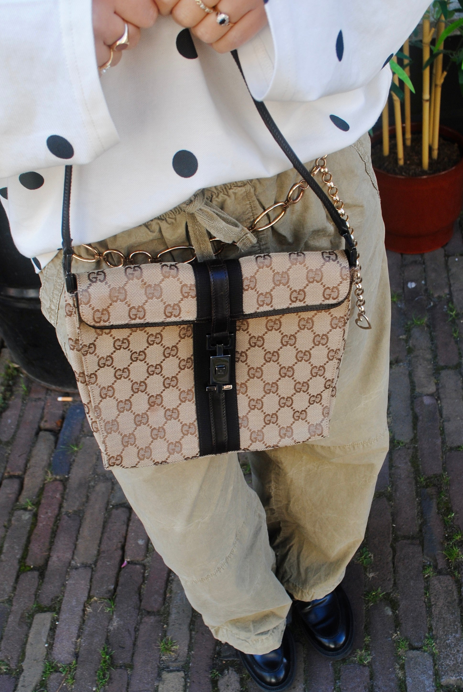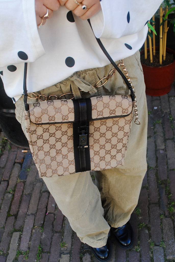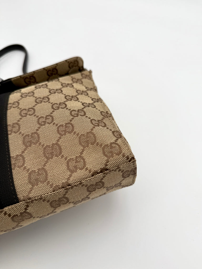 Tweedehands GUCCI Supreme canvas bag. De tas is van canvas met een mooi leren hengsel. De tas sluit met een clip en beschikt over een binnenvak met rits. Het item verkeert in een mooie vintage staat, met algemene gebruikssporen. De tas wordt geleverd in onze mooie Moon flower dustbag.