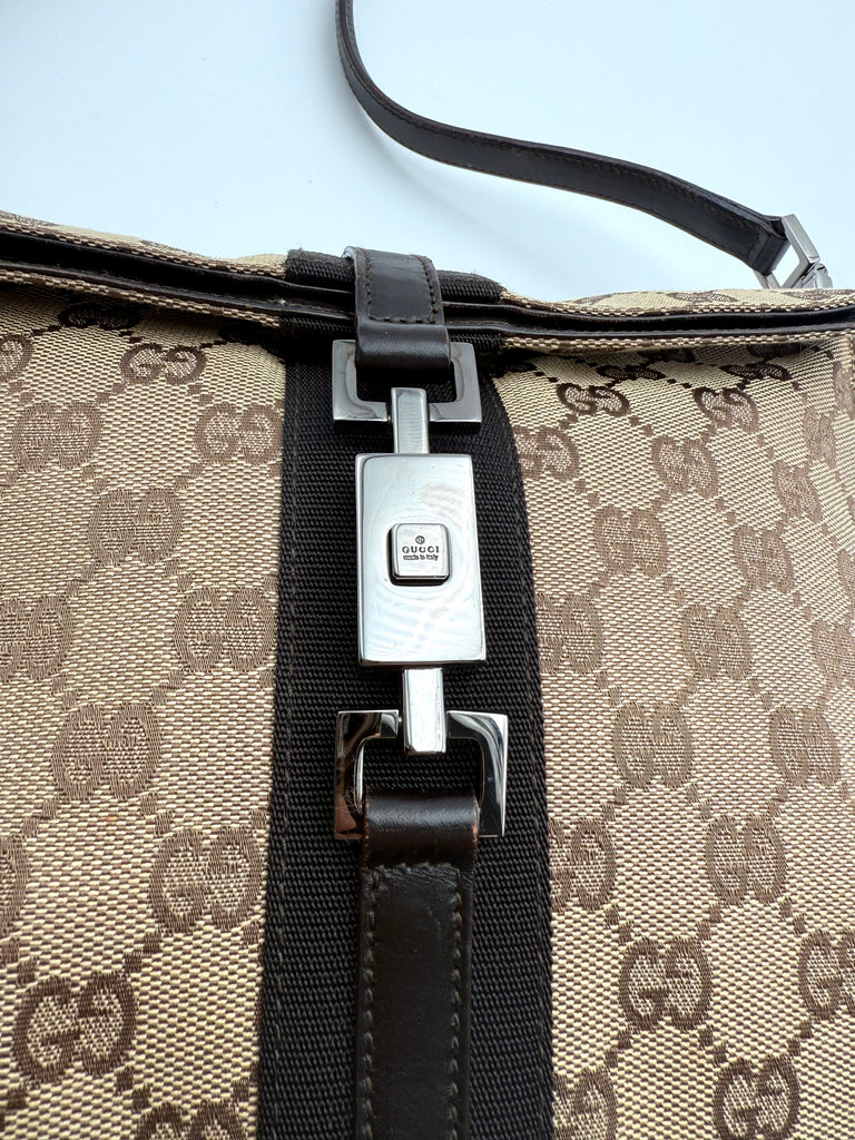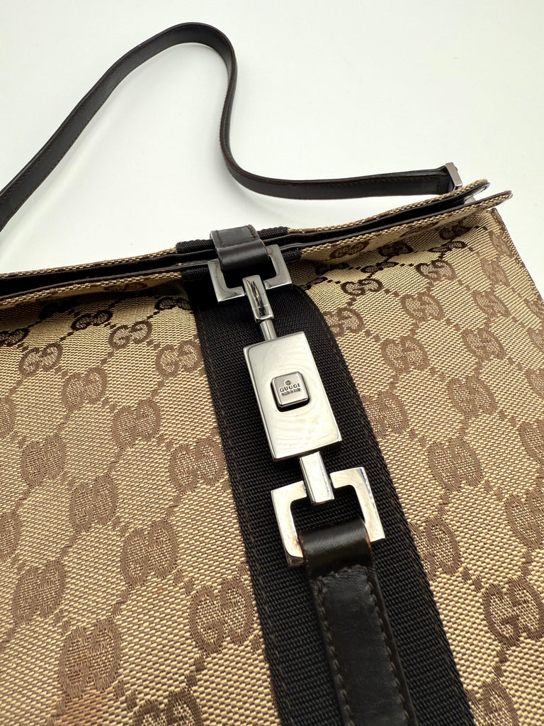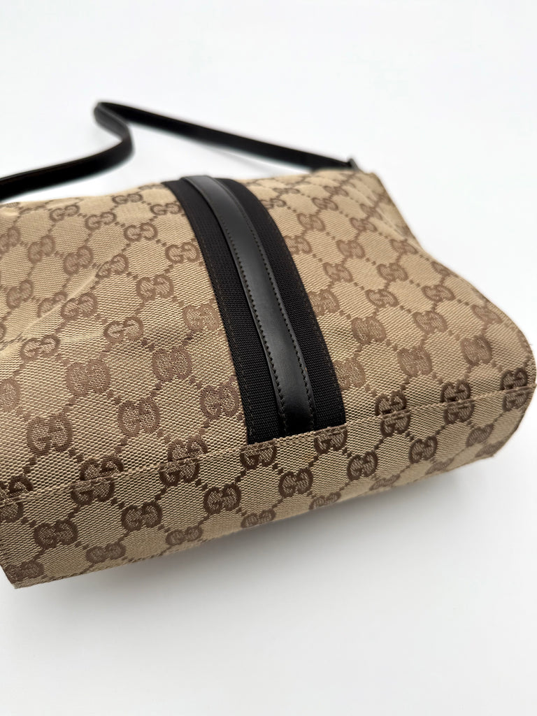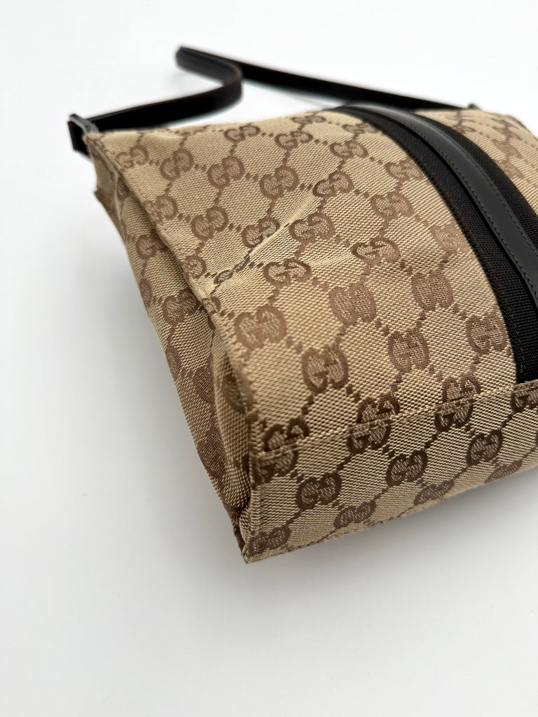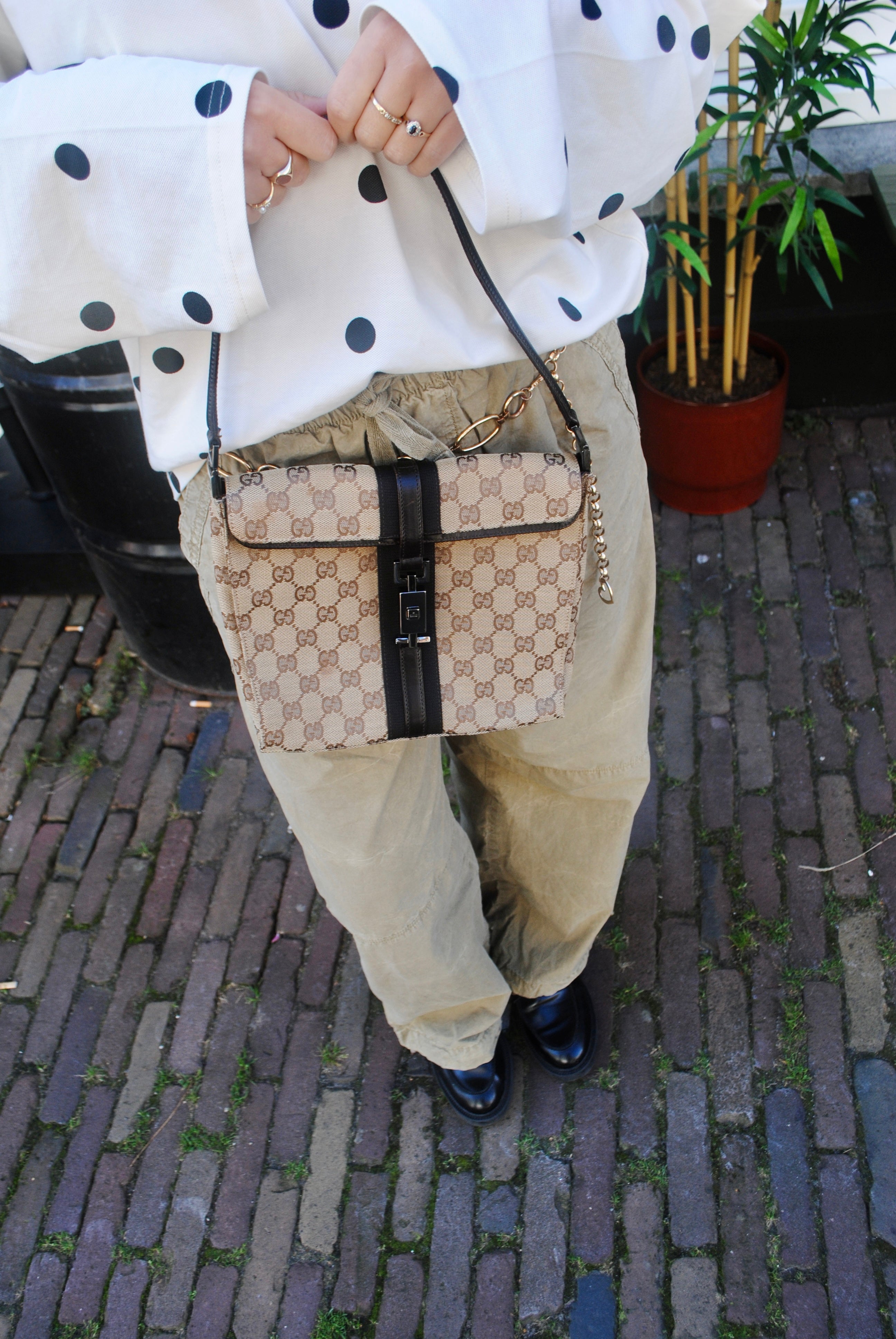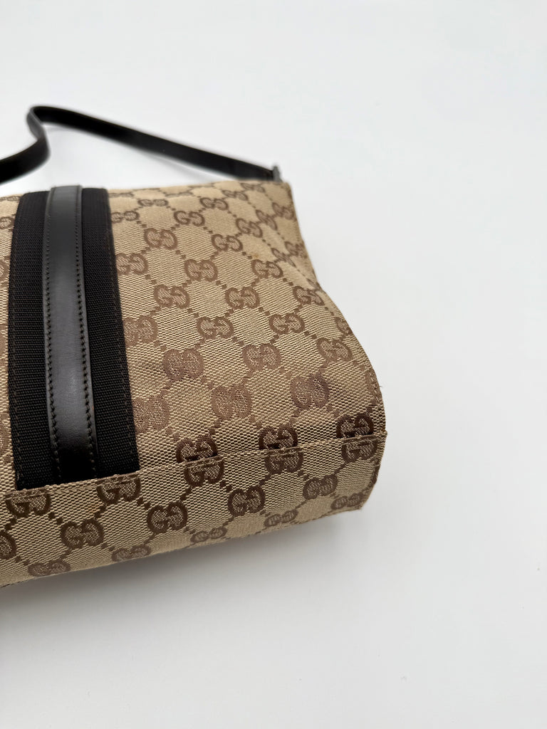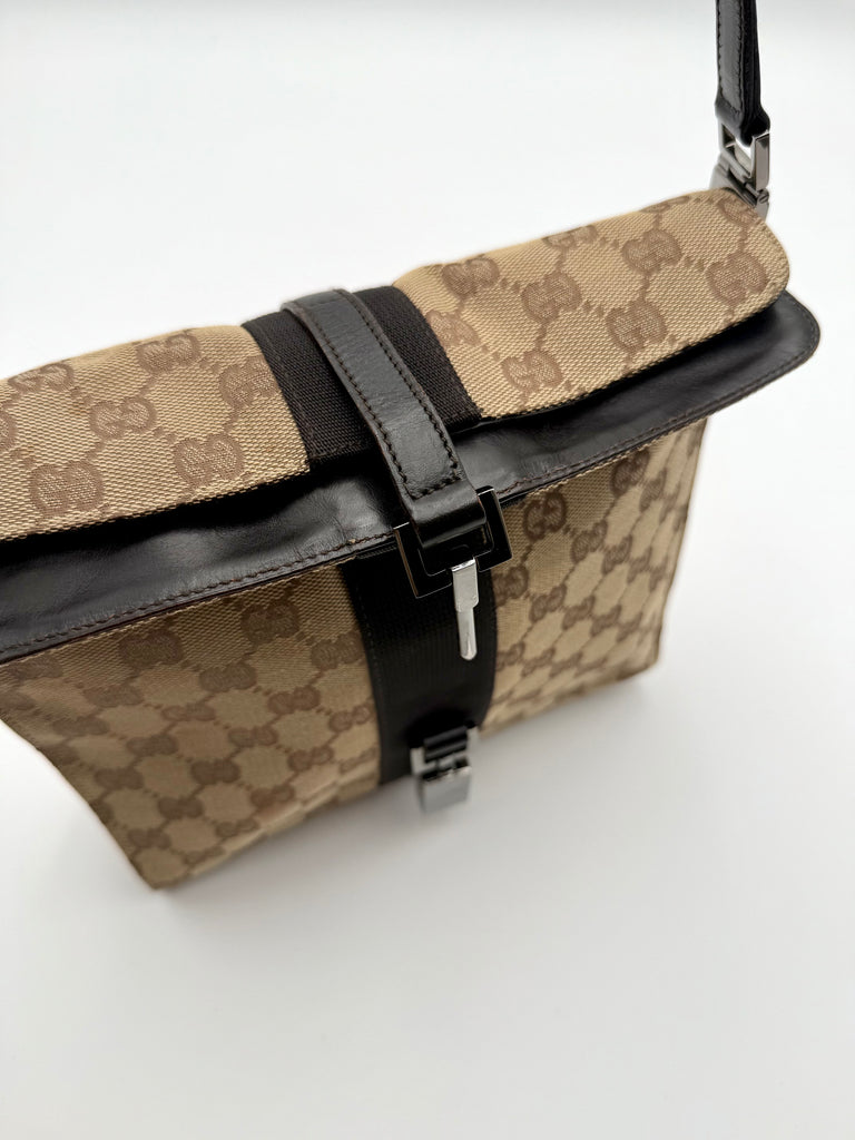 Tweedehands GUCCI Supreme canvas bag. De tas is van canvas met een mooi leren hengsel. De tas sluit met een clip en beschikt over een binnenvak met rits. Het item verkeert in een mooie vintage staat, met algemene gebruikssporen. De tas wordt geleverd in onze mooie Moon flower dustbag.