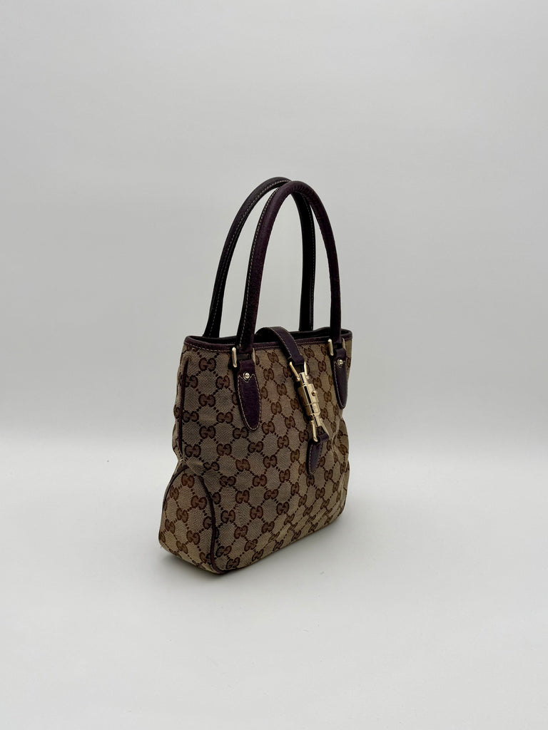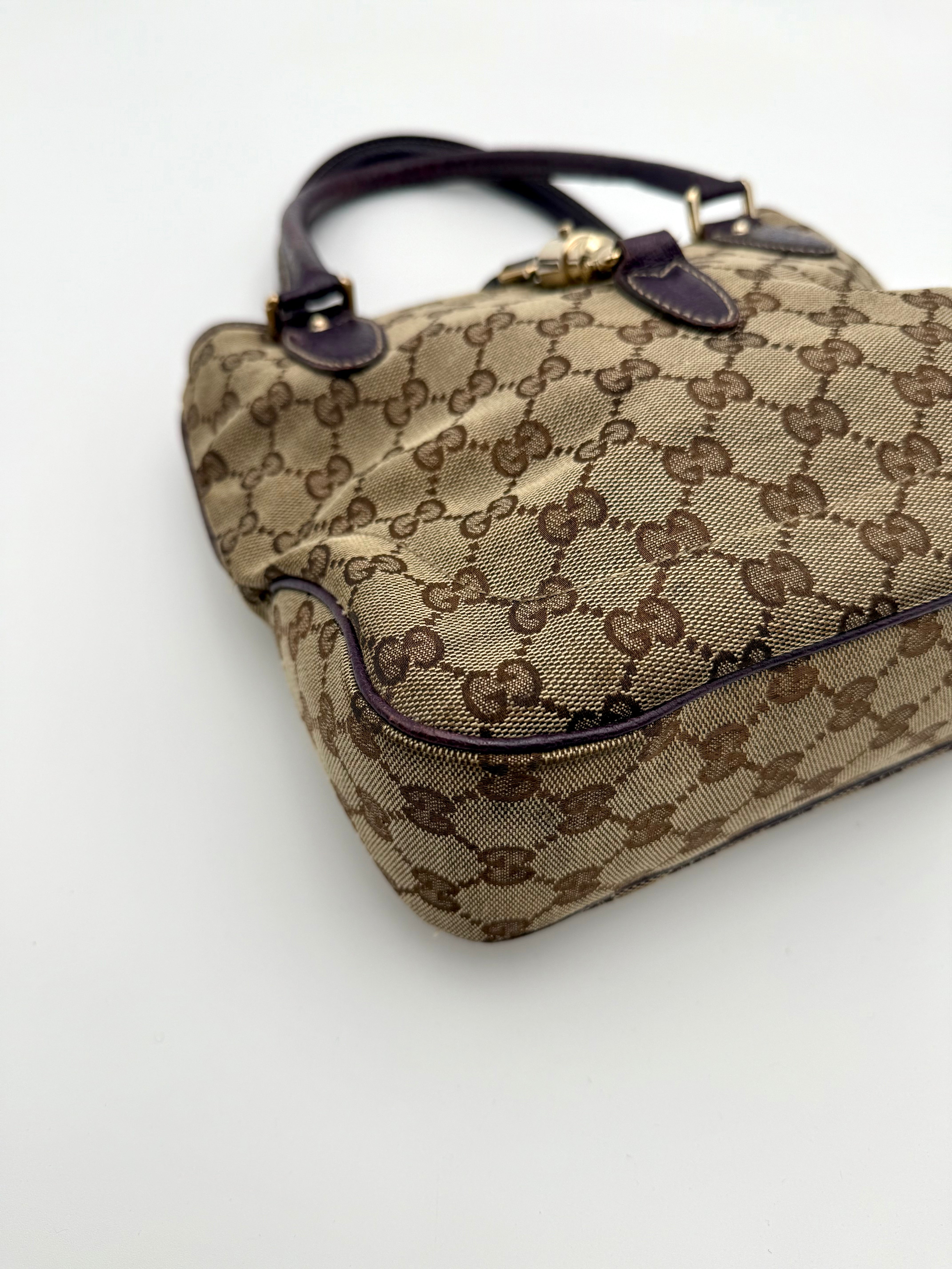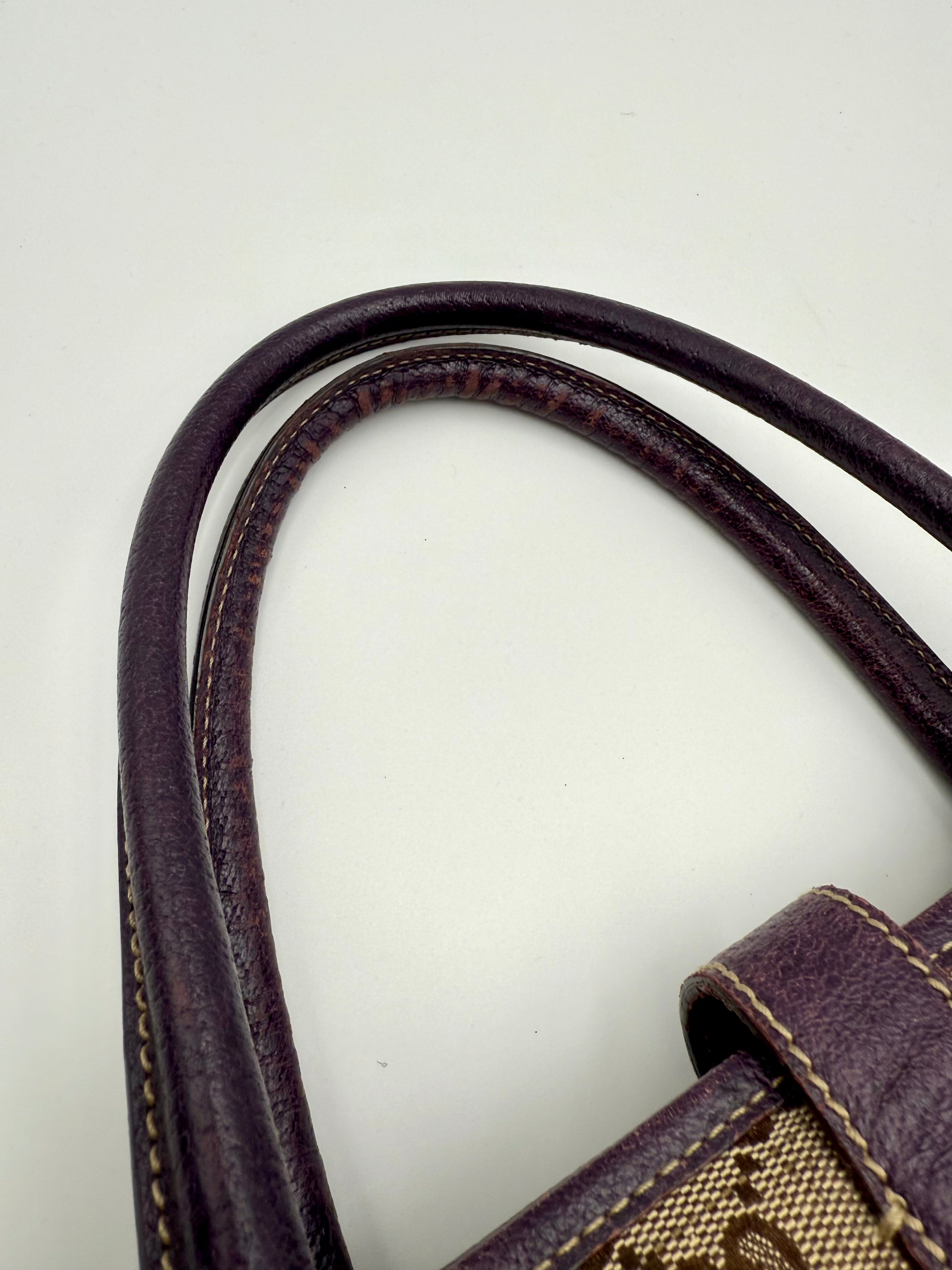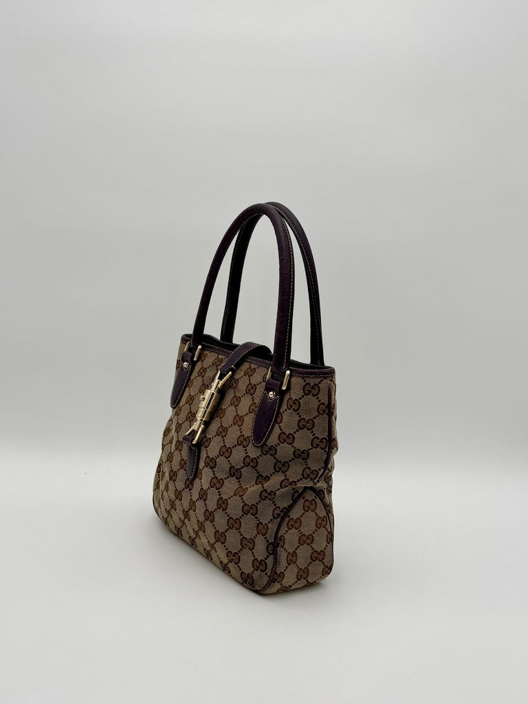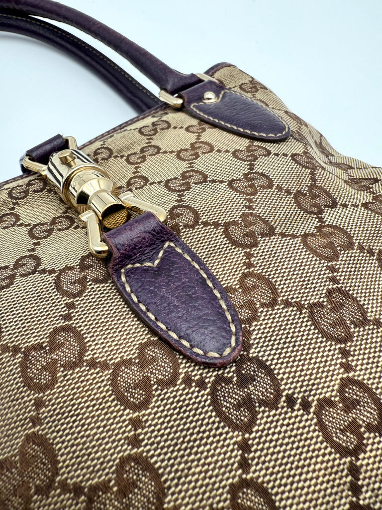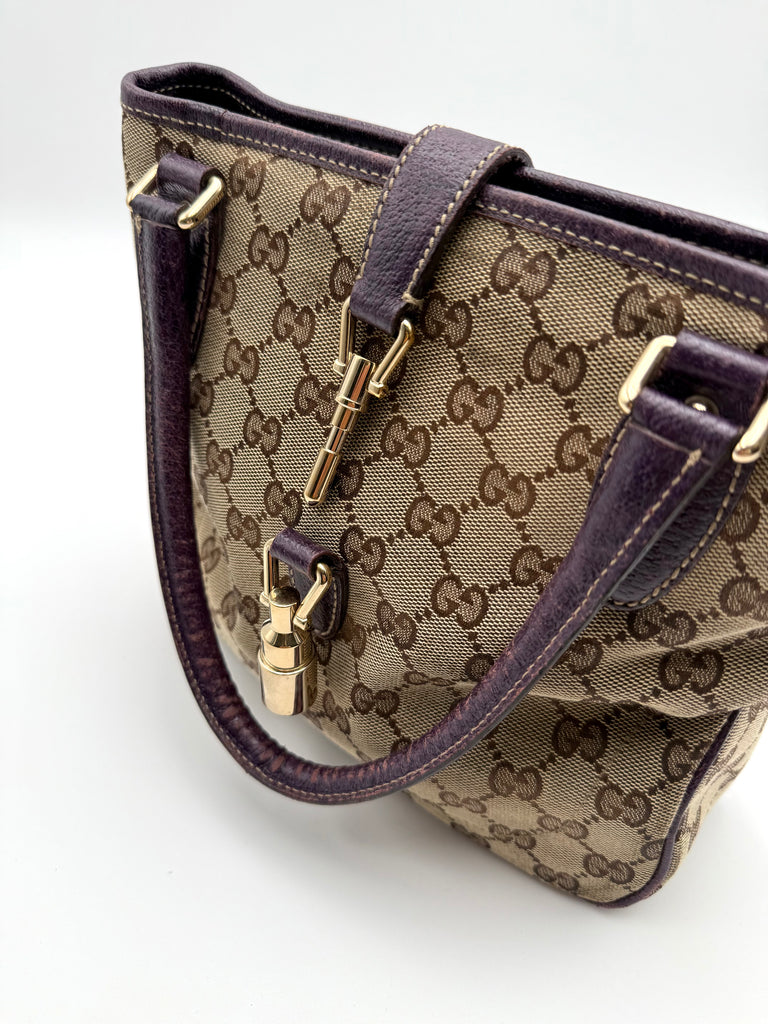 Tweedehands GUCCI Jackie canvas bag. De tas is van canvas met mooie leren hengsels. De tas sluit met een clip en beschikt over een binnenvakje met een rits. Het item verkeert in een perfecte vintage staat, met algemene gebruikssporen. De tas wordt geleverd in onze mooie Moon flower dustbag.