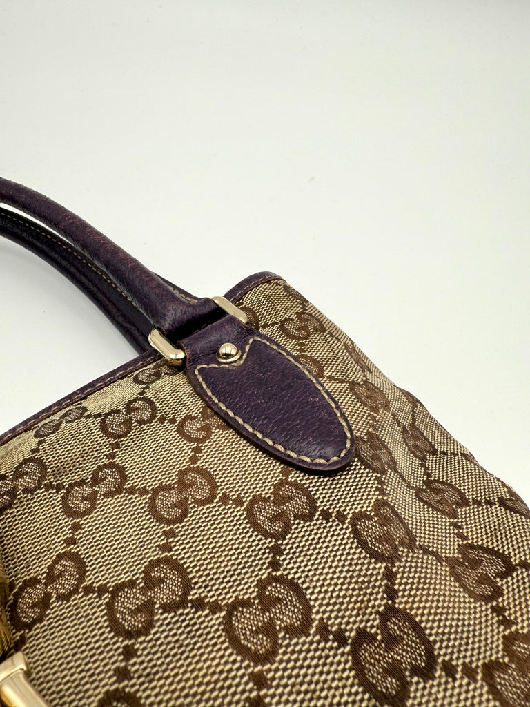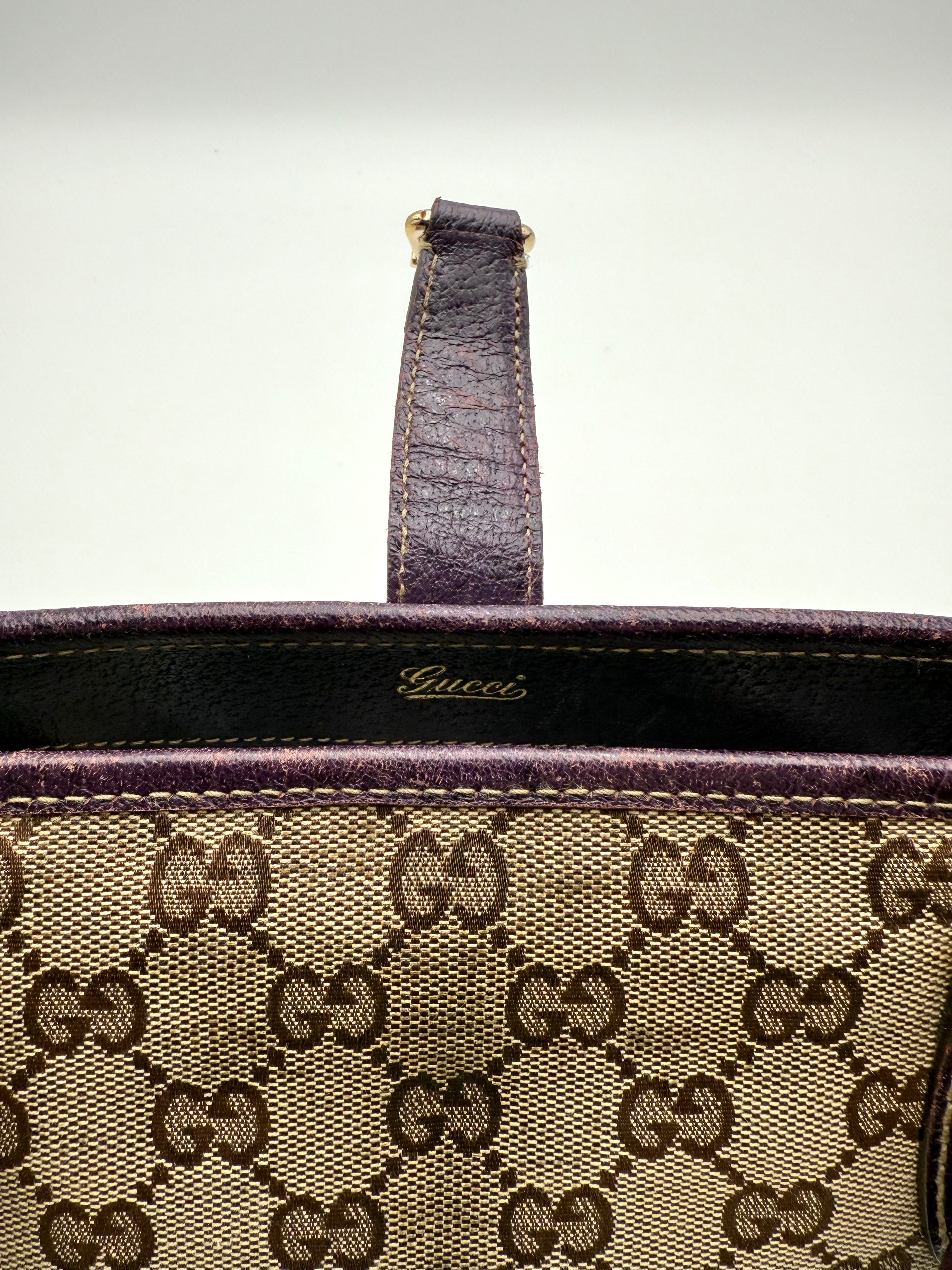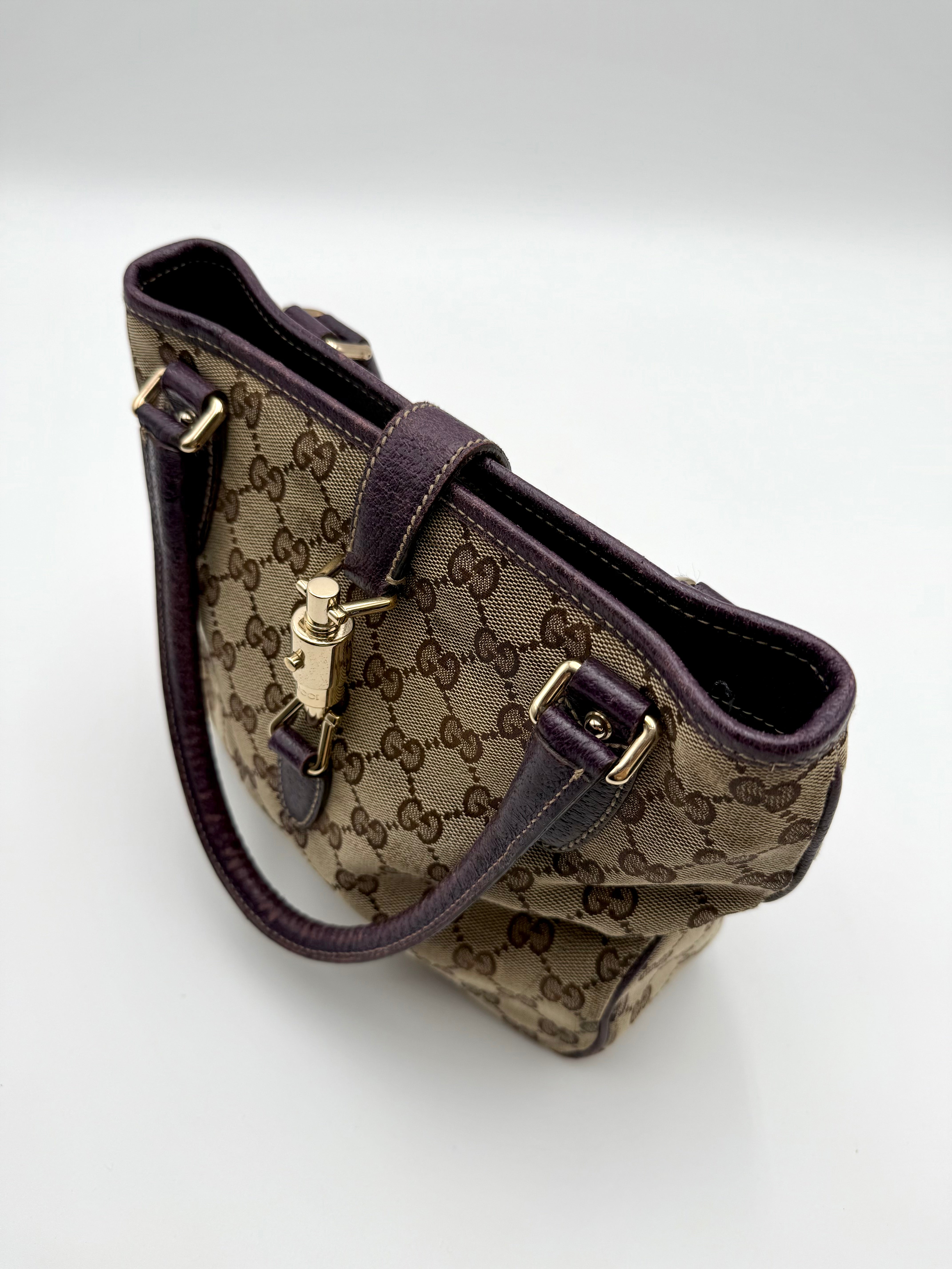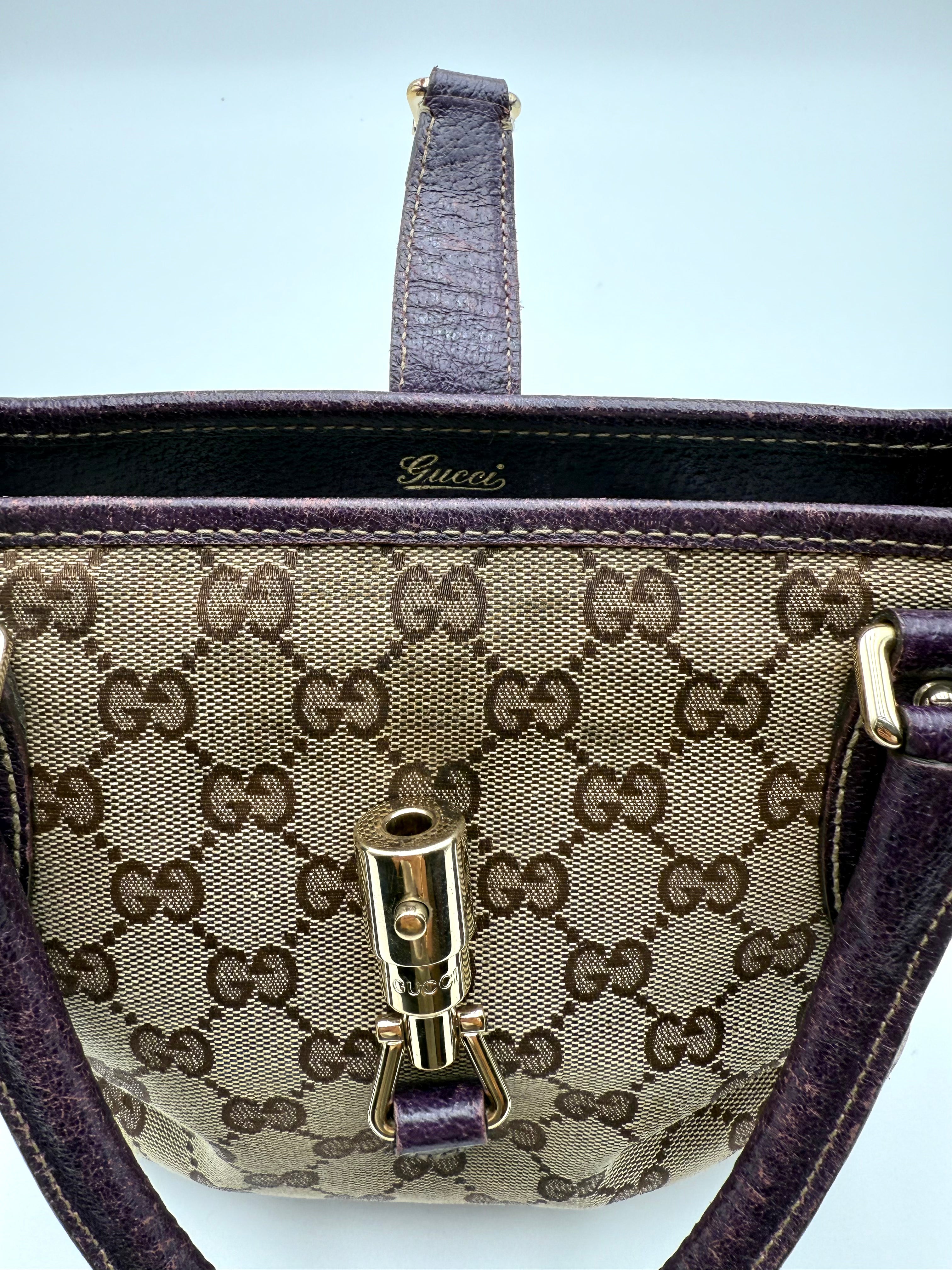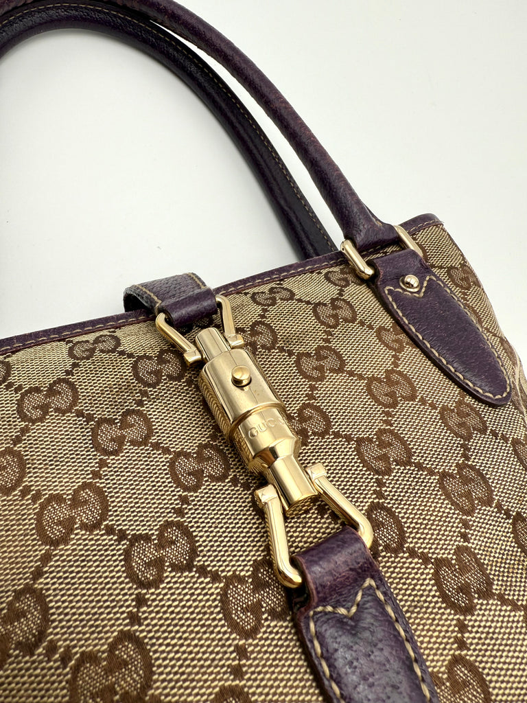 Tweedehands GUCCI Jackie canvas bag. De tas is van canvas met mooie leren hengsels. De tas sluit met een clip en beschikt over een binnenvakje met een rits. Het item verkeert in een perfecte vintage staat, met algemene gebruikssporen. De tas wordt geleverd in onze mooie Moon flower dustbag.