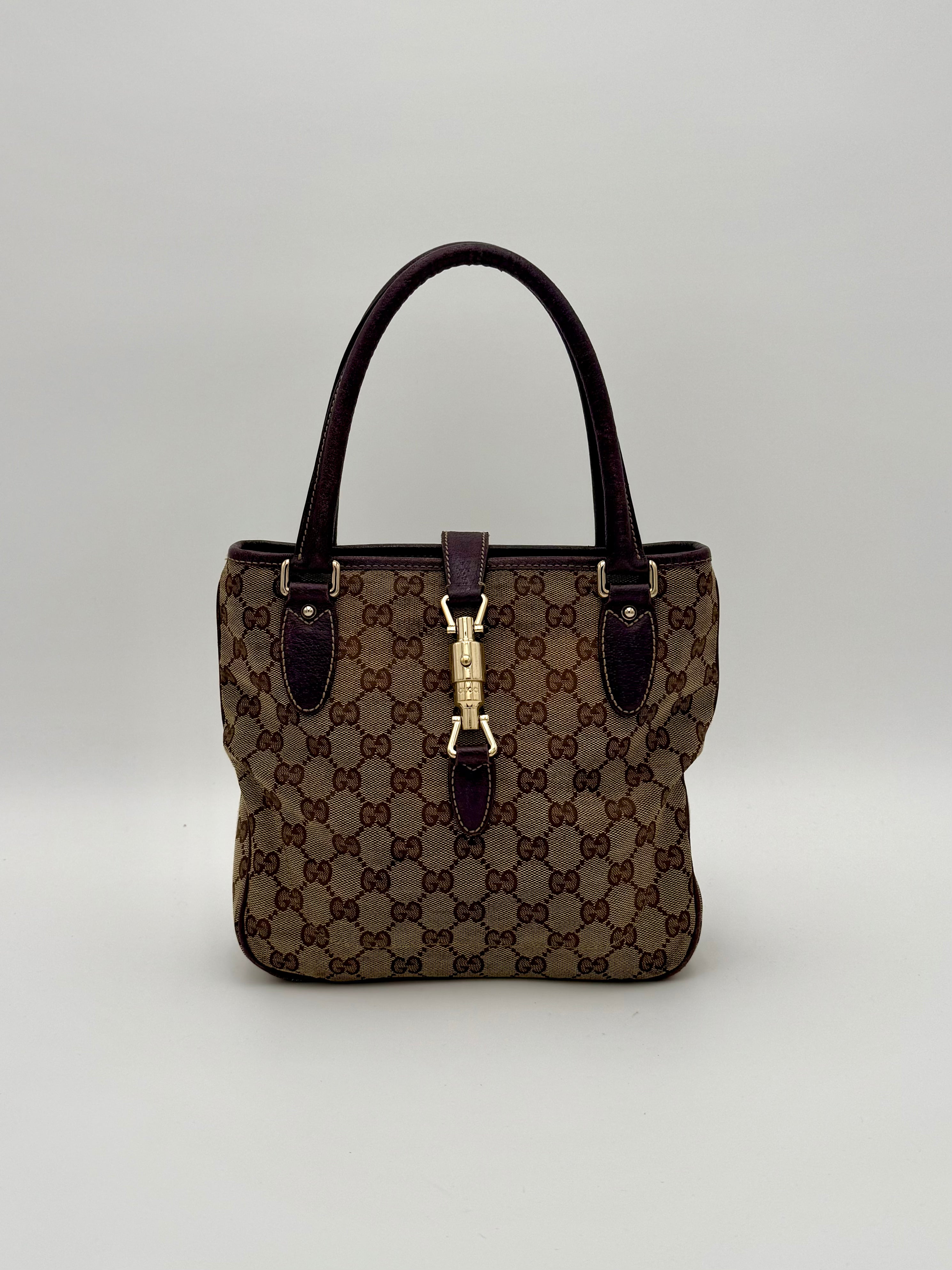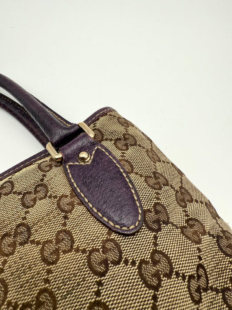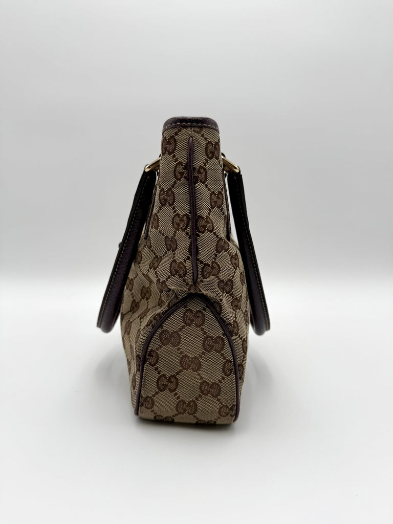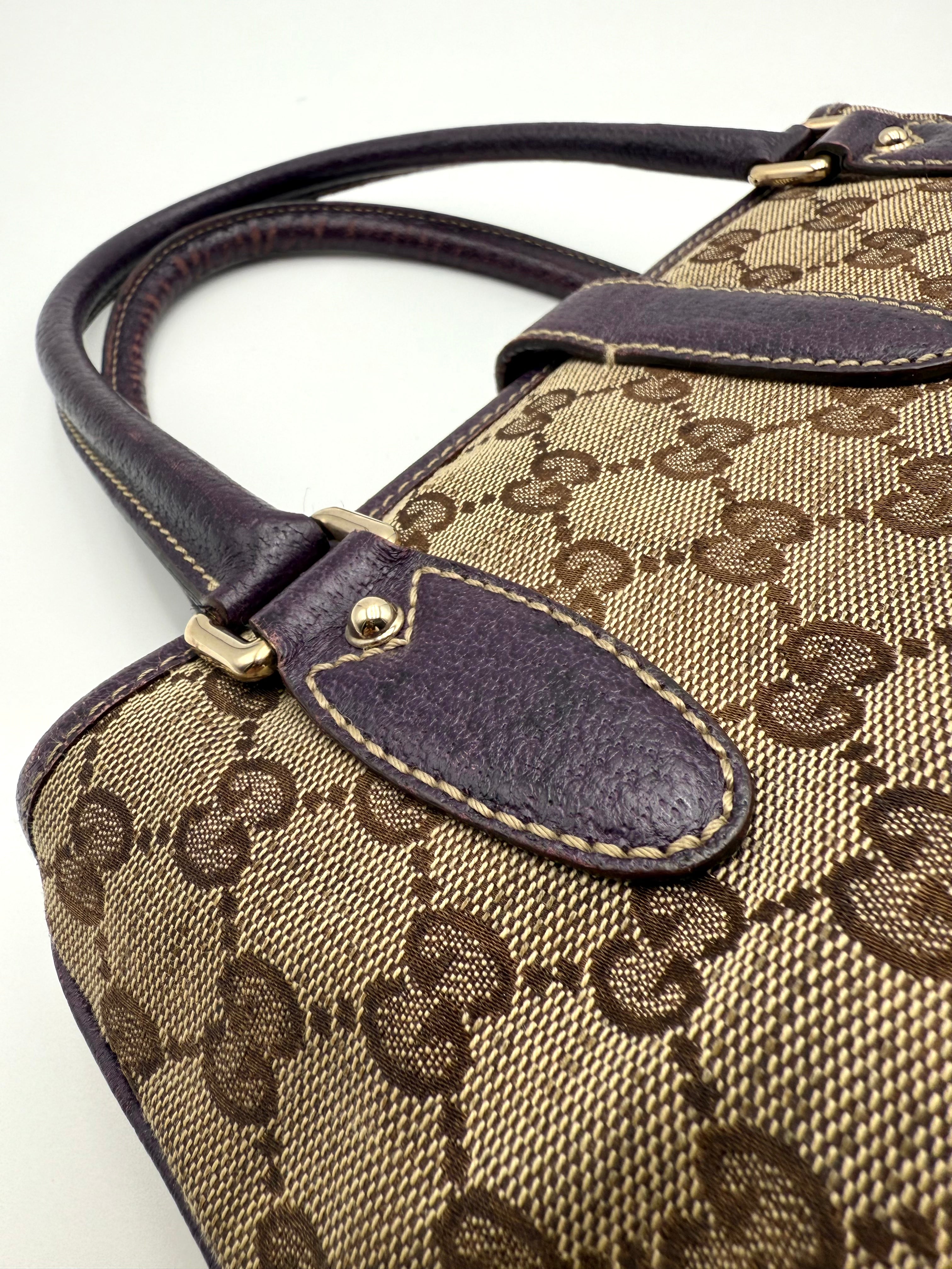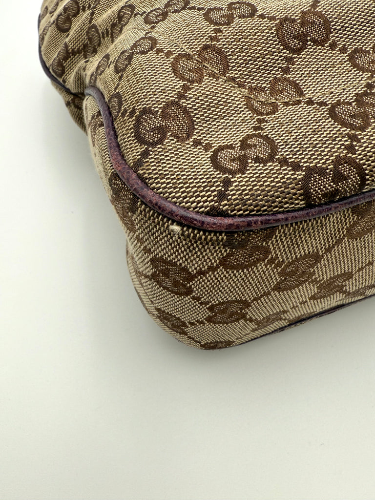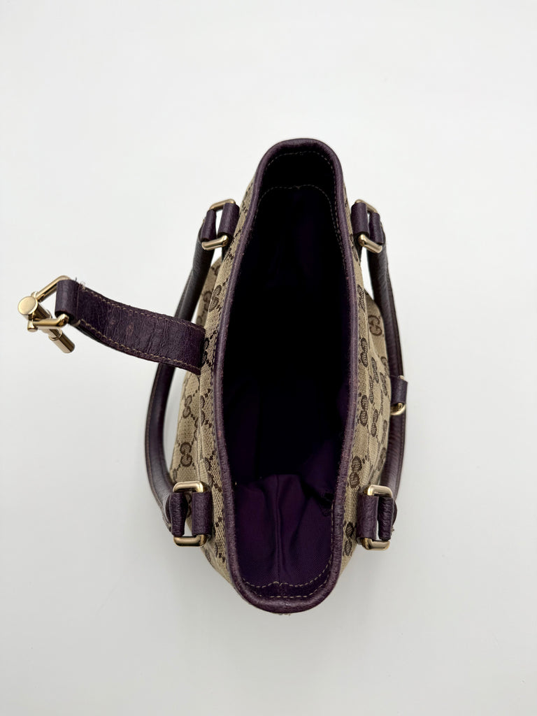 Tweedehands GUCCI Jackie canvas bag. De tas is van canvas met mooie leren hengsels. De tas sluit met een clip en beschikt over een binnenvakje met een rits. Het item verkeert in een perfecte vintage staat, met algemene gebruikssporen. De tas wordt geleverd in onze mooie Moon flower dustbag.