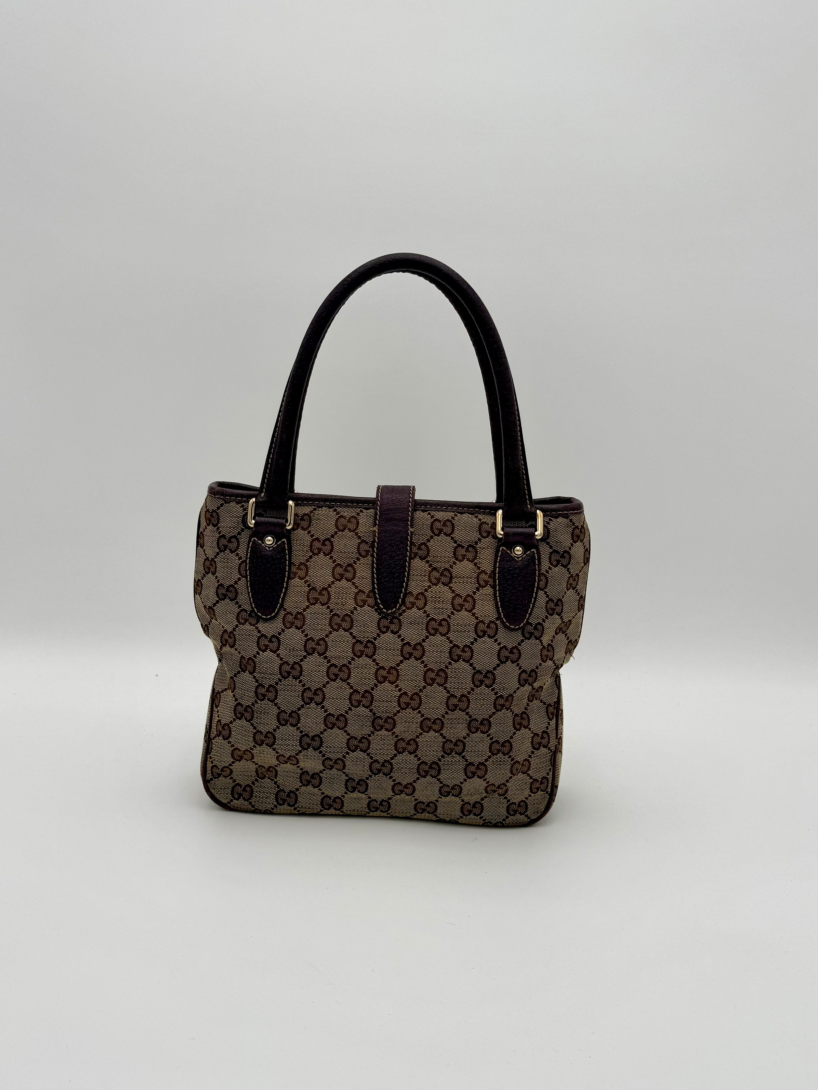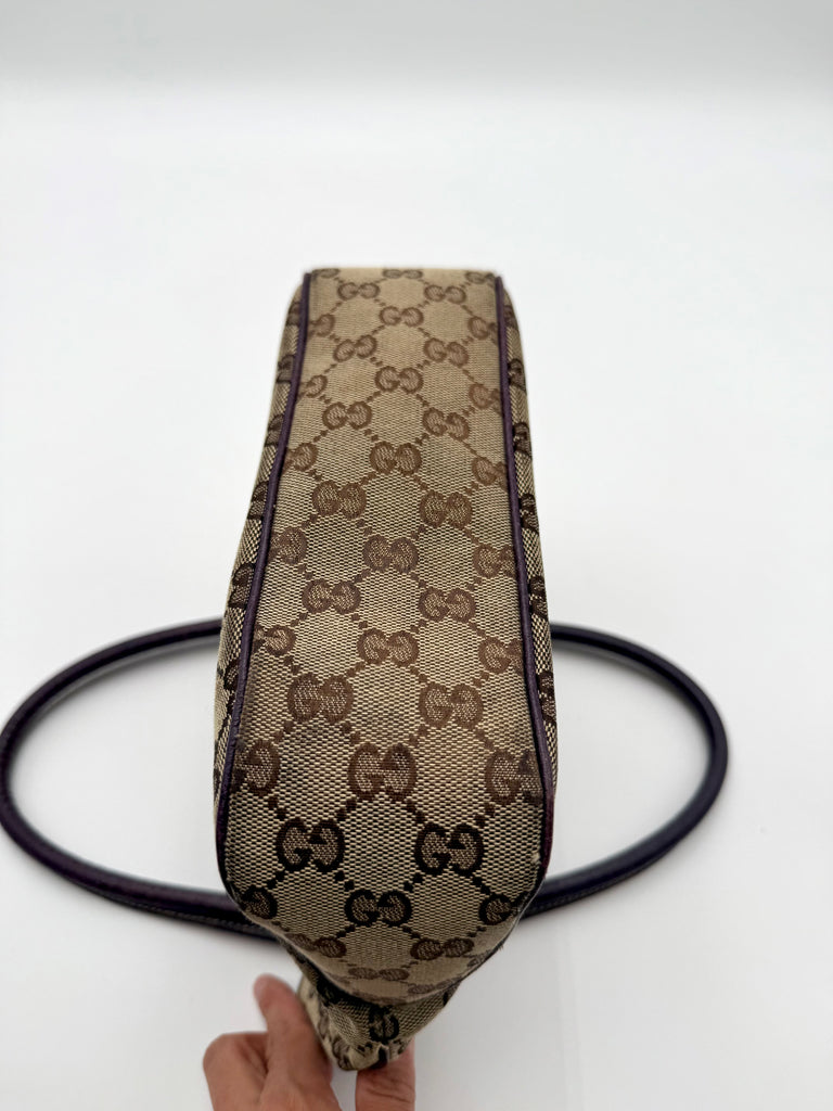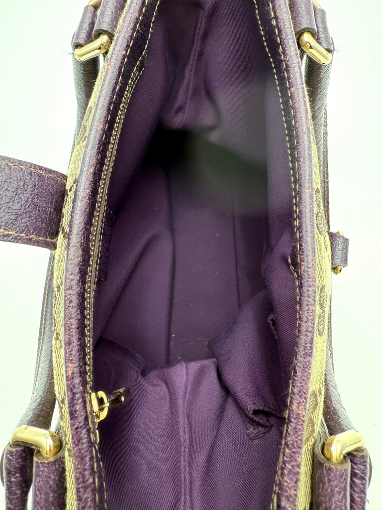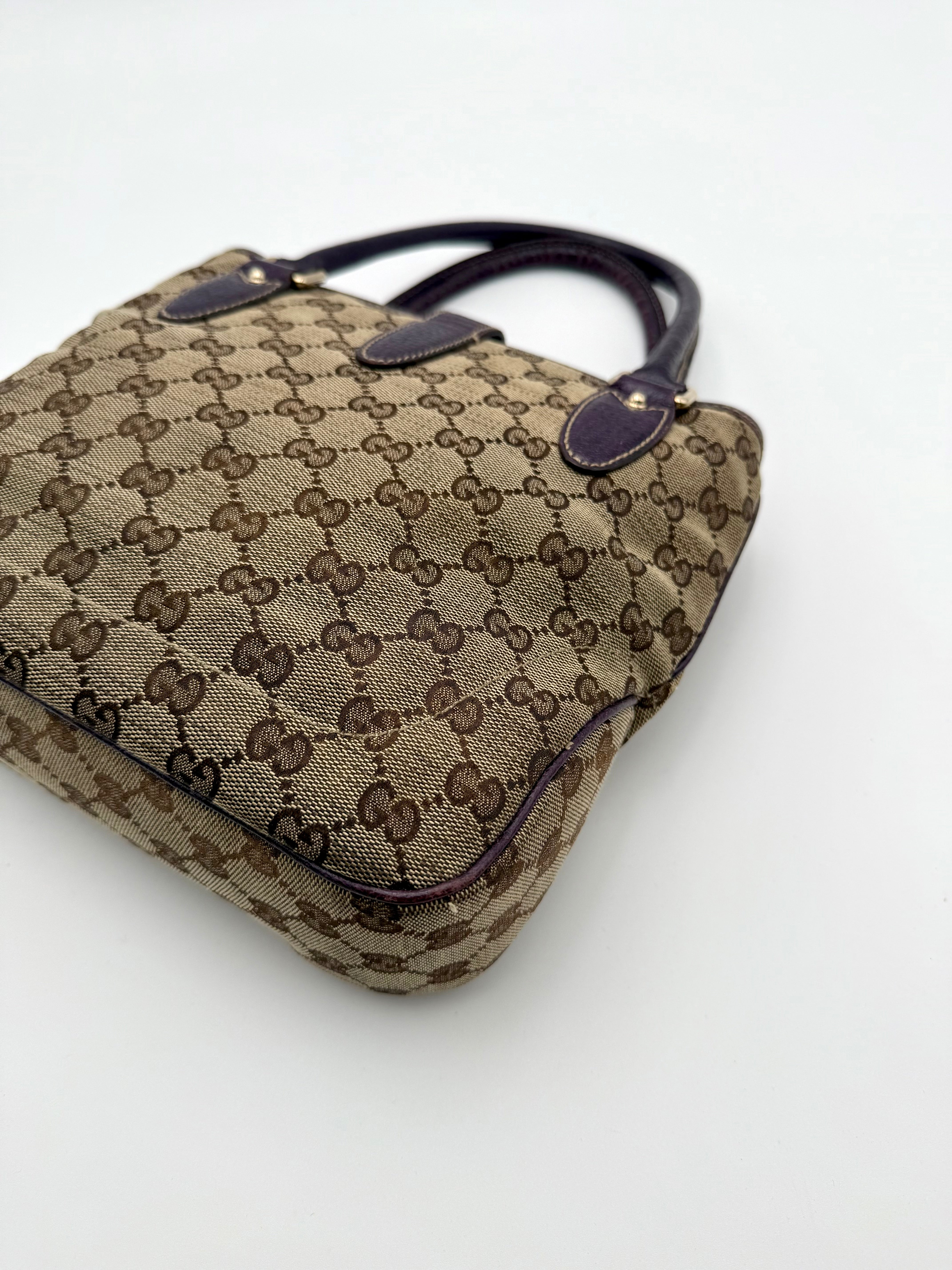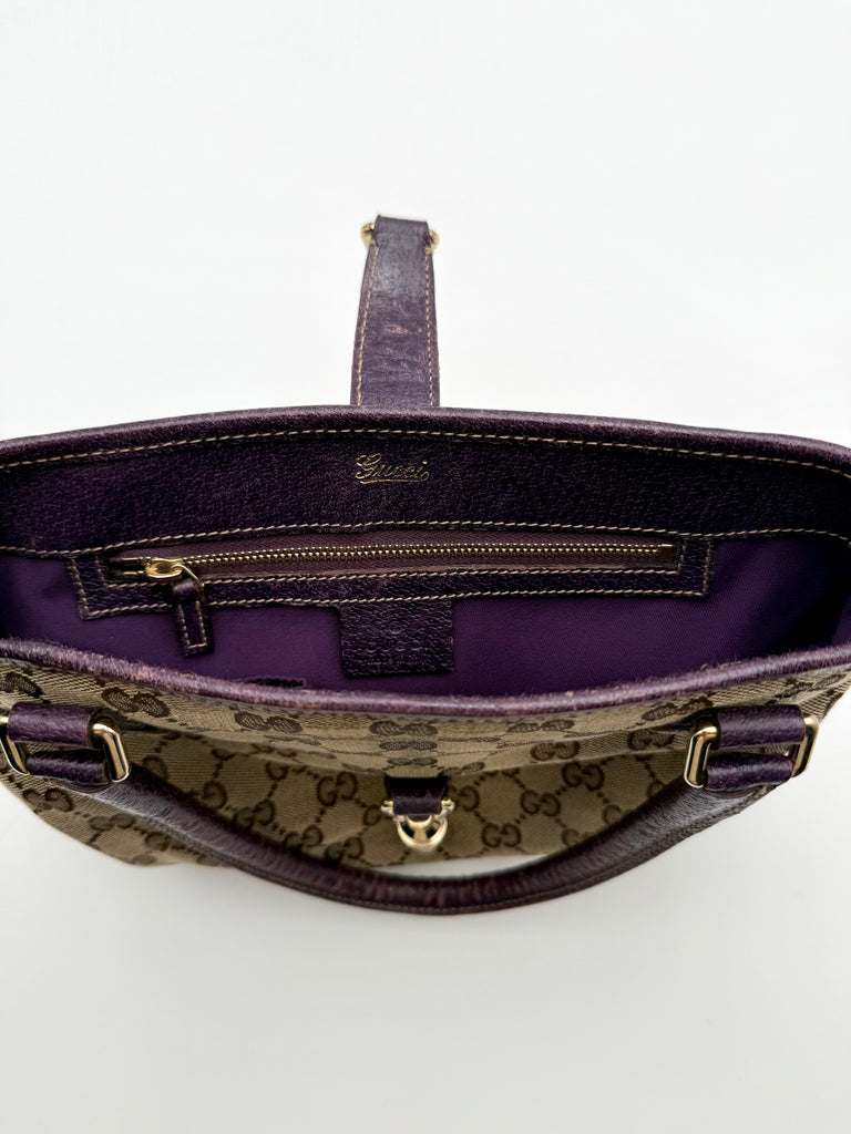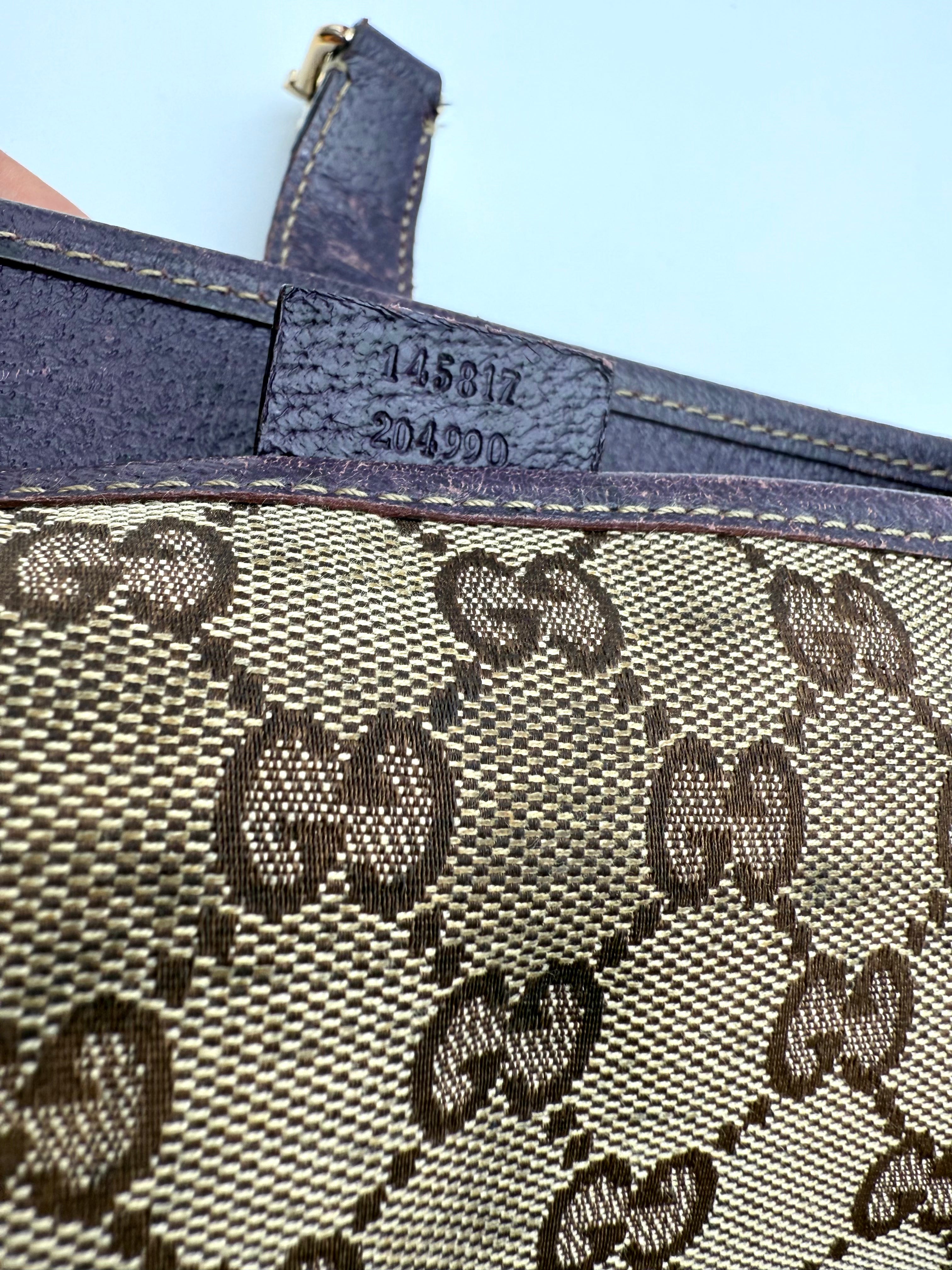 Tweedehands GUCCI Jackie canvas bag. De tas is van canvas met mooie leren hengsels. De tas sluit met een clip en beschikt over een binnenvakje met een rits. Het item verkeert in een perfecte vintage staat, met algemene gebruikssporen. De tas wordt geleverd in onze mooie Moon flower dustbag.