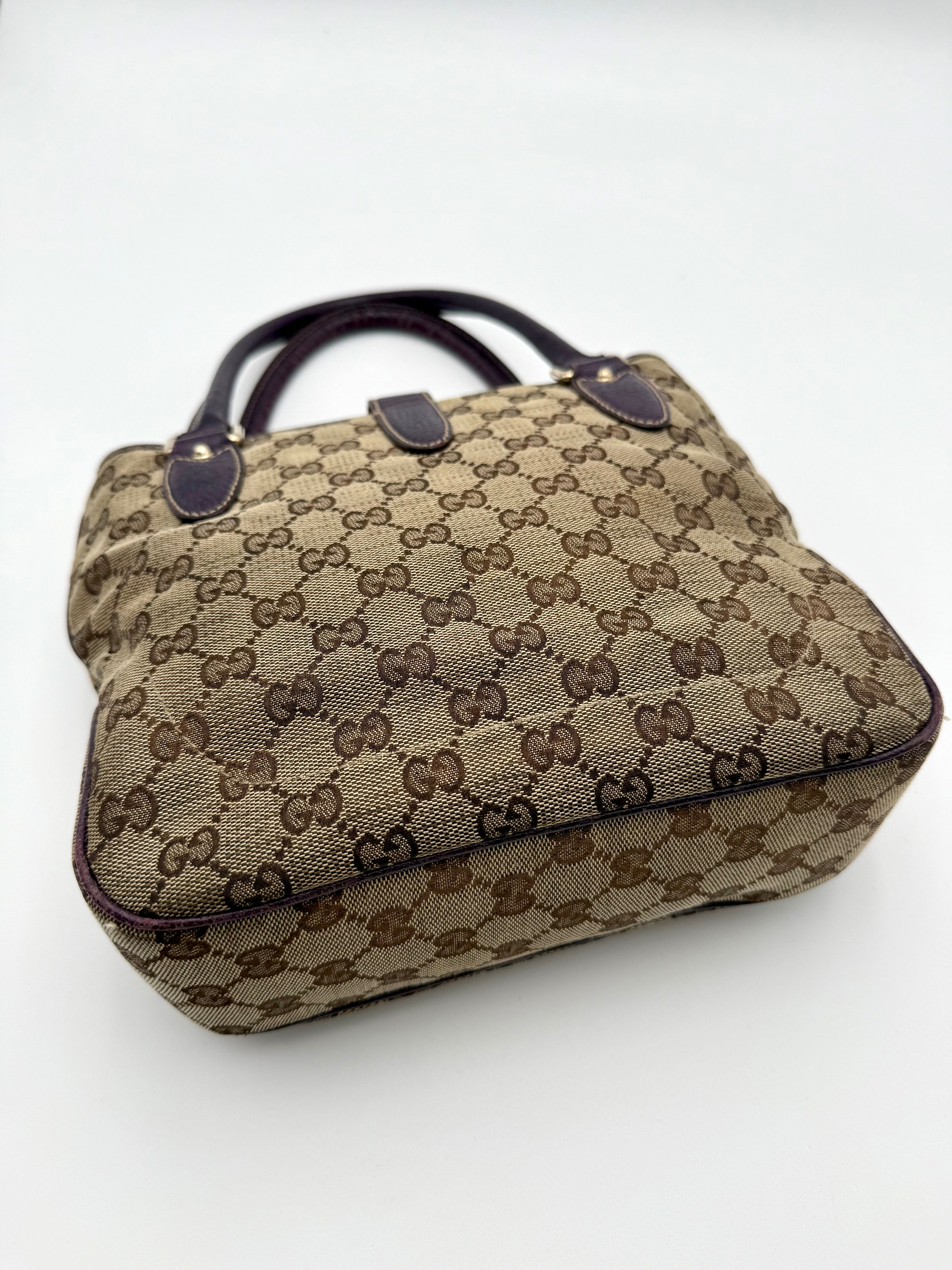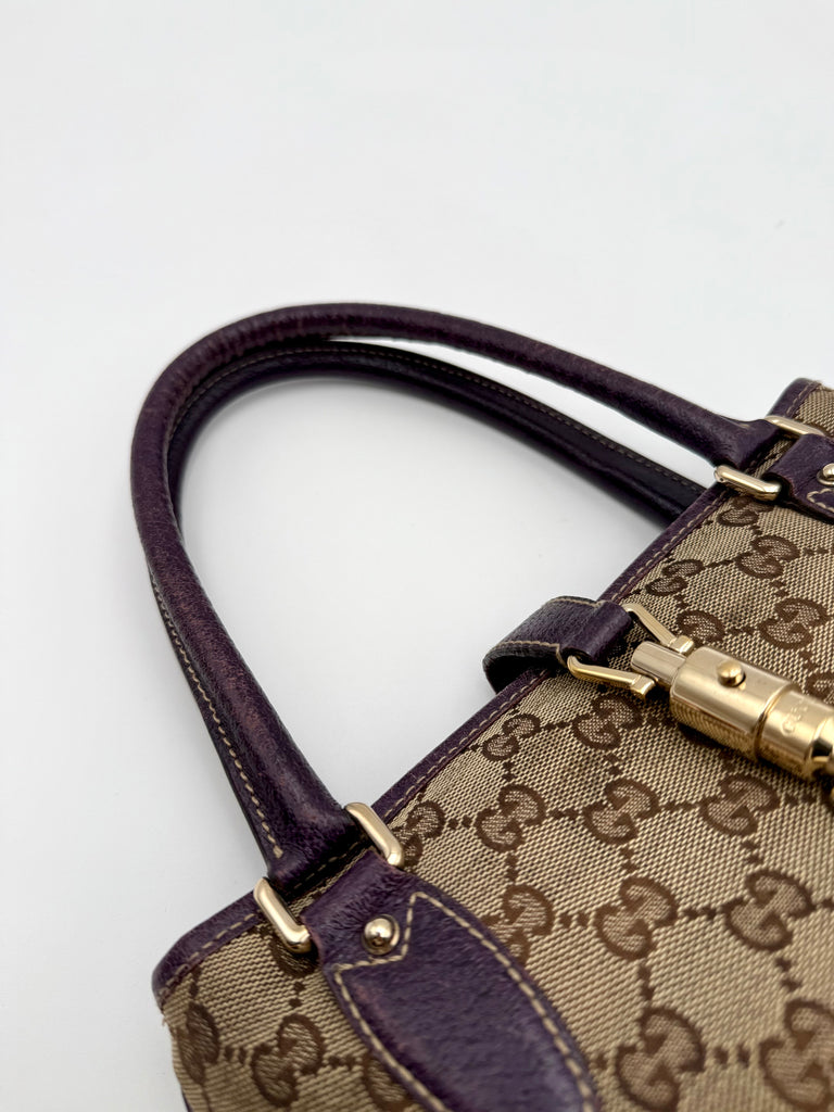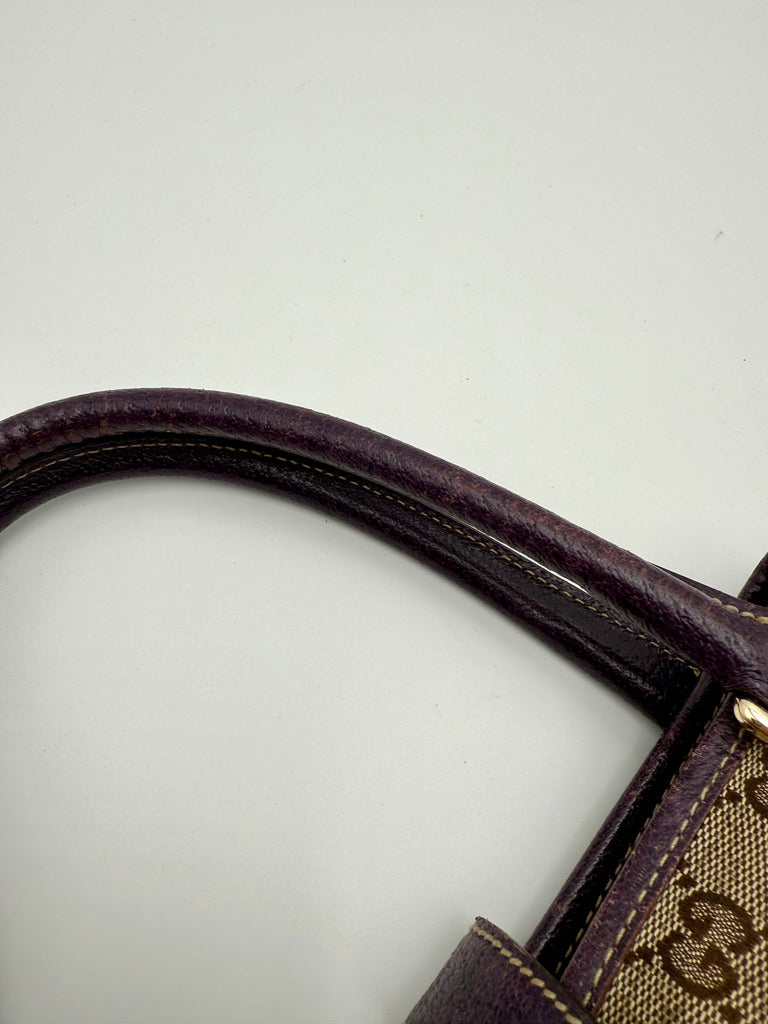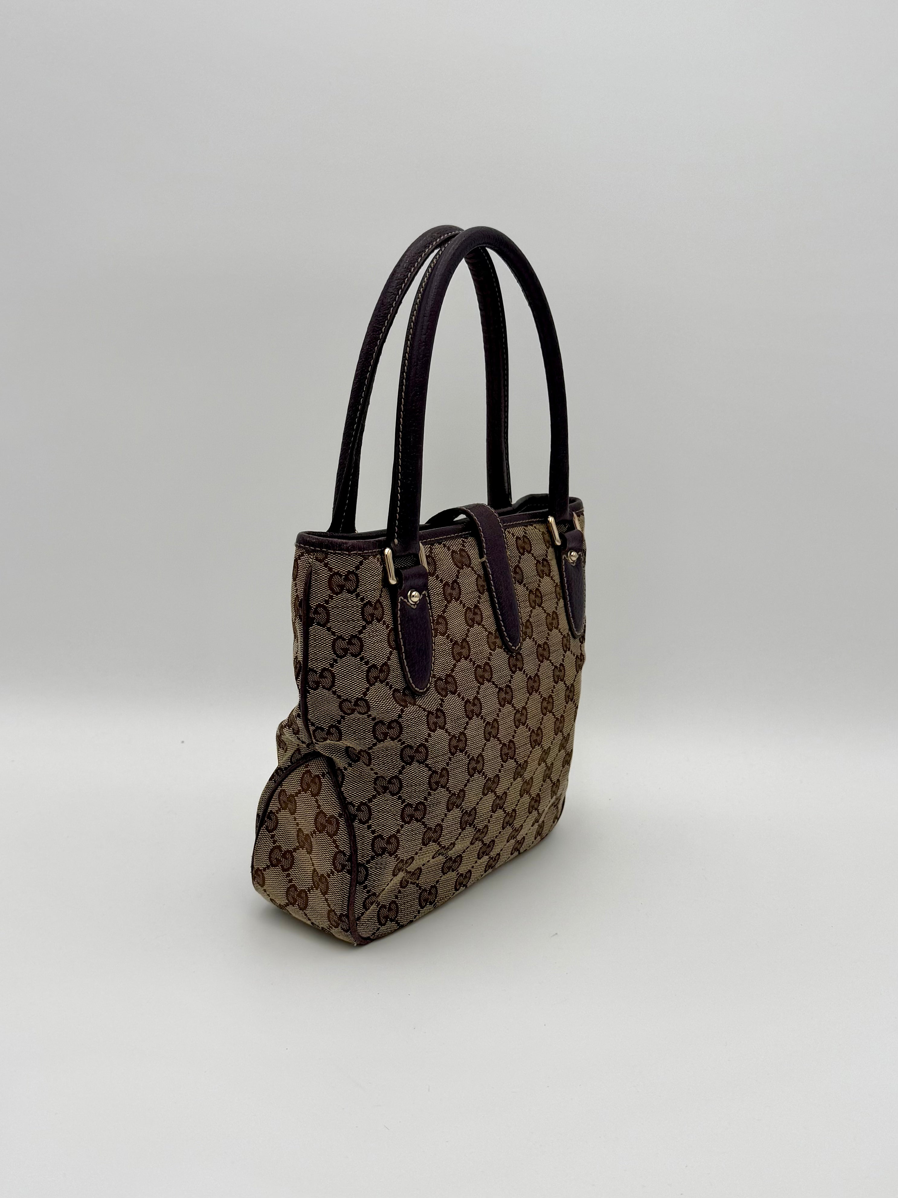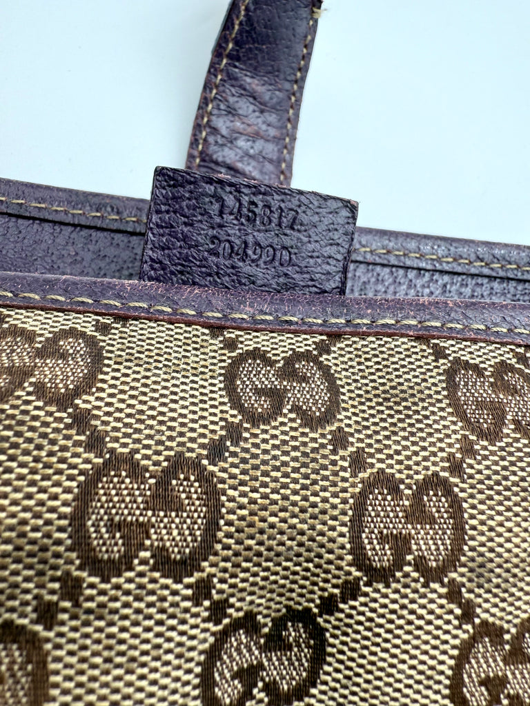 Tweedehands GUCCI Jackie canvas bag. De tas is van canvas met mooie leren hengsels. De tas sluit met een clip en beschikt over een binnenvakje met een rits. Het item verkeert in een perfecte vintage staat, met algemene gebruikssporen. De tas wordt geleverd in onze mooie Moon flower dustbag.