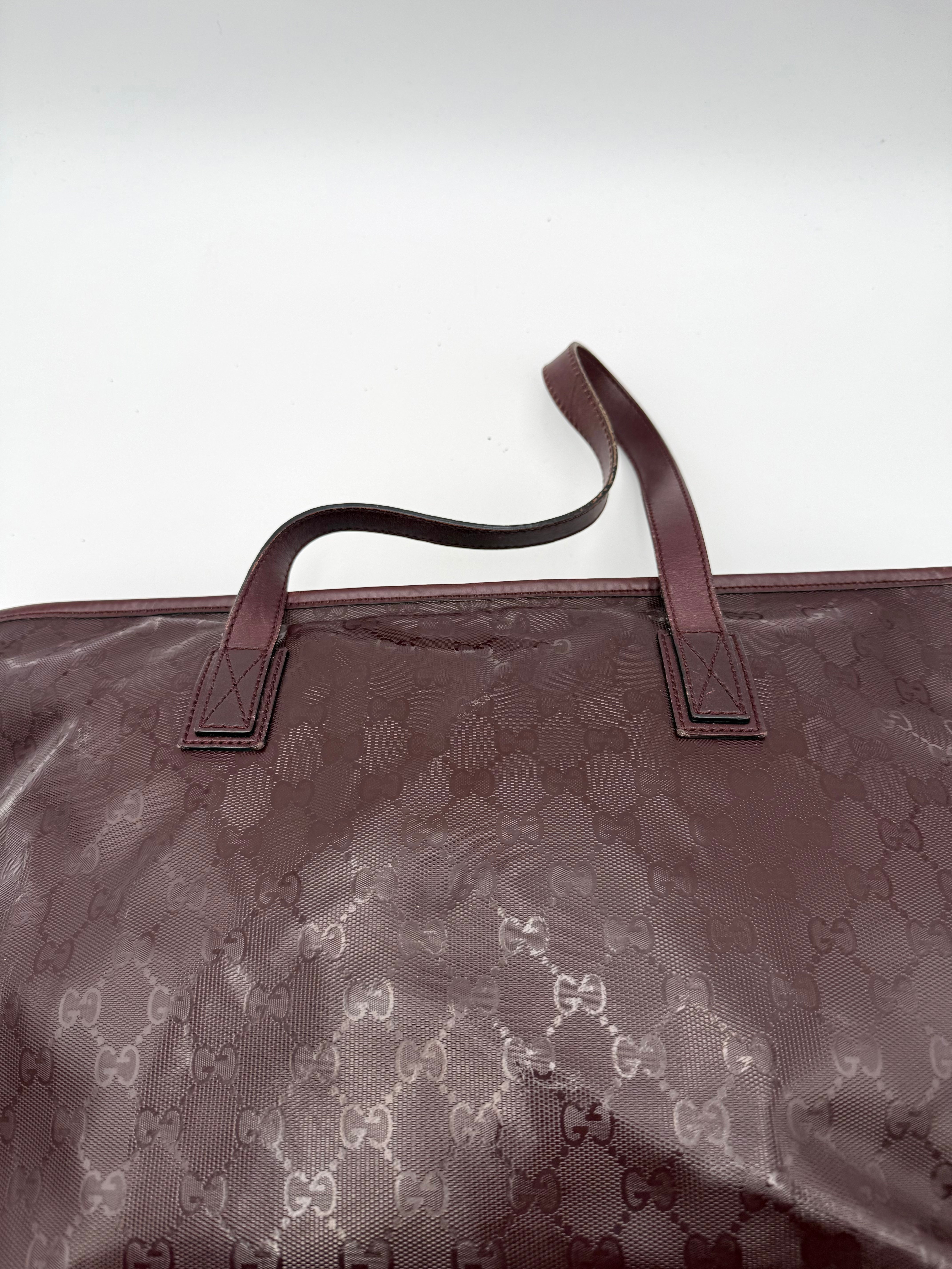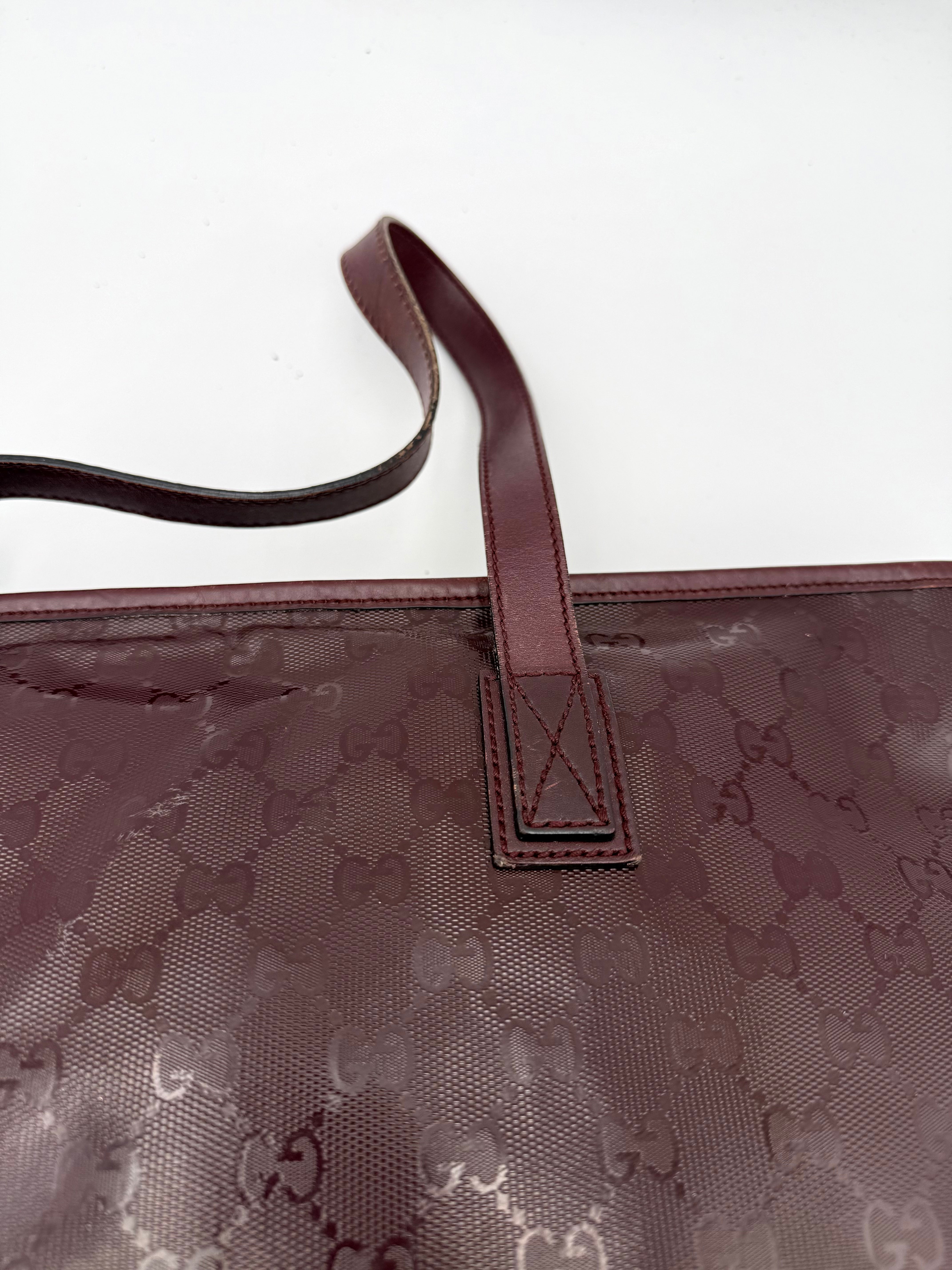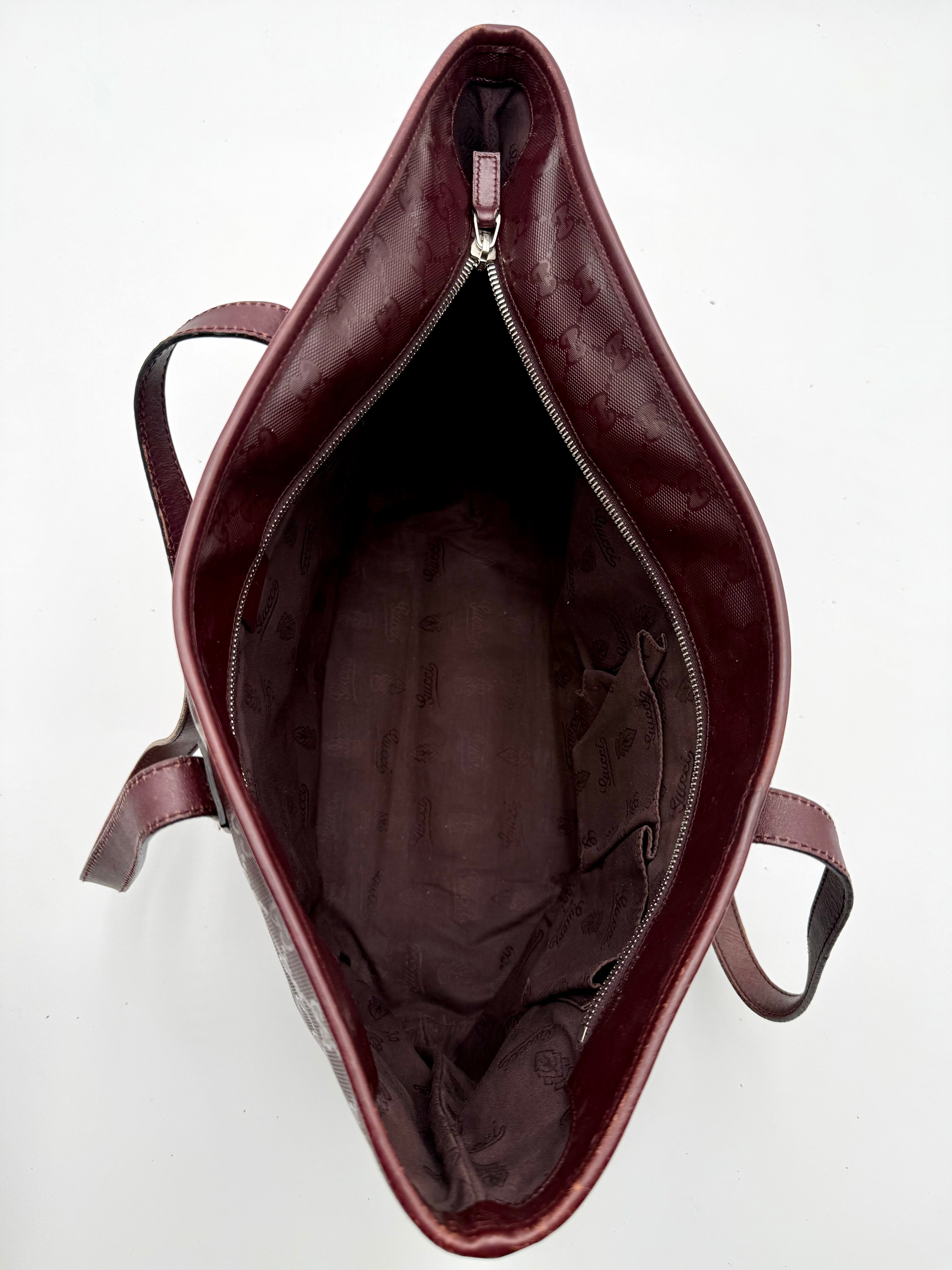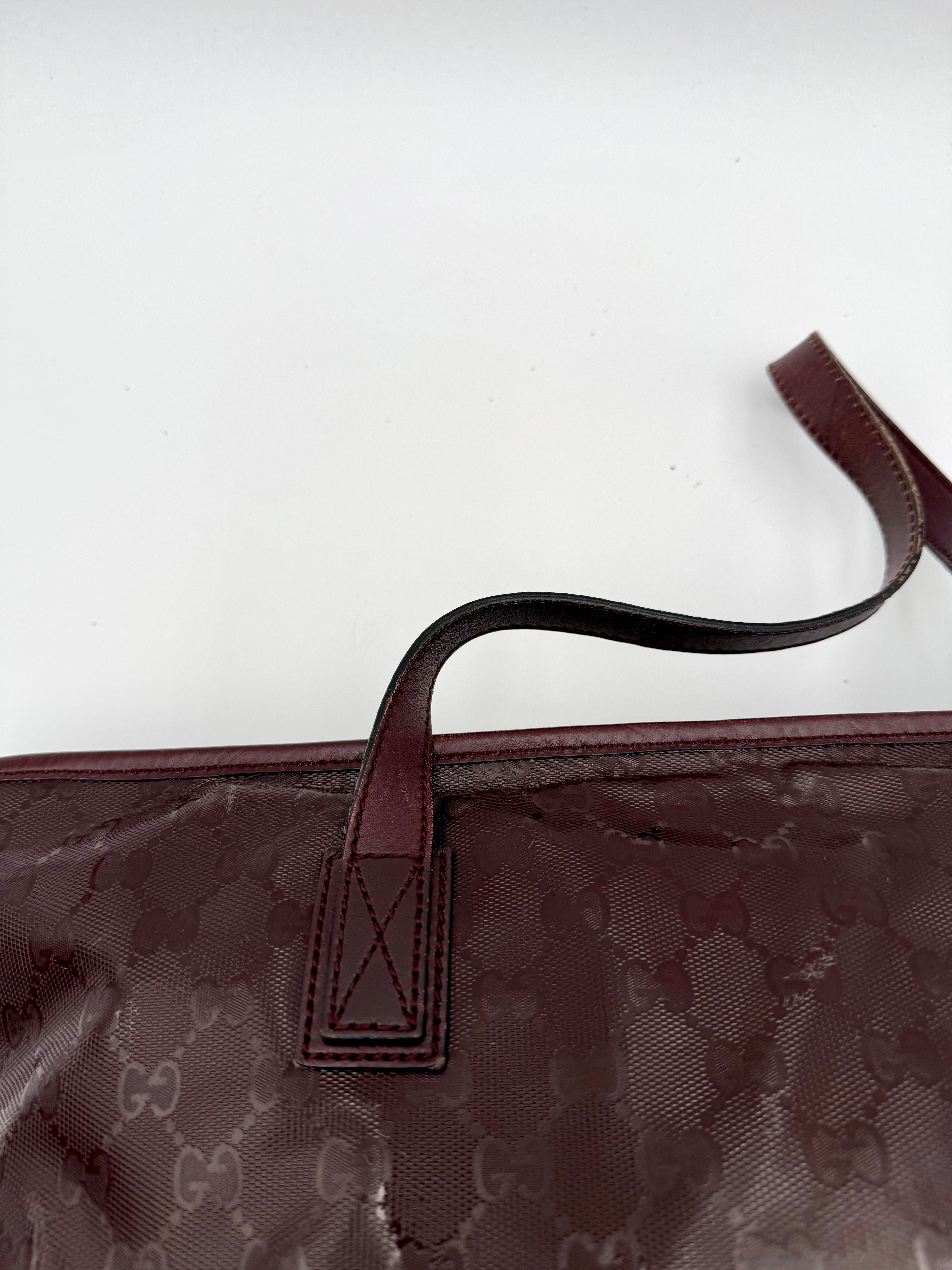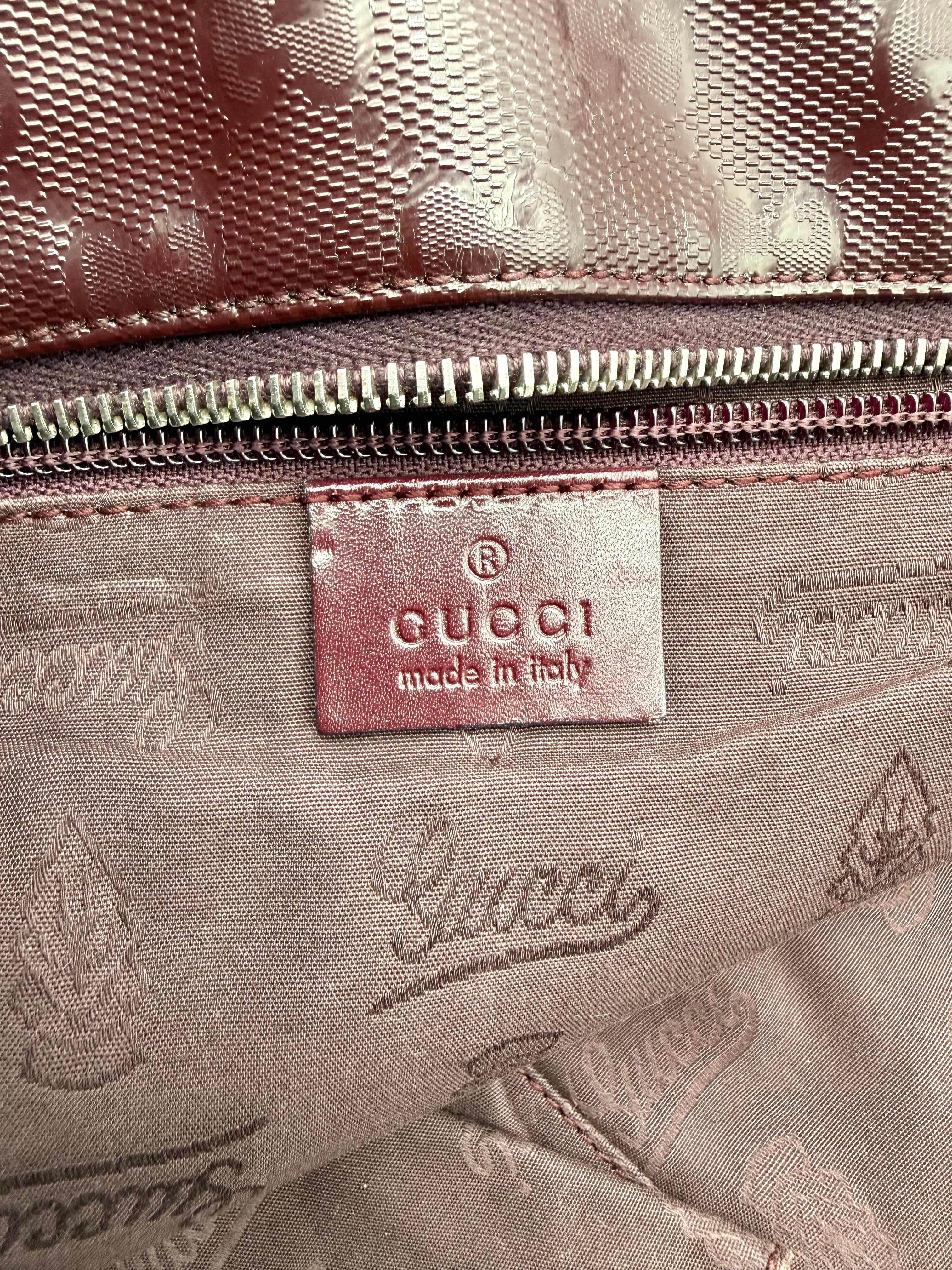 Tweedehands GUCCI tote bag in bordeaux PVC. De tas sluit met een rits en heeft één binnenvakje met rits en twee steekvakjes. Het item verkeert in een vintage staat, met algemene gebruikssporen. De tas wordt geleverd in onze mooie Moon flower dustbag.