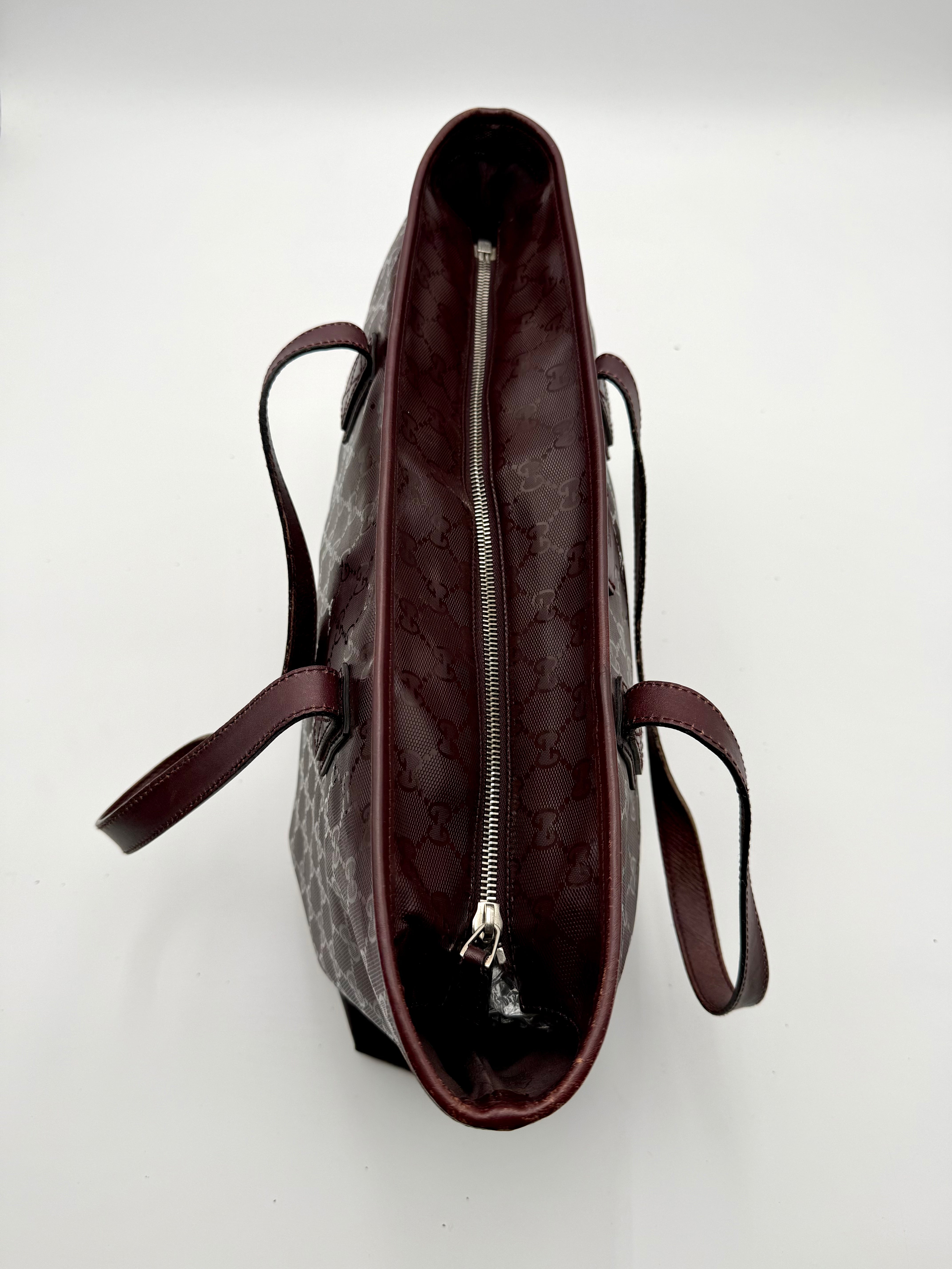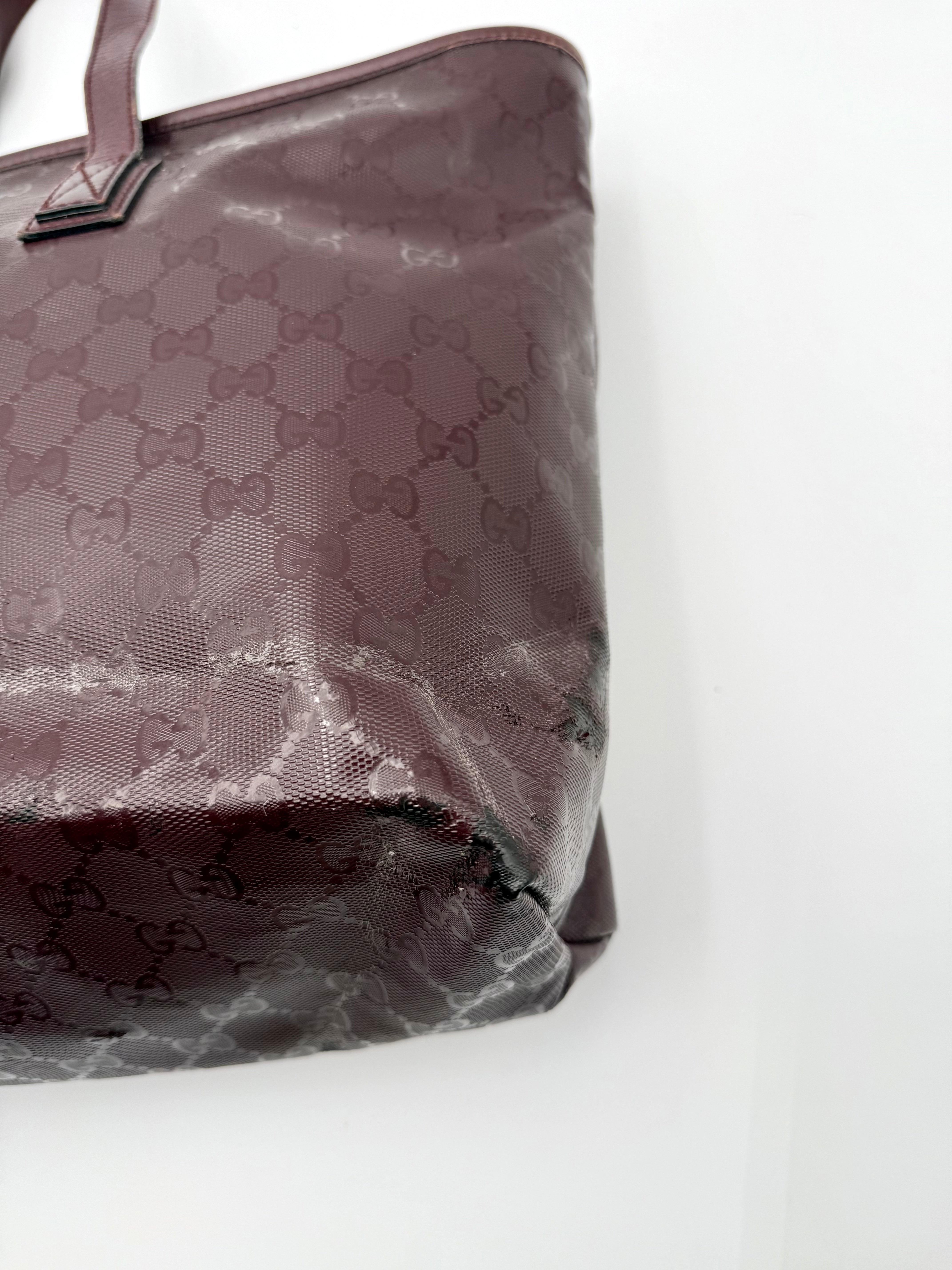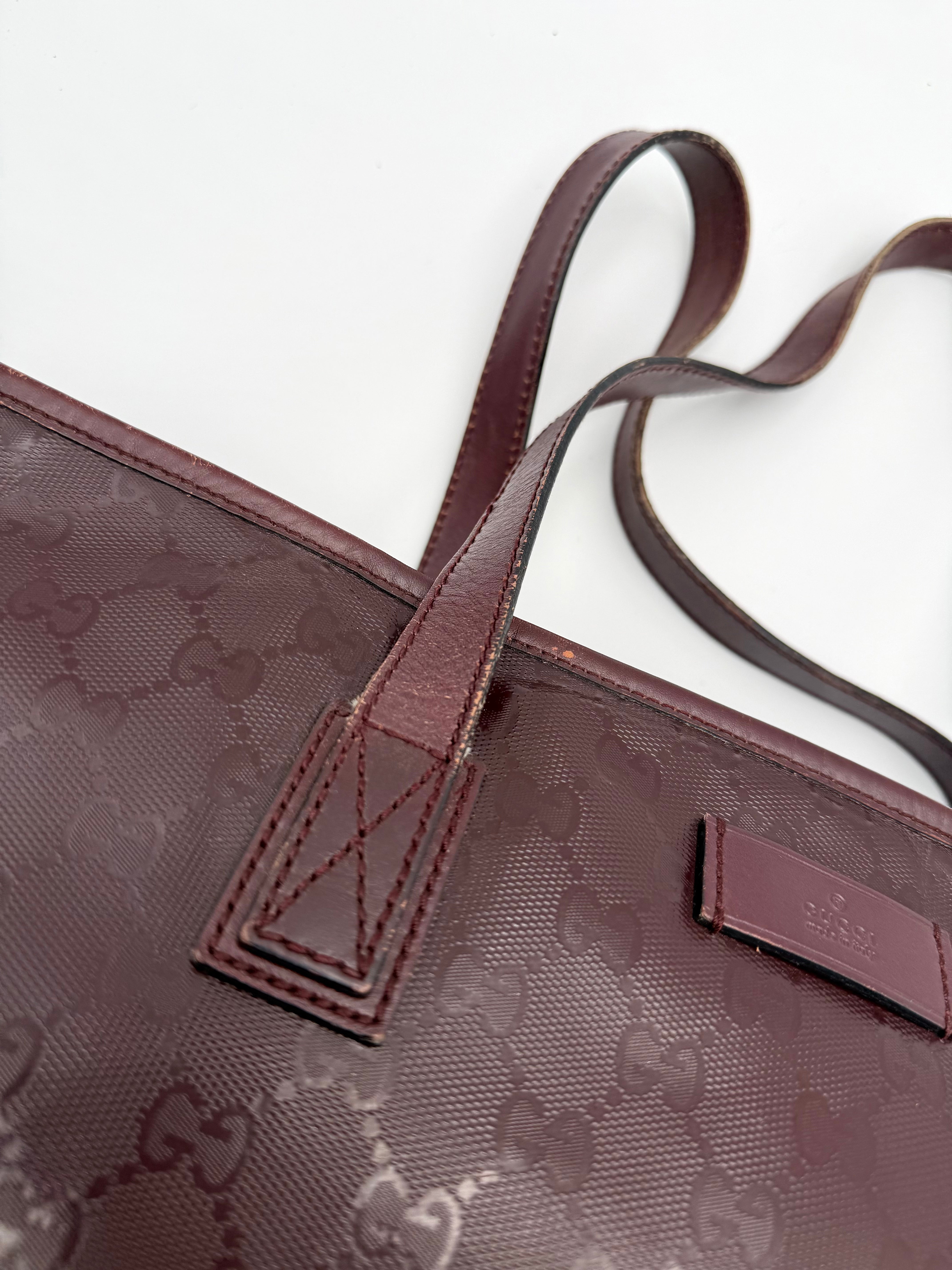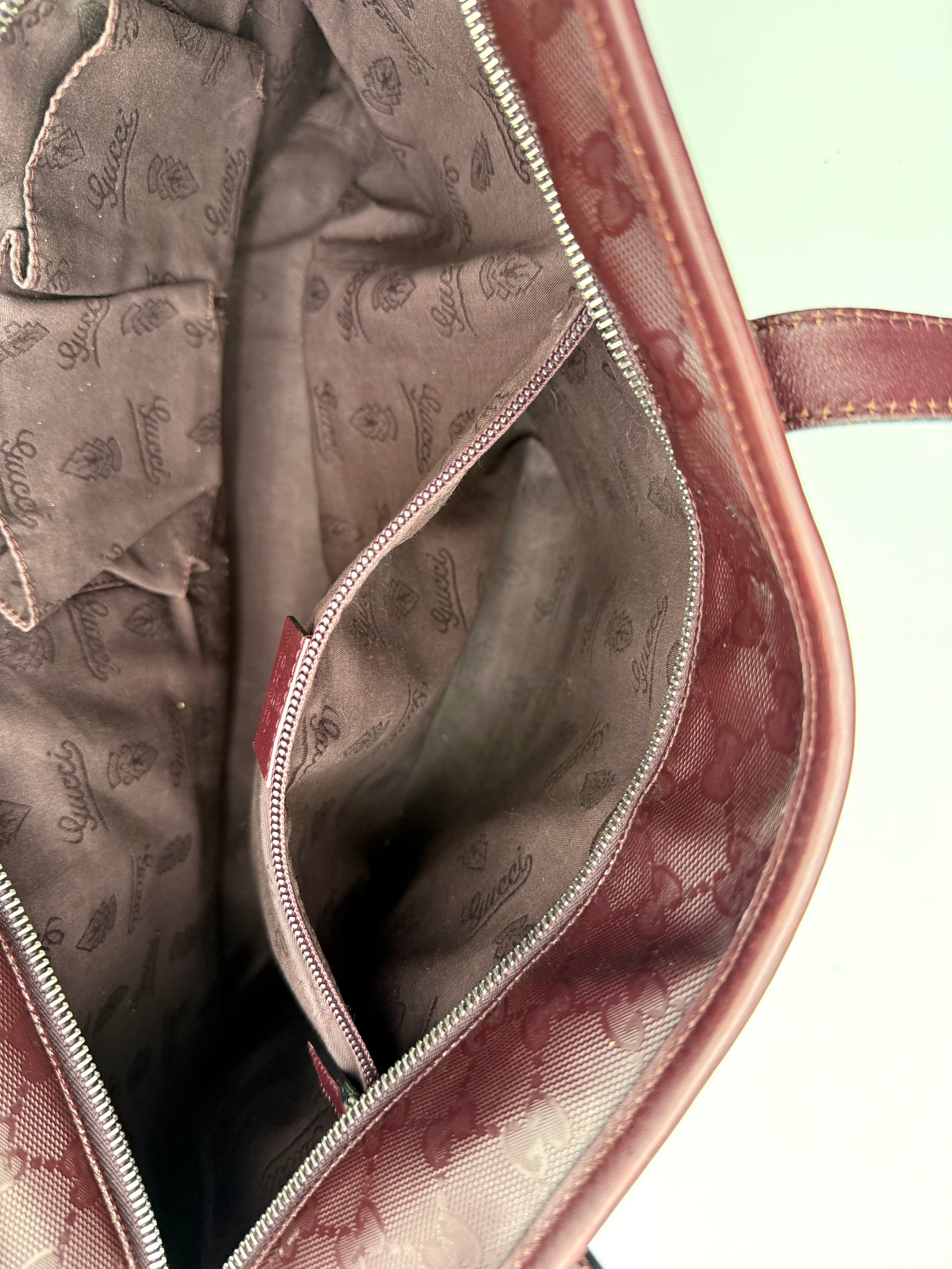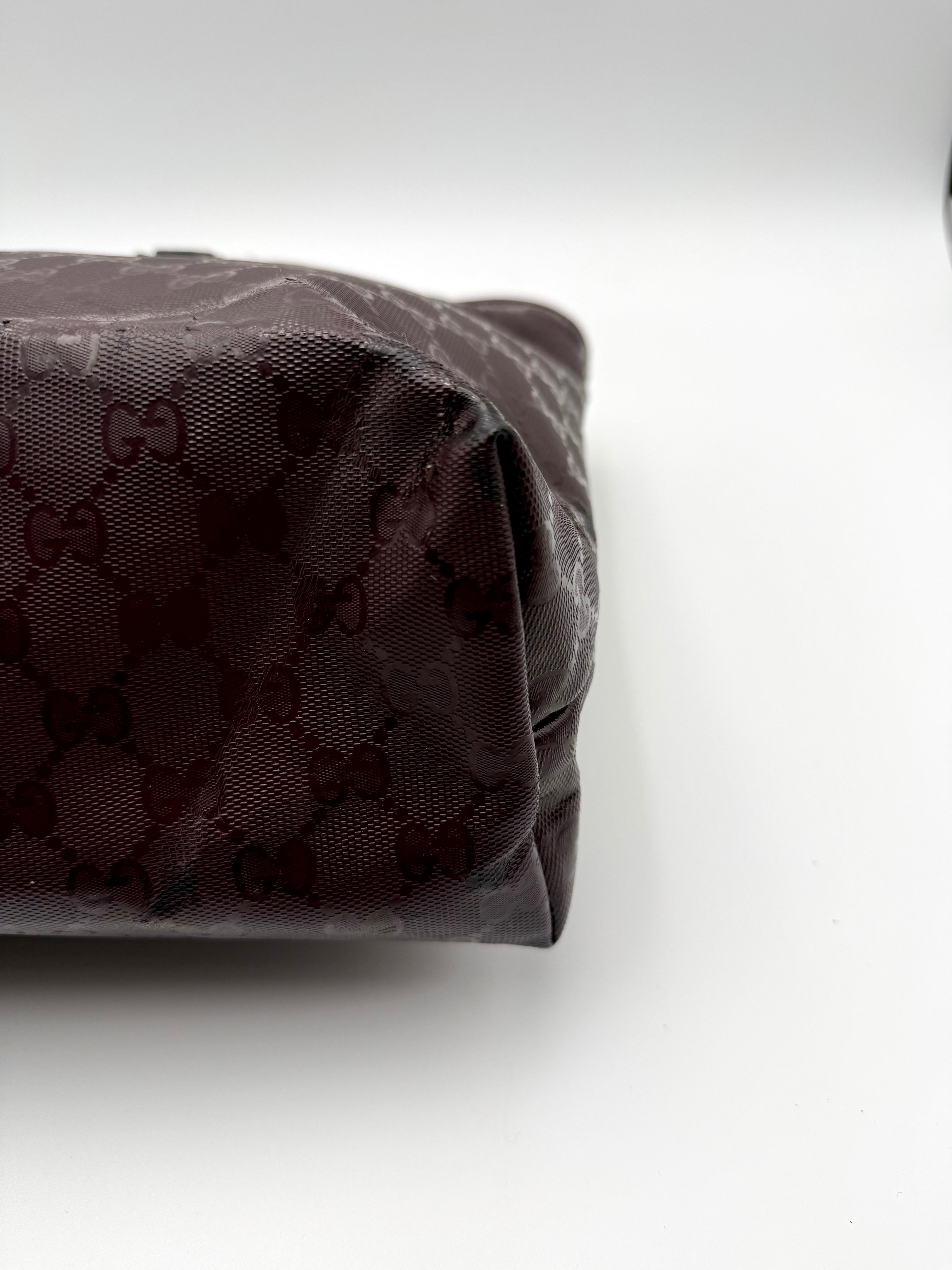 Tweedehands GUCCI tote bag in bordeaux PVC. De tas sluit met een rits en heeft één binnenvakje met rits en twee steekvakjes. Het item verkeert in een vintage staat, met algemene gebruikssporen. De tas wordt geleverd in onze mooie Moon flower dustbag.