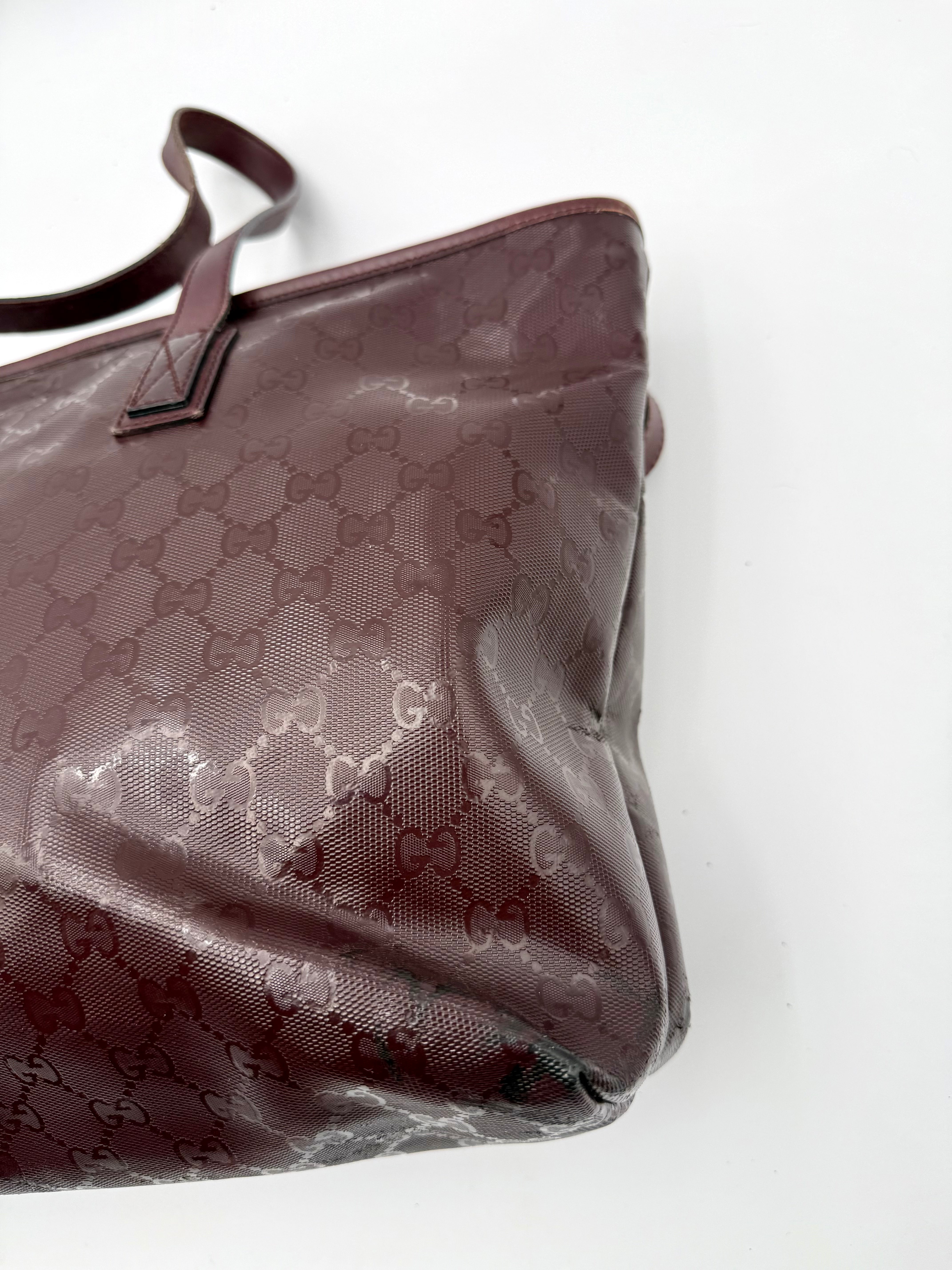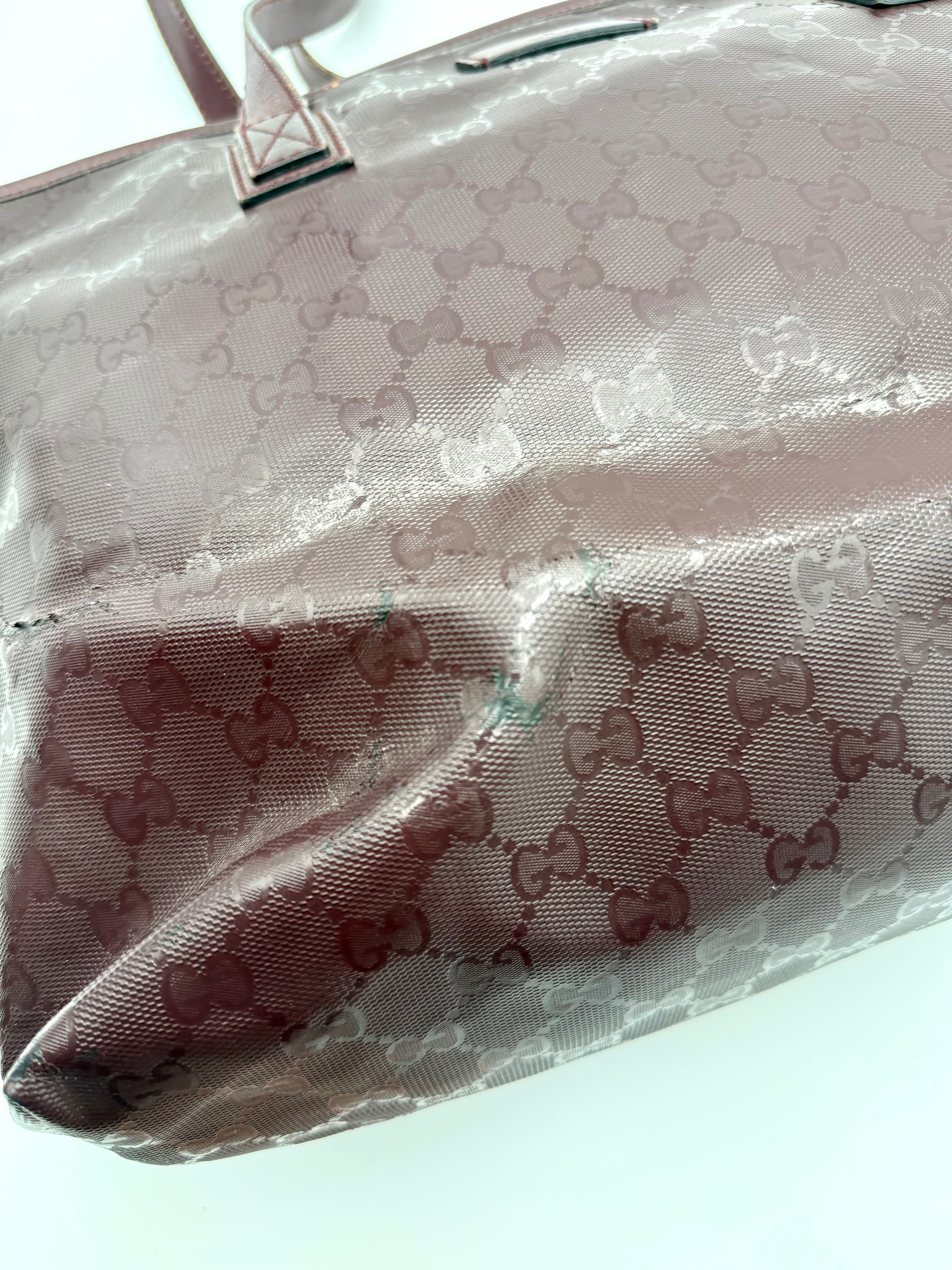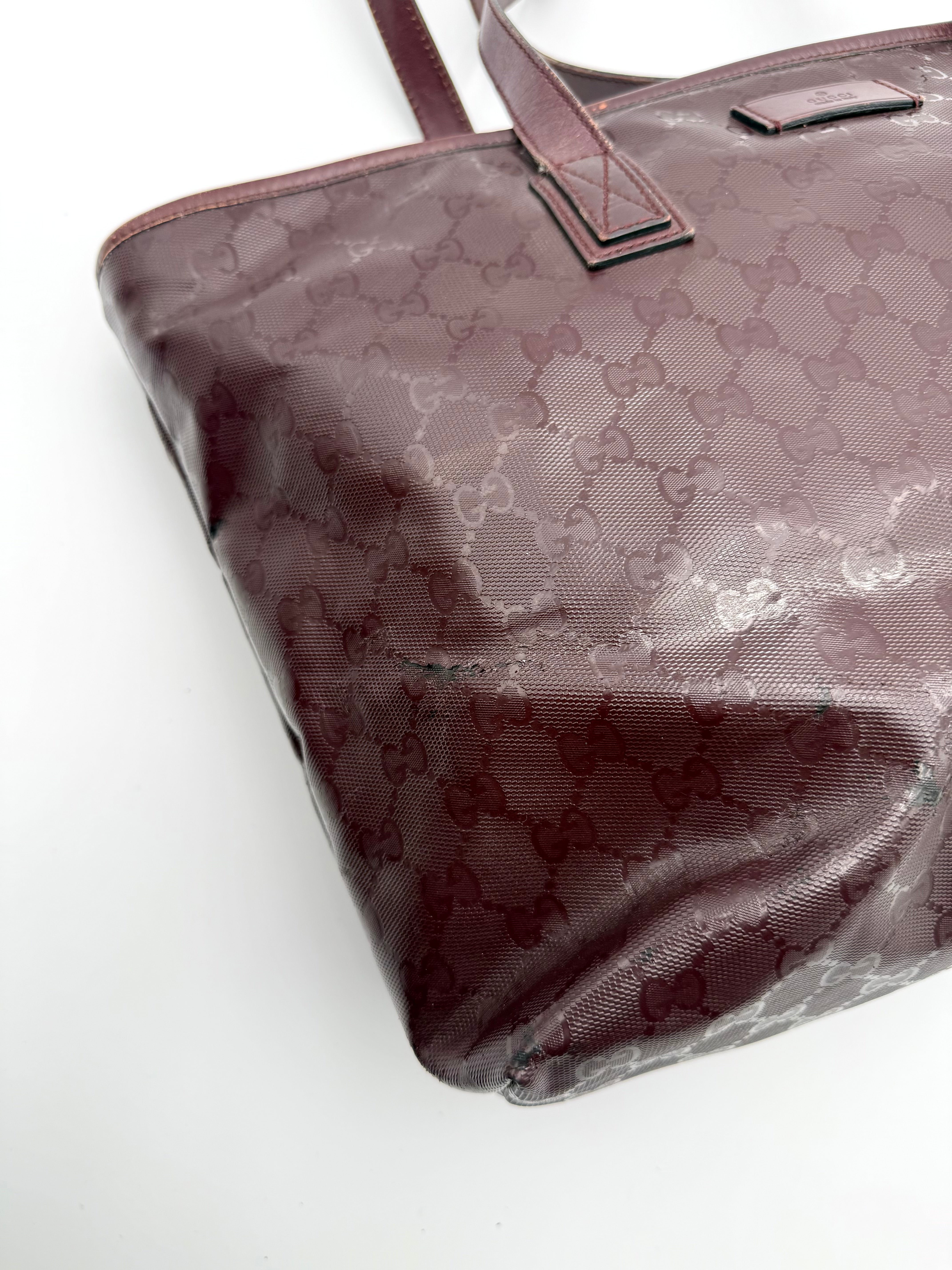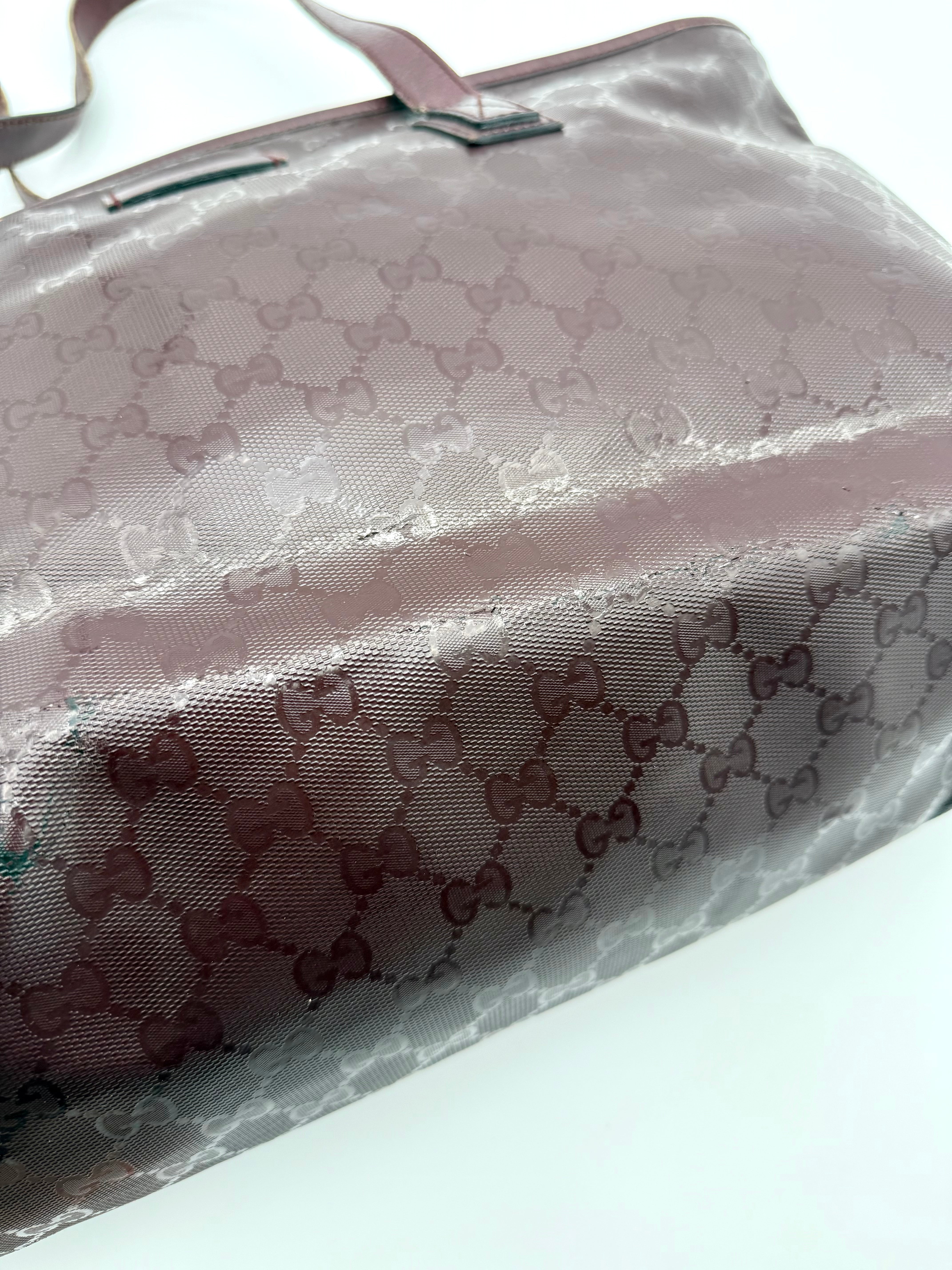 Tweedehands GUCCI tote bag in bordeaux PVC. De tas sluit met een rits en heeft één binnenvakje met rits en twee steekvakjes. Het item verkeert in een vintage staat, met algemene gebruikssporen. De tas wordt geleverd in onze mooie Moon flower dustbag.