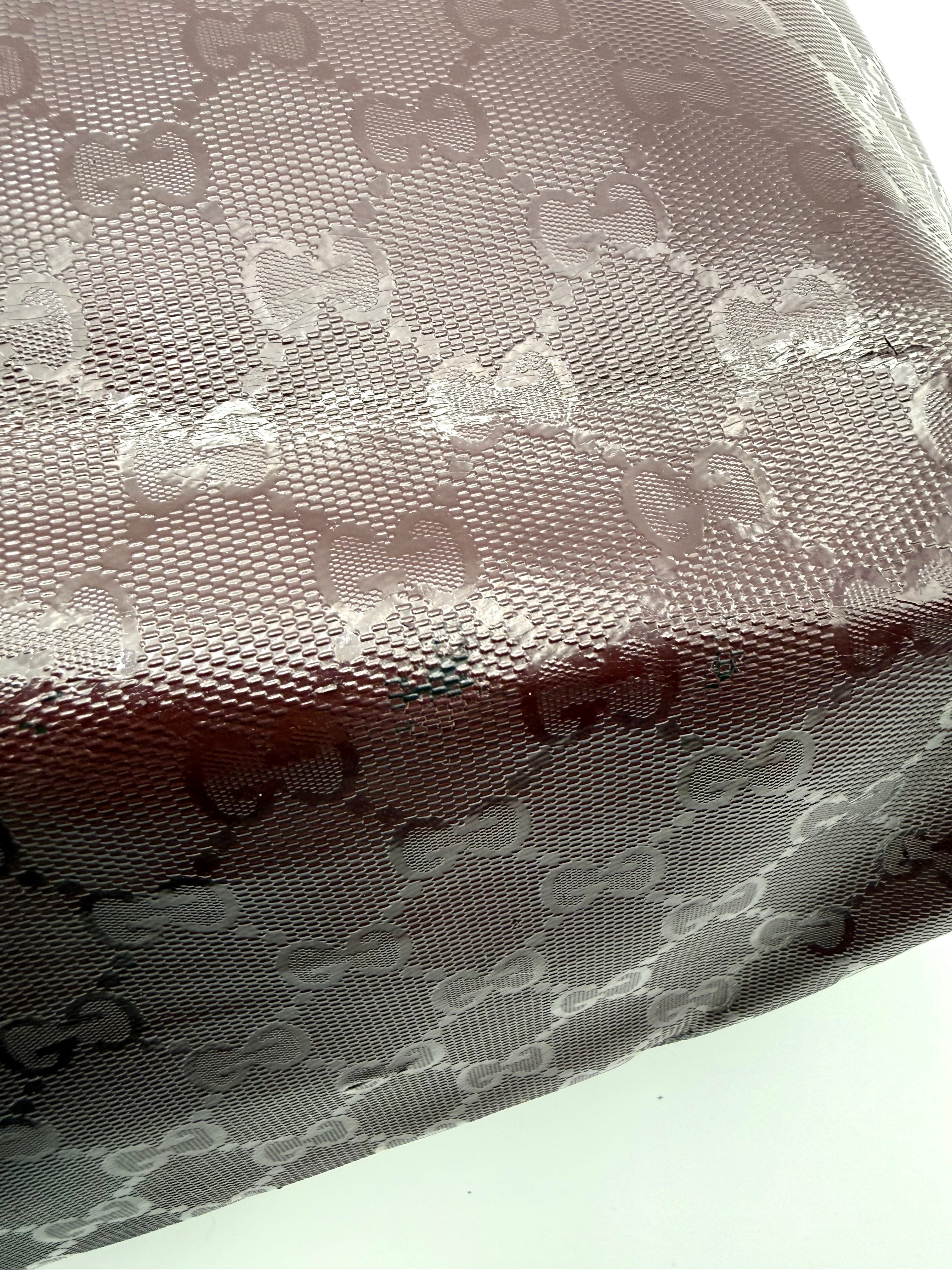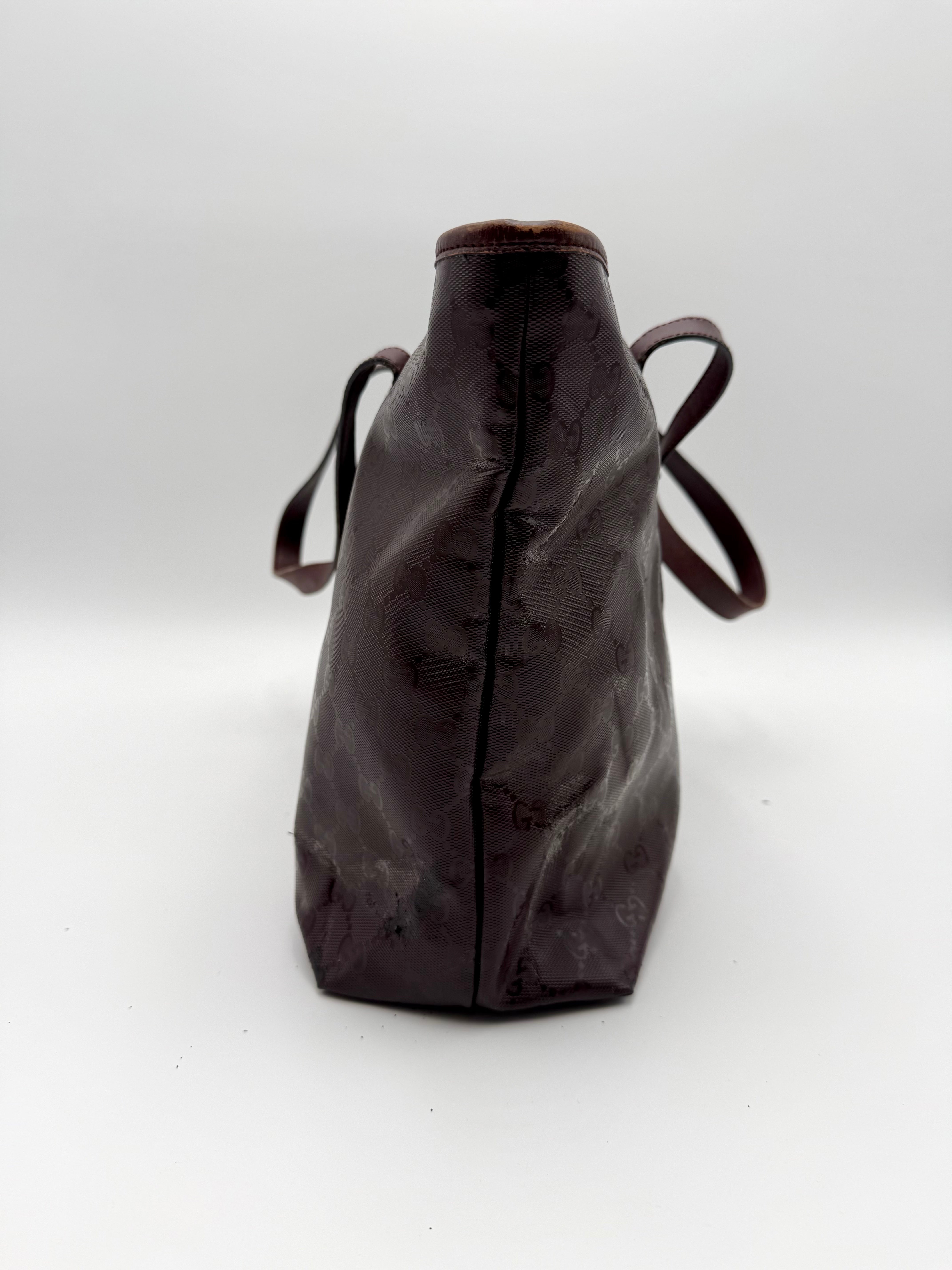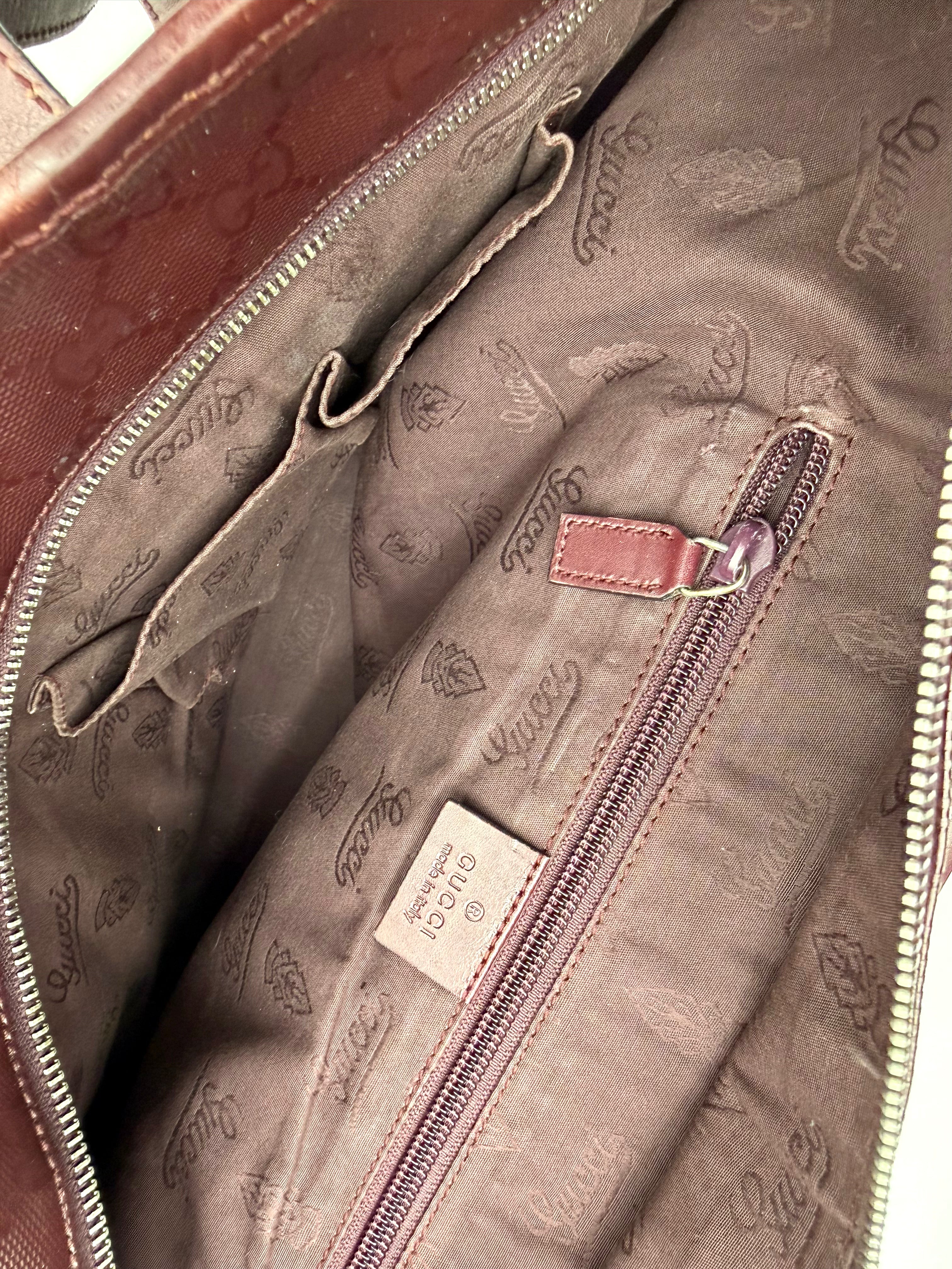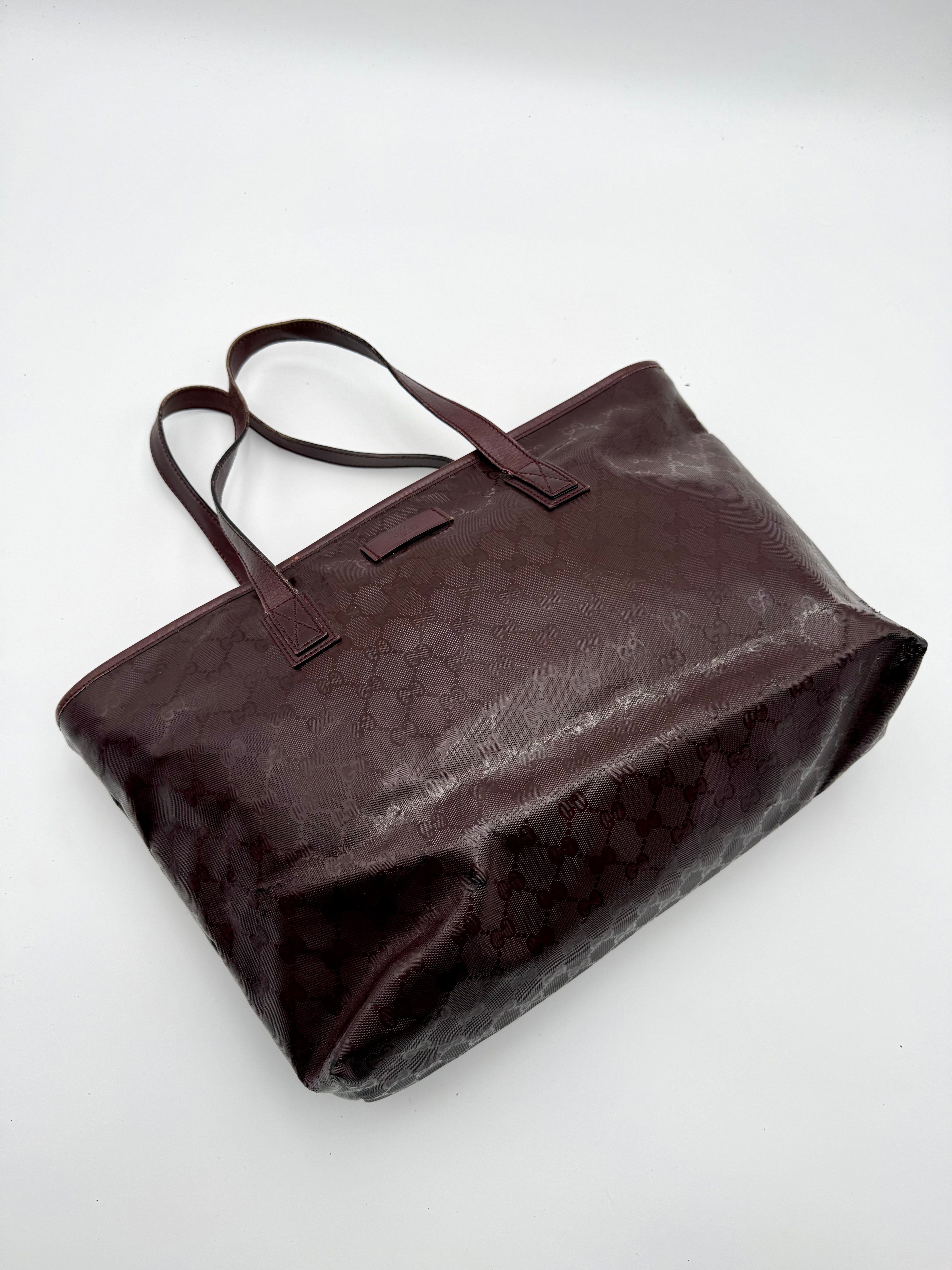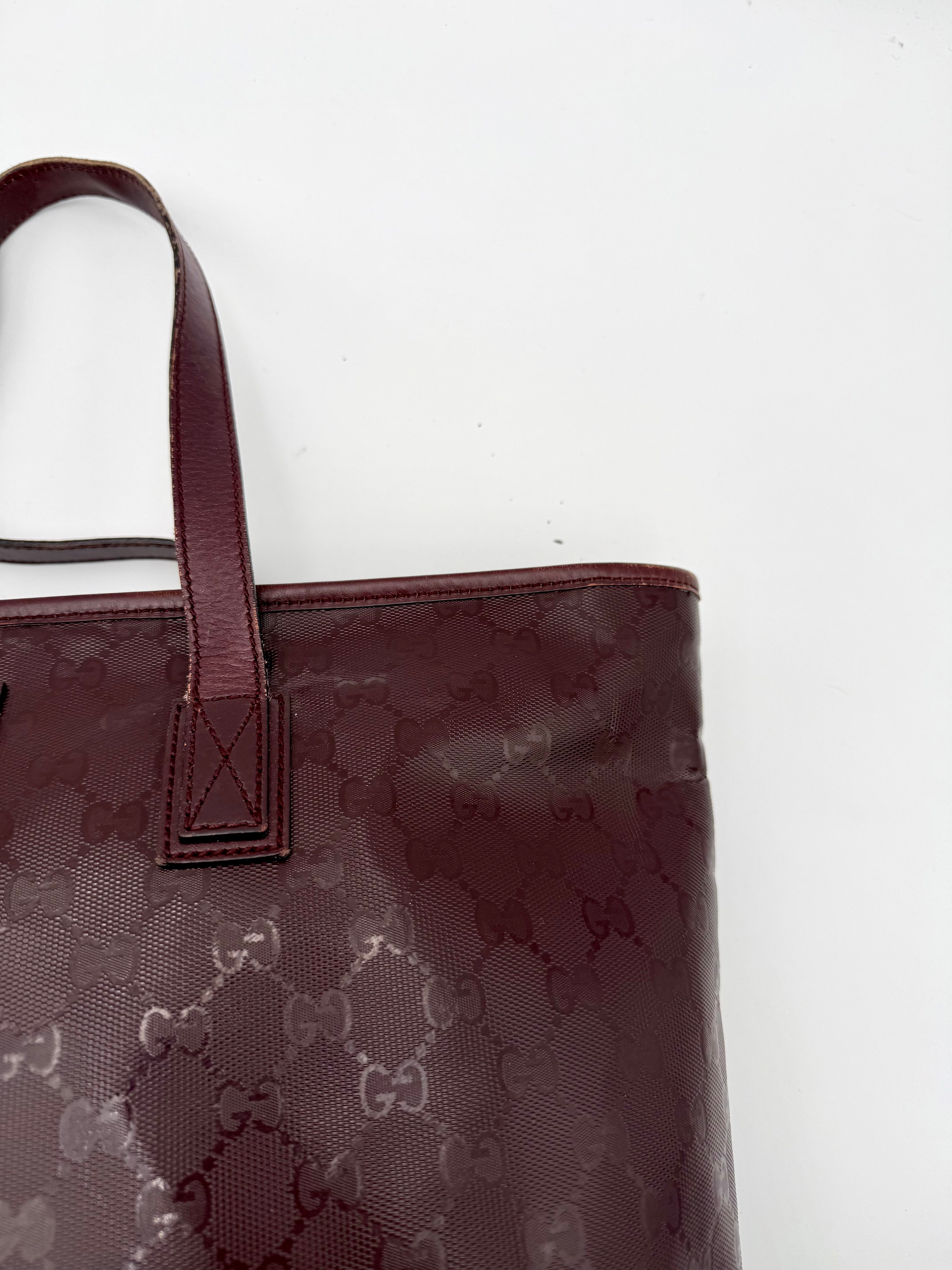 Tweedehands GUCCI tote bag in bordeaux PVC. De tas sluit met een rits en heeft één binnenvakje met rits en twee steekvakjes. Het item verkeert in een vintage staat, met algemene gebruikssporen. De tas wordt geleverd in onze mooie Moon flower dustbag.