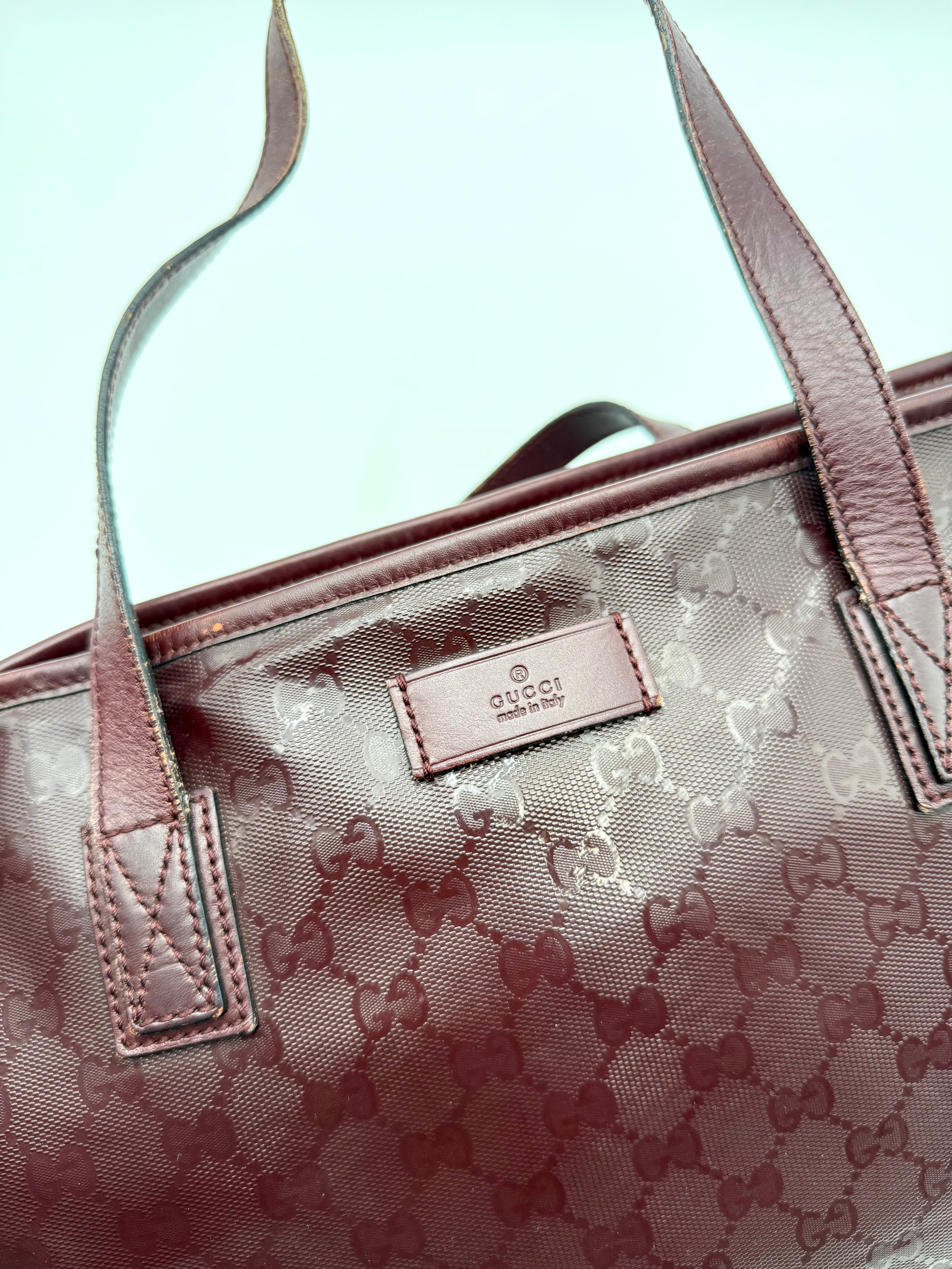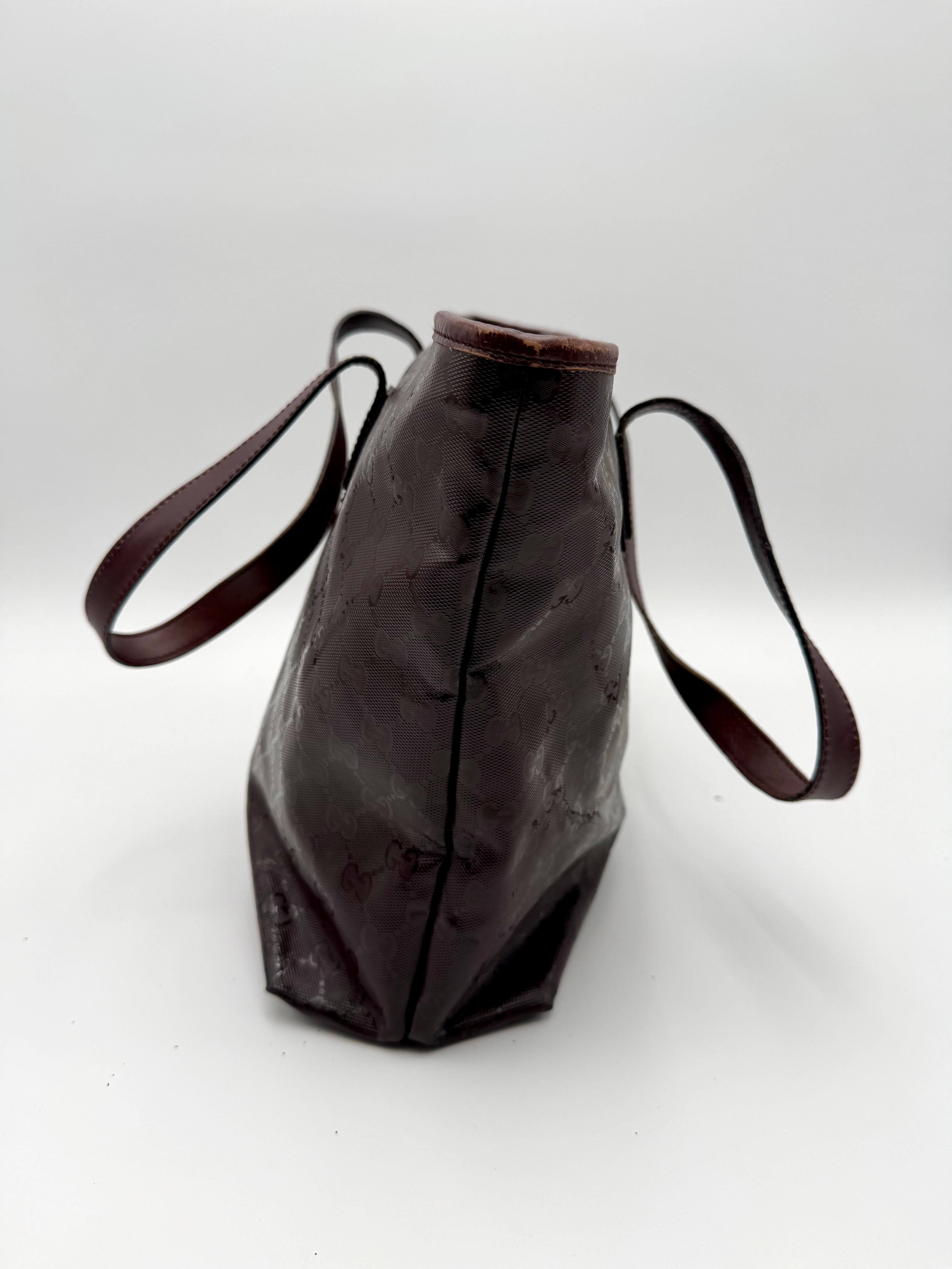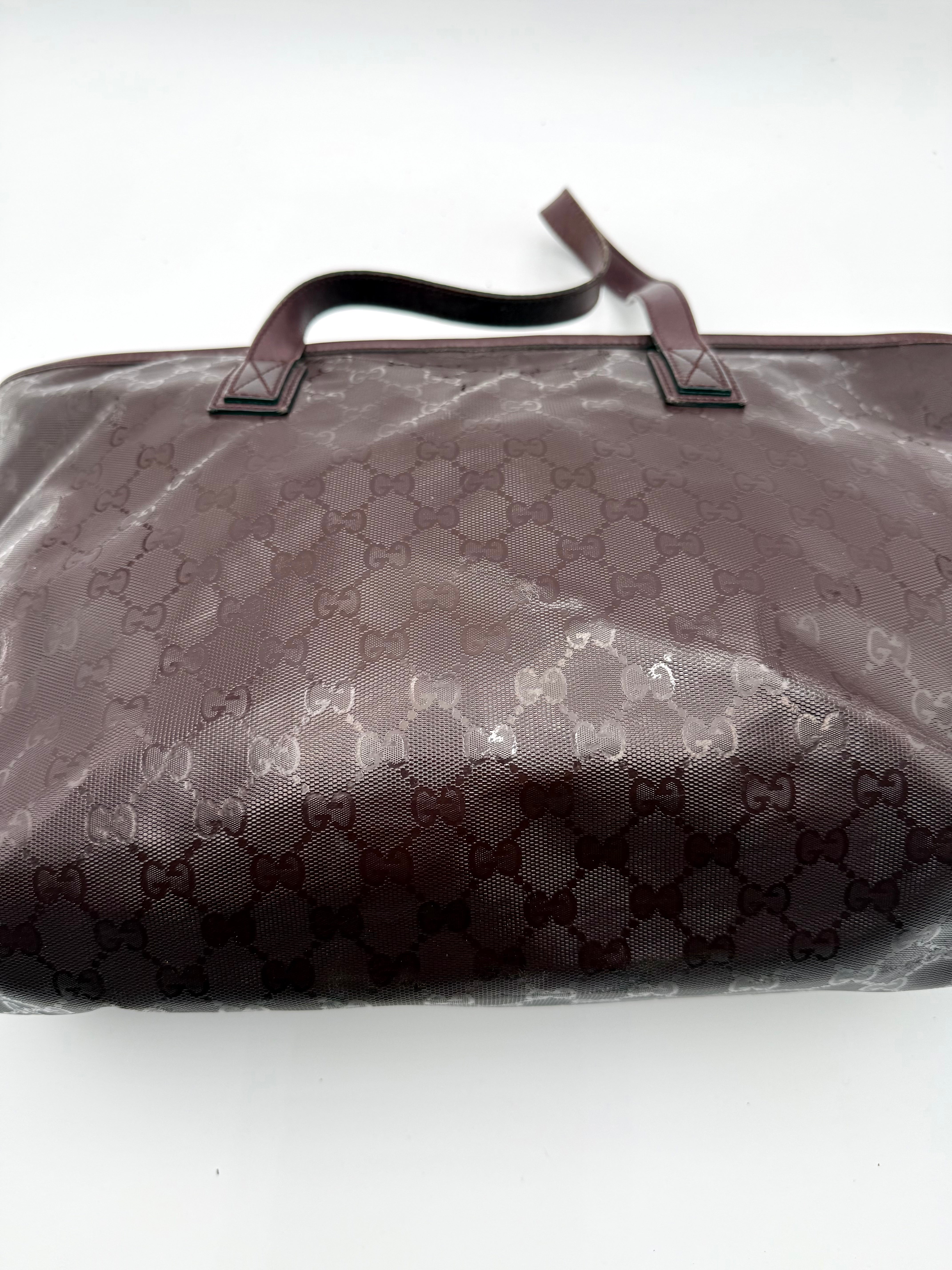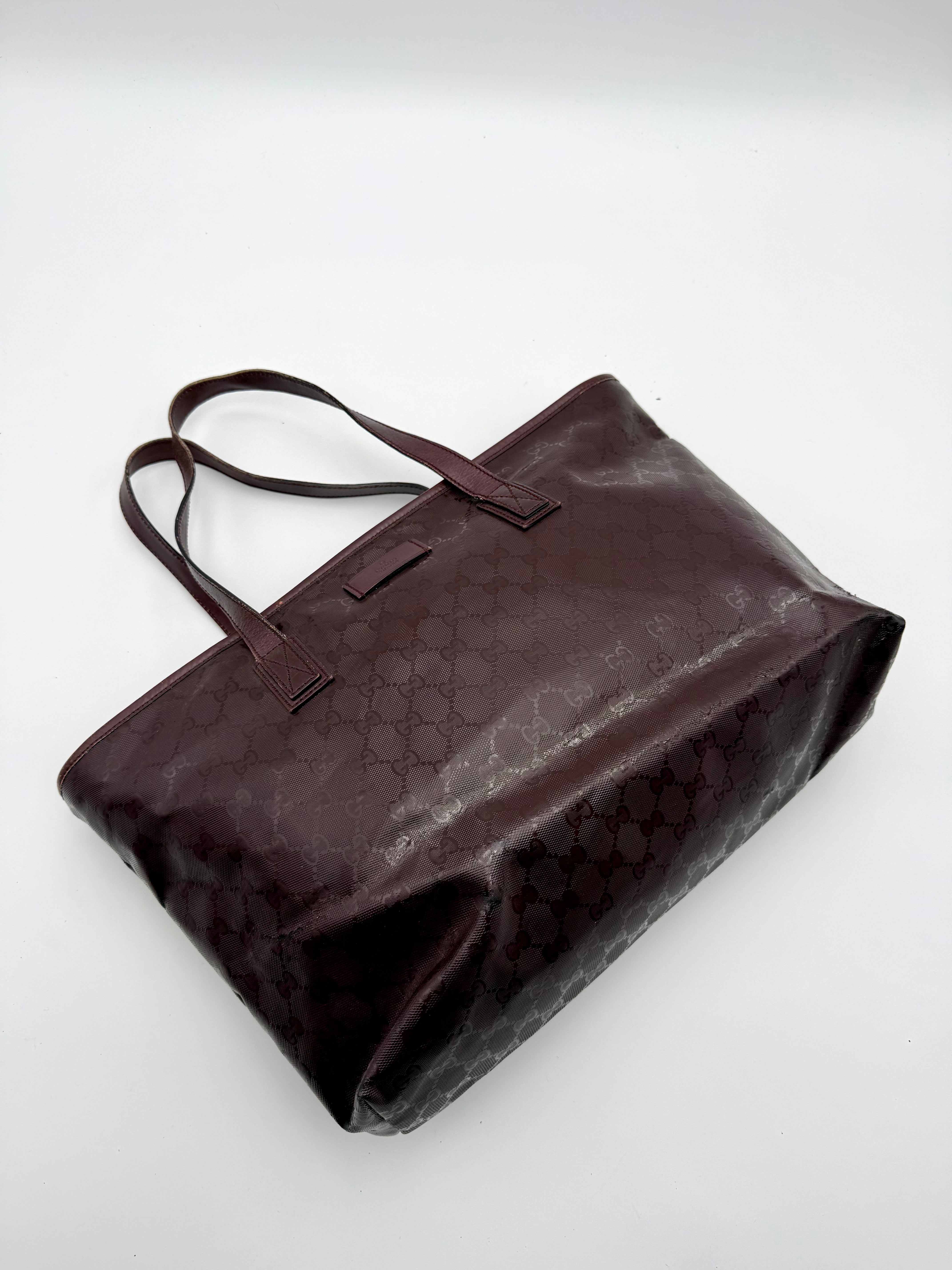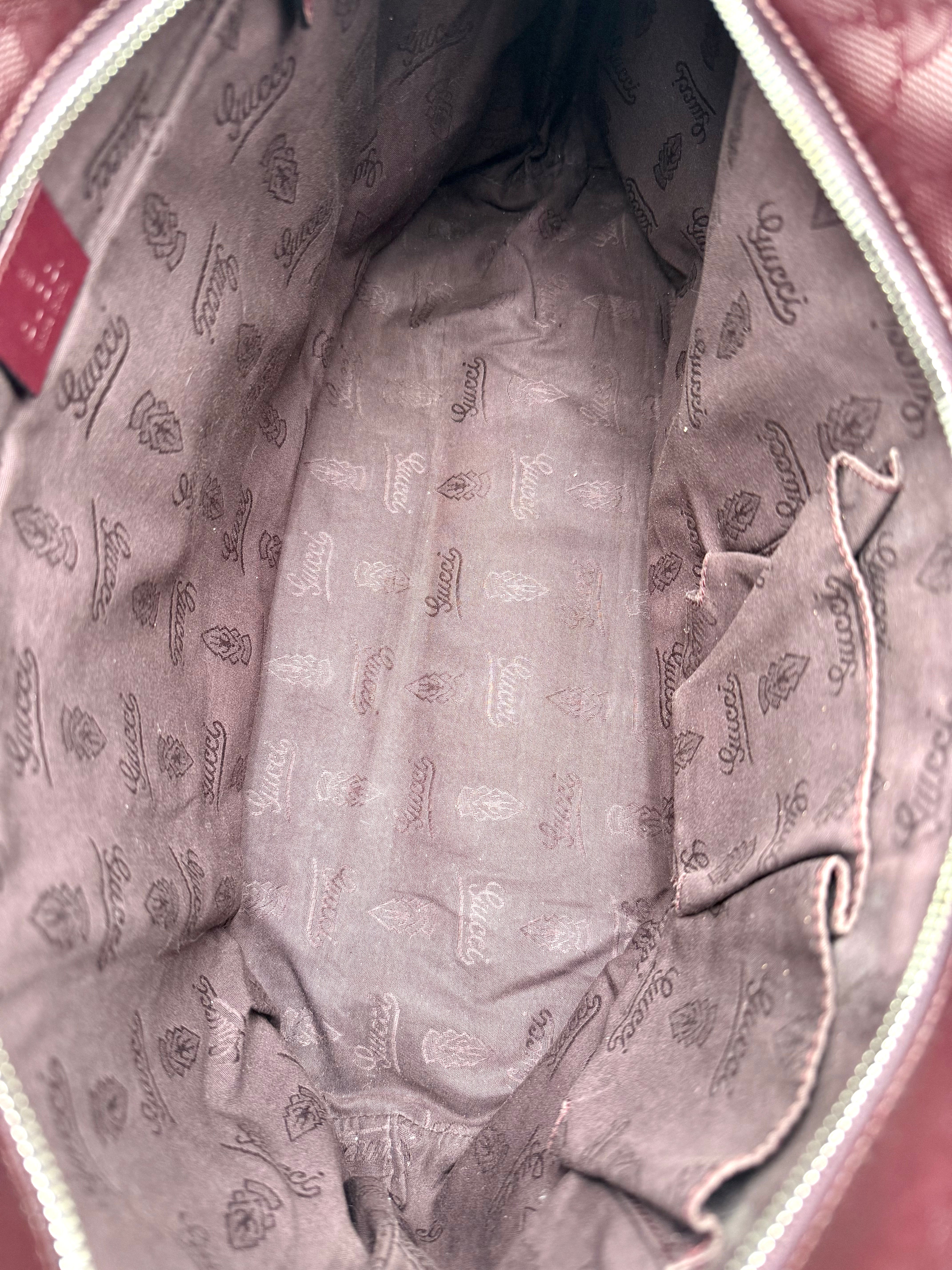 Tweedehands GUCCI tote bag in bordeaux PVC. De tas sluit met een rits en heeft één binnenvakje met rits en twee steekvakjes. Het item verkeert in een vintage staat, met algemene gebruikssporen. De tas wordt geleverd in onze mooie Moon flower dustbag.