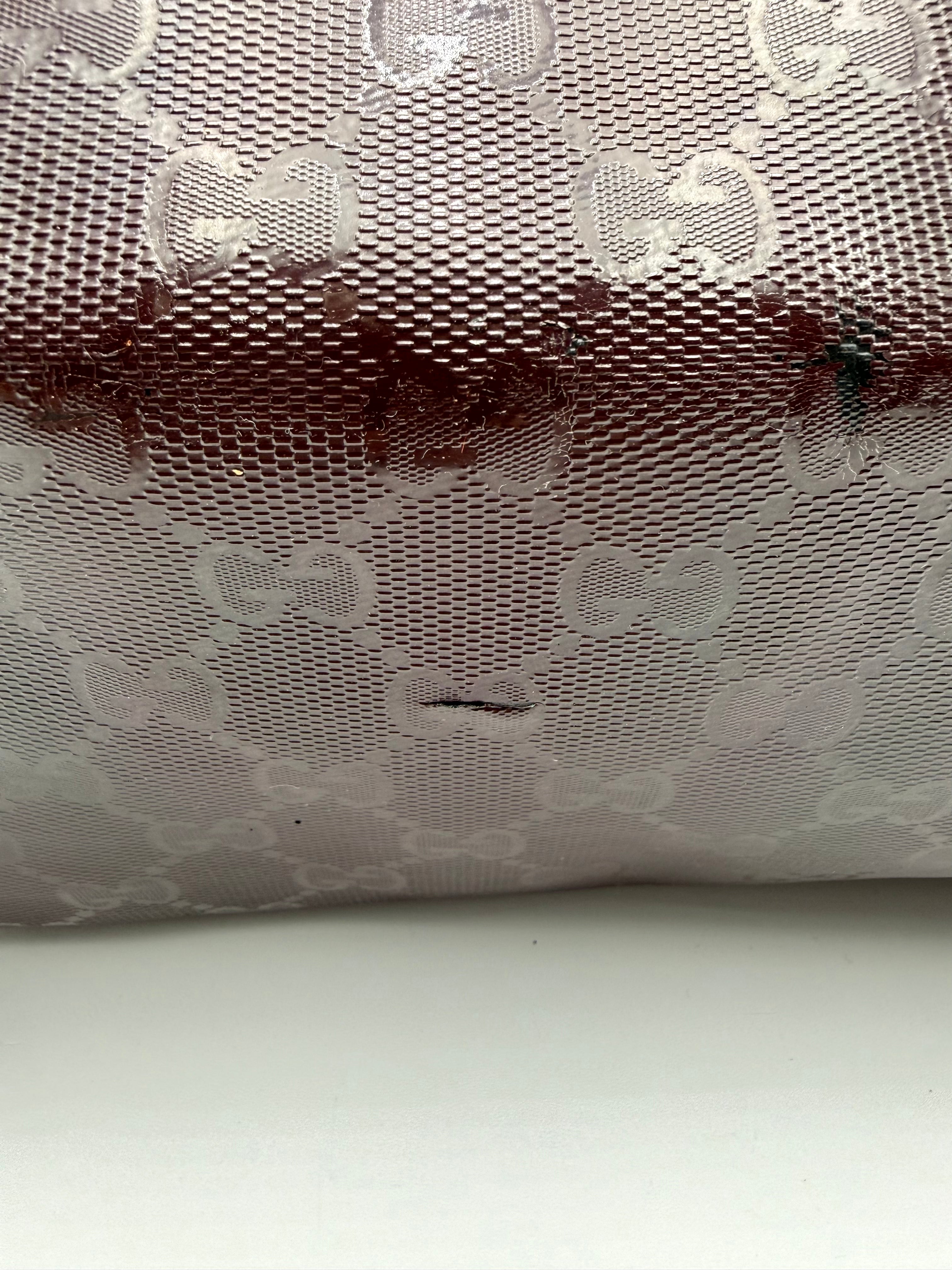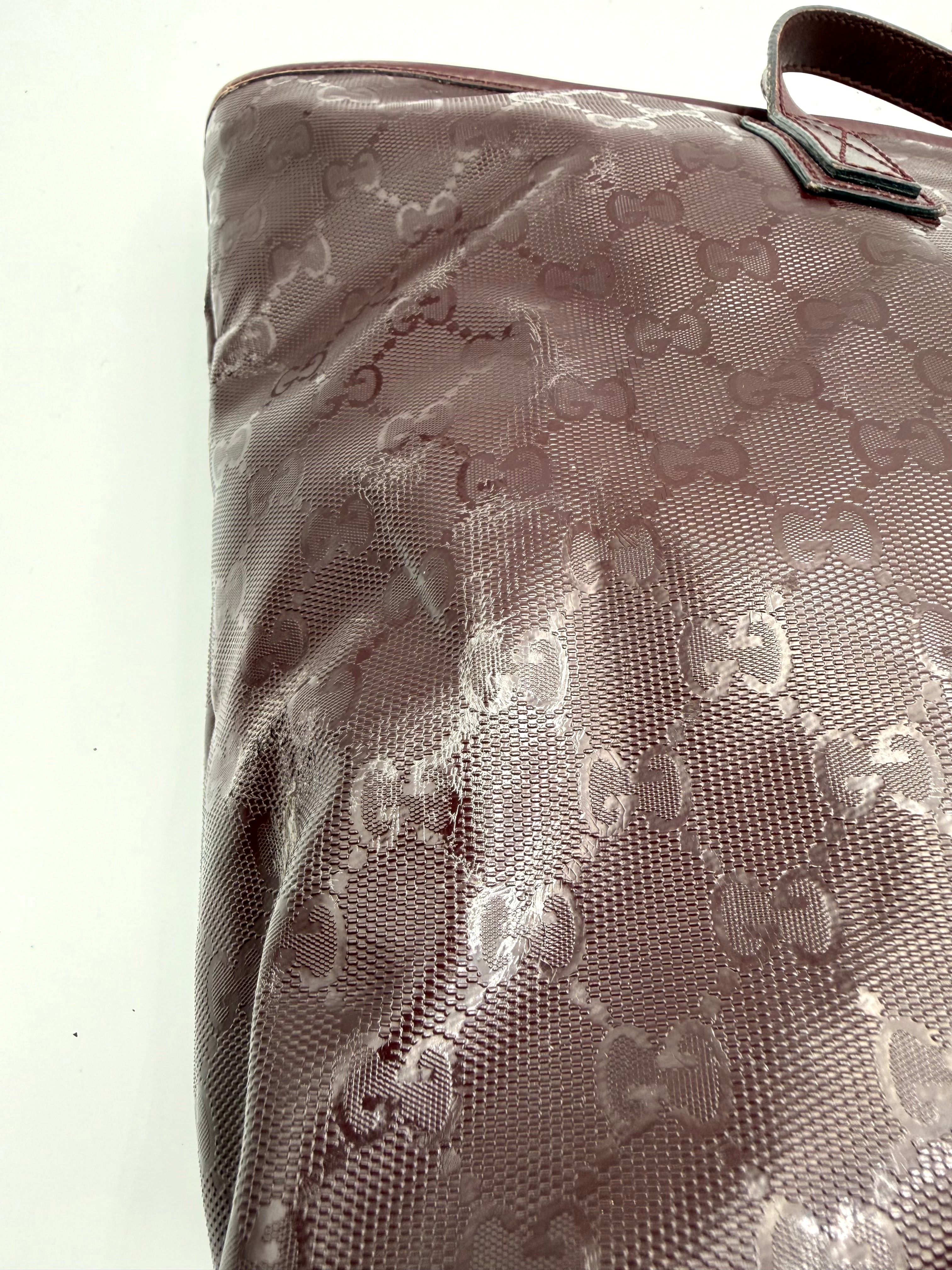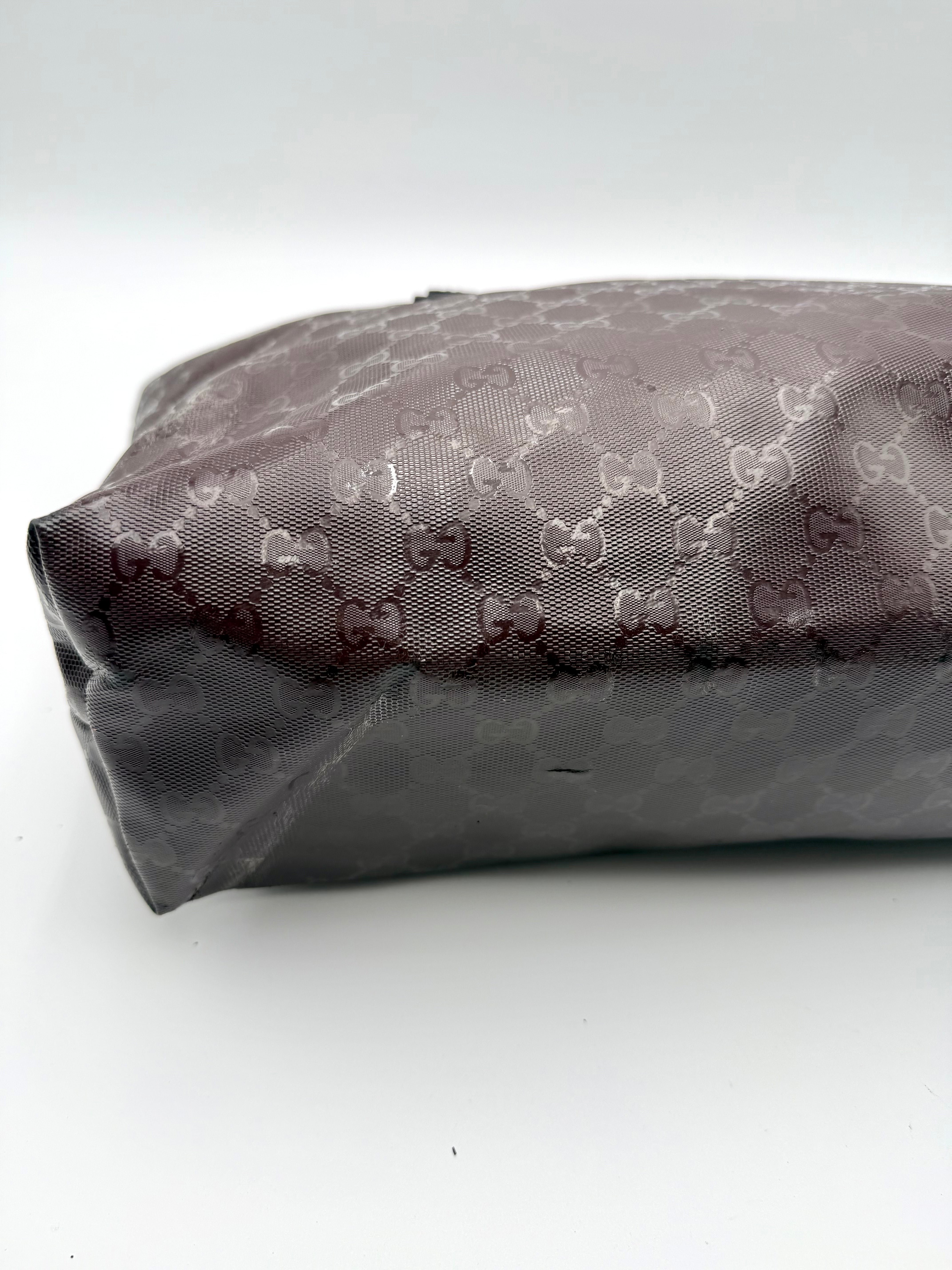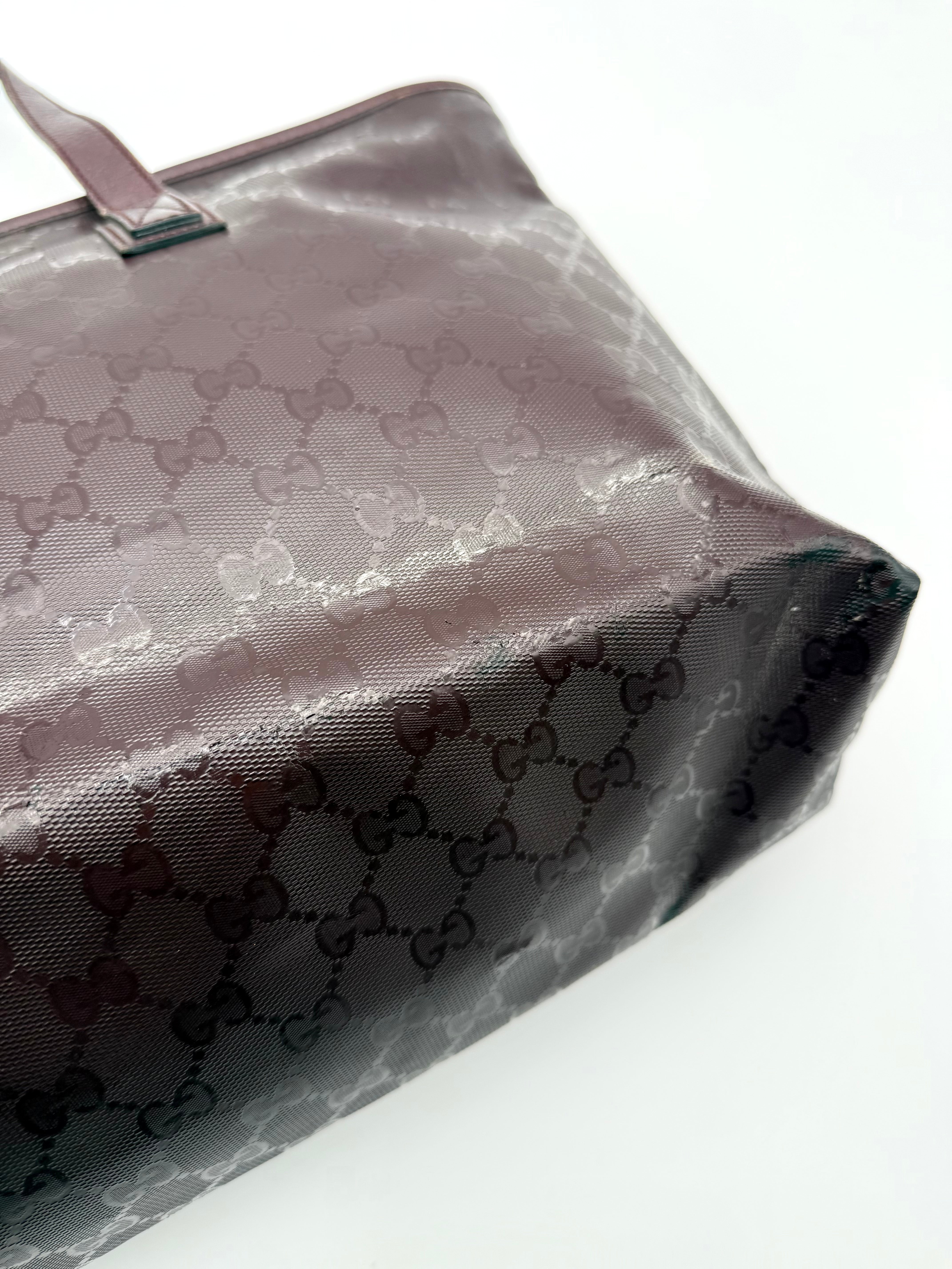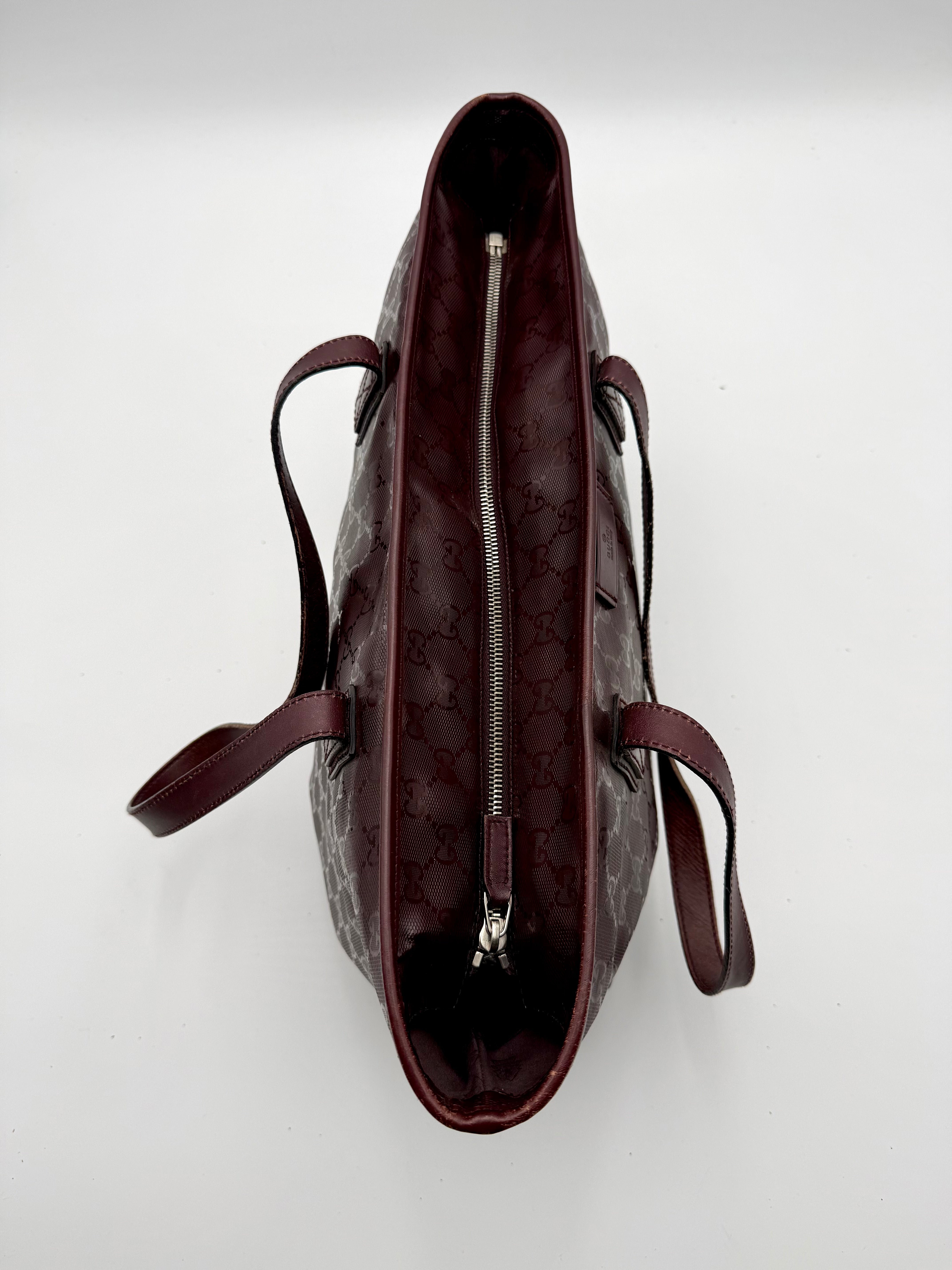 Tweedehands GUCCI tote bag in bordeaux PVC. De tas sluit met een rits en heeft één binnenvakje met rits en twee steekvakjes. Het item verkeert in een vintage staat, met algemene gebruikssporen. De tas wordt geleverd in onze mooie Moon flower dustbag.