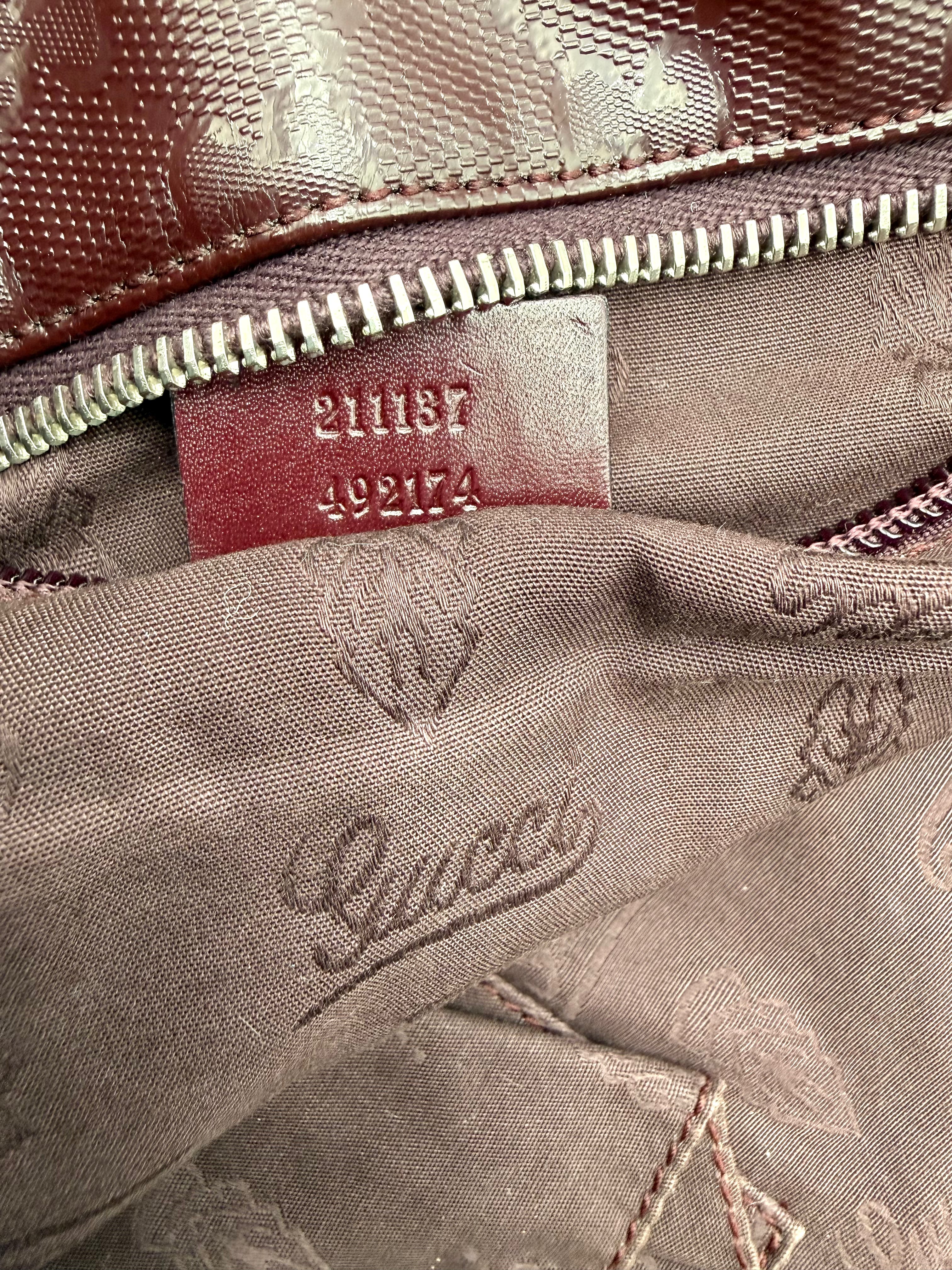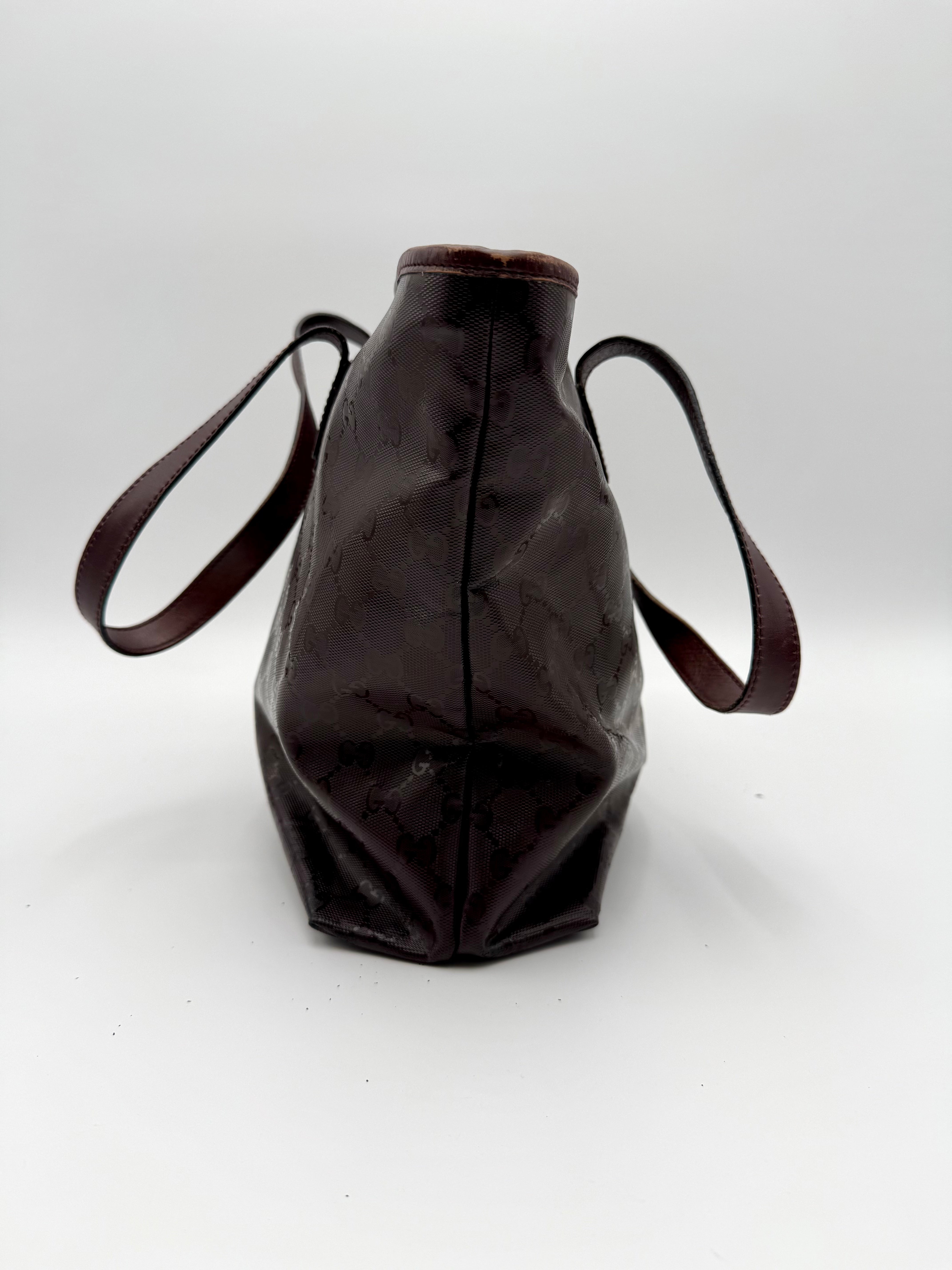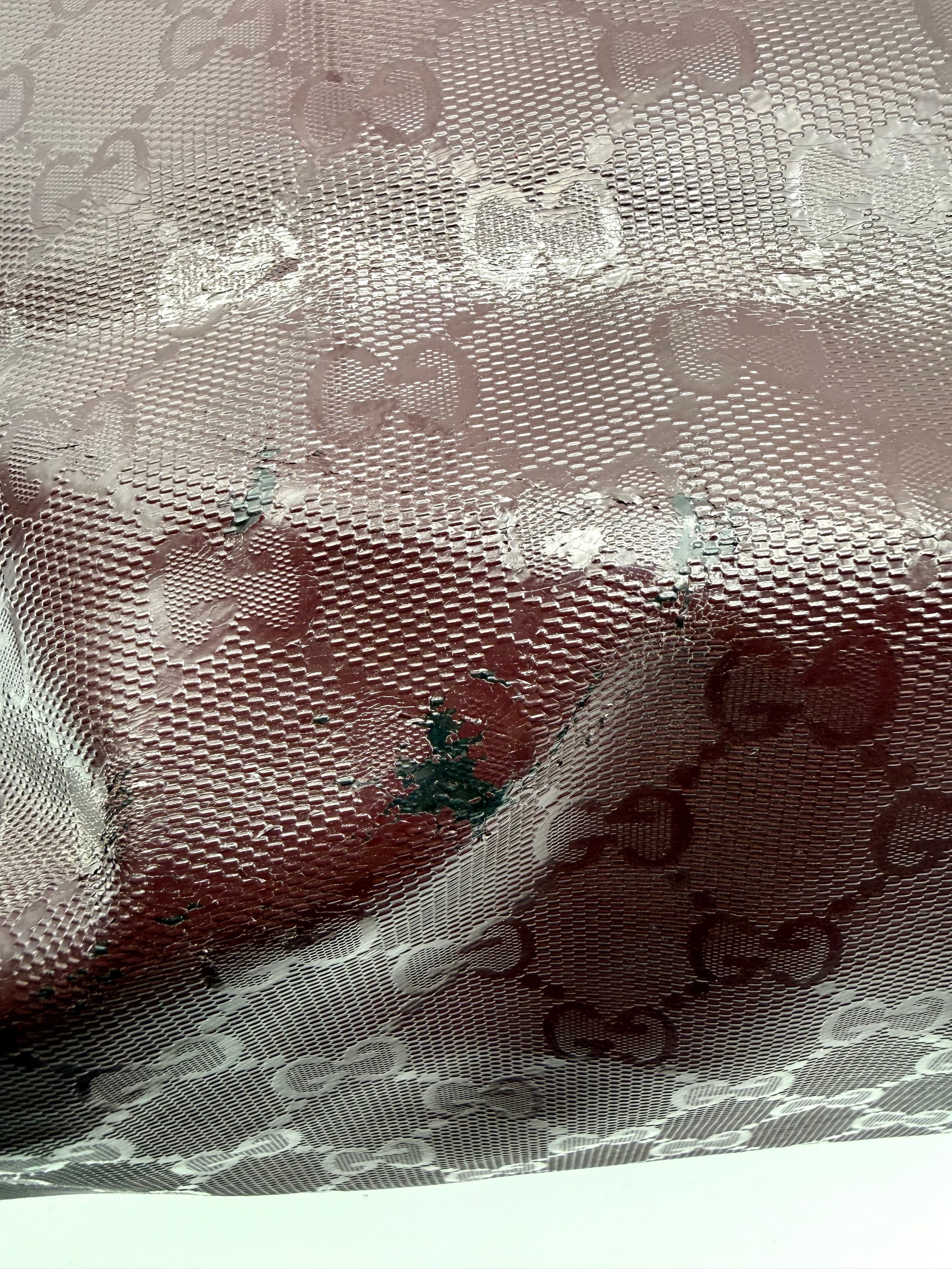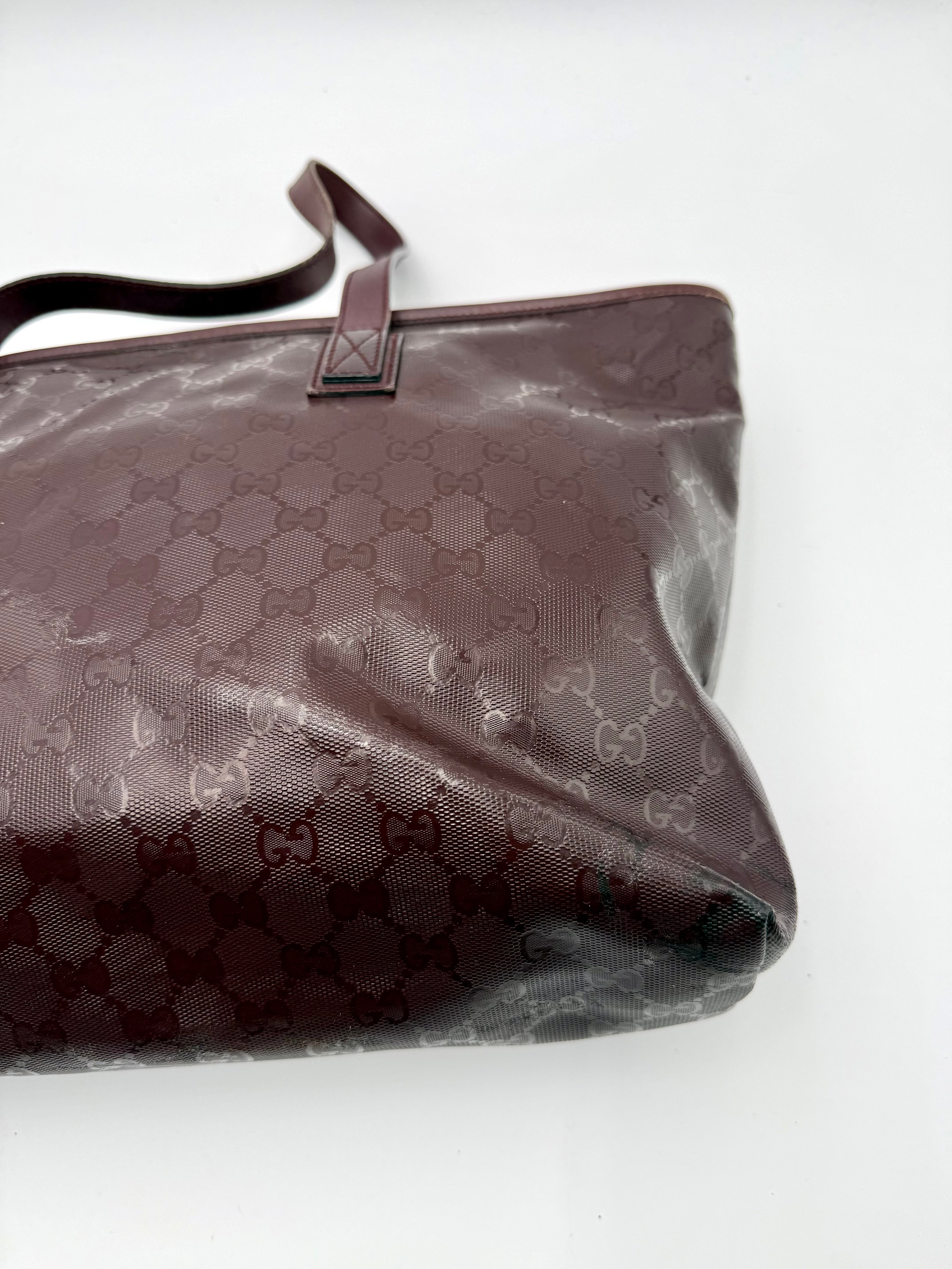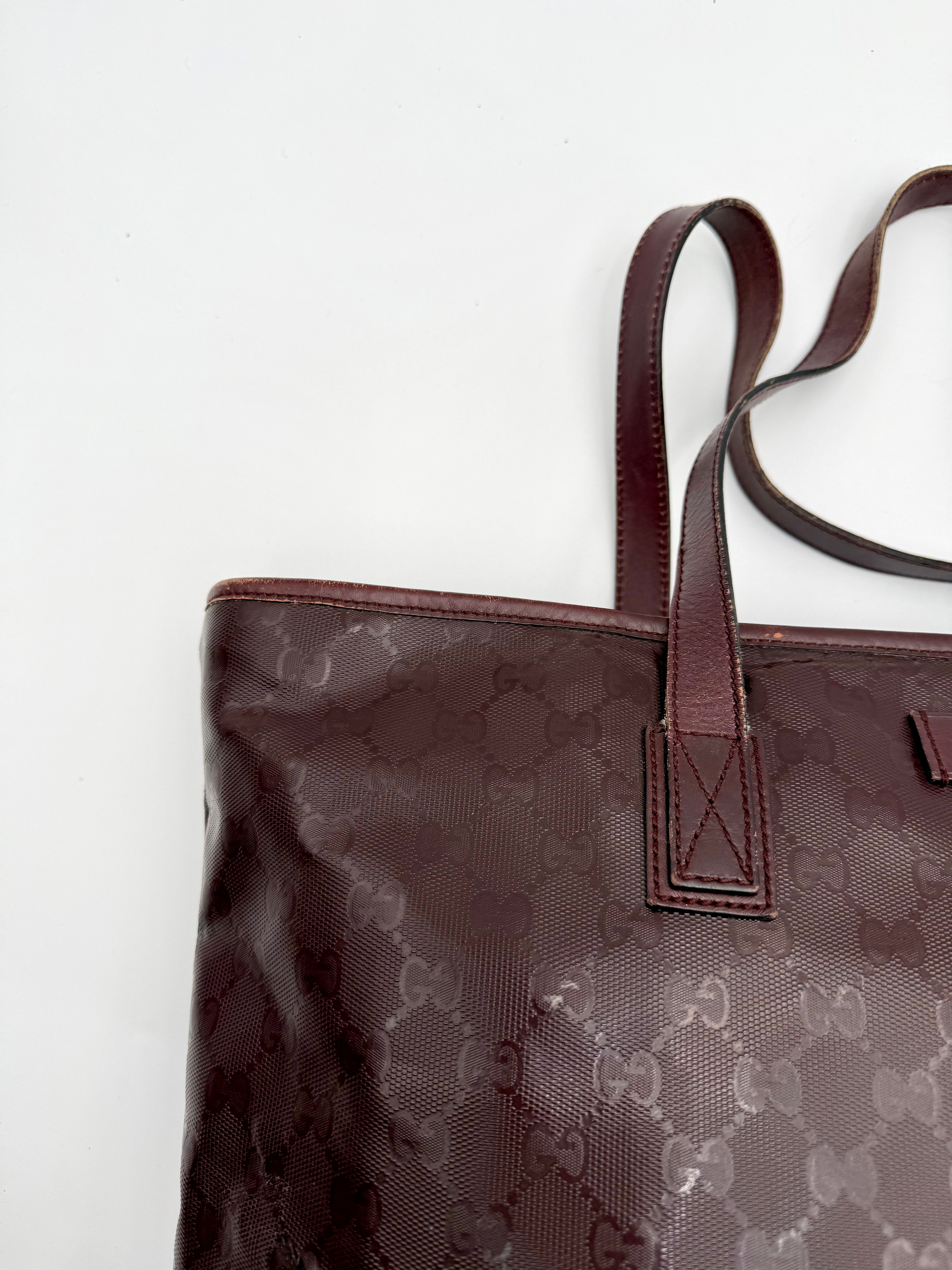 Tweedehands GUCCI tote bag in bordeaux PVC. De tas sluit met een rits en heeft één binnenvakje met rits en twee steekvakjes. Het item verkeert in een vintage staat, met algemene gebruikssporen. De tas wordt geleverd in onze mooie Moon flower dustbag.