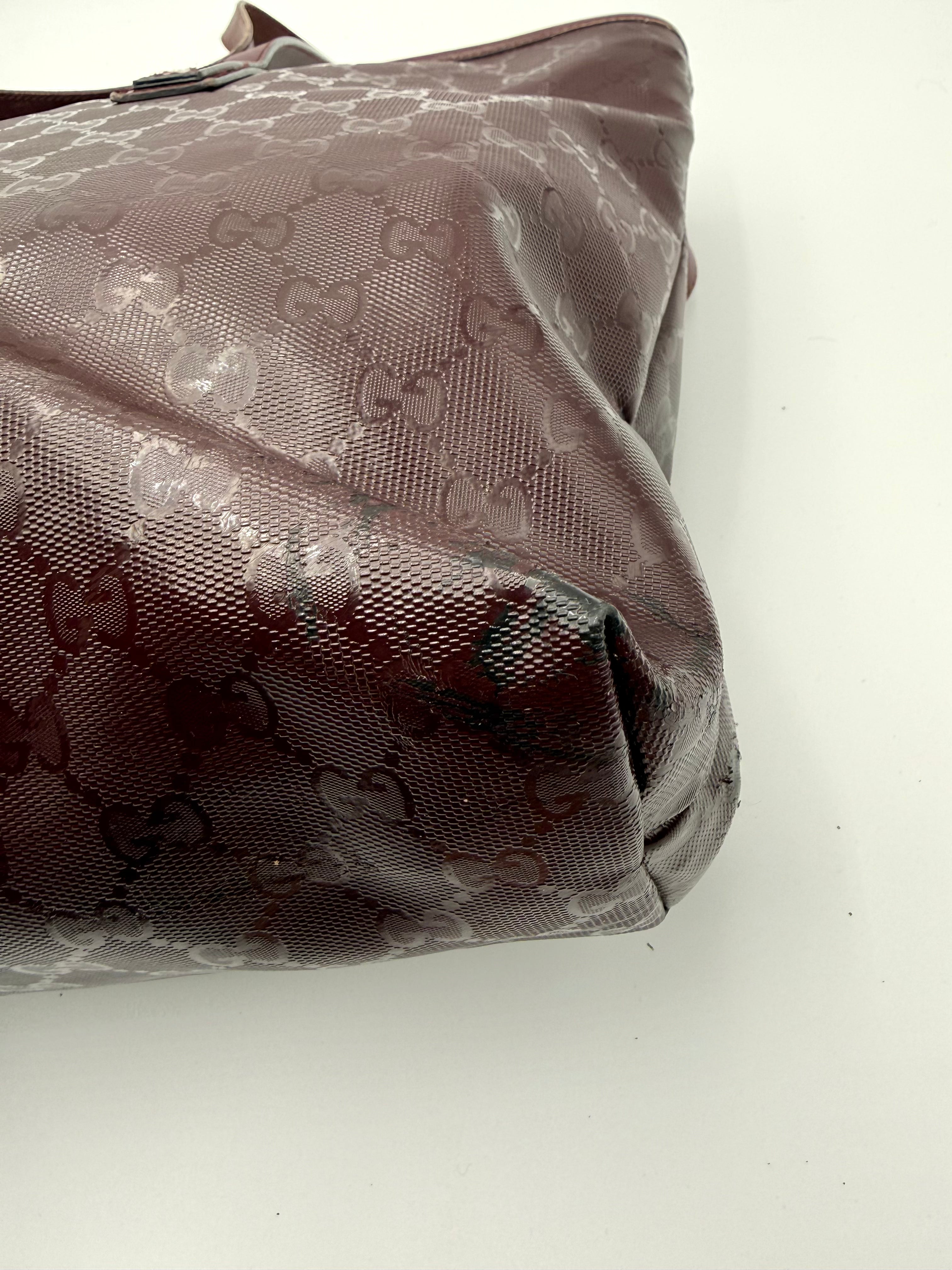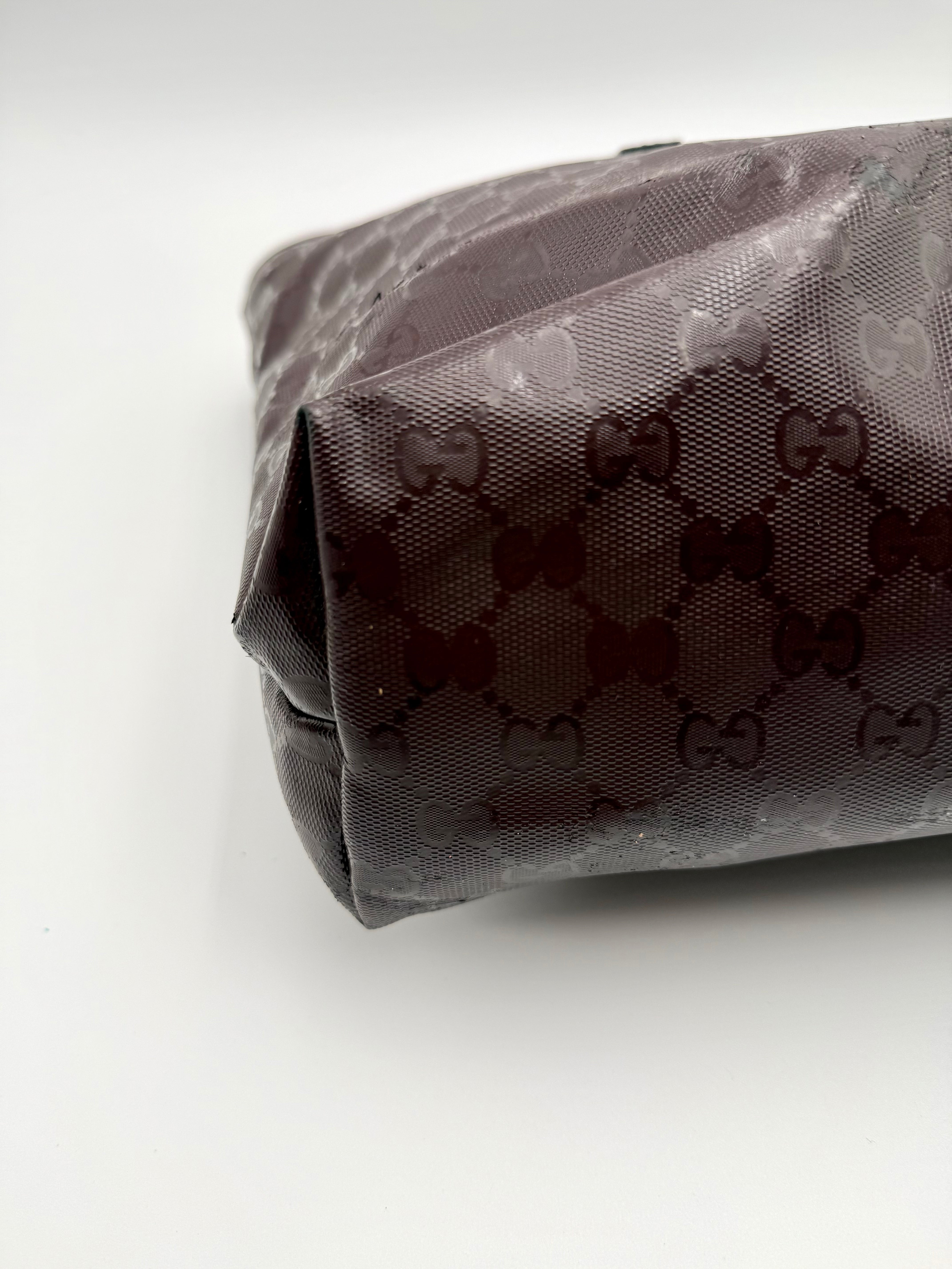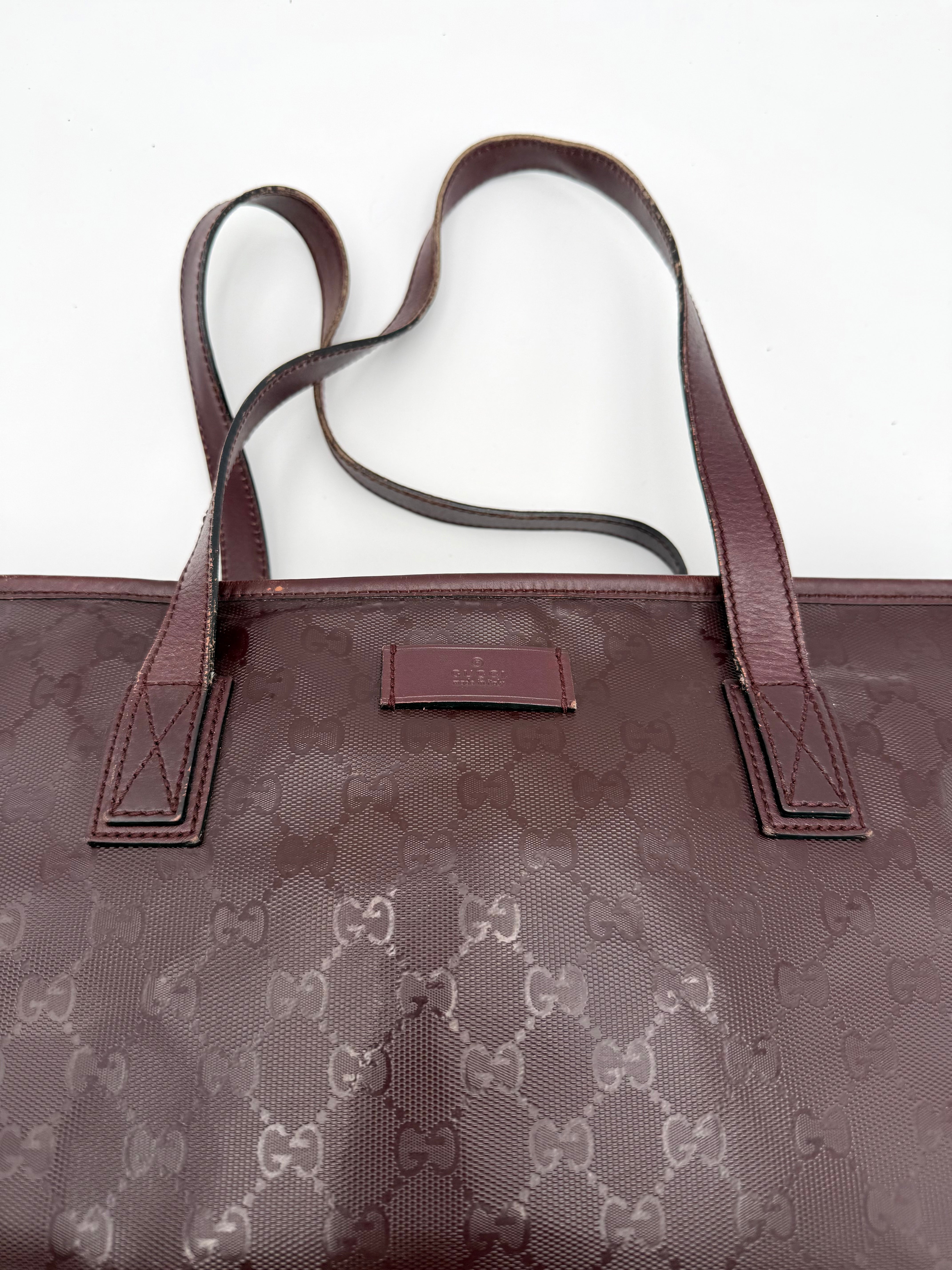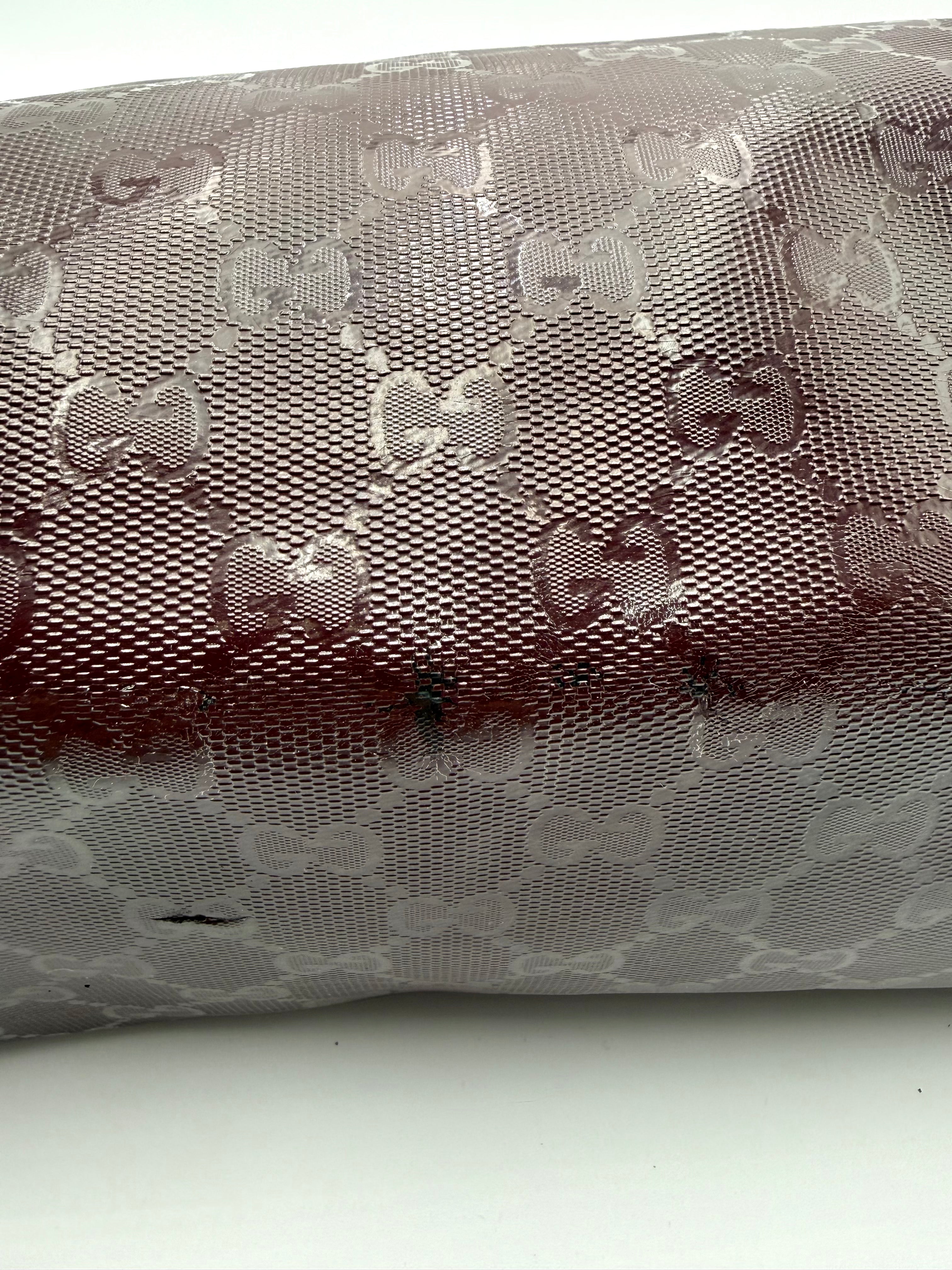 Tweedehands GUCCI tote bag in bordeaux PVC. De tas sluit met een rits en heeft één binnenvakje met rits en twee steekvakjes. Het item verkeert in een vintage staat, met algemene gebruikssporen. De tas wordt geleverd in onze mooie Moon flower dustbag.