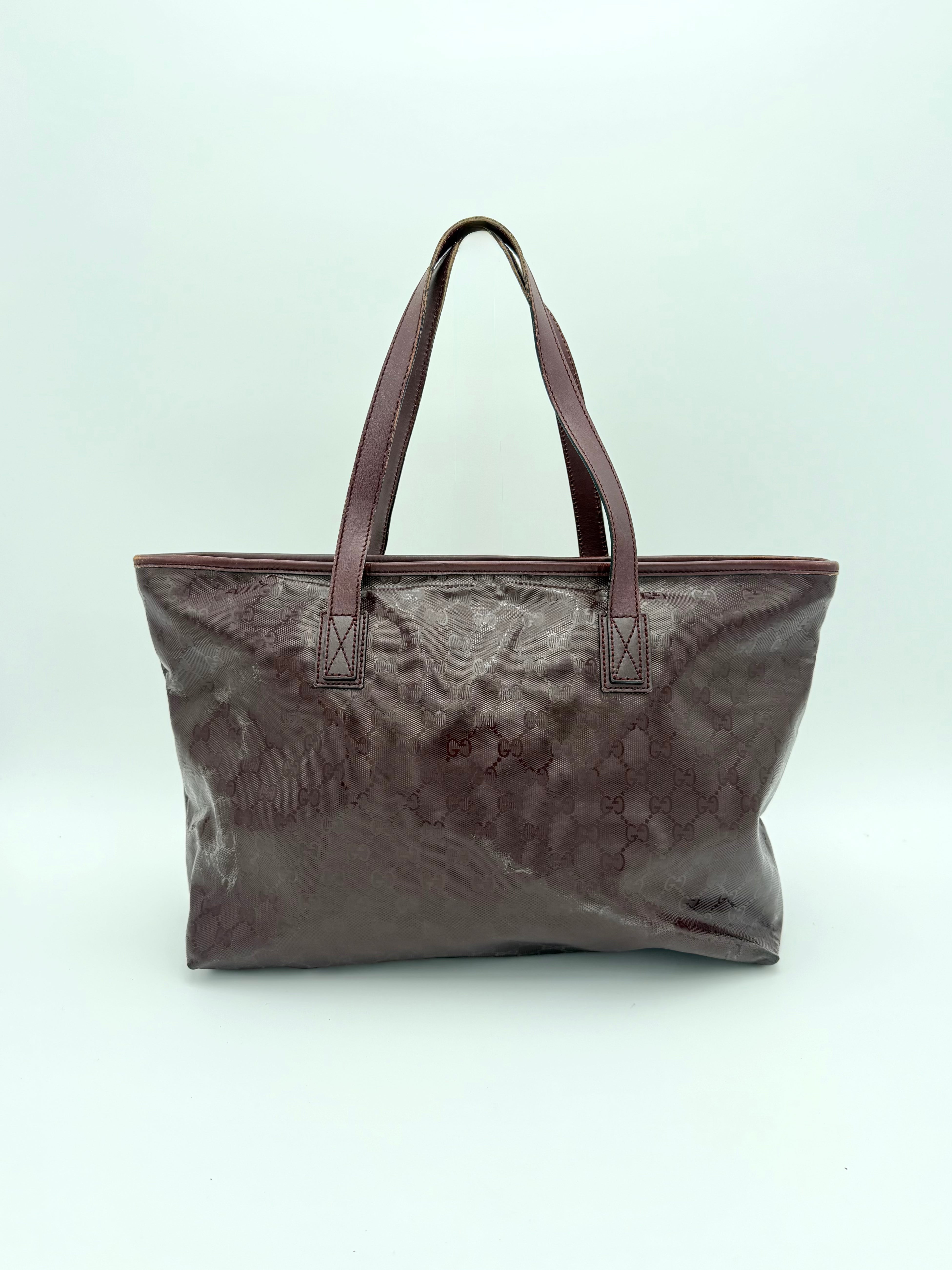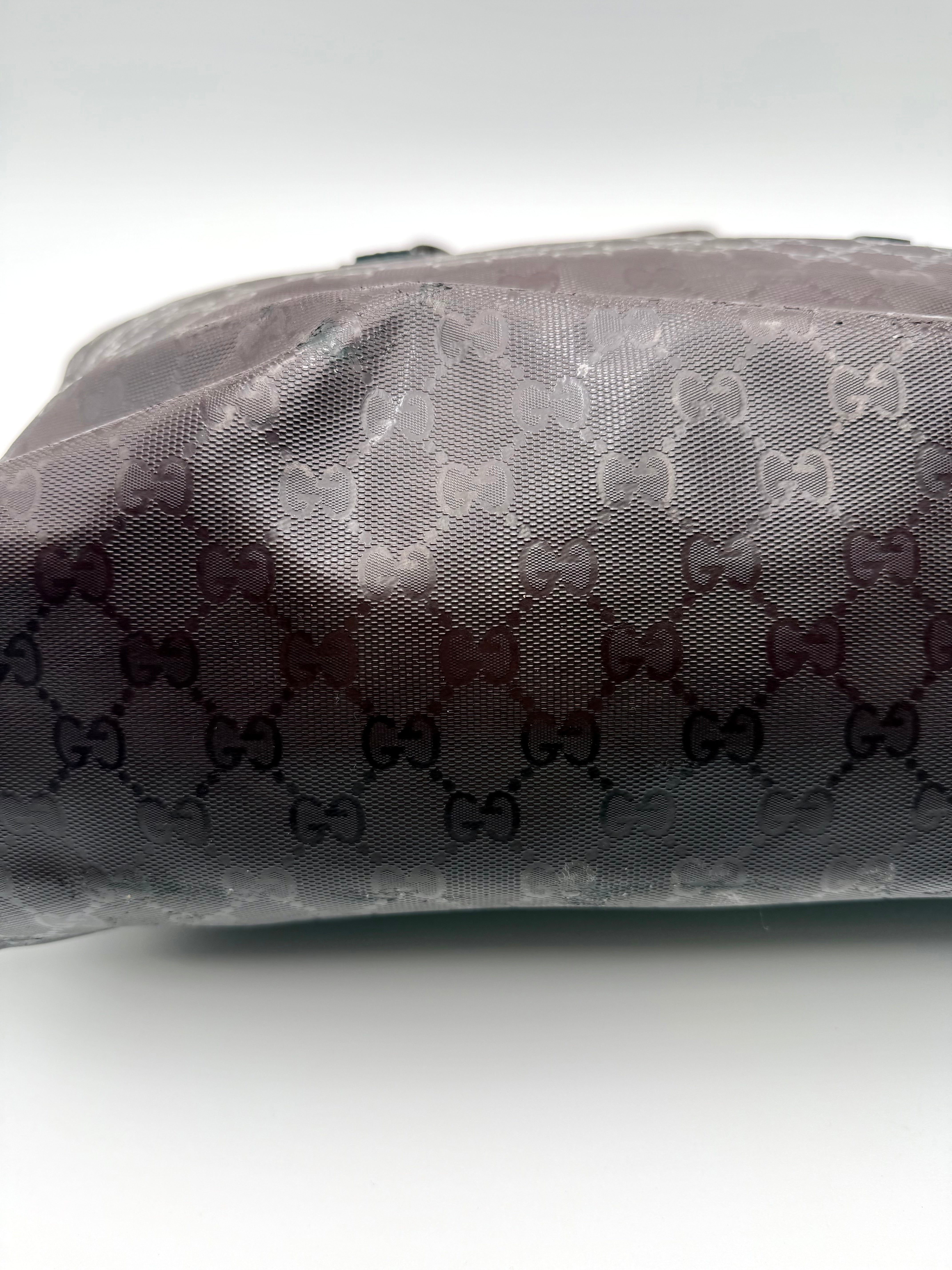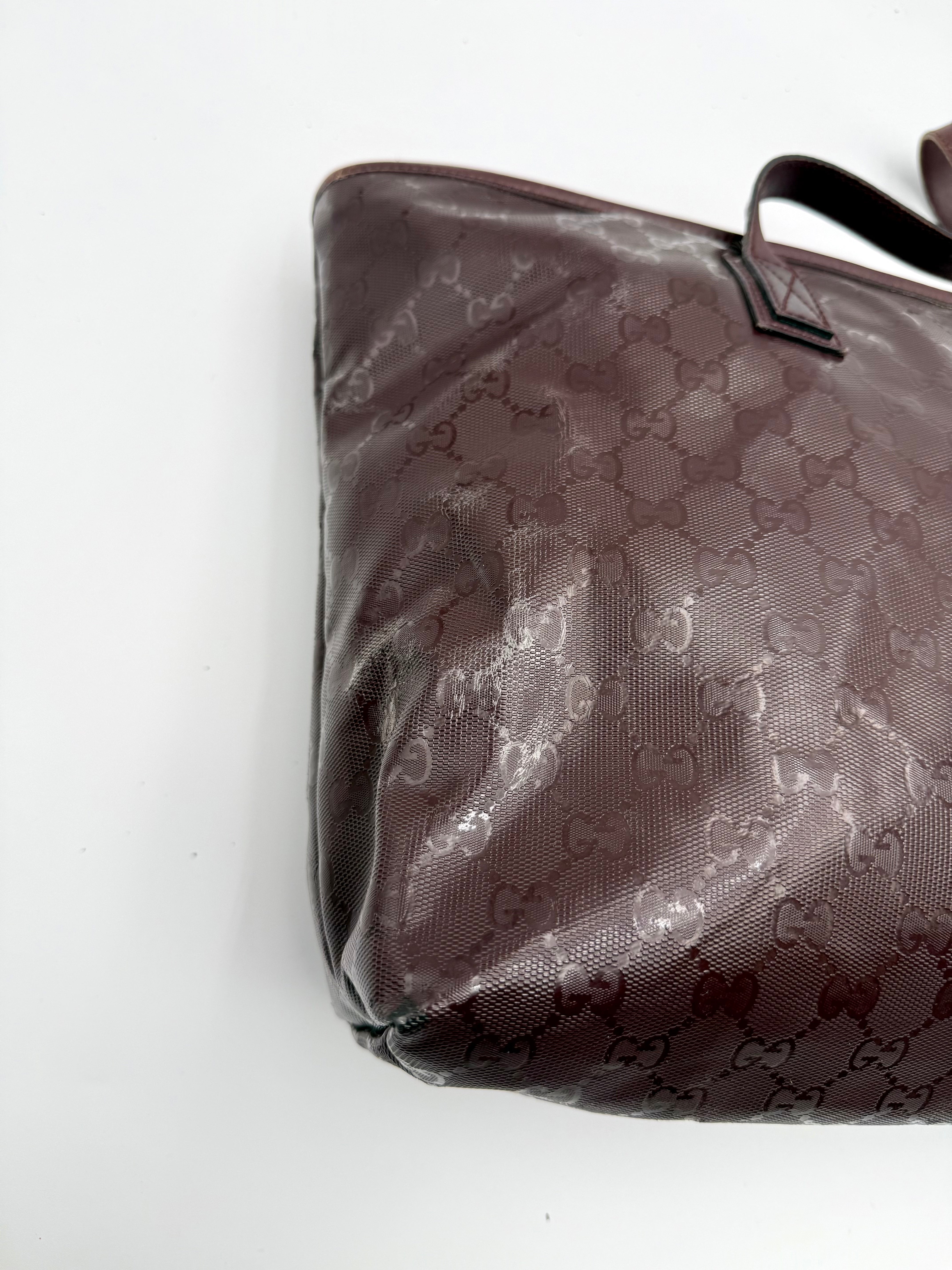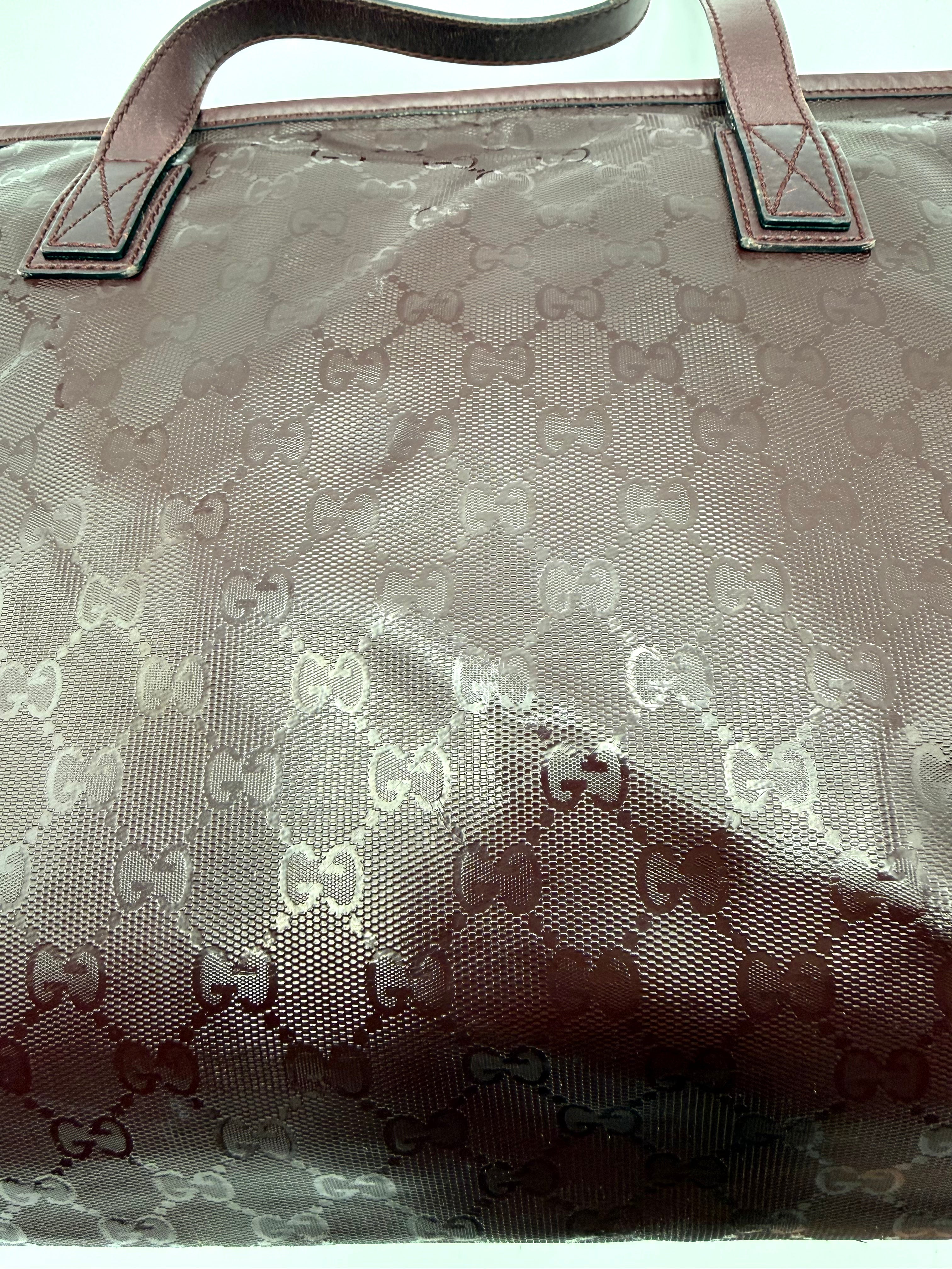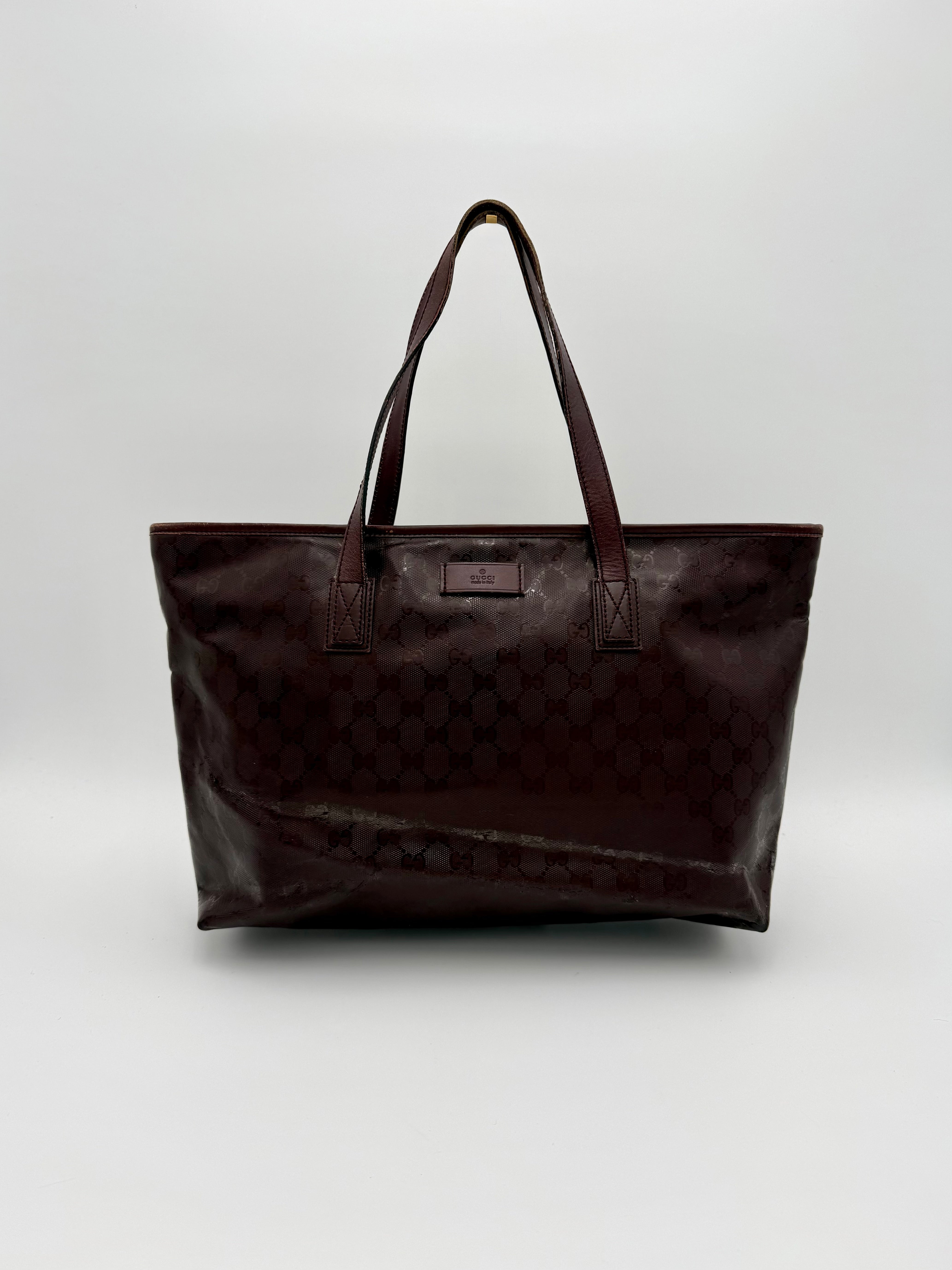 Tweedehands GUCCI tote bag in bordeaux PVC. De tas sluit met een rits en heeft één binnenvakje met rits en twee steekvakjes. Het item verkeert in een vintage staat, met algemene gebruikssporen. De tas wordt geleverd in onze mooie Moon flower dustbag.