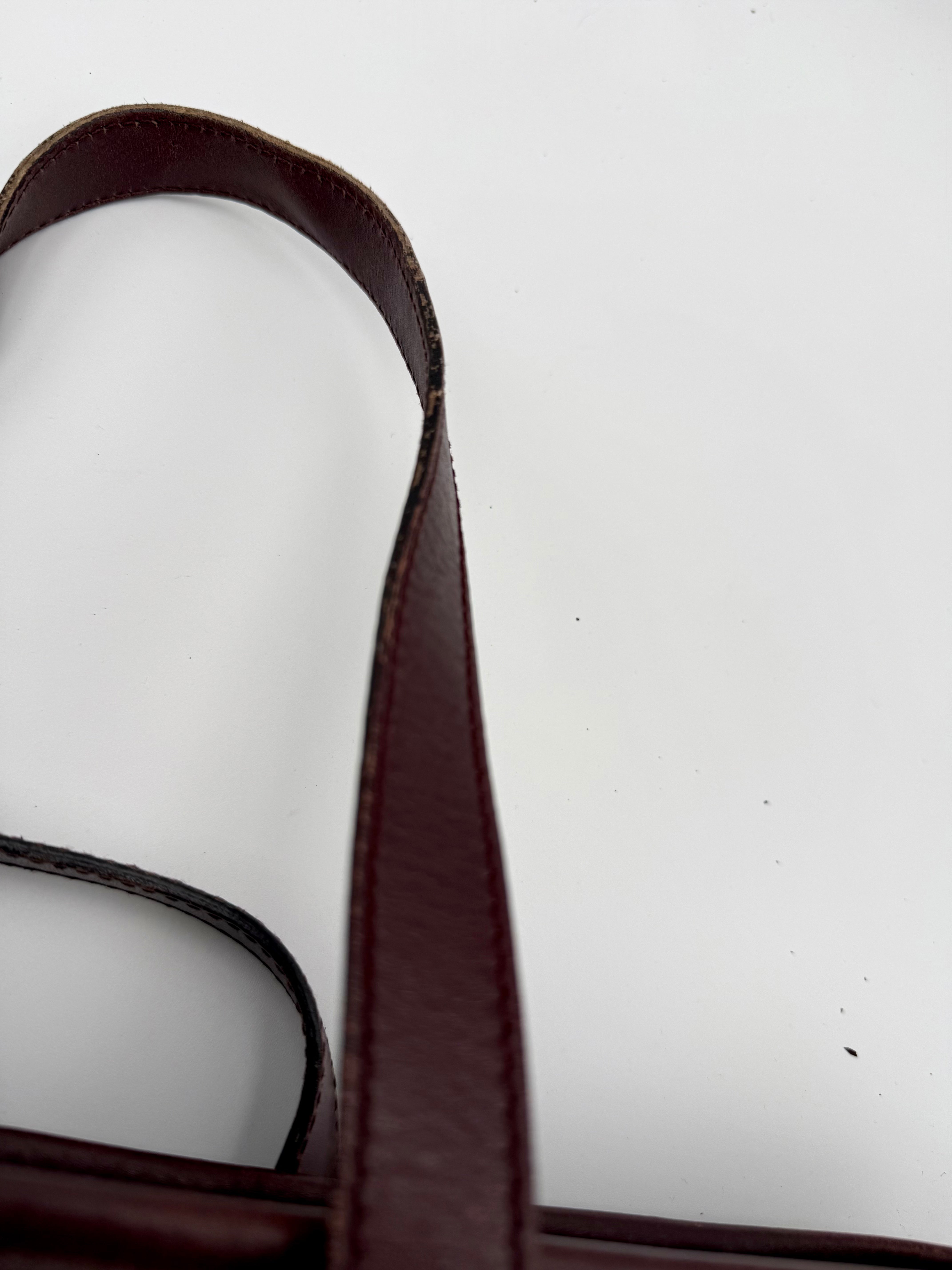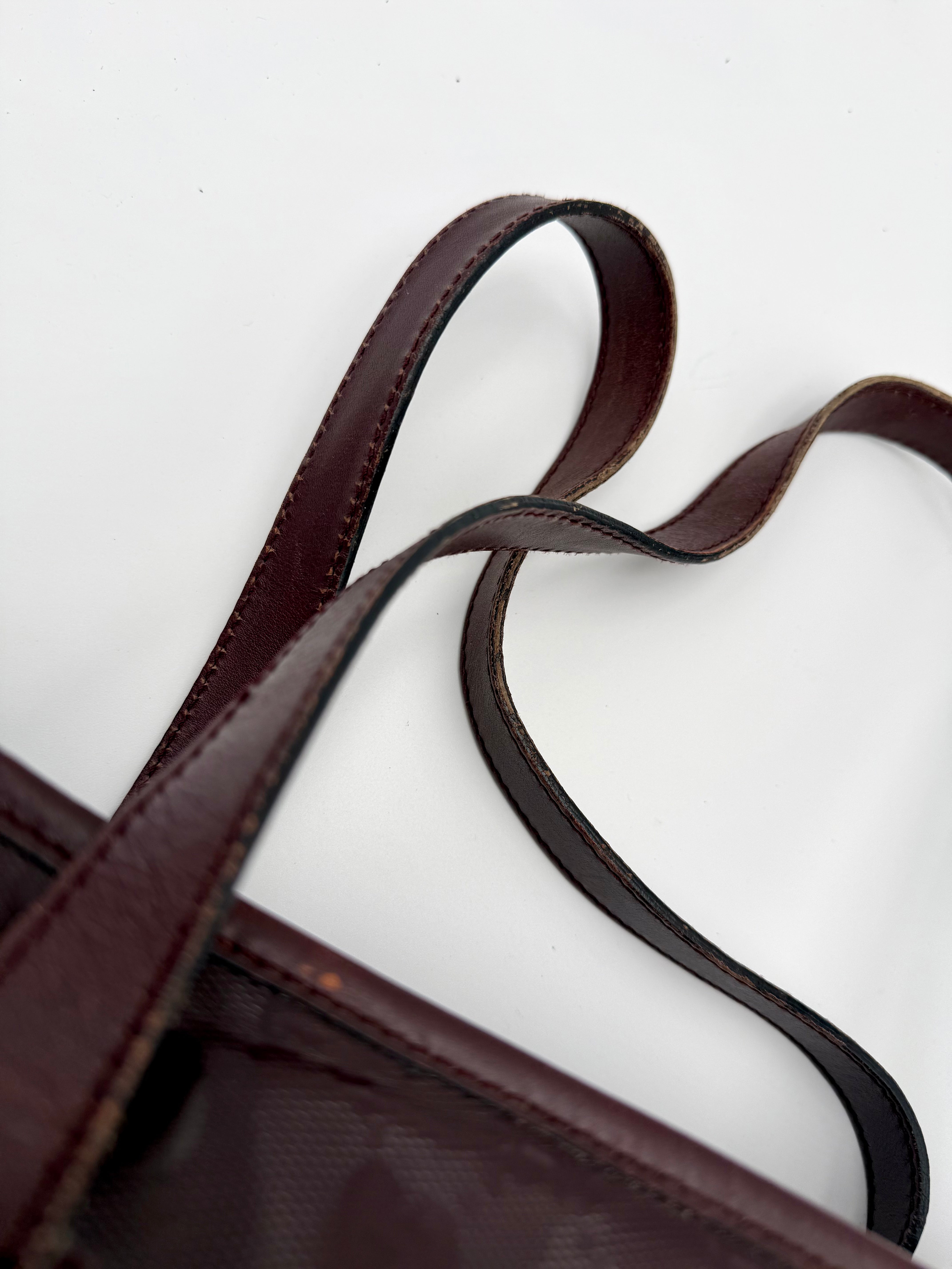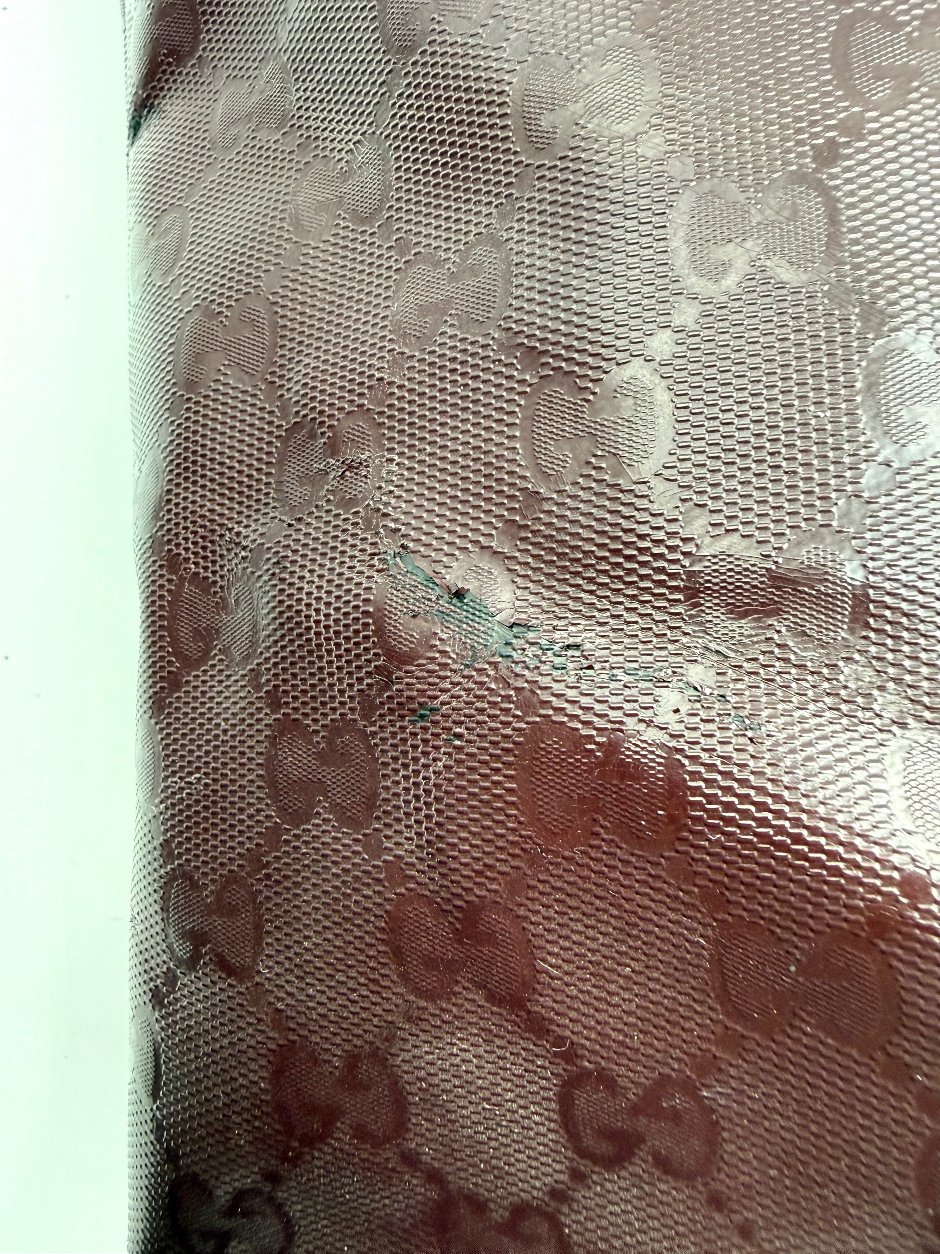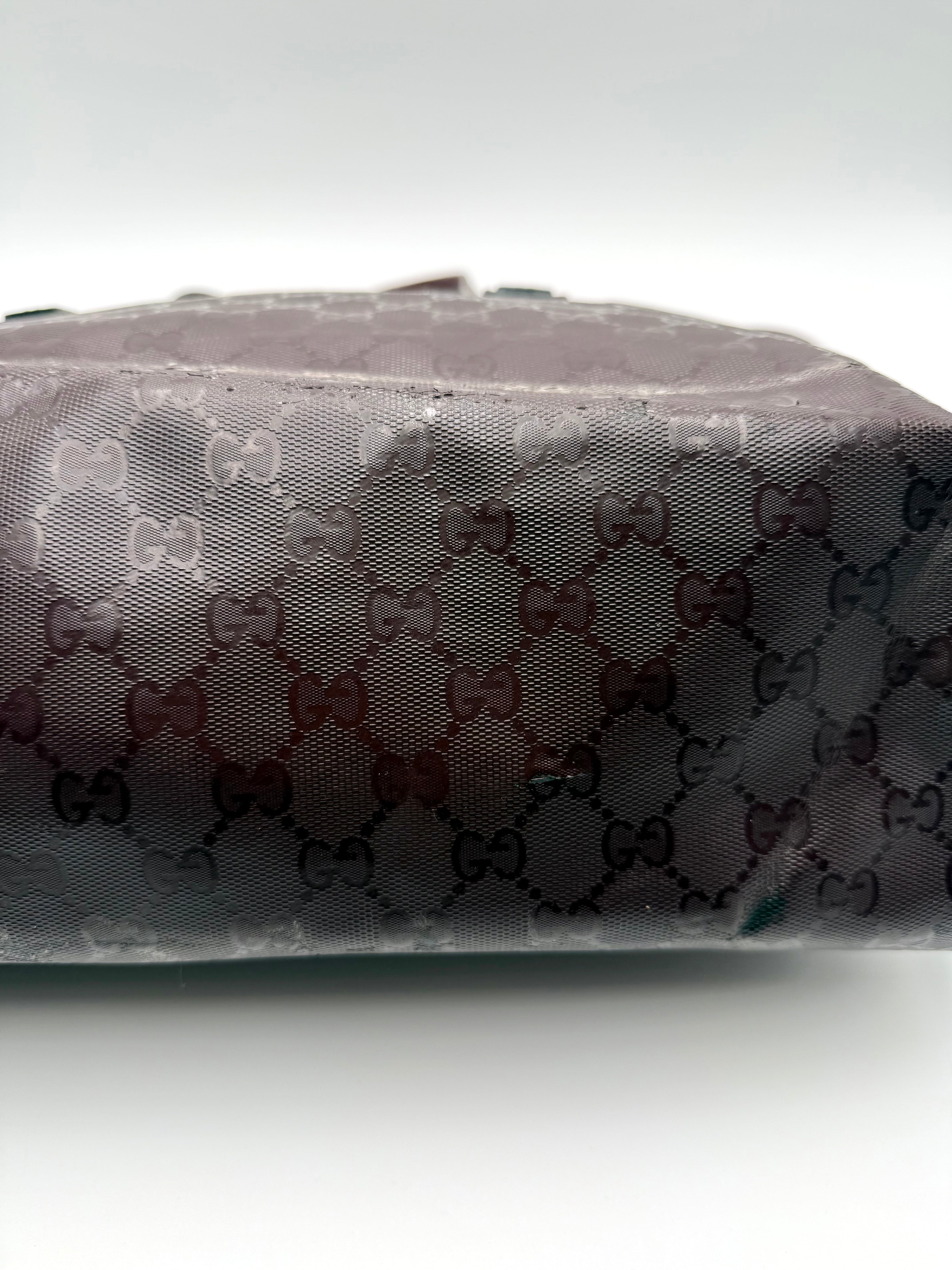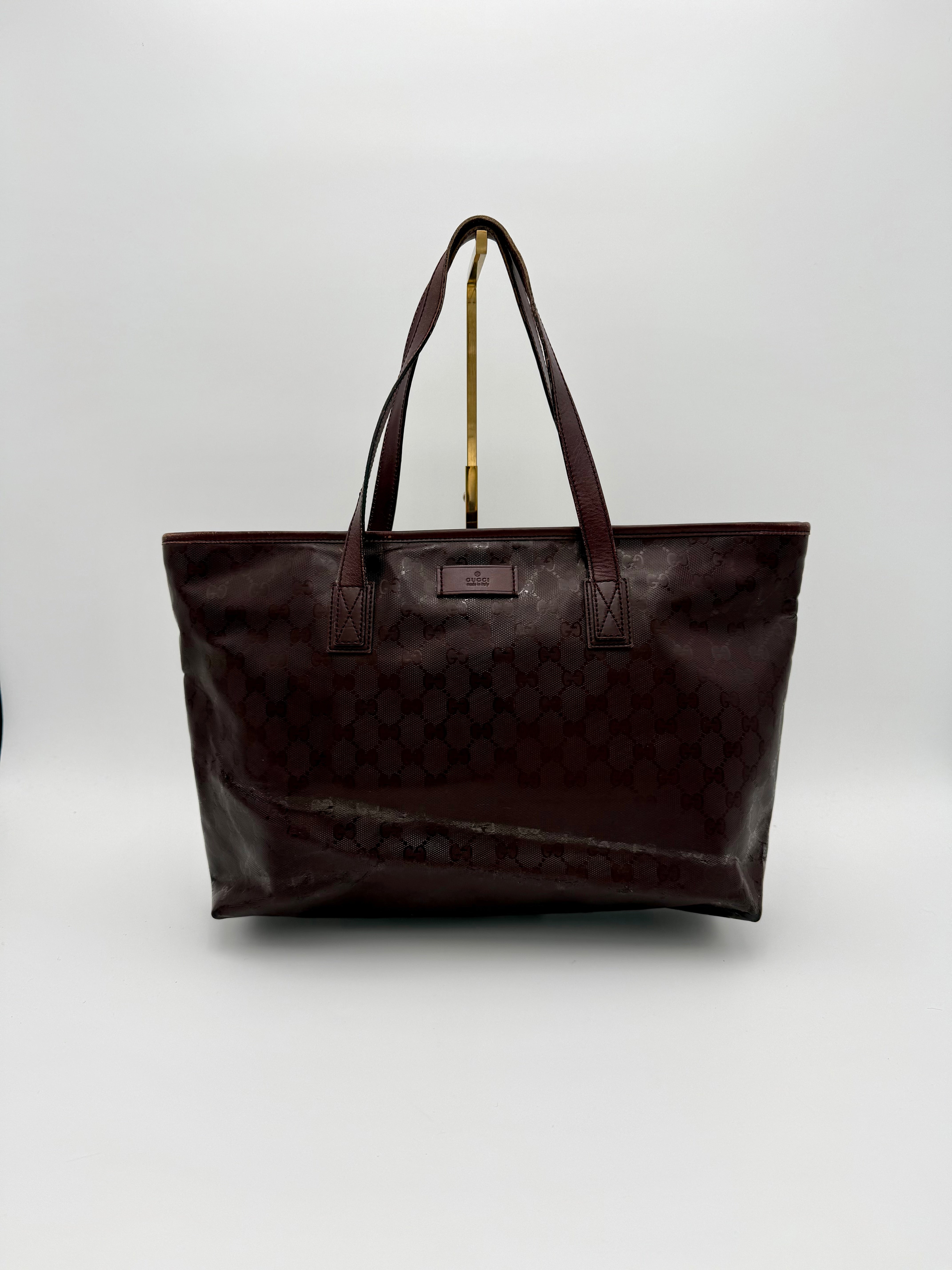 Tweedehands GUCCI tote bag in bordeaux PVC. De tas sluit met een rits en heeft één binnenvakje met rits en twee steekvakjes. Het item verkeert in een vintage staat, met algemene gebruikssporen. De tas wordt geleverd in onze mooie Moon flower dustbag.