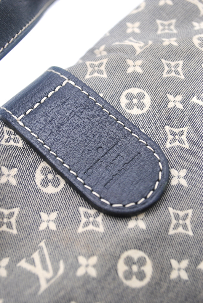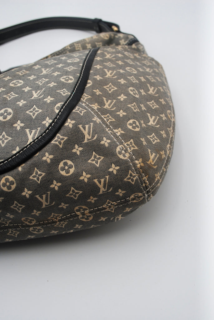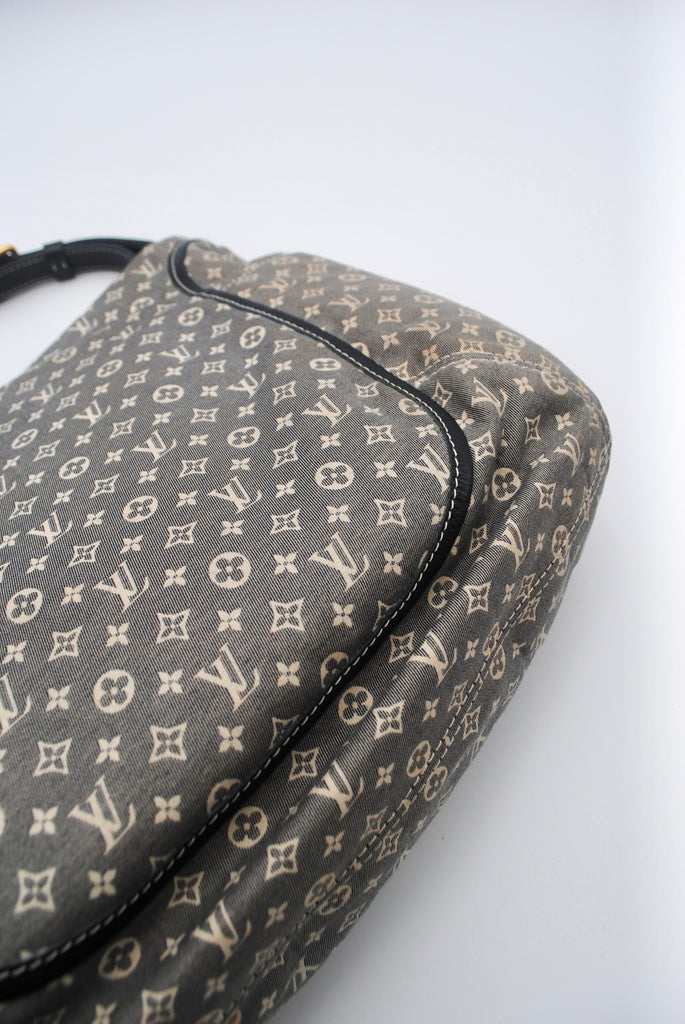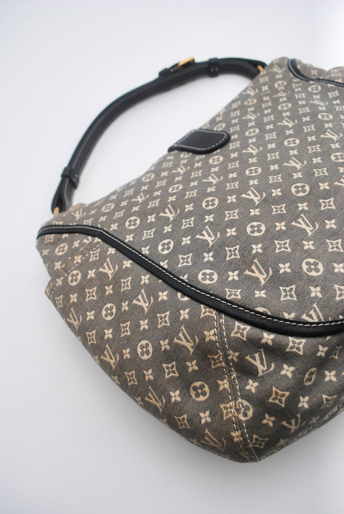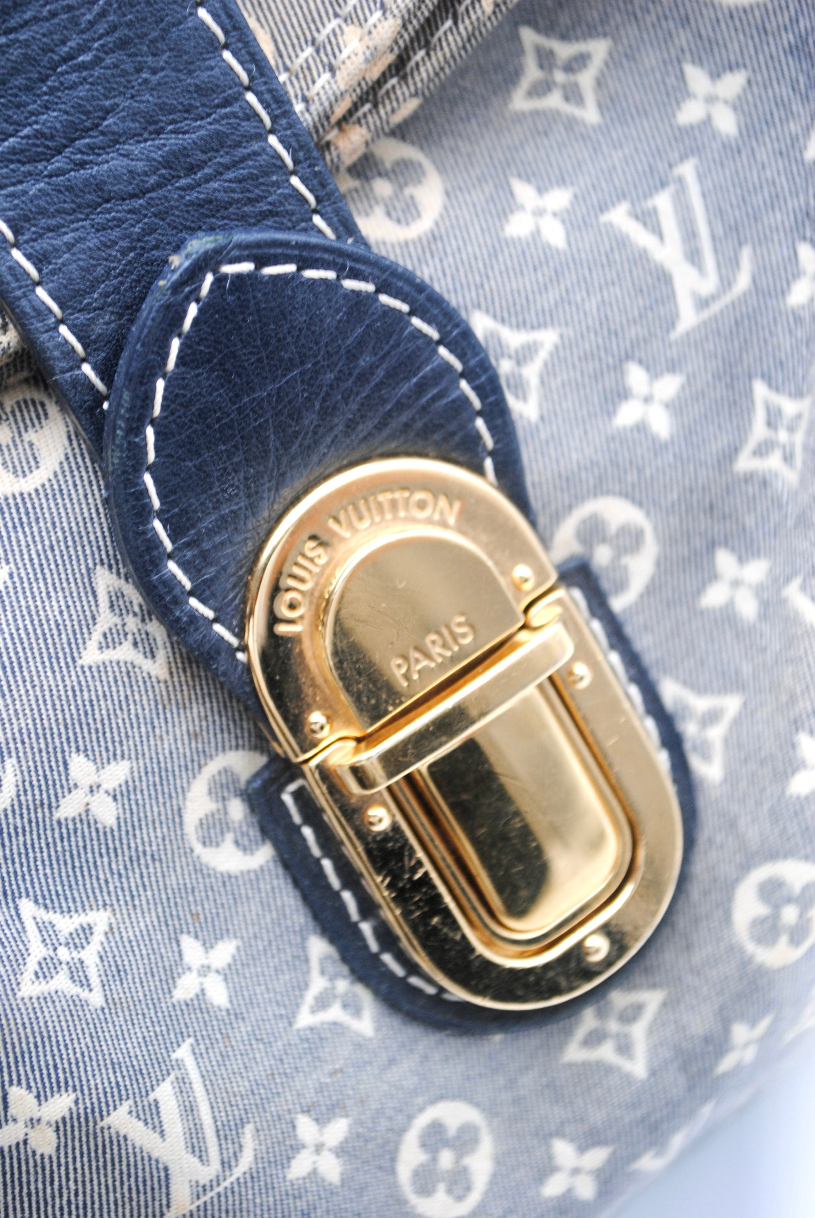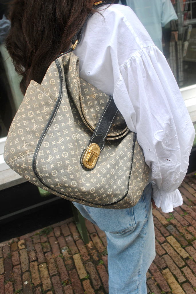Tweedehands LOUIS VUITTON Idylle romance bag in een mooie denim grijze stof en blauw leren hengsels met gouden hardware. De tas sluit met een gesp en beschikt over twee zijvakjes aan de buitenkant en twee binnenvakjes. Het item verkeert in een zeer goede vintage staat, met algemene gebruikssporen. De tas wordt geleverd in onze mooie Moon flower dustbag.