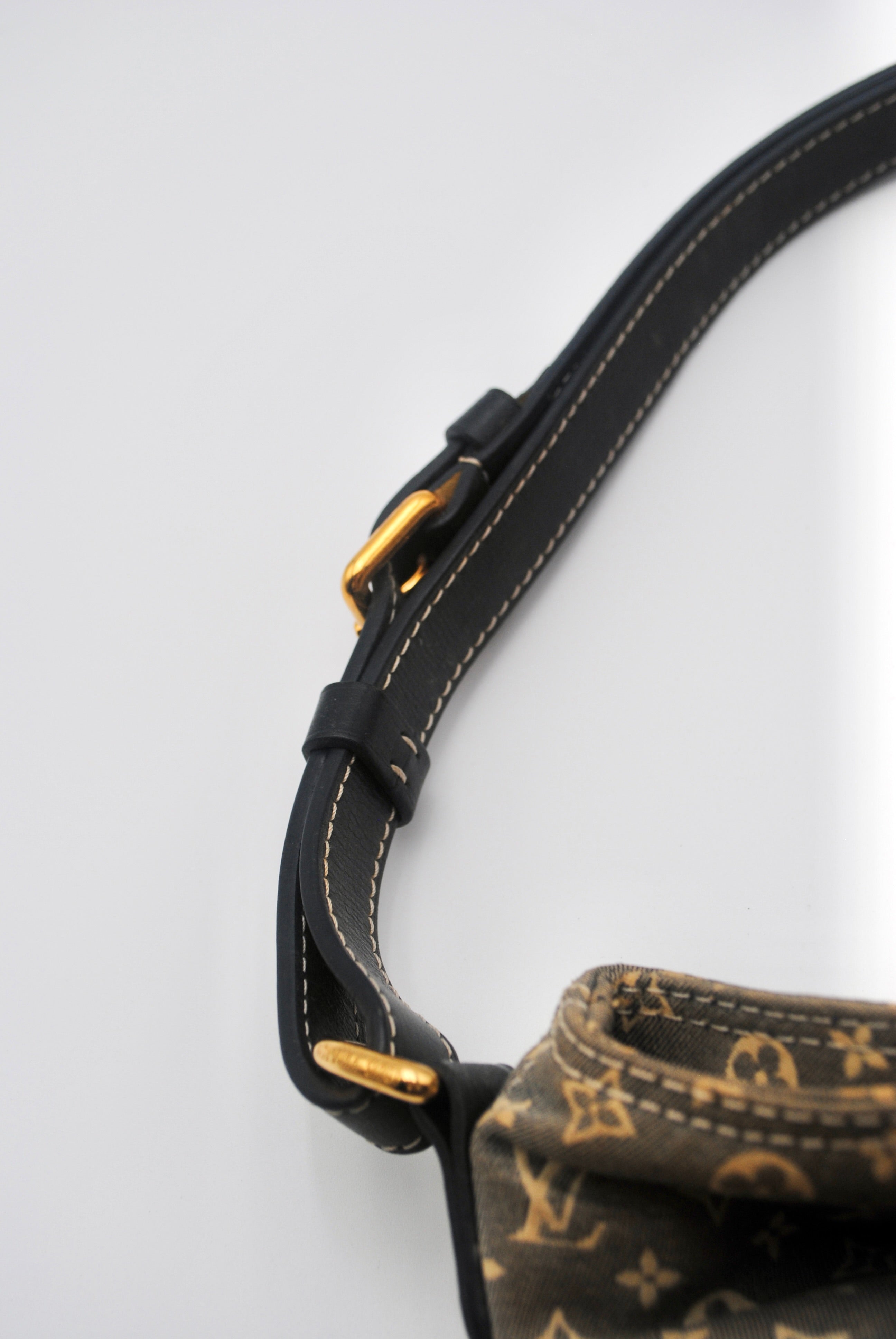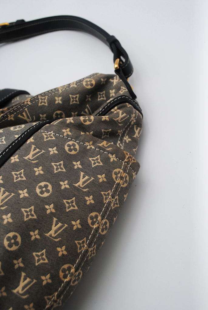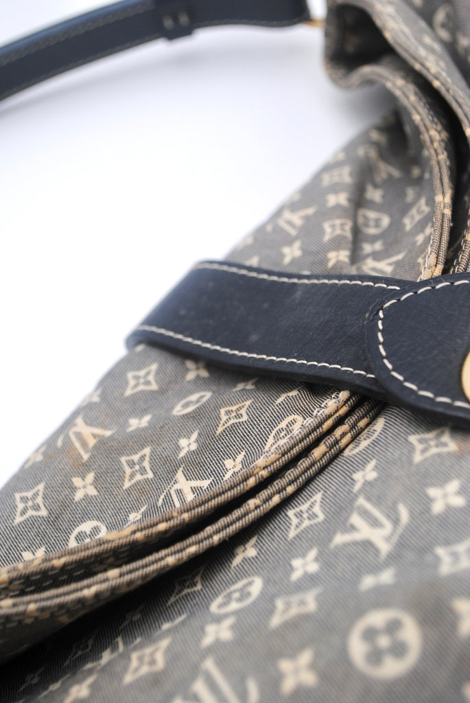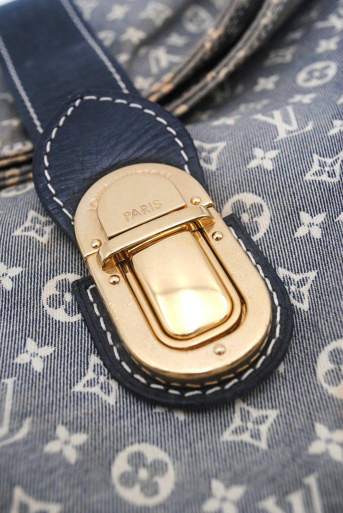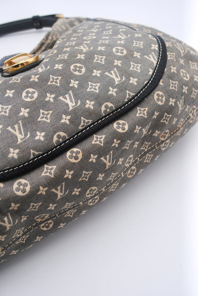 Tweedehands LOUIS VUITTON Idylle romance bag in een mooie denim grijze stof en blauw leren hengsels met gouden hardware. De tas sluit met een gesp en beschikt over twee zijvakjes aan de buitenkant en twee binnenvakjes. Het item verkeert in een zeer goede vintage staat, met algemene gebruikssporen. De tas wordt geleverd in onze mooie Moon flower dustbag.