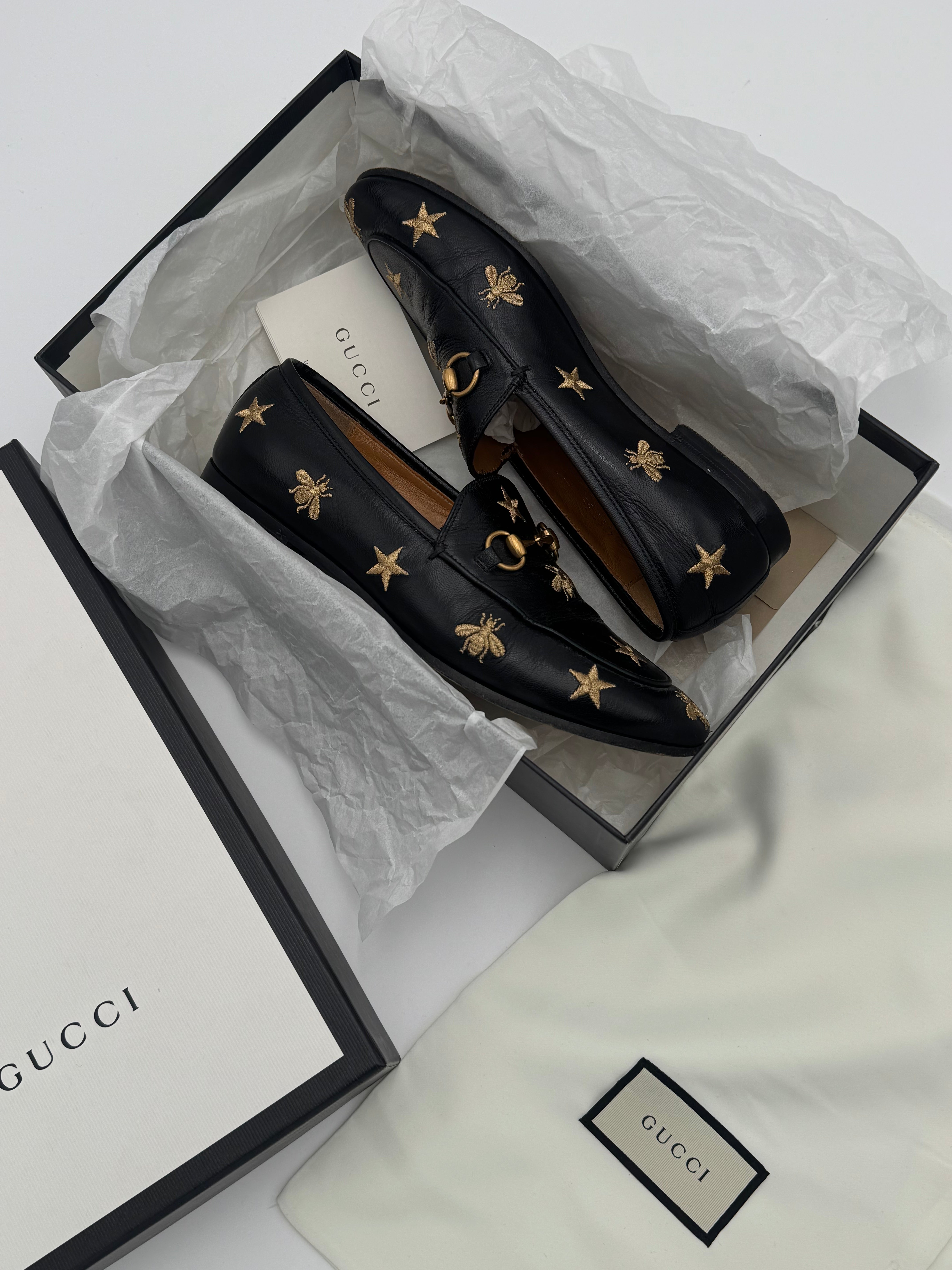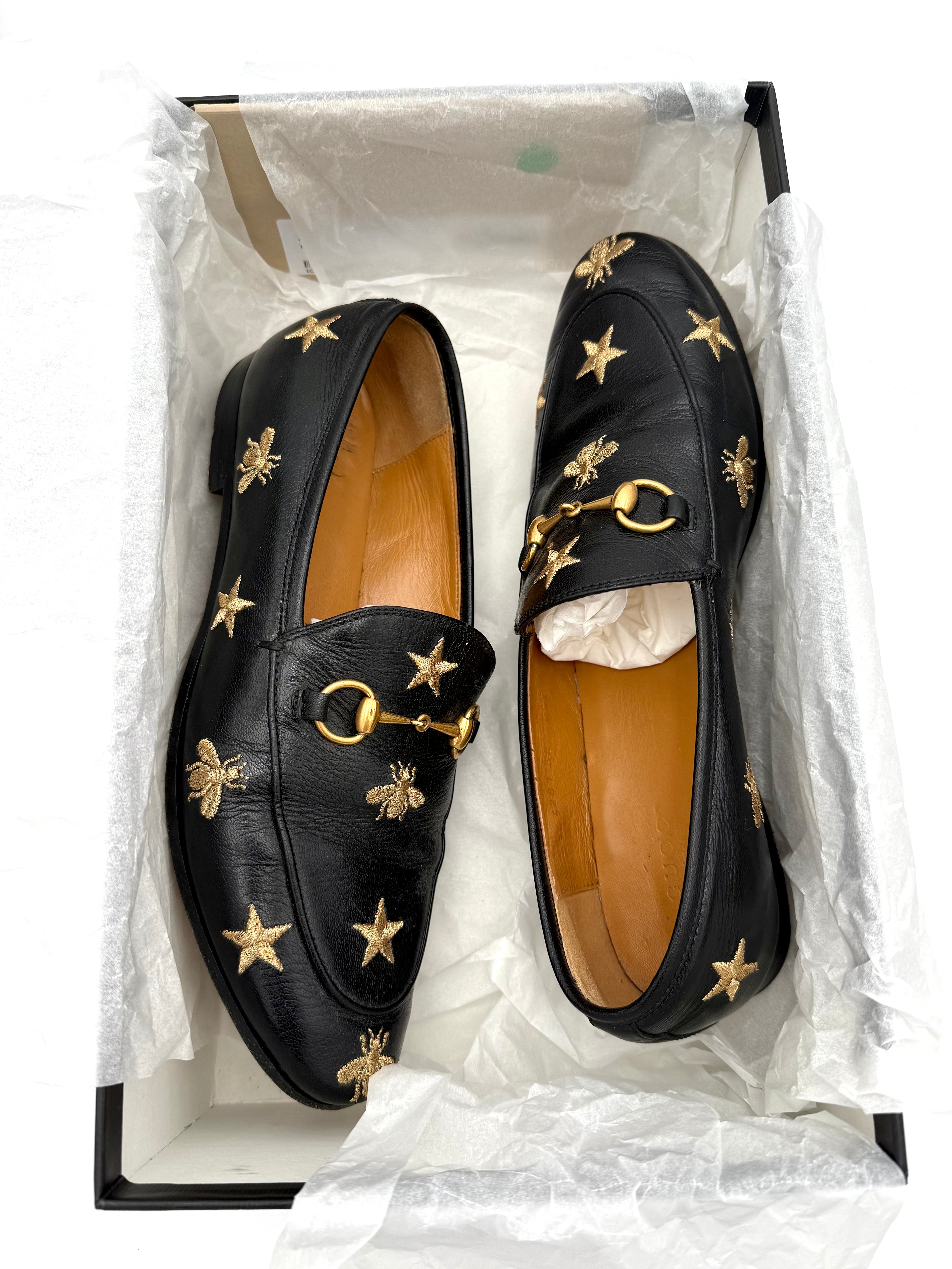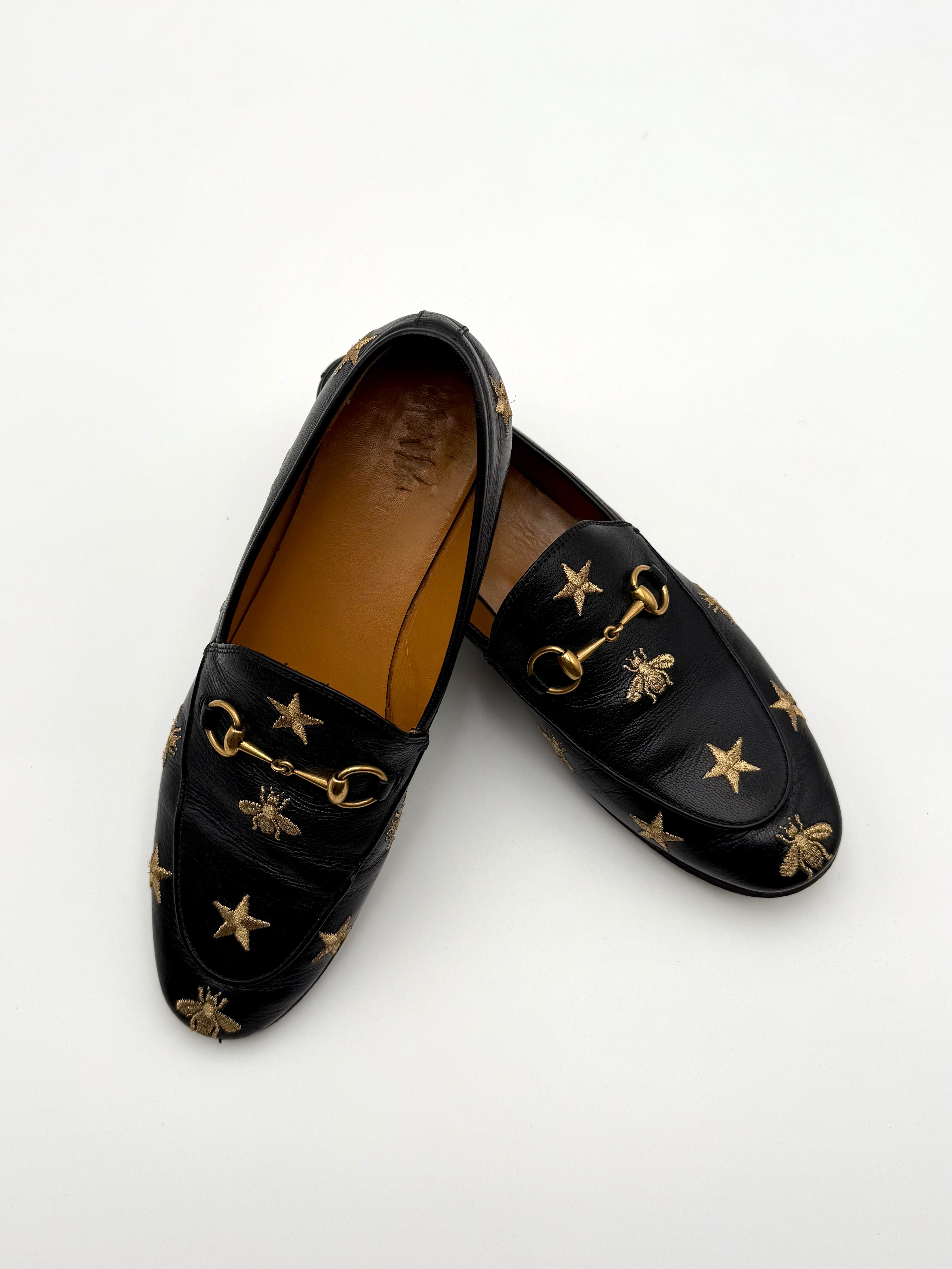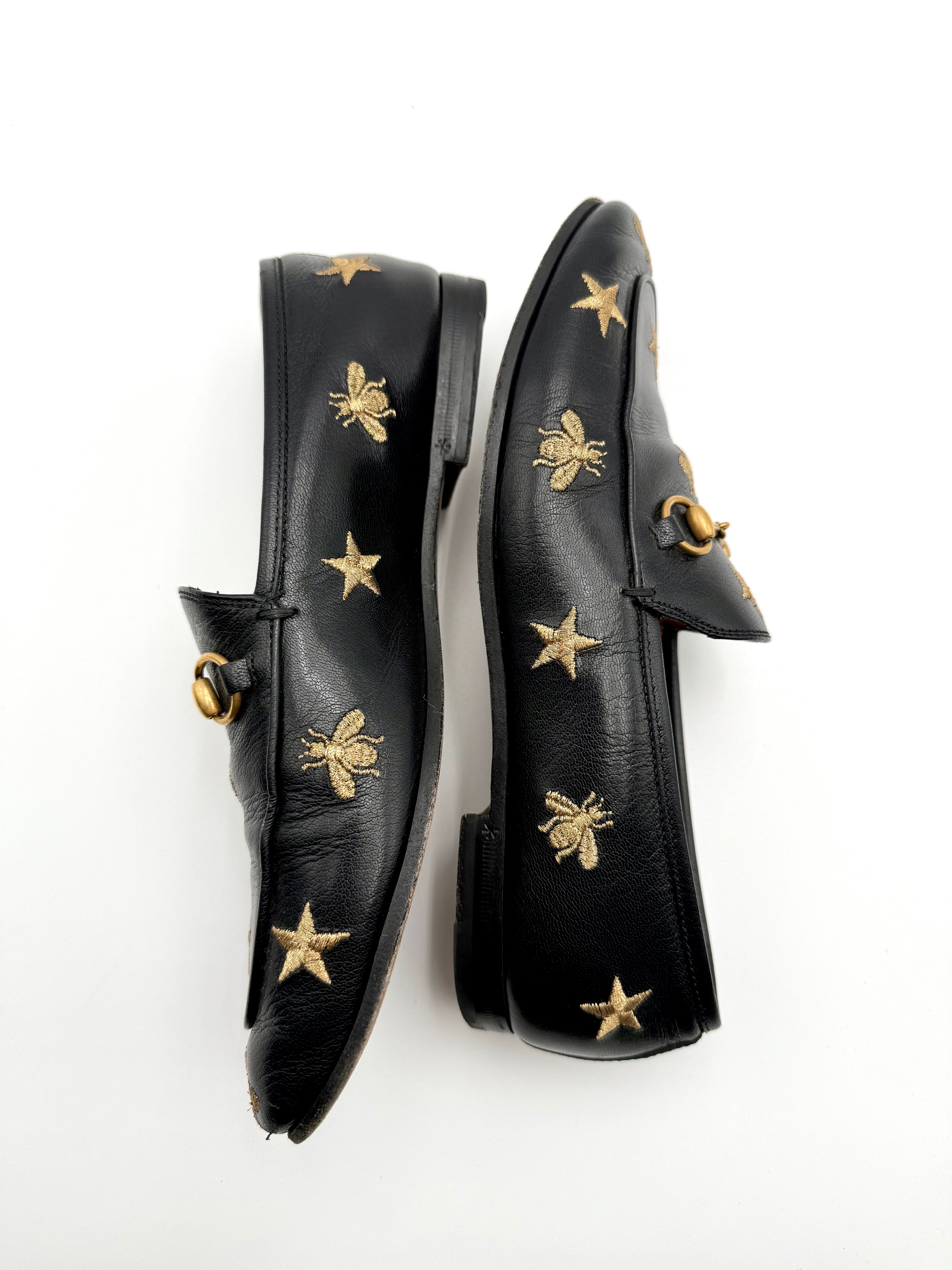 Pre-loved GUCCI horsebit loafers van zwart kalfsleer en gouden borduursels van bijtjes en sterren.