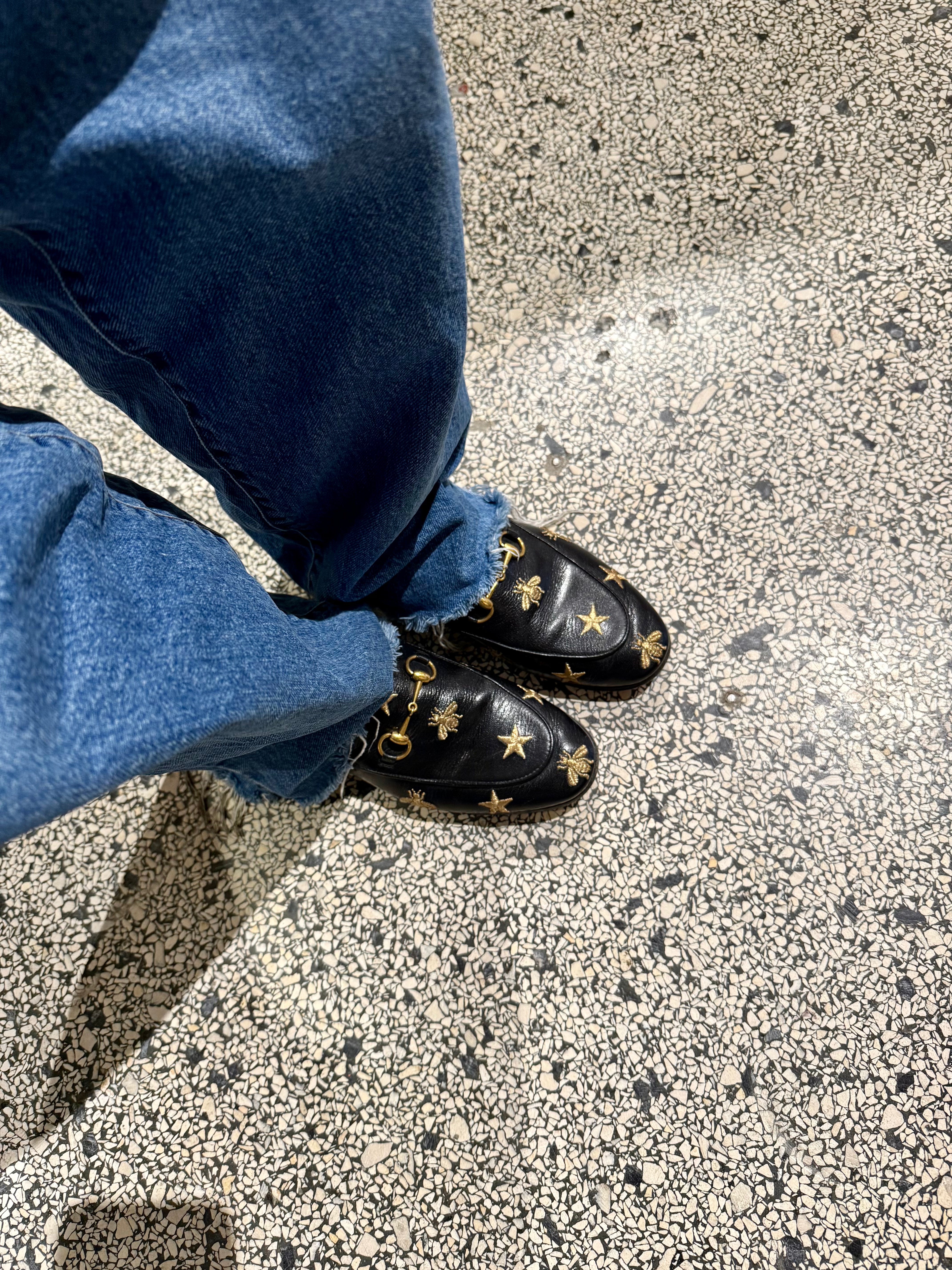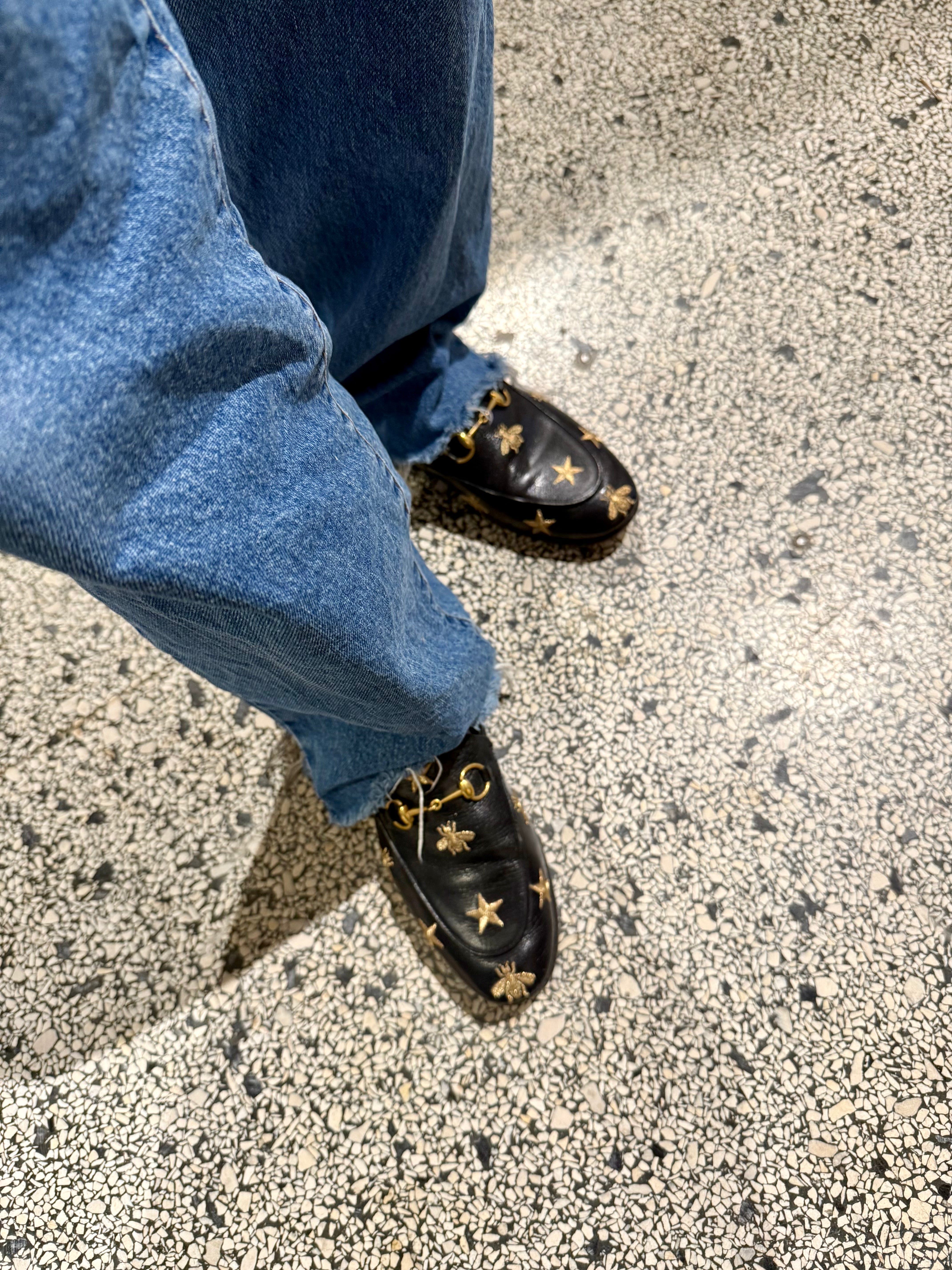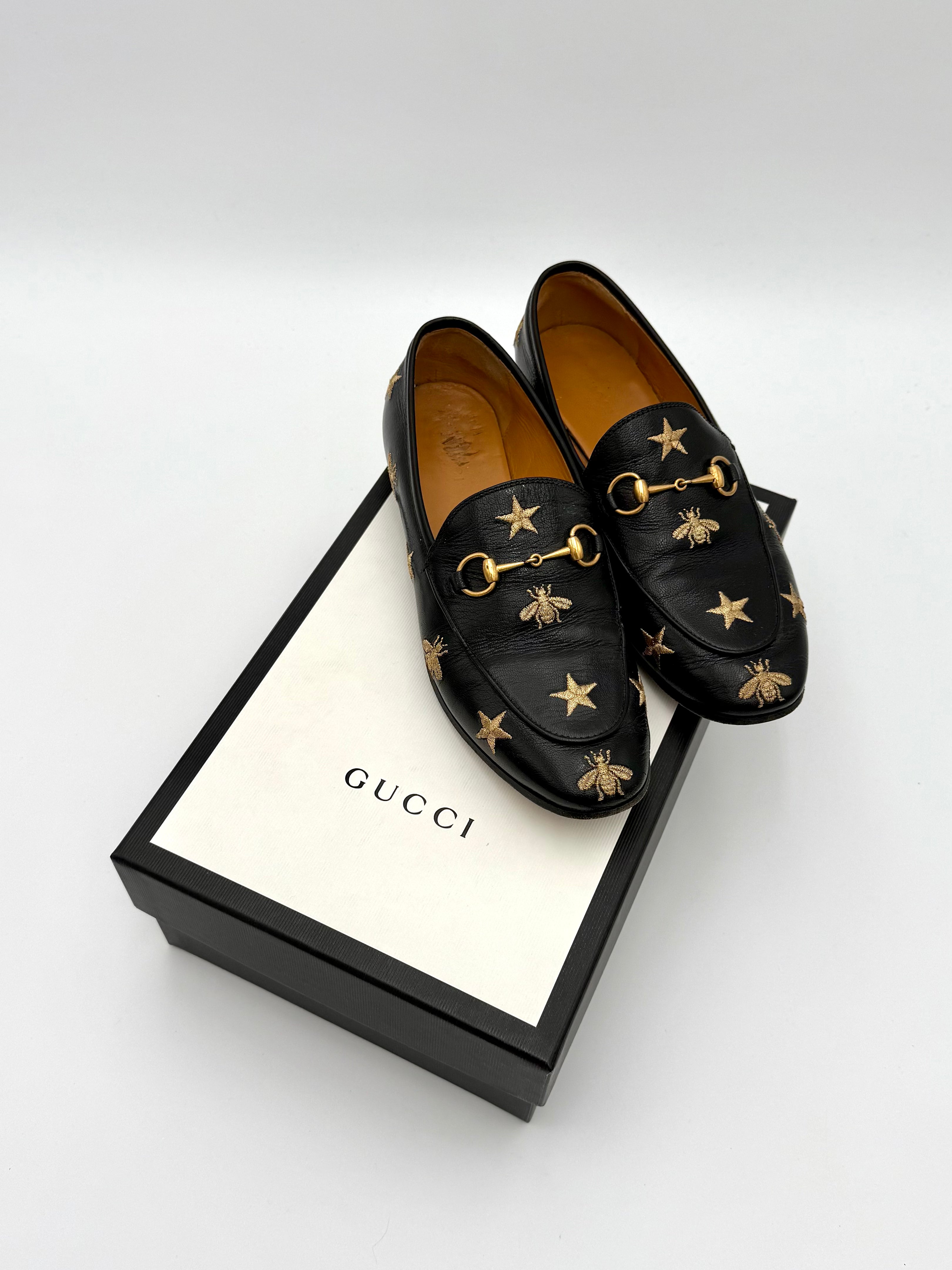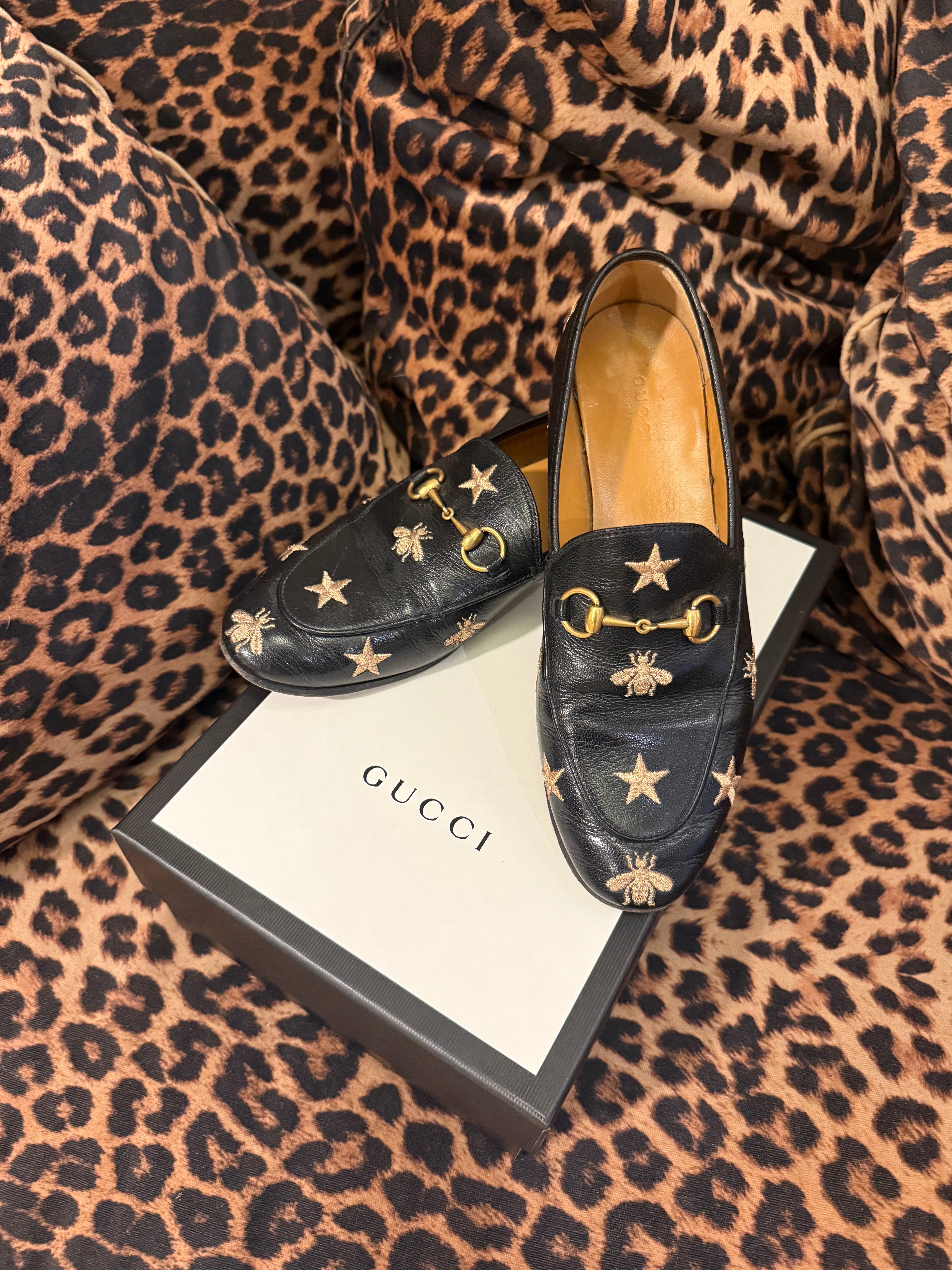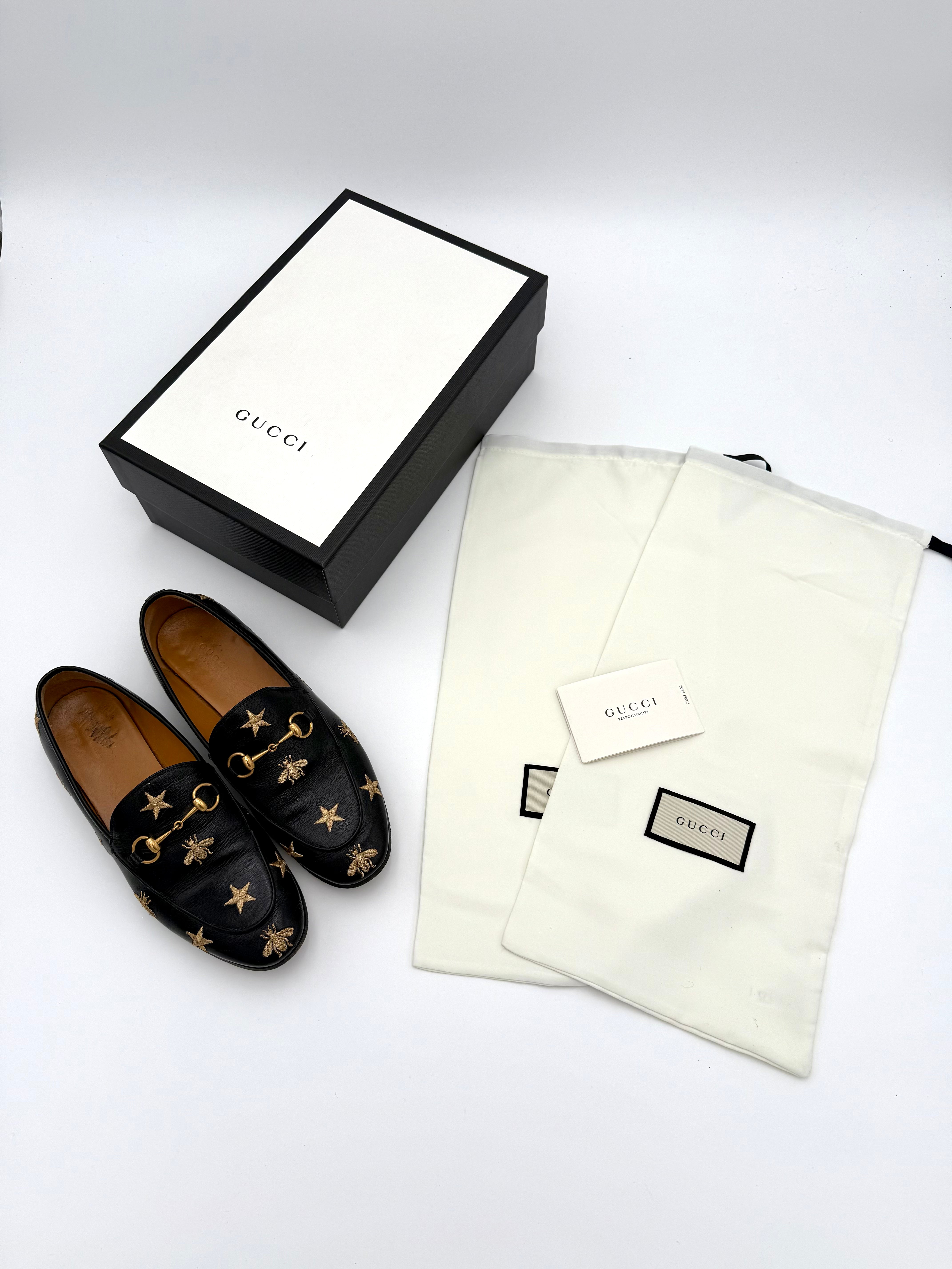 Pre-loved GUCCI horsebit loafers van zwart kalfsleer en gouden borduursels van bijtjes en sterren.