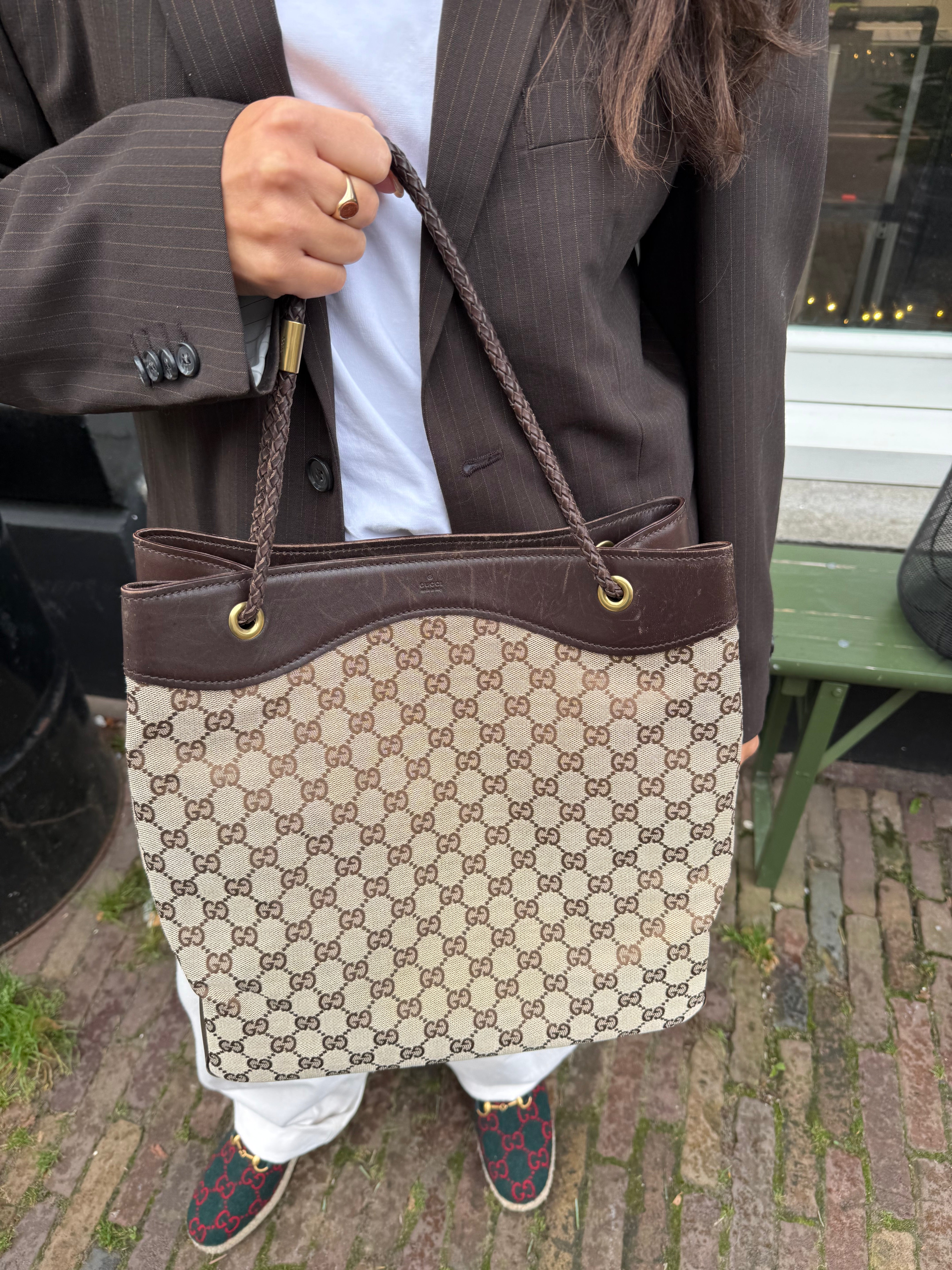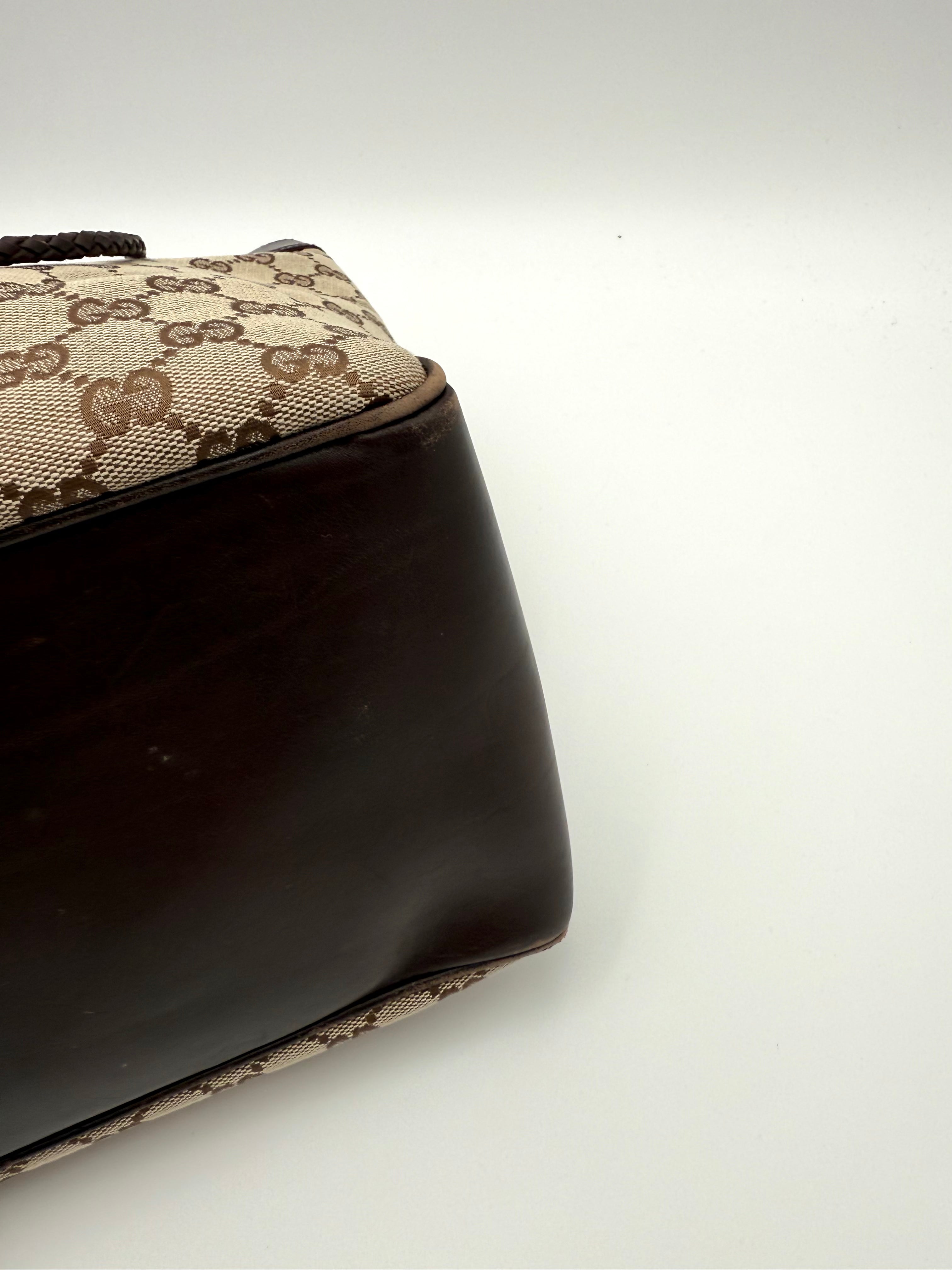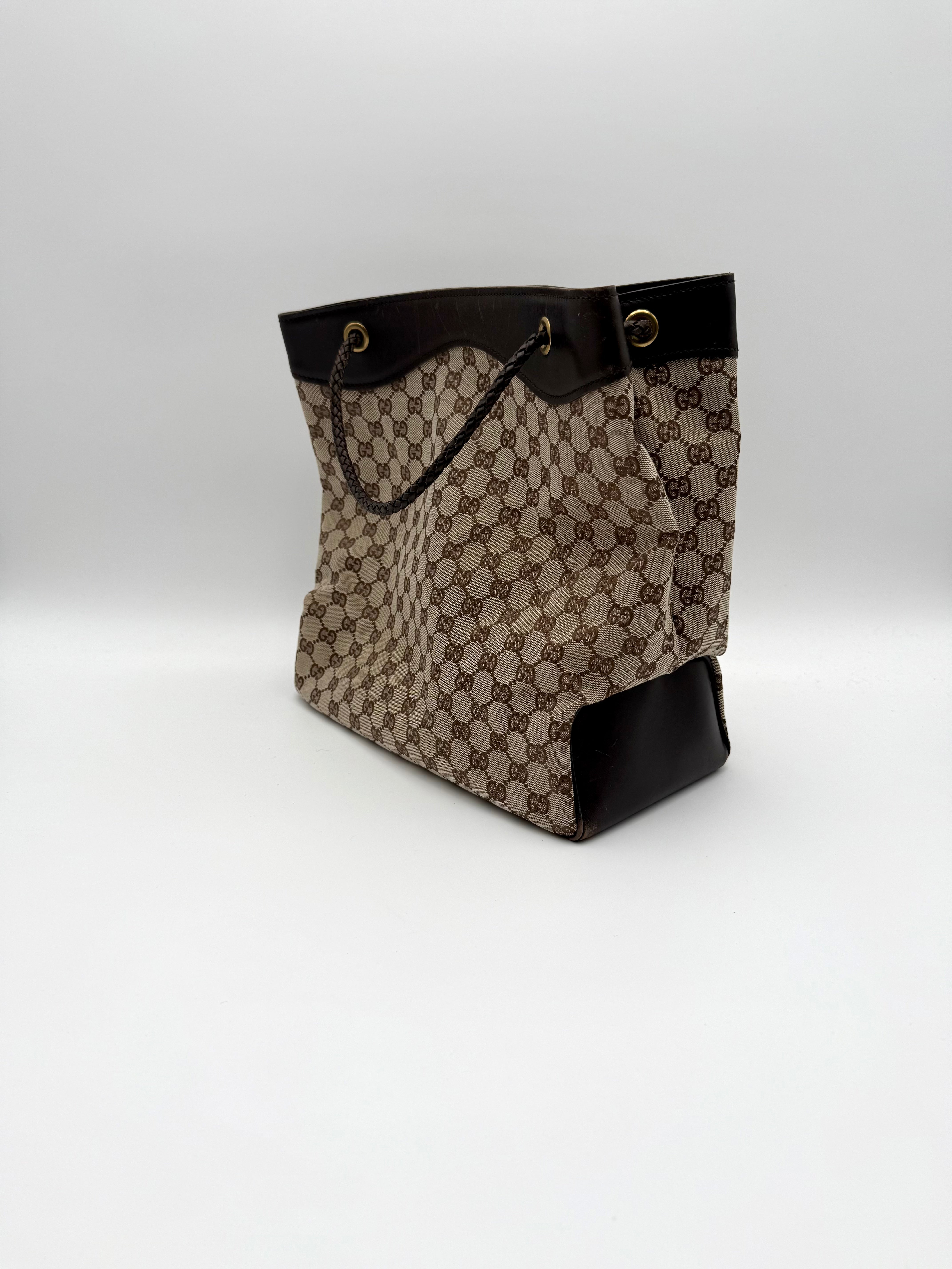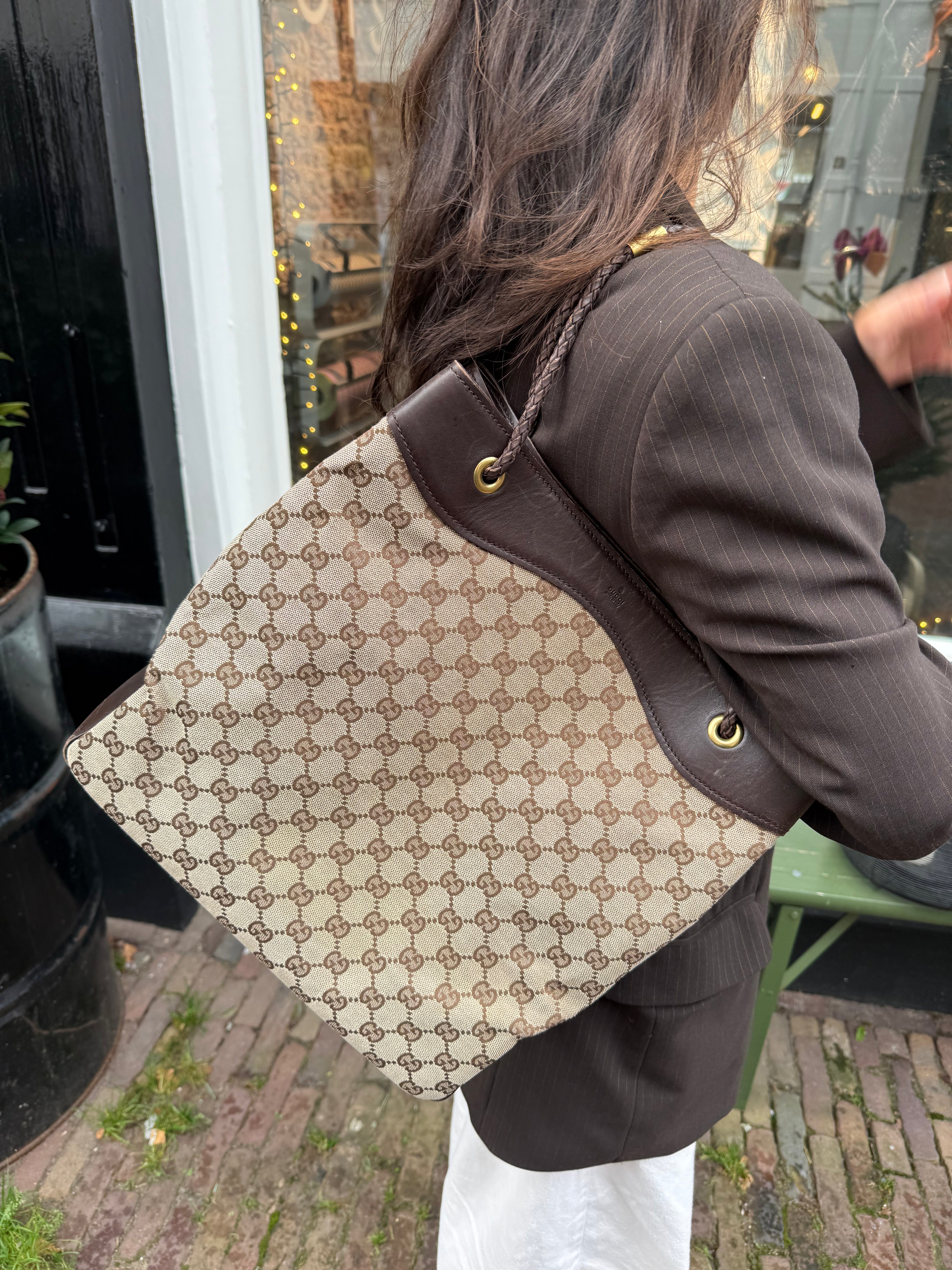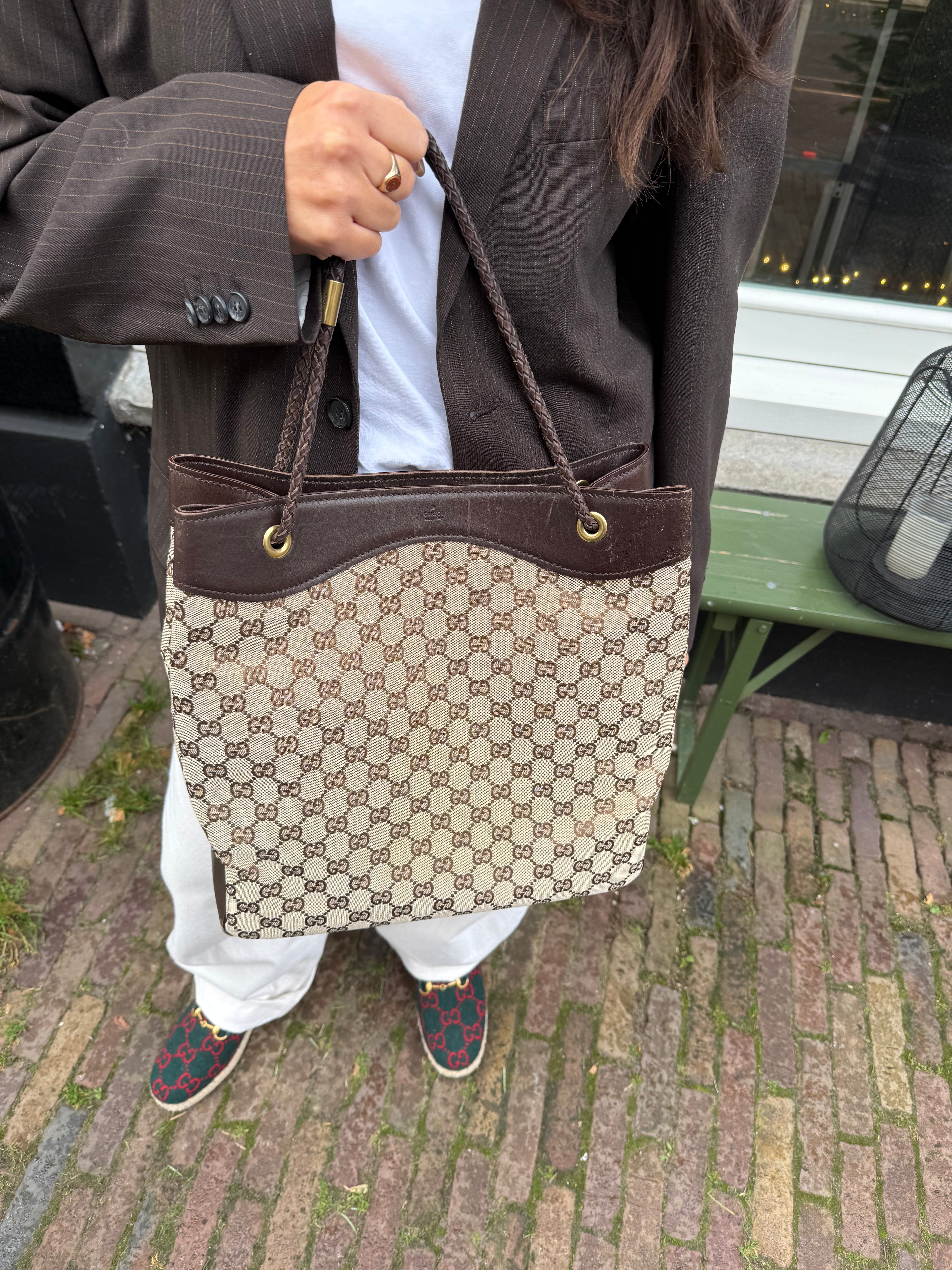 Tweedehands GUCCI canvas bag in een beige met bruine kleur. De tas is van canvas met leren hengsels en met gouden hardware. De tas beschikt over een binnenvak met rits. Het item verkeert in een zeer goede vintage staat, met algemene gebruikssporen. De tas wordt geleverd in onze mooie Moon flower dustbag.