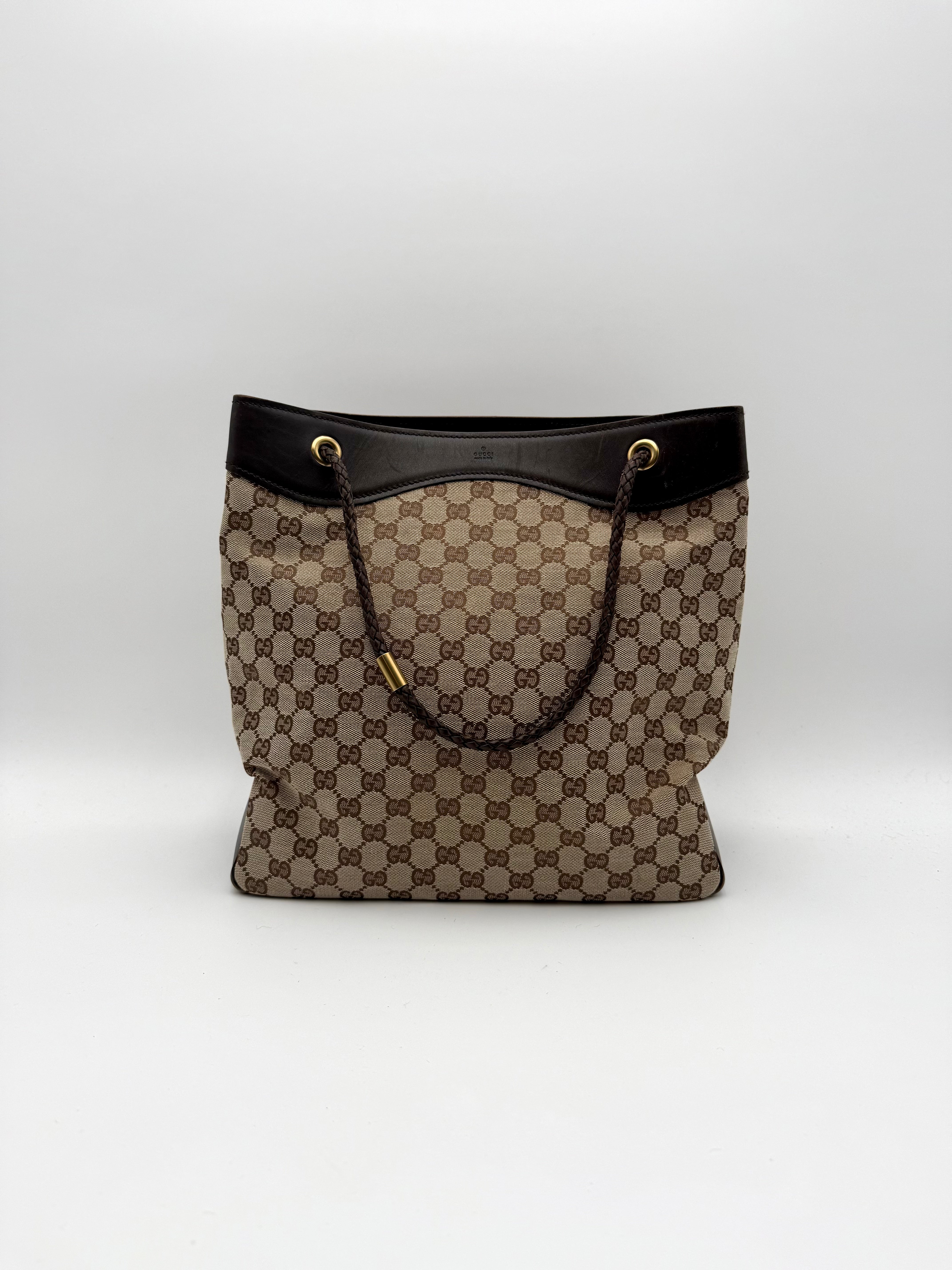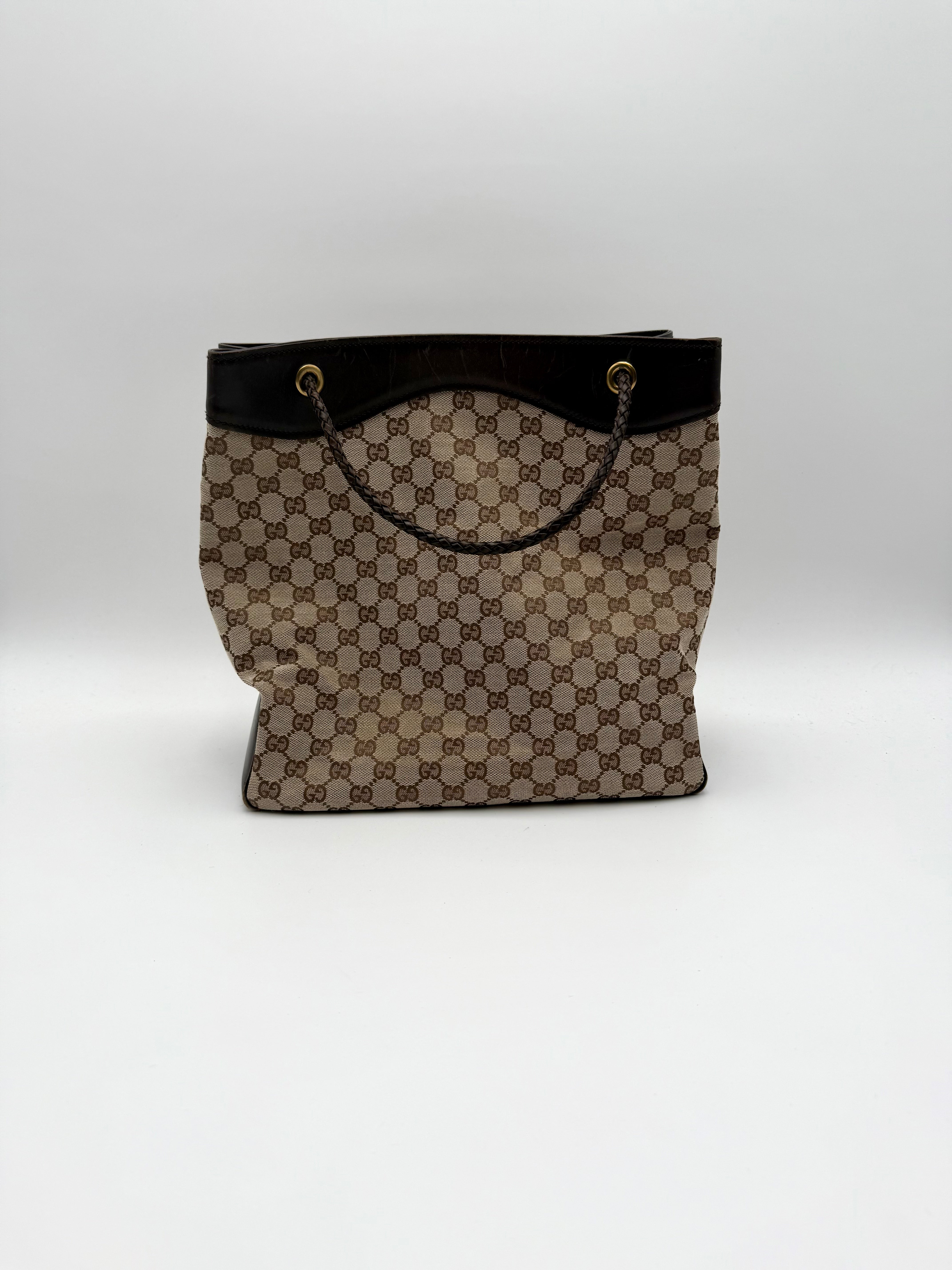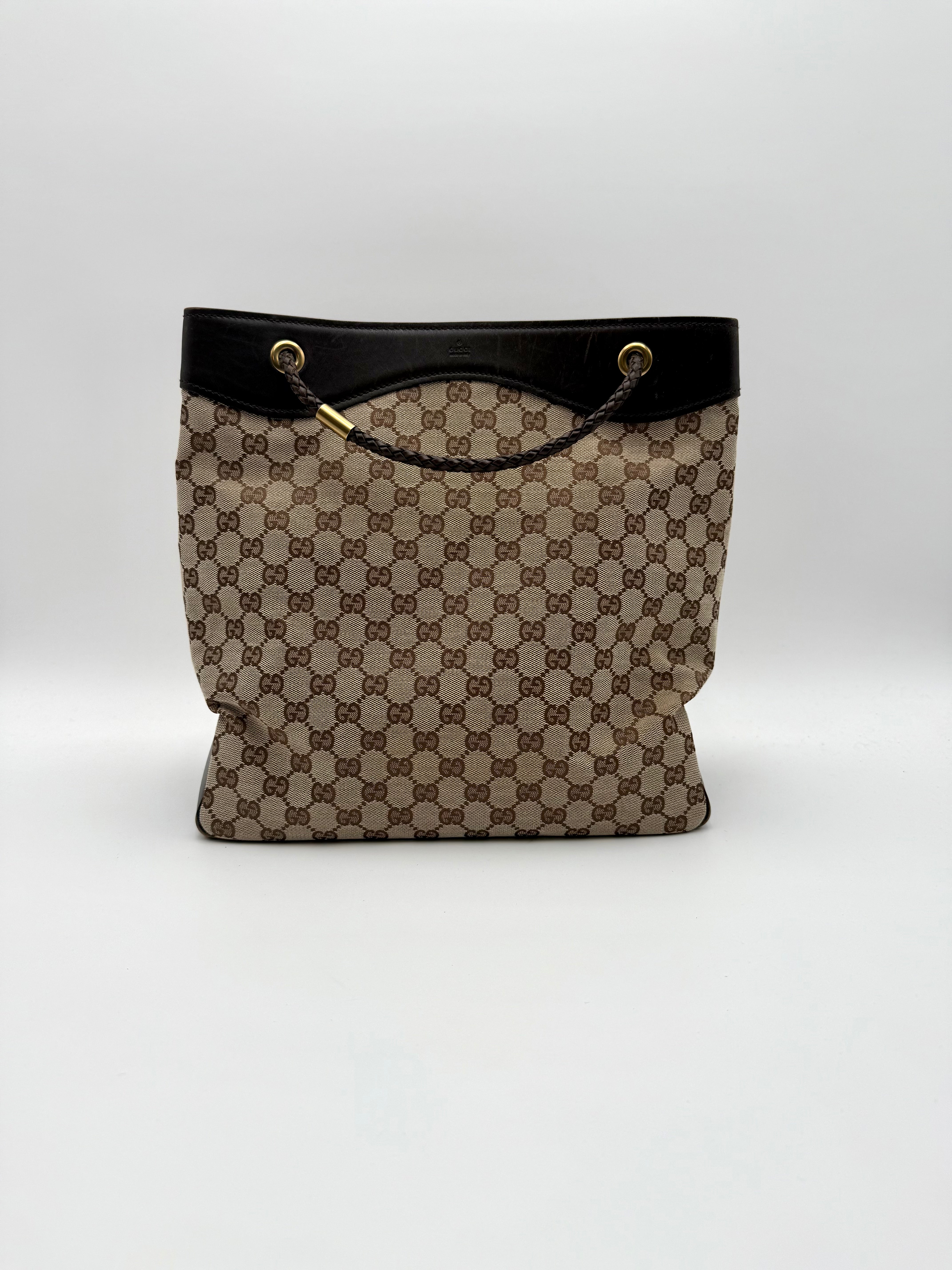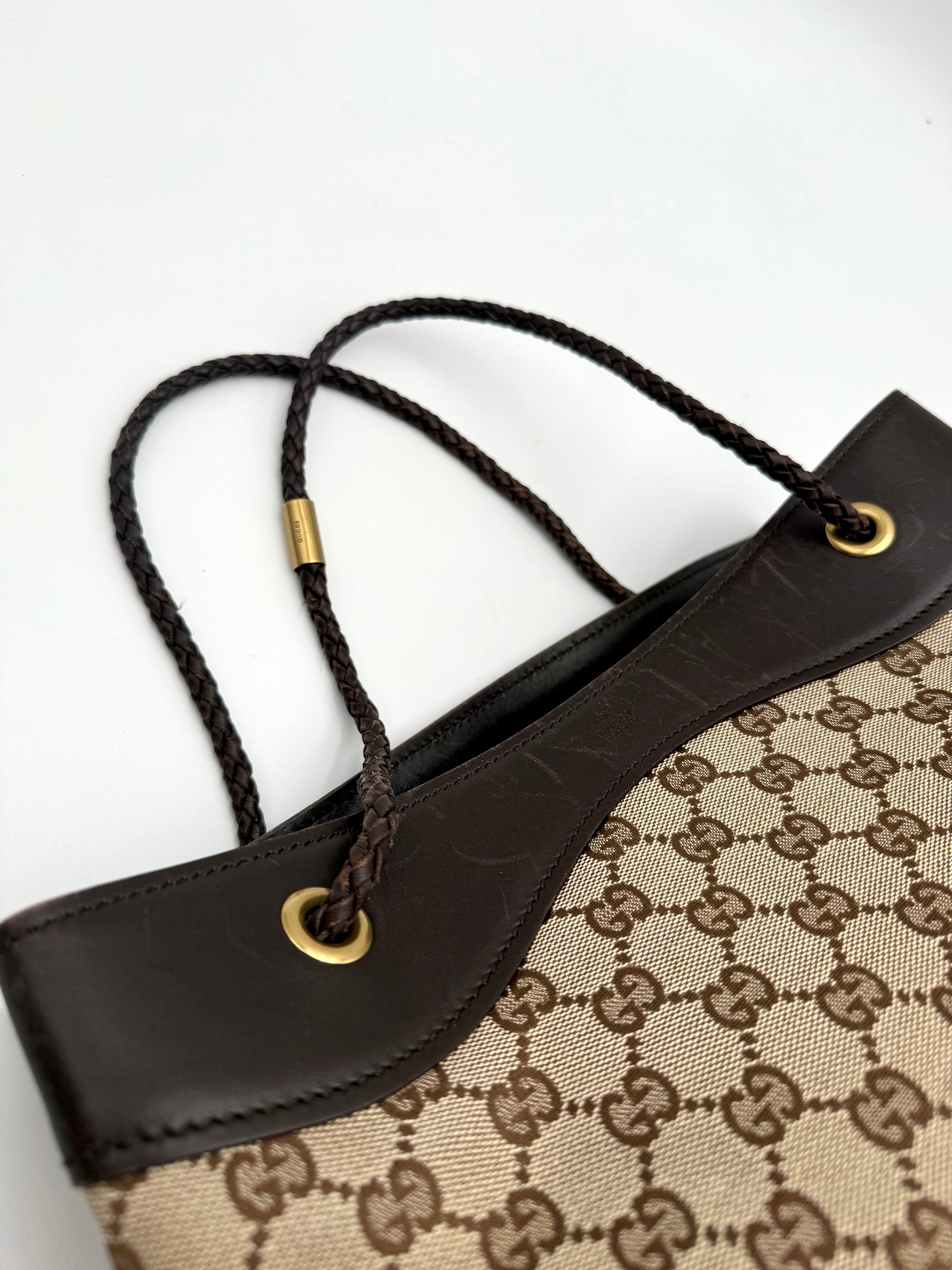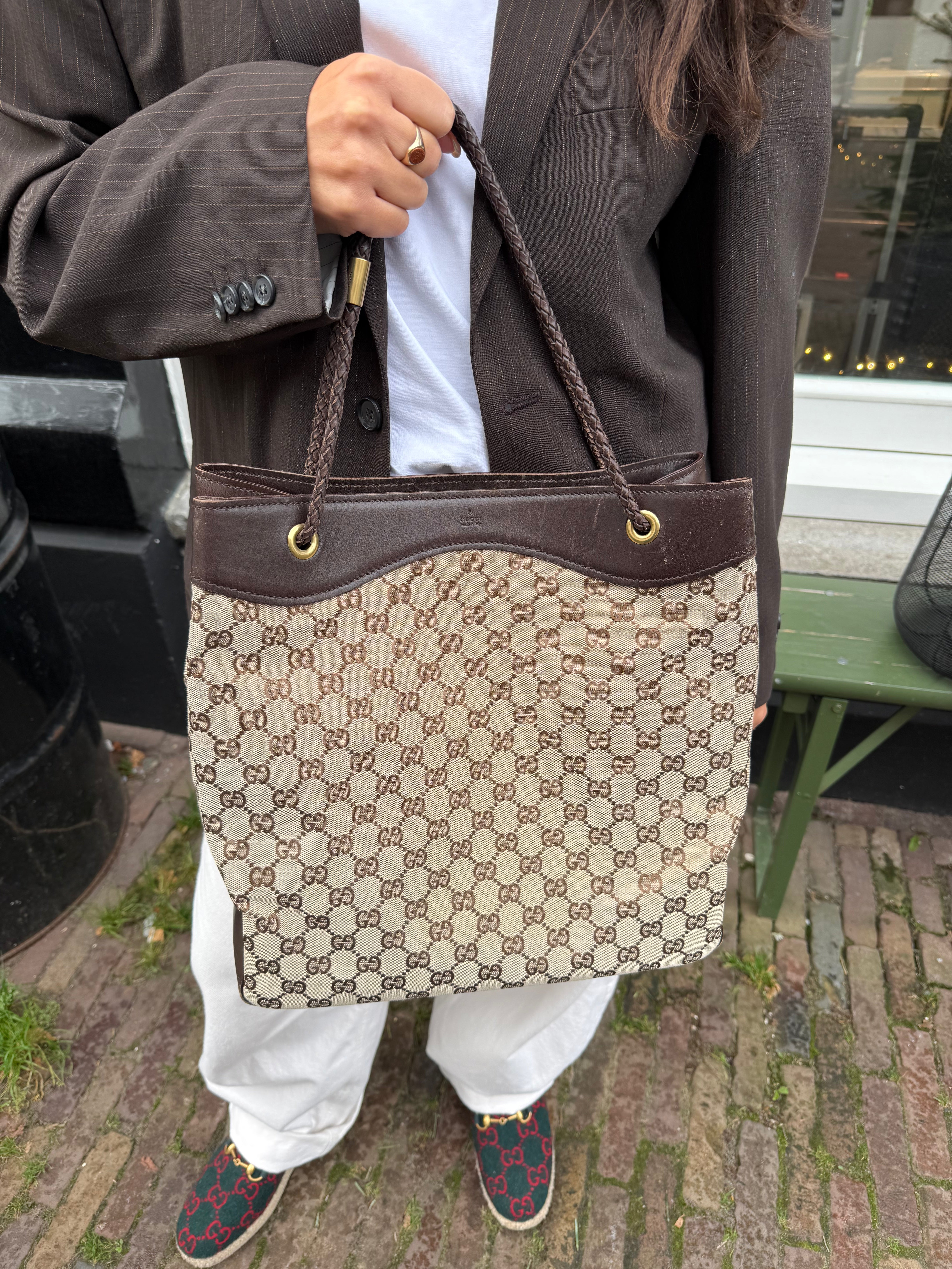 Tweedehands GUCCI canvas bag in een beige met bruine kleur. De tas is van canvas met leren hengsels en met gouden hardware. De tas beschikt over een binnenvak met rits. Het item verkeert in een zeer goede vintage staat, met algemene gebruikssporen. De tas wordt geleverd in onze mooie Moon flower dustbag.