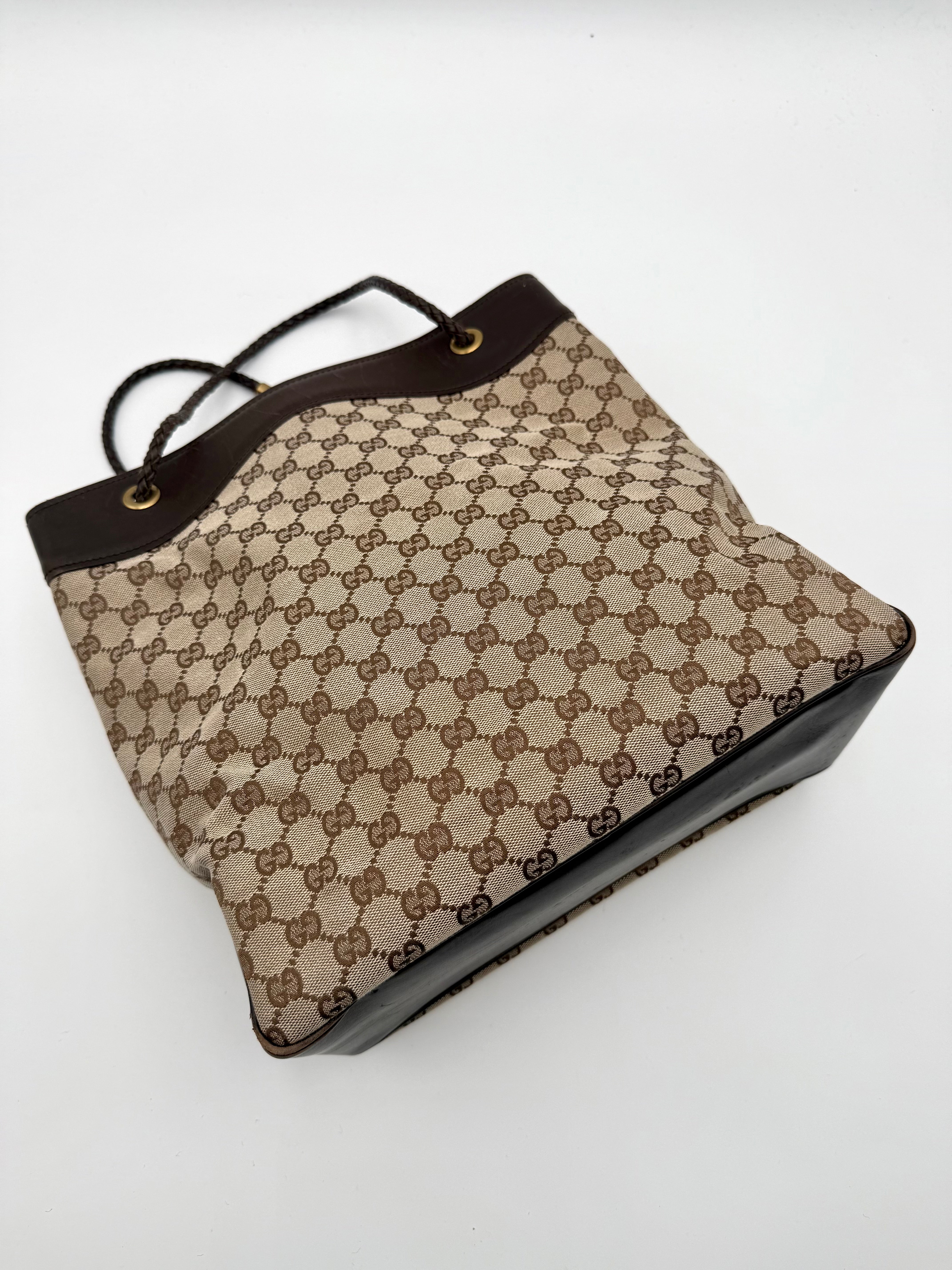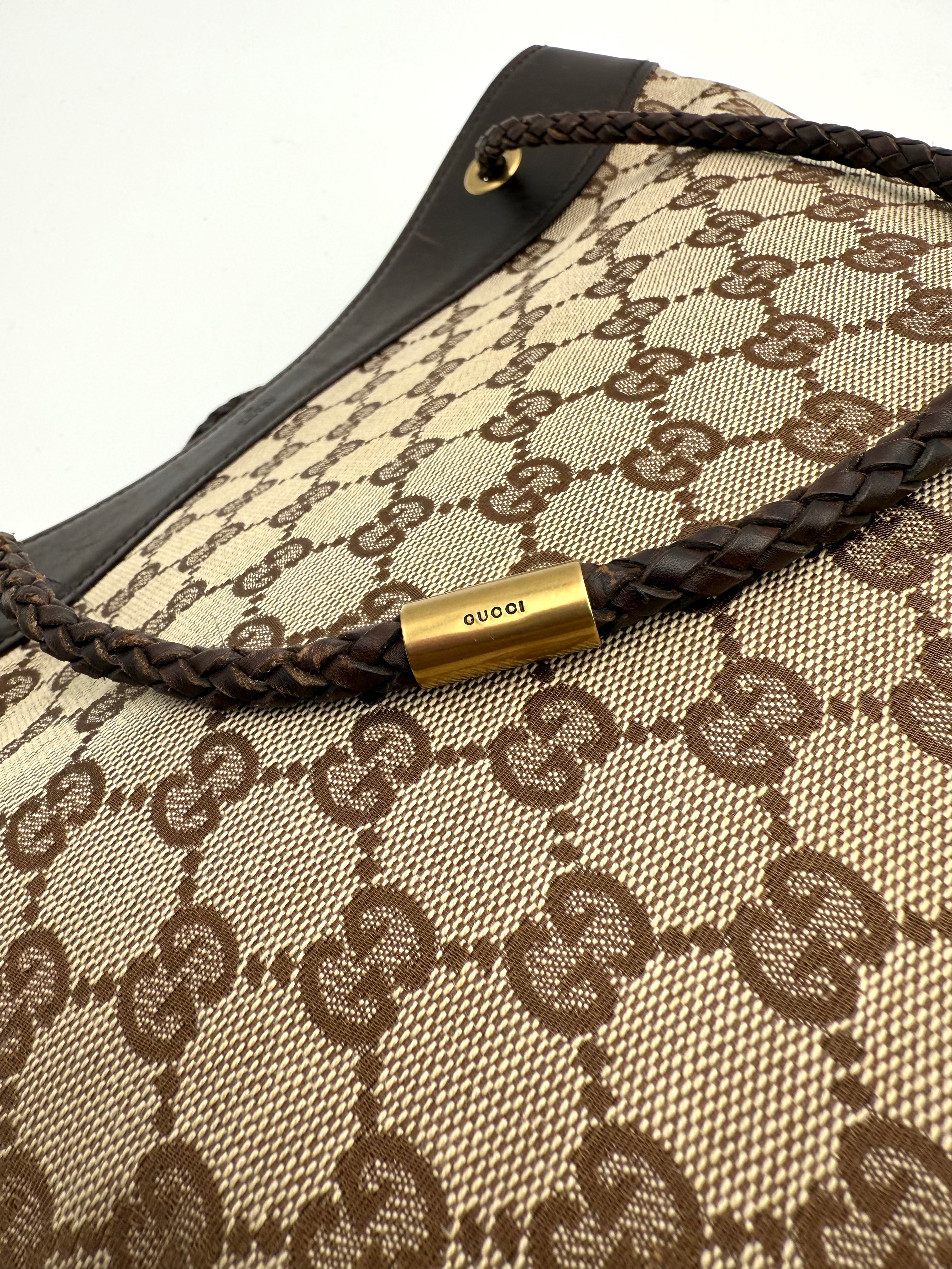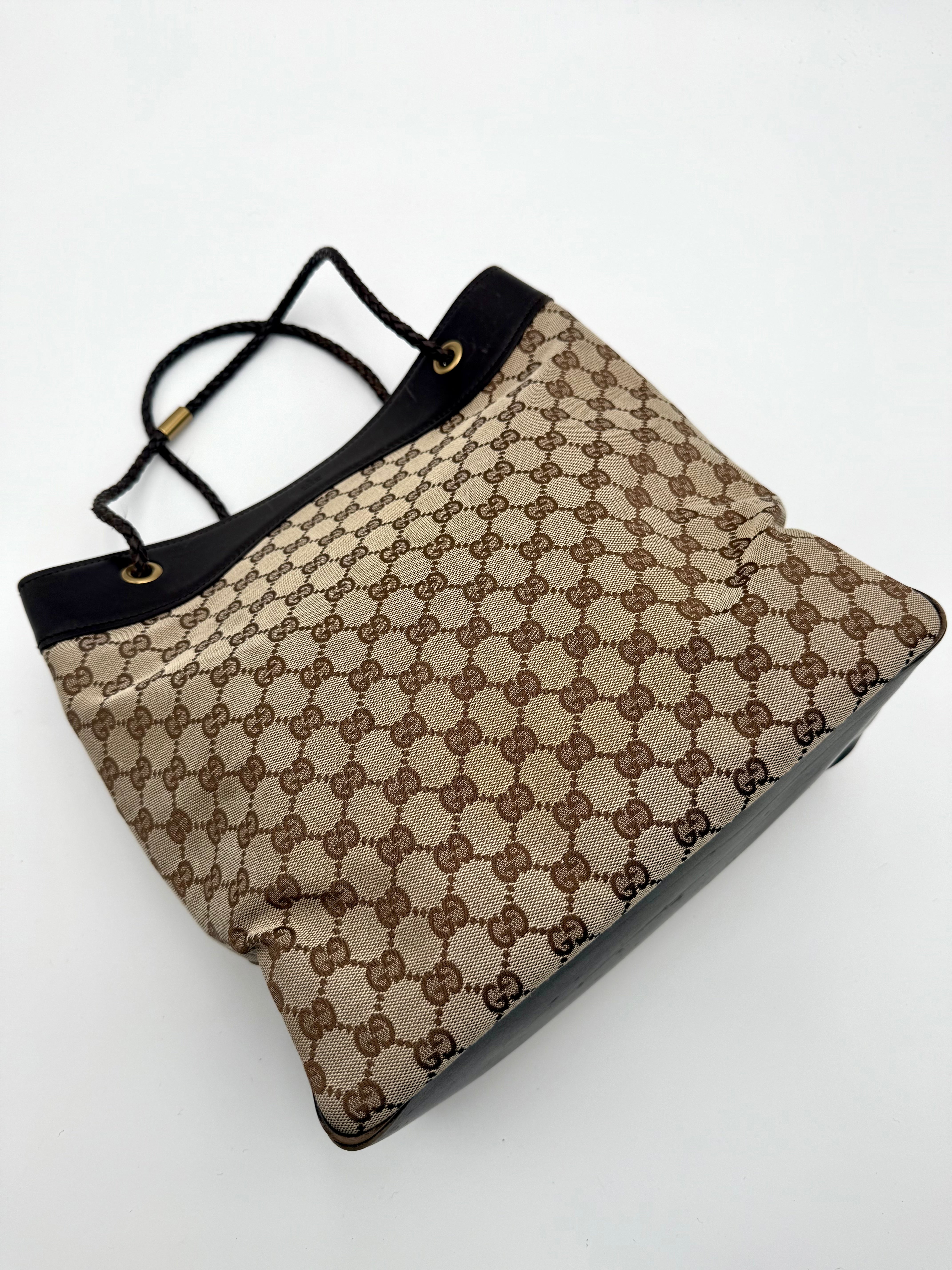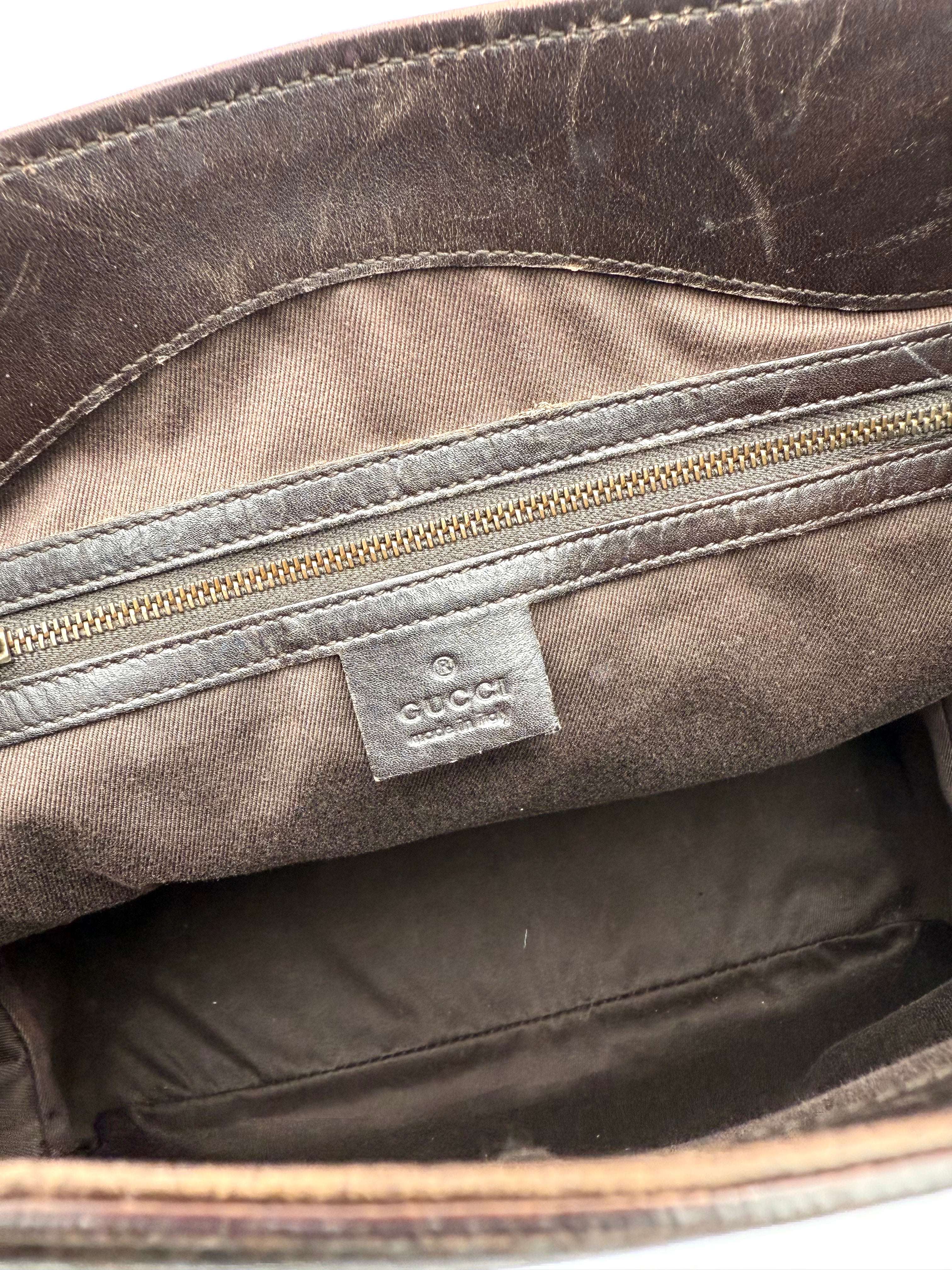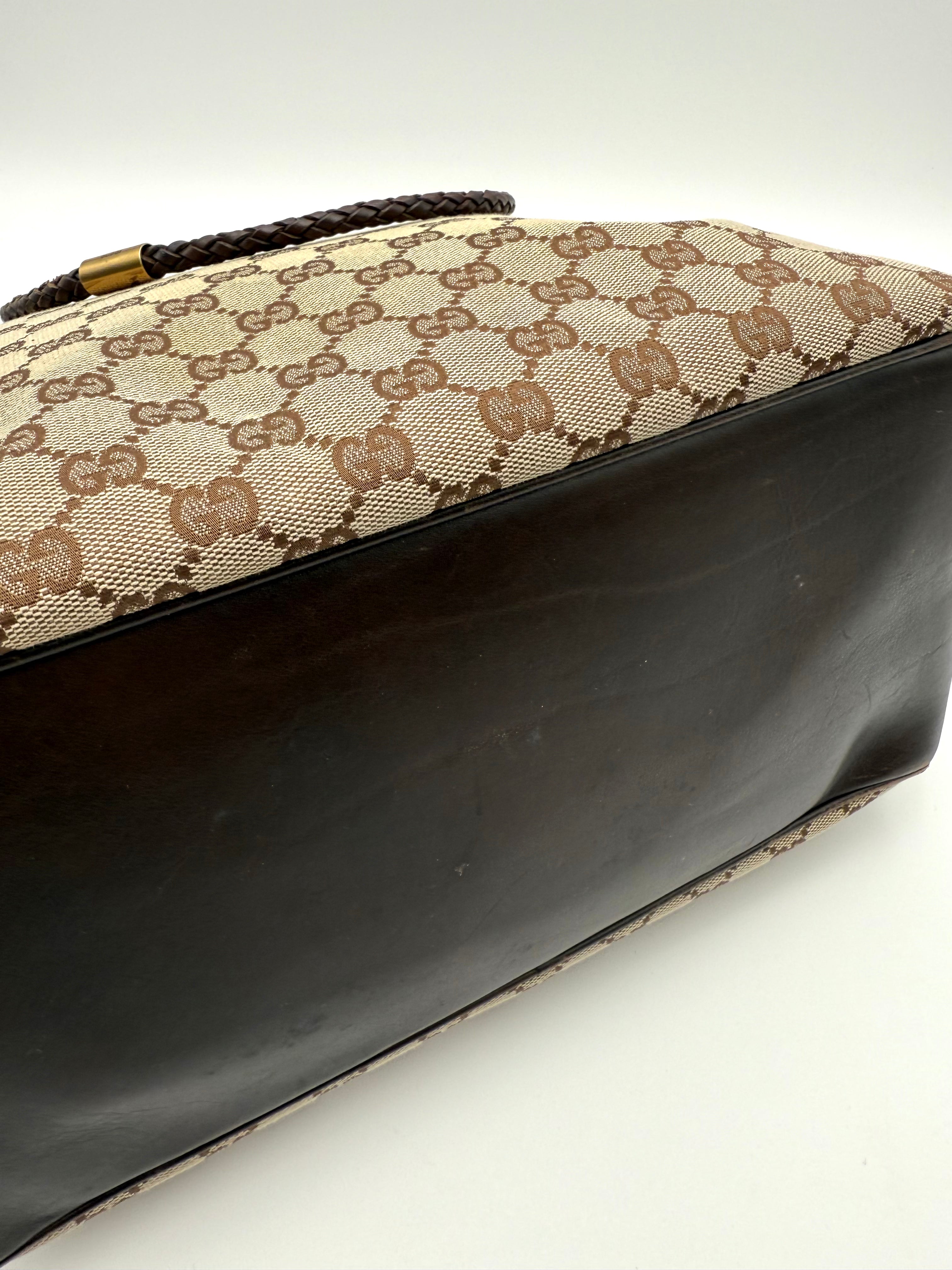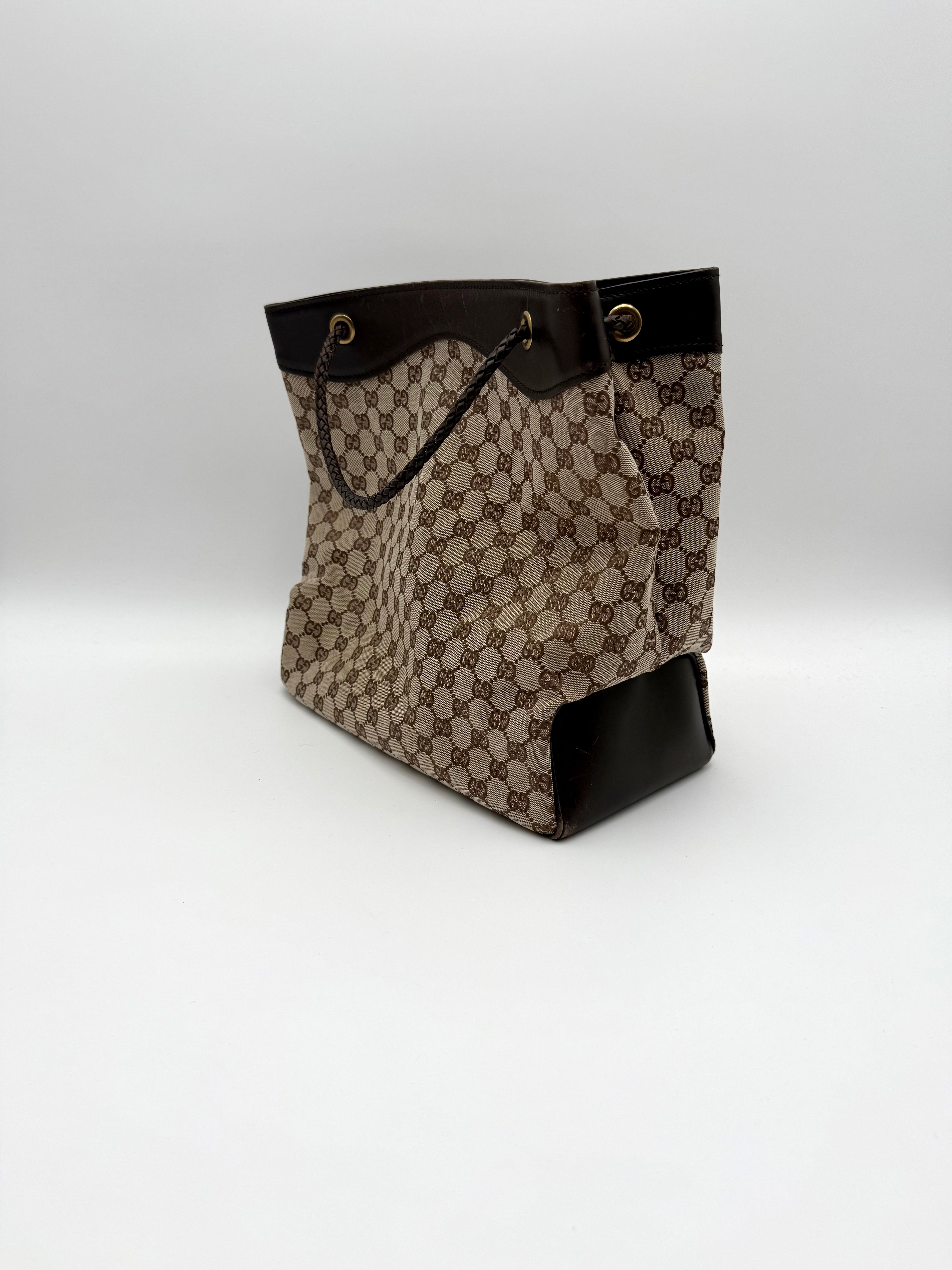 Tweedehands GUCCI canvas bag in een beige met bruine kleur. De tas is van canvas met leren hengsels en met gouden hardware. De tas beschikt over een binnenvak met rits. Het item verkeert in een zeer goede vintage staat, met algemene gebruikssporen. De tas wordt geleverd in onze mooie Moon flower dustbag.