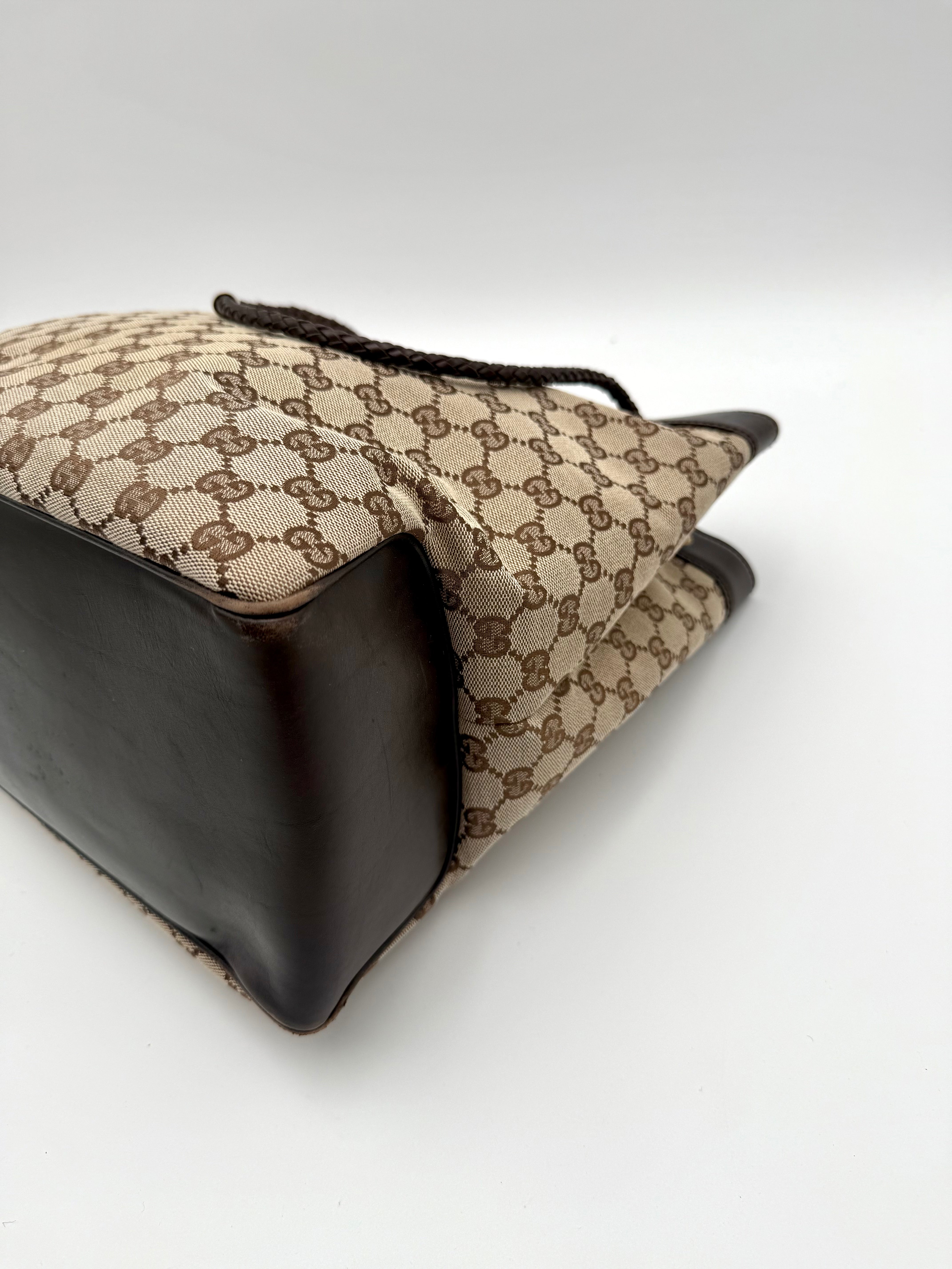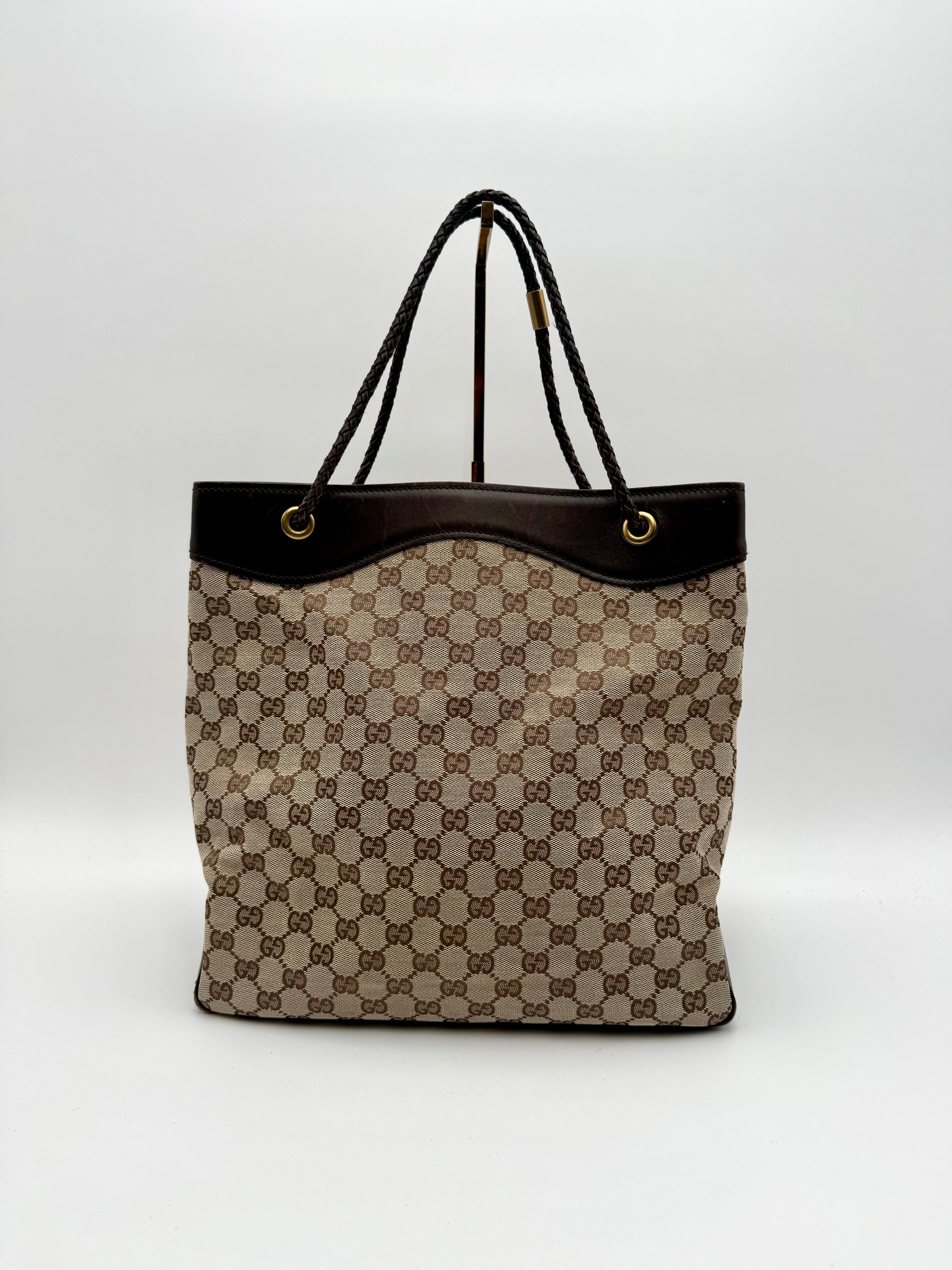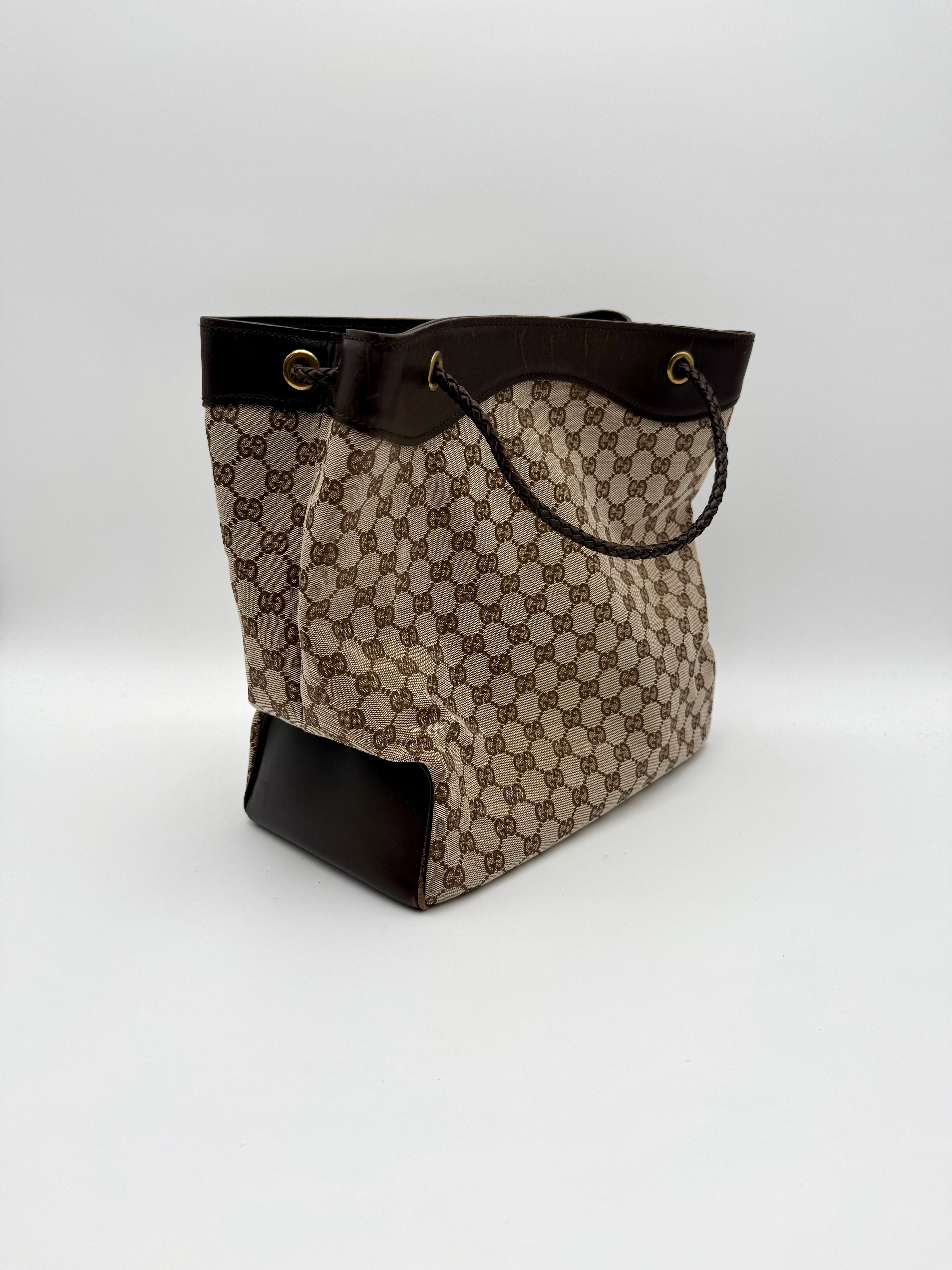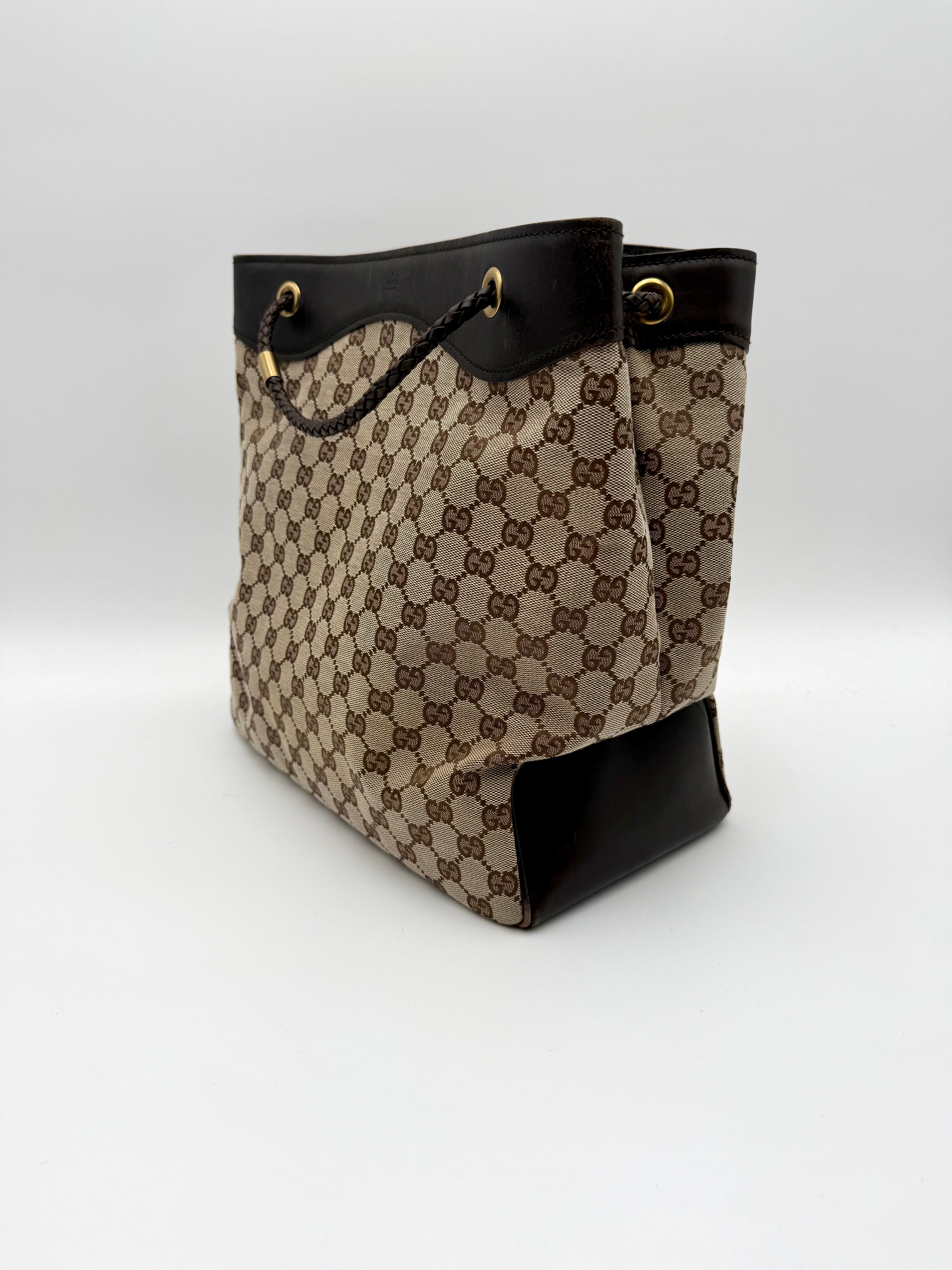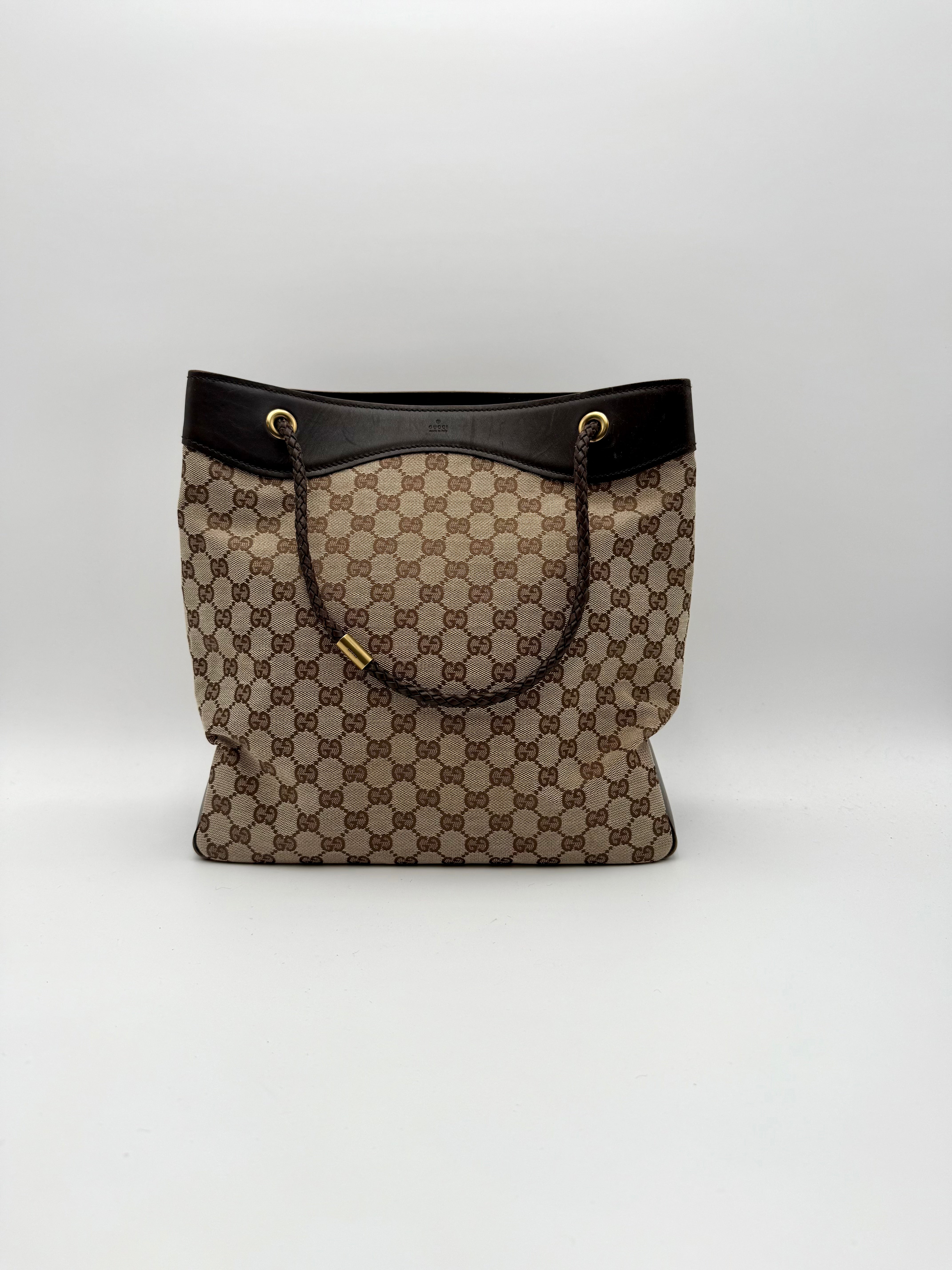 Tweedehands GUCCI canvas bag in een beige met bruine kleur. De tas is van canvas met leren hengsels en met gouden hardware. De tas beschikt over een binnenvak met rits. Het item verkeert in een zeer goede vintage staat, met algemene gebruikssporen. De tas wordt geleverd in onze mooie Moon flower dustbag.