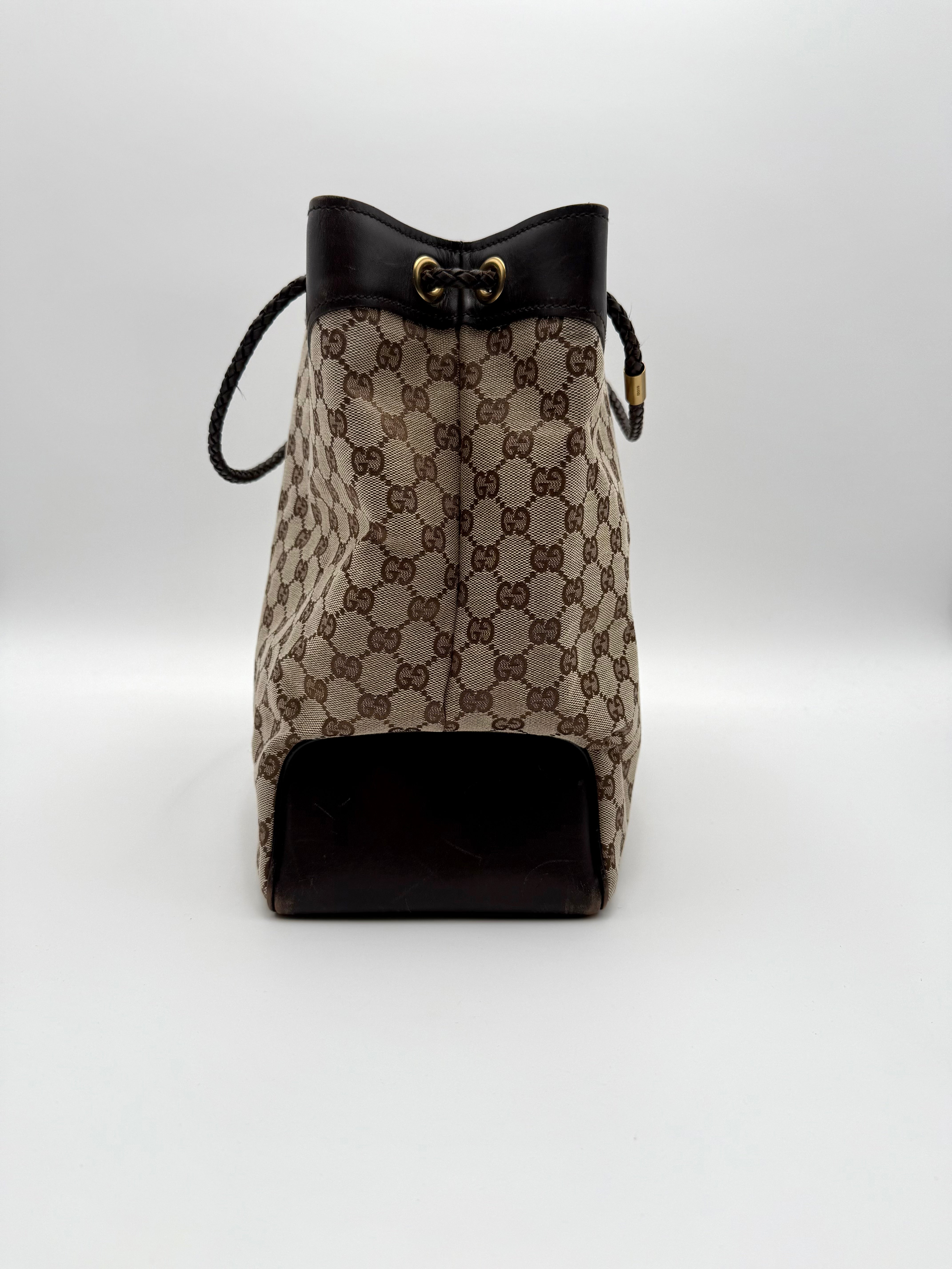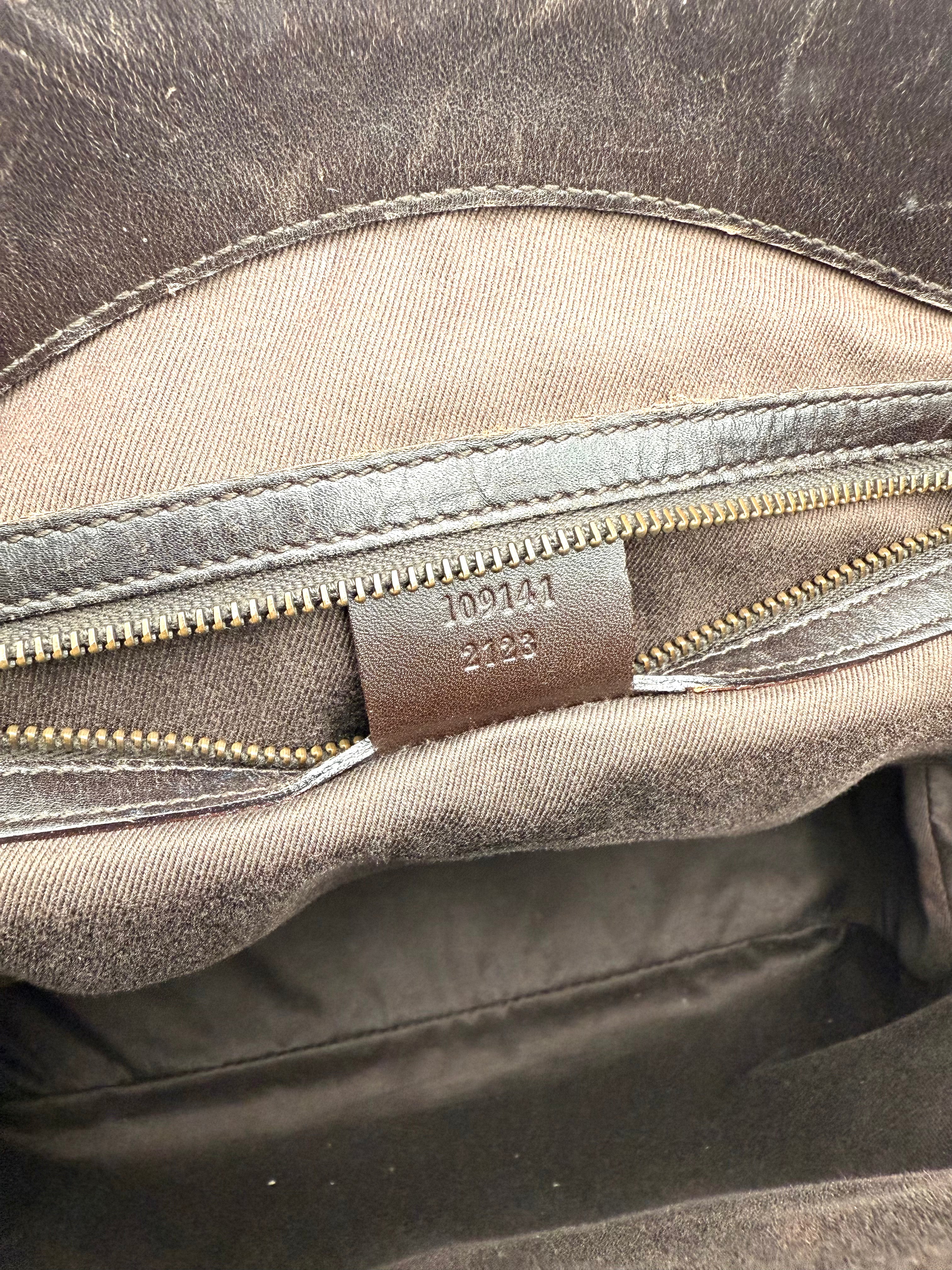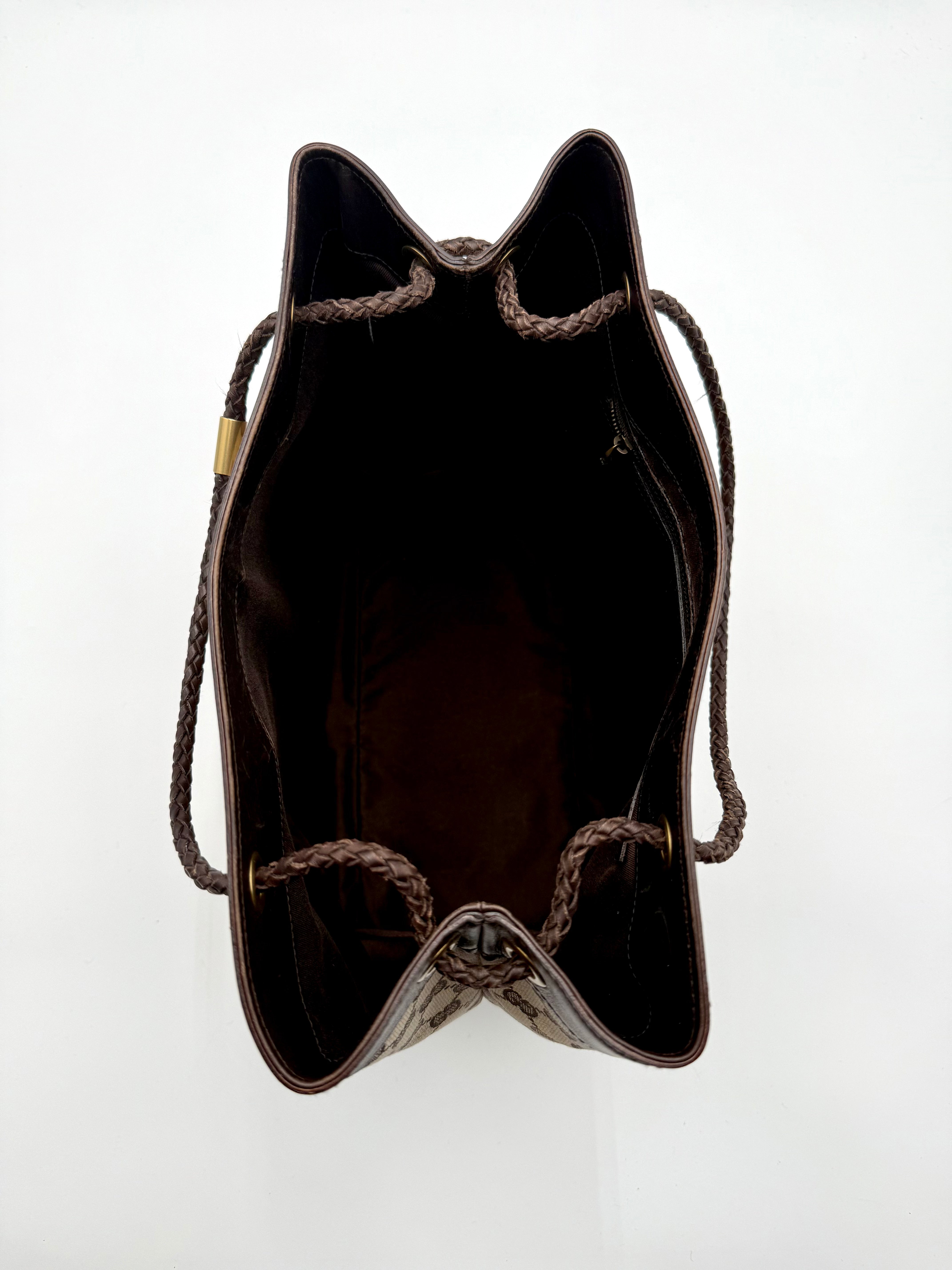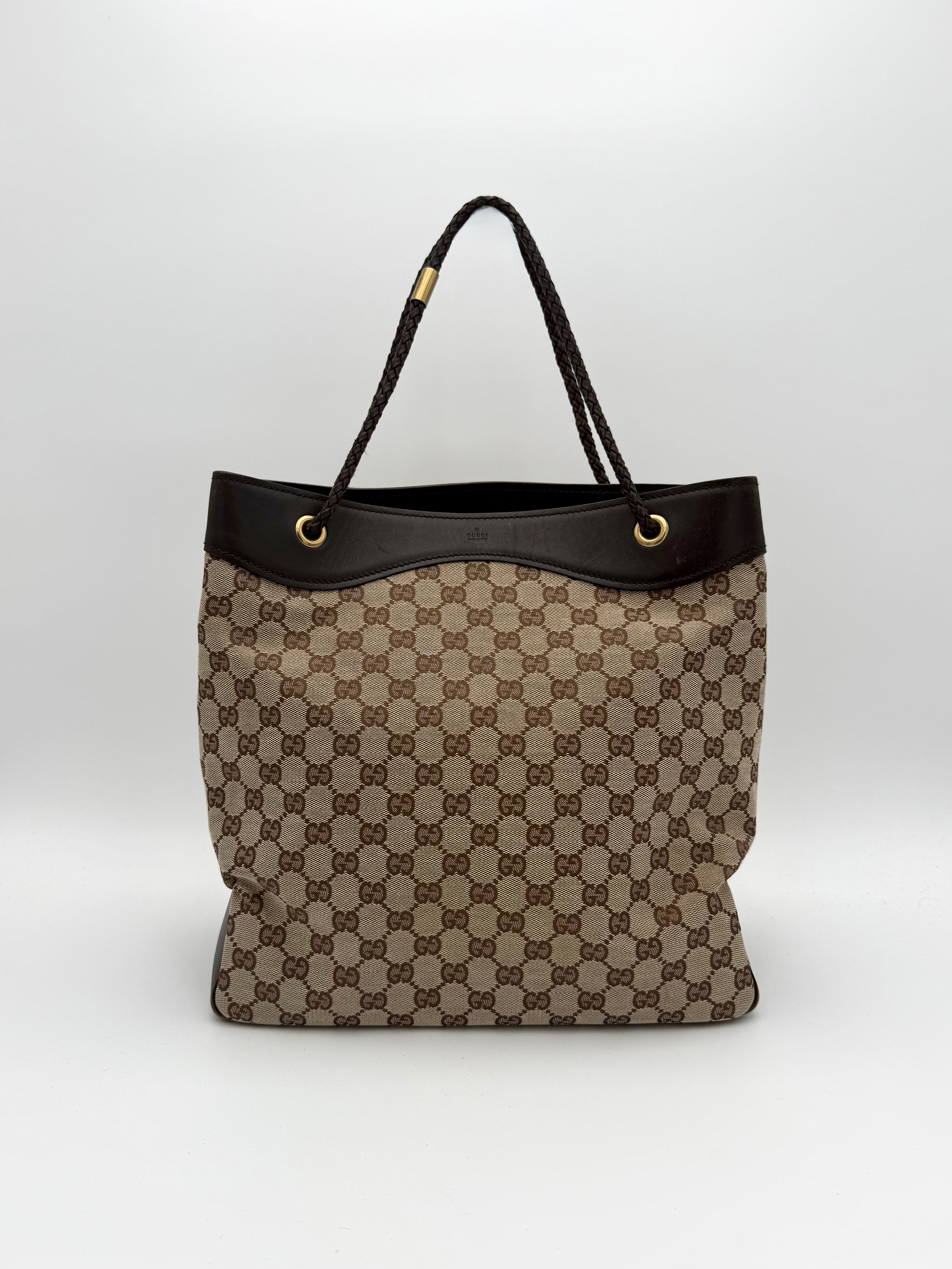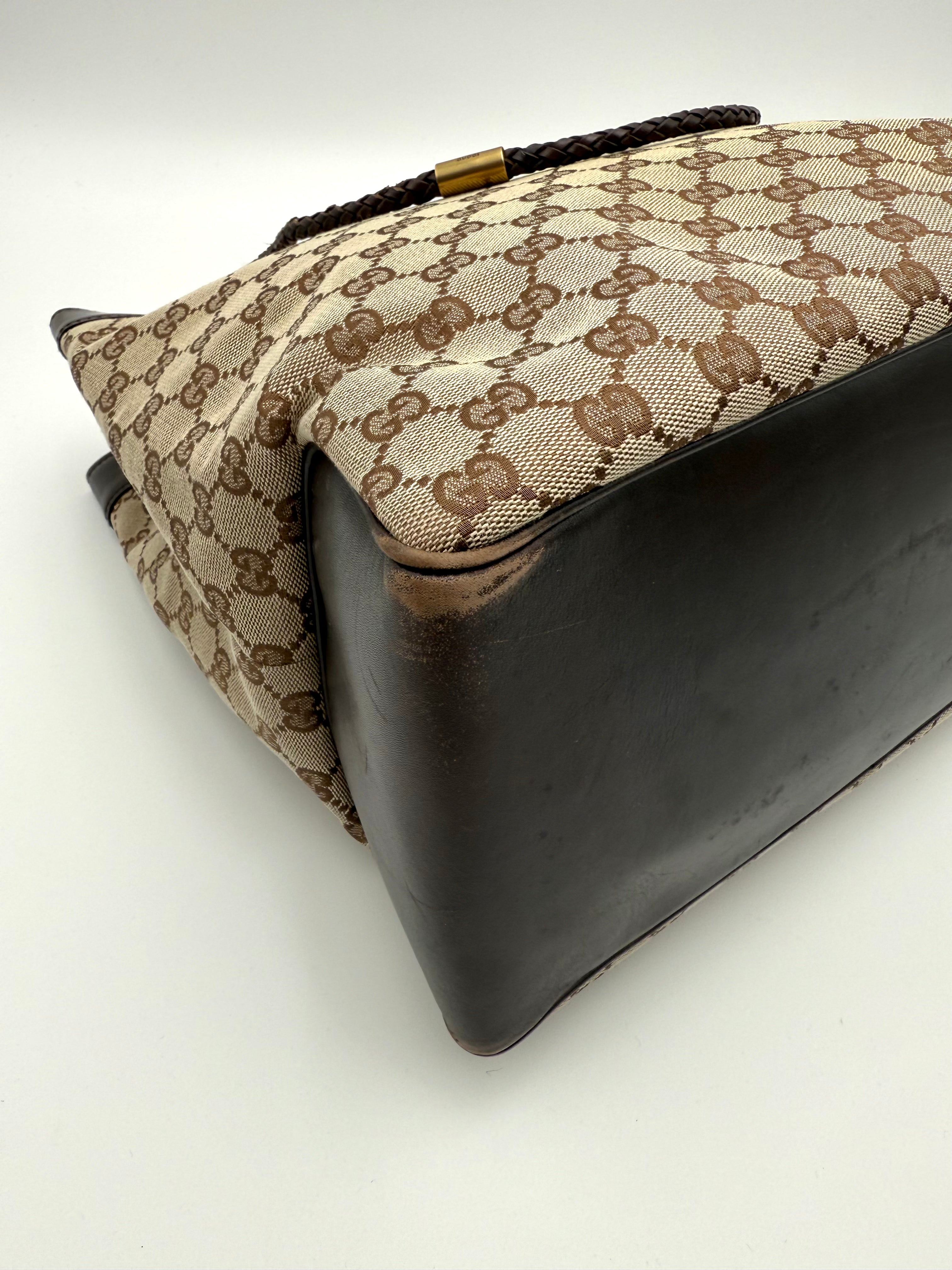 Tweedehands GUCCI canvas bag in een beige met bruine kleur. De tas is van canvas met leren hengsels en met gouden hardware. De tas beschikt over een binnenvak met rits. Het item verkeert in een zeer goede vintage staat, met algemene gebruikssporen. De tas wordt geleverd in onze mooie Moon flower dustbag.