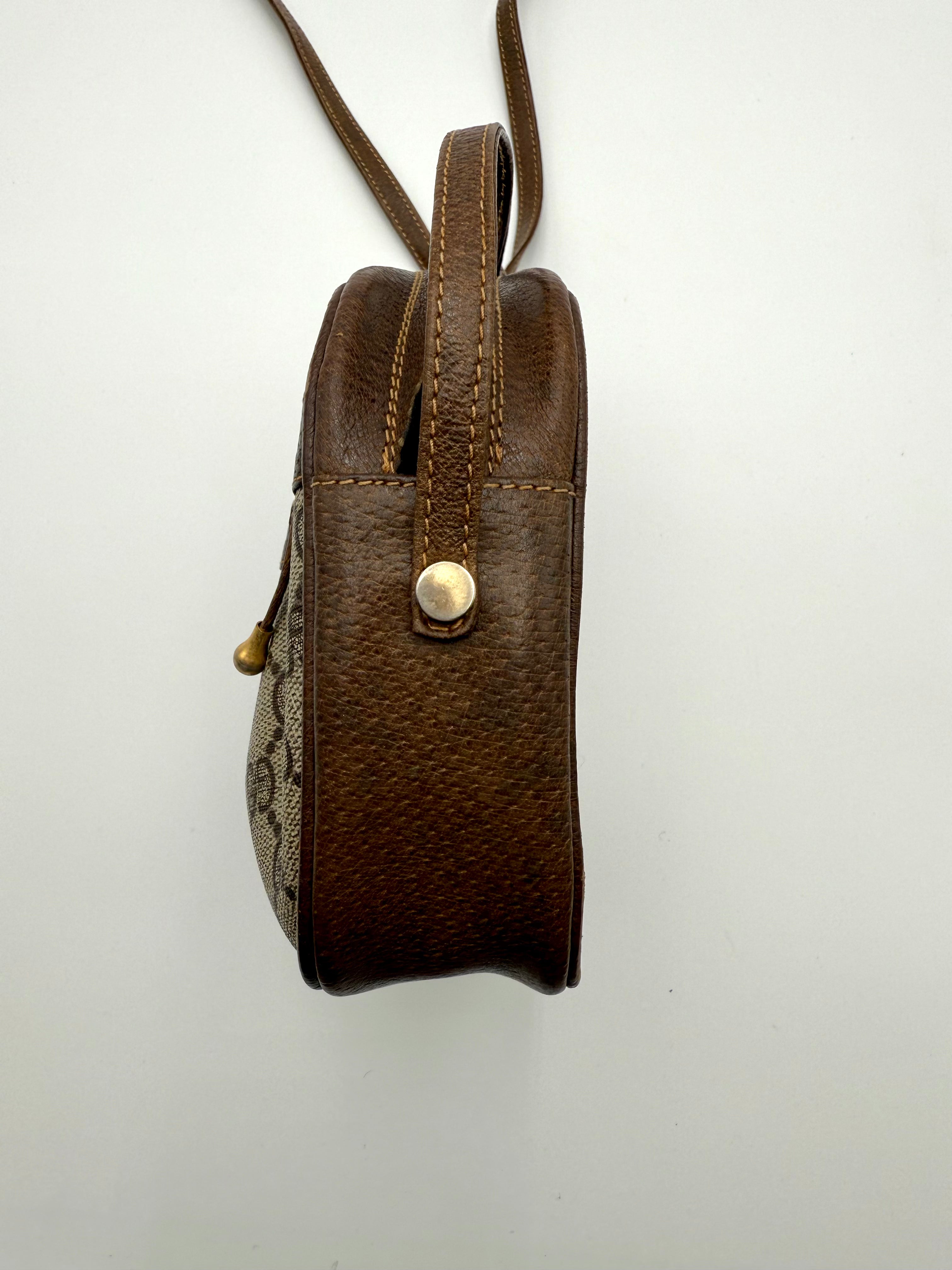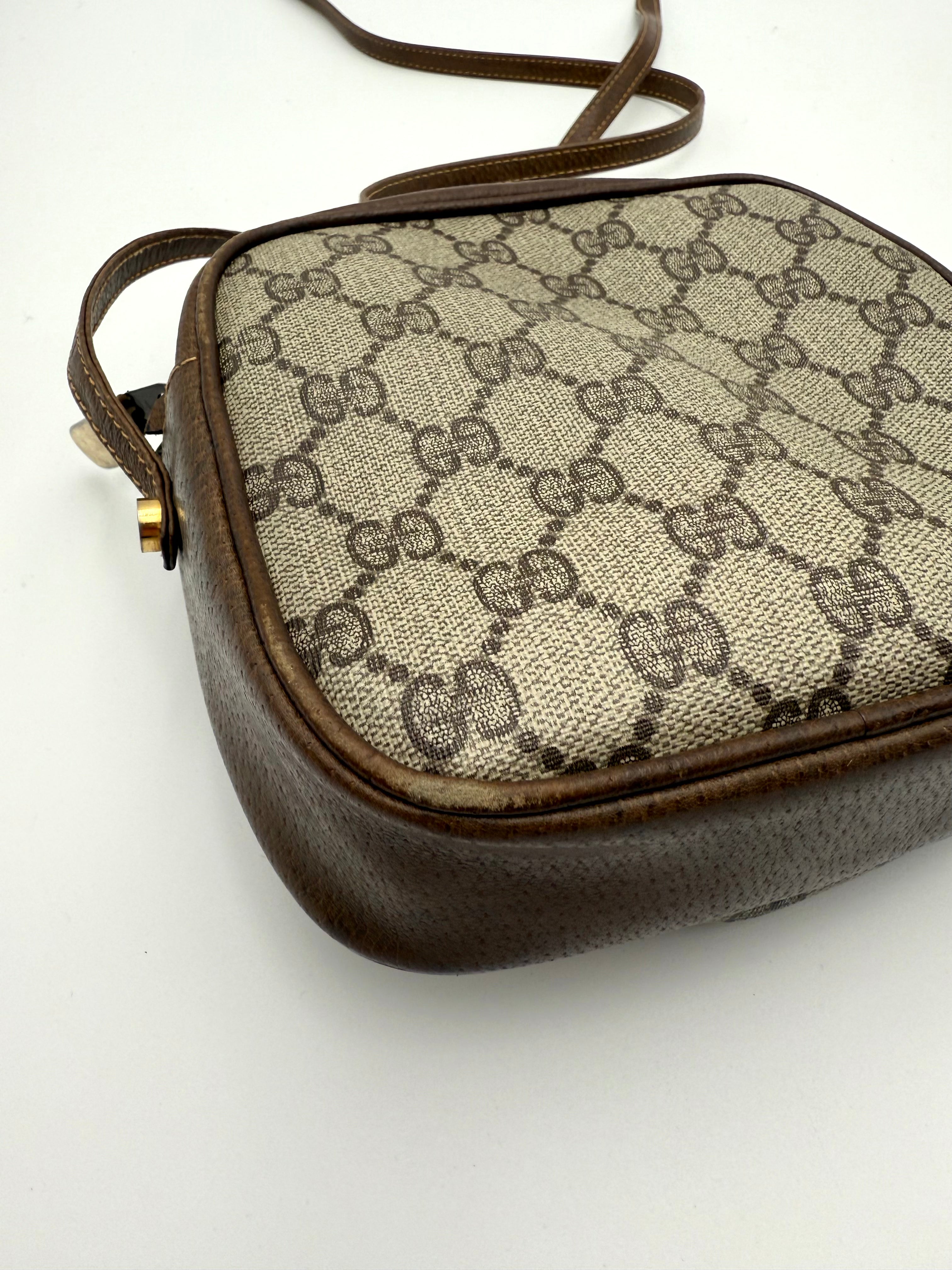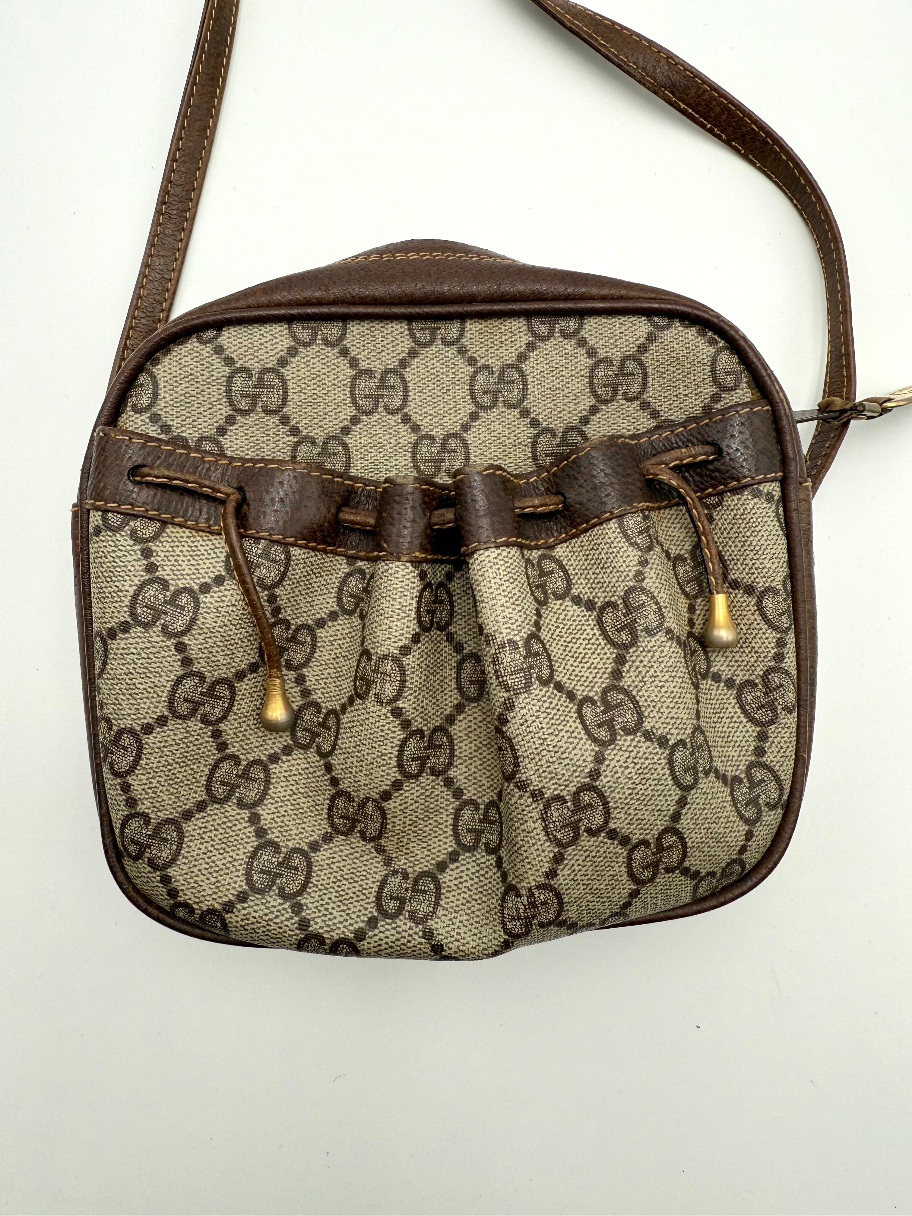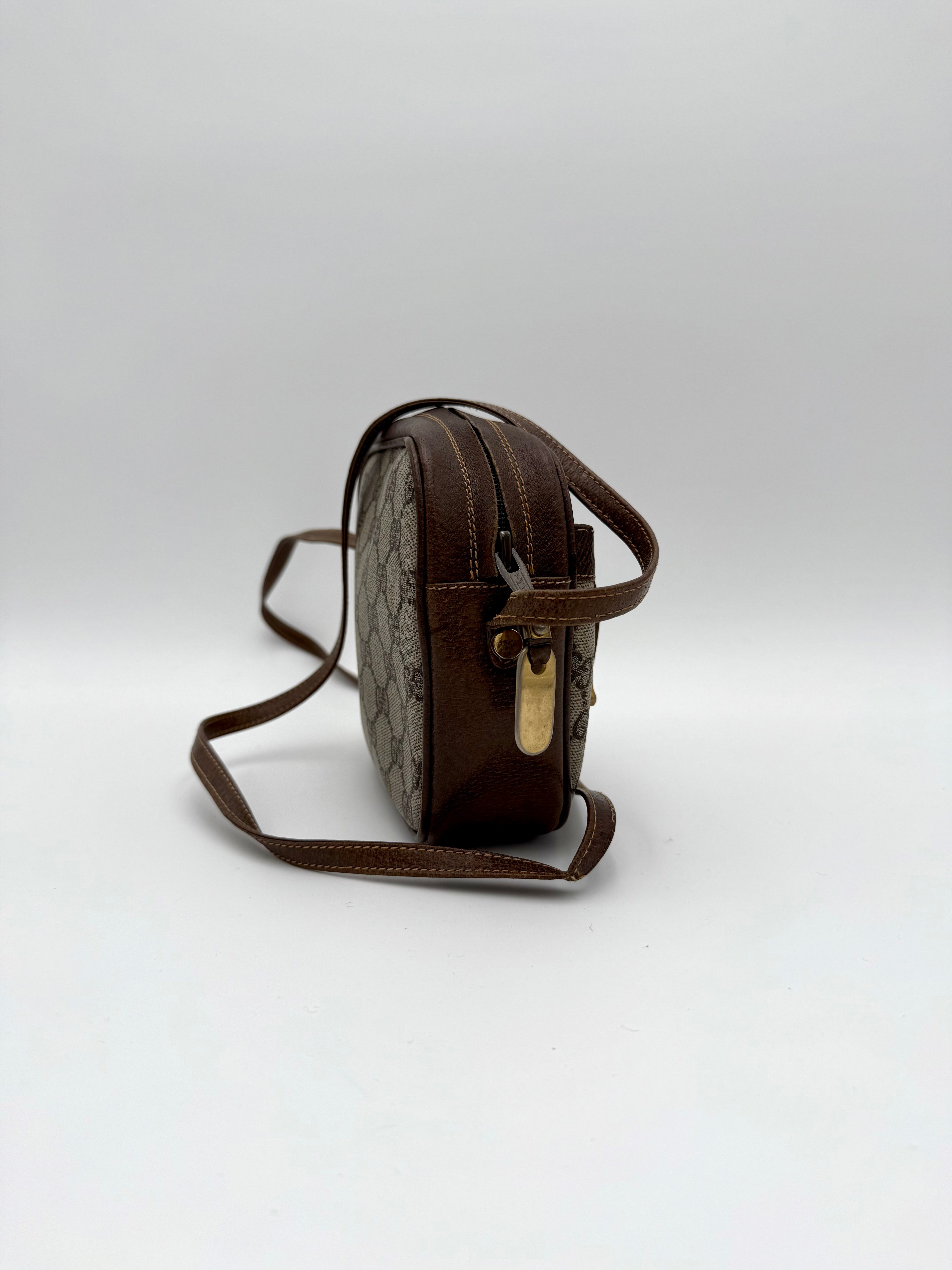 Tweedehands GUCCI canvas bag in een beige met bruine kleur. De tas is van canvas met leren hengsels en met gouden hardware. De tas sluit met een rits, beschikt over een voorvakje en één vak aan de binnenkant. Het item verkeert in een zeer goede vintage staat, met algemene gebruikssporen. De tas wordt geleverd in onze mooie Moon flower dustbag.