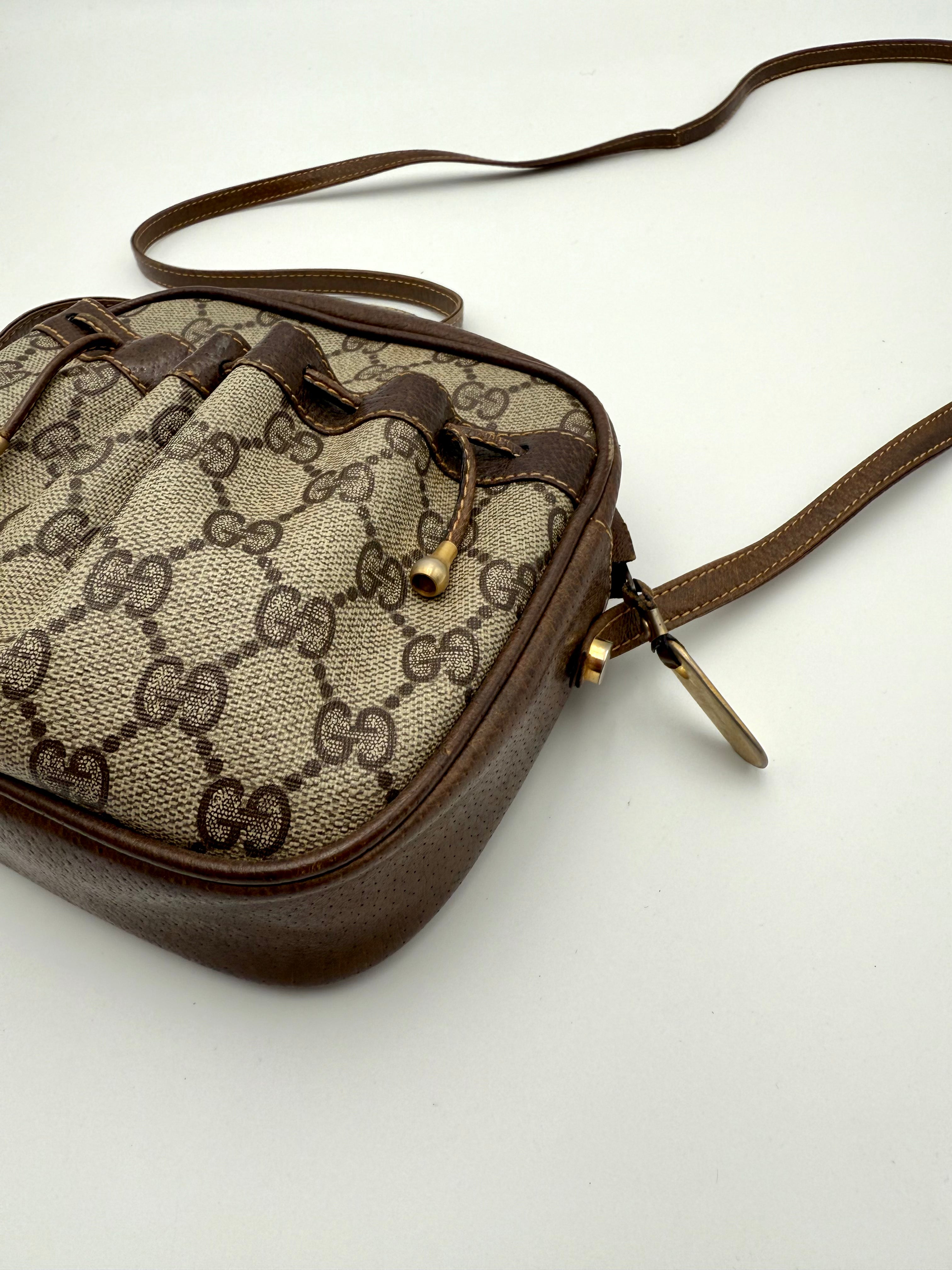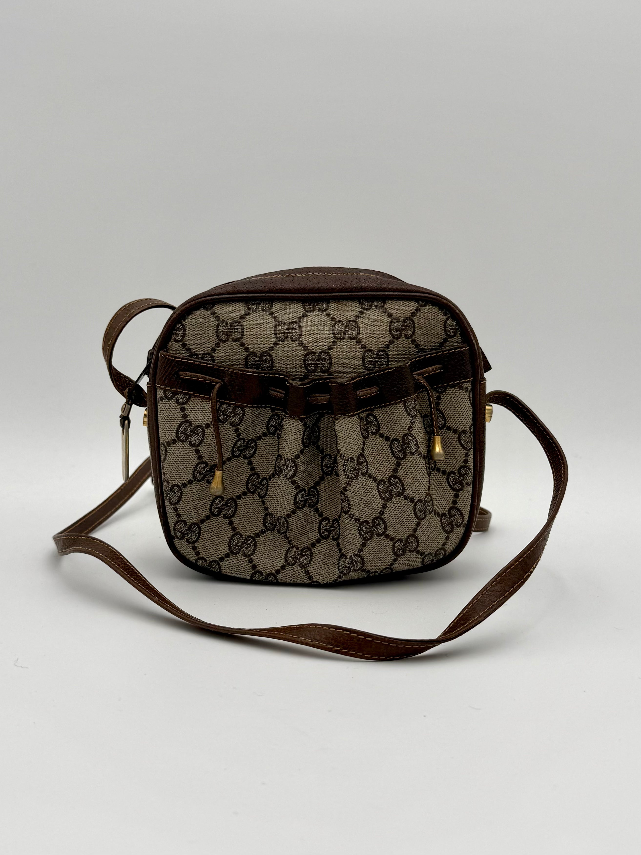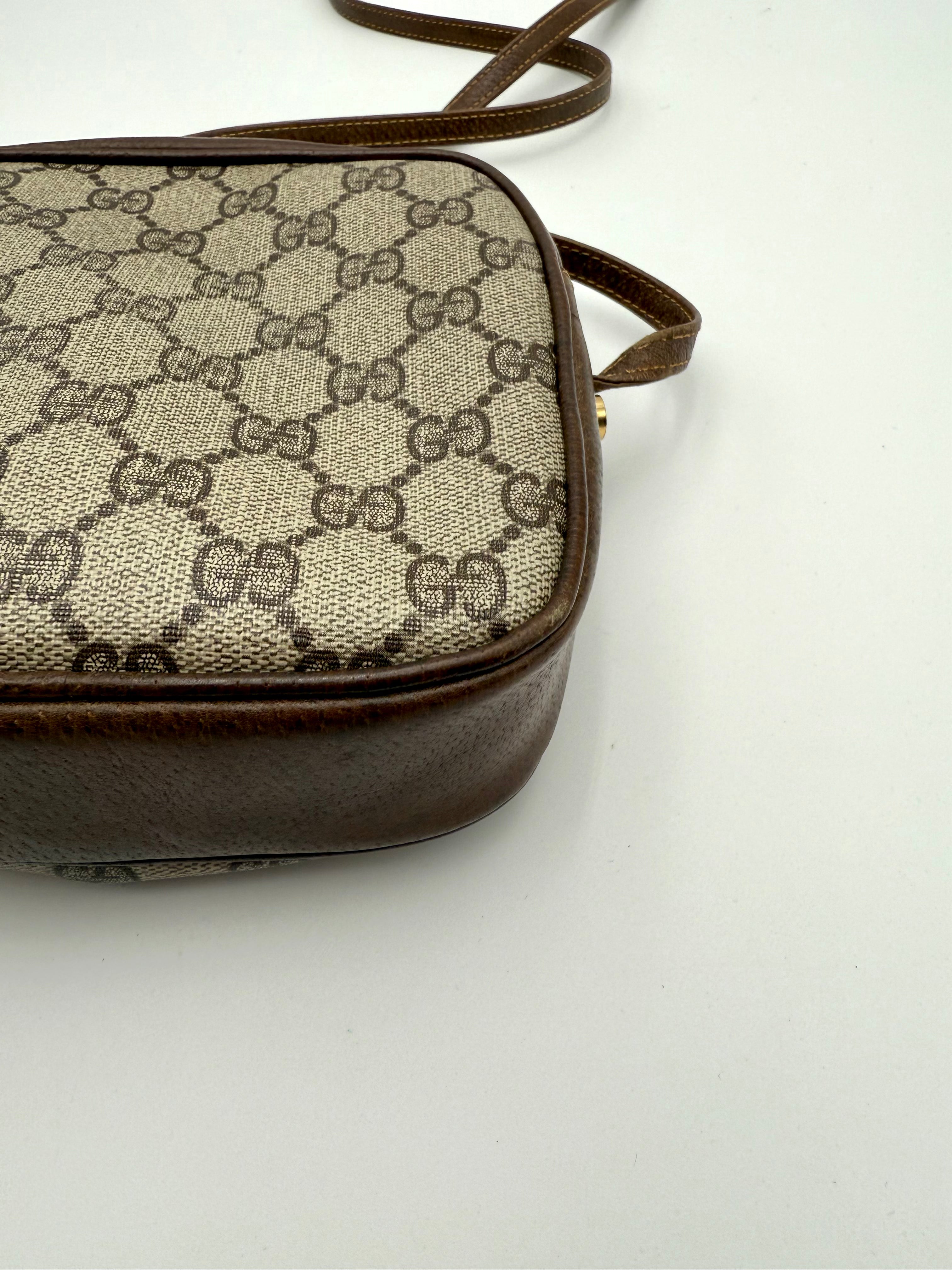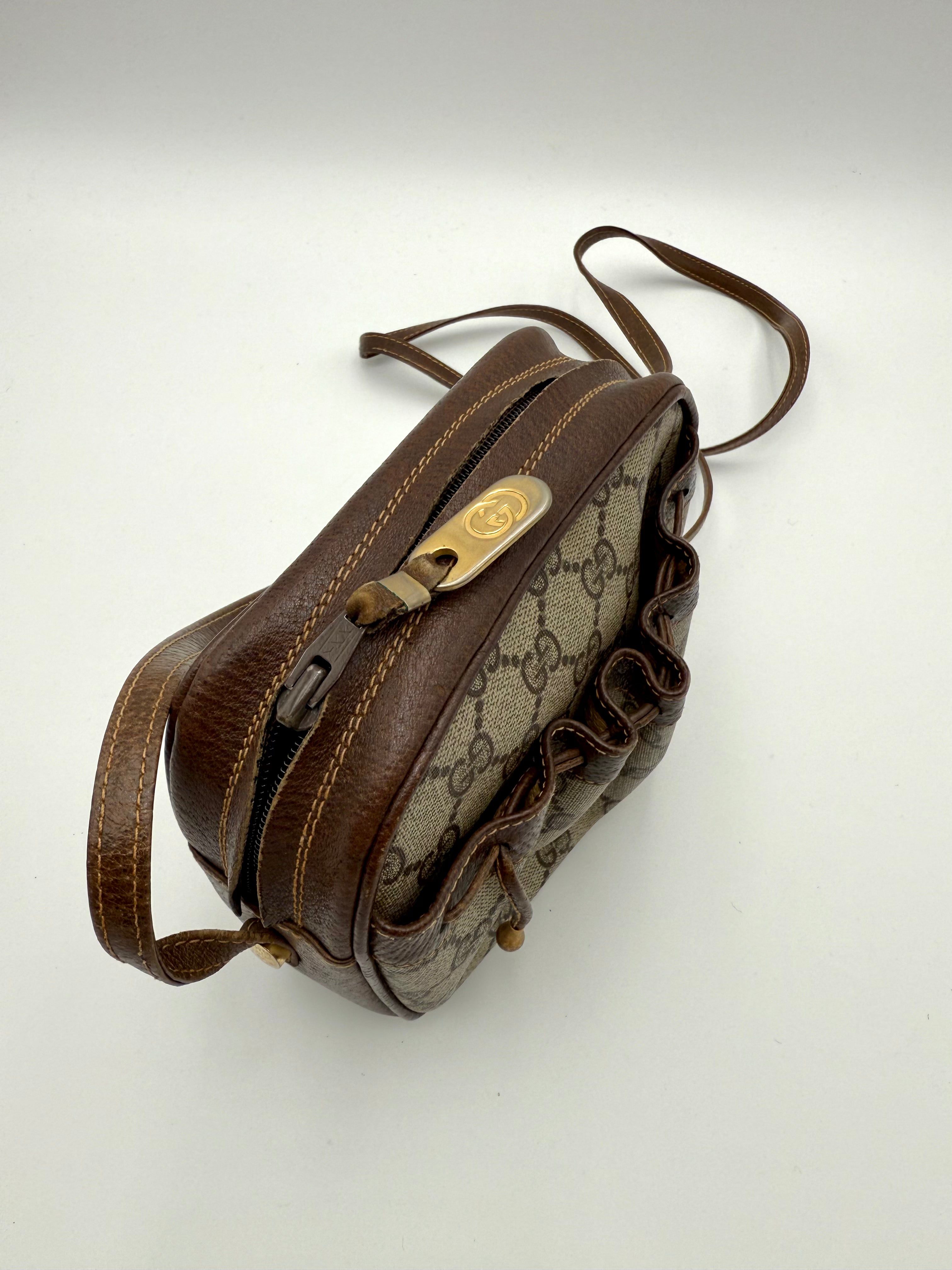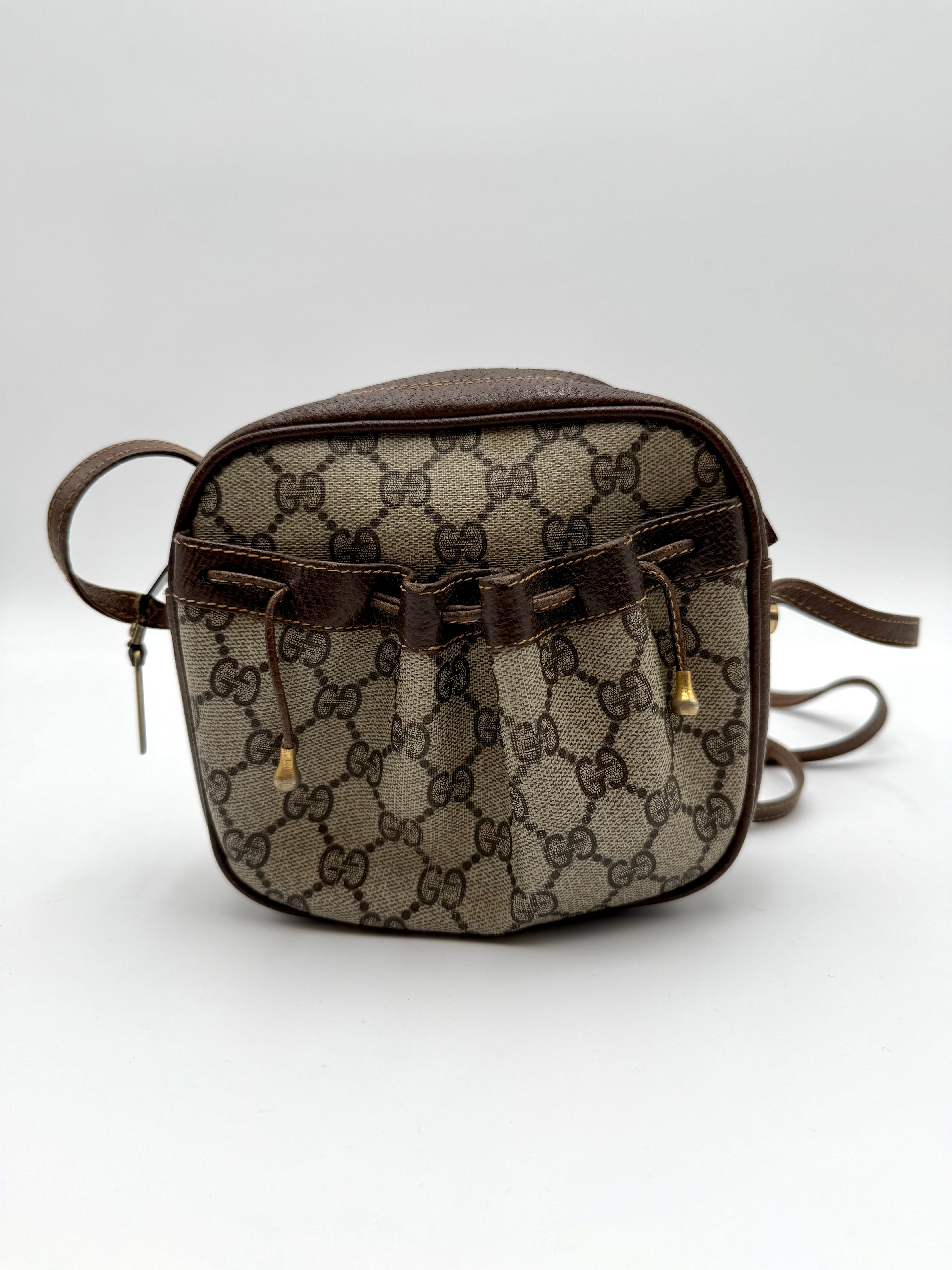 Tweedehands GUCCI canvas bag in een beige met bruine kleur. De tas is van canvas met leren hengsels en met gouden hardware. De tas sluit met een rits, beschikt over een voorvakje en één vak aan de binnenkant. Het item verkeert in een zeer goede vintage staat, met algemene gebruikssporen. De tas wordt geleverd in onze mooie Moon flower dustbag.