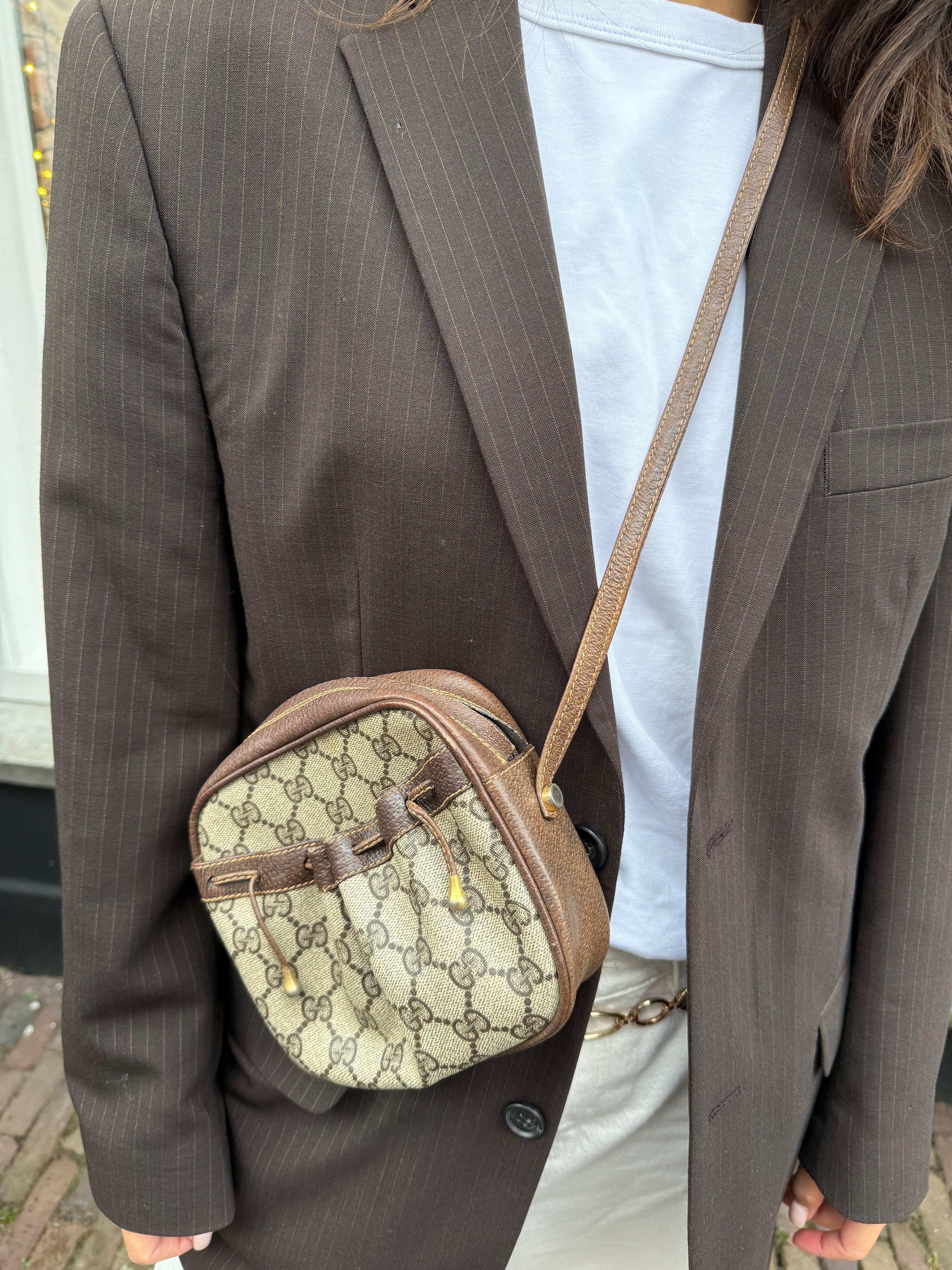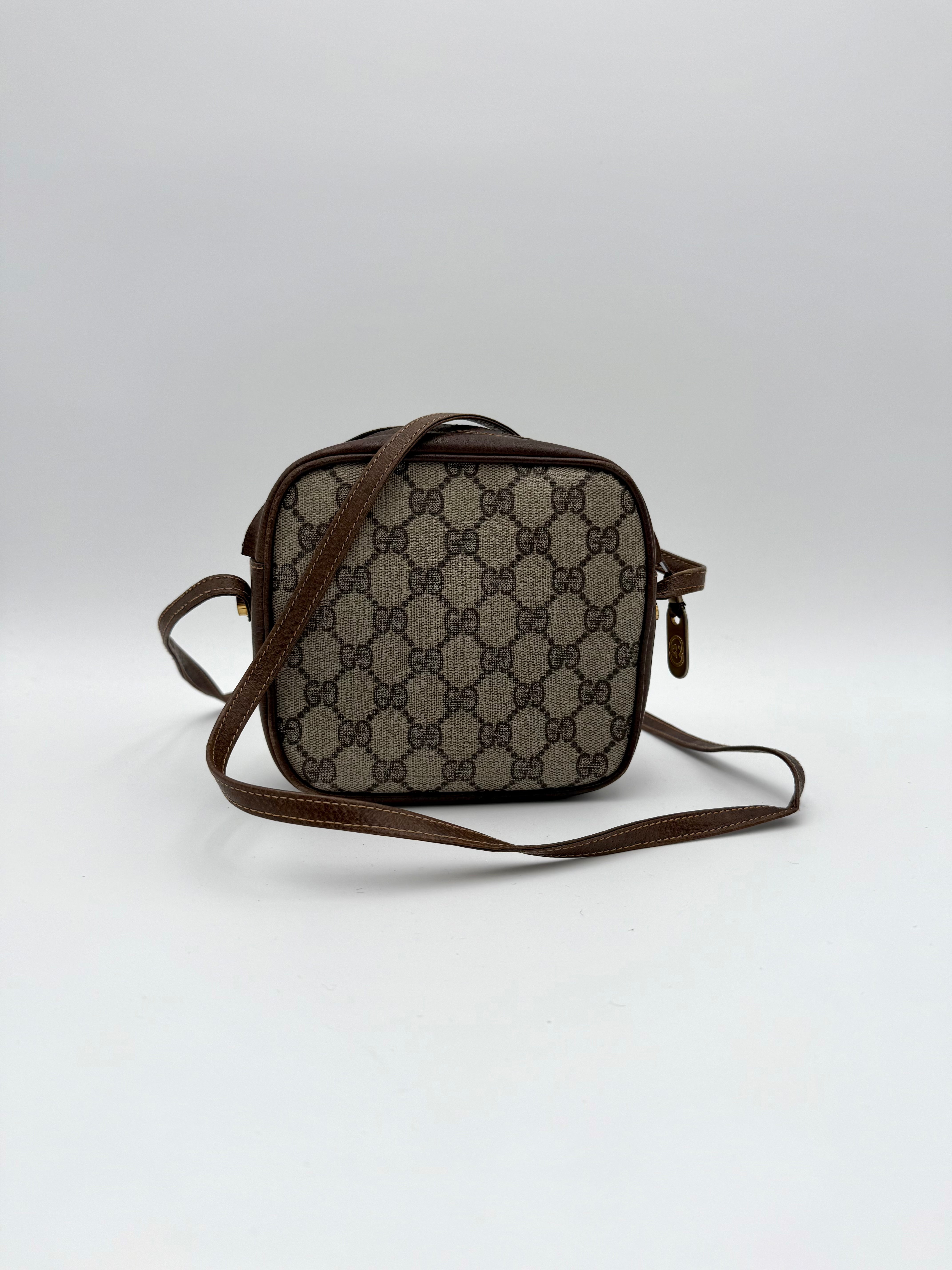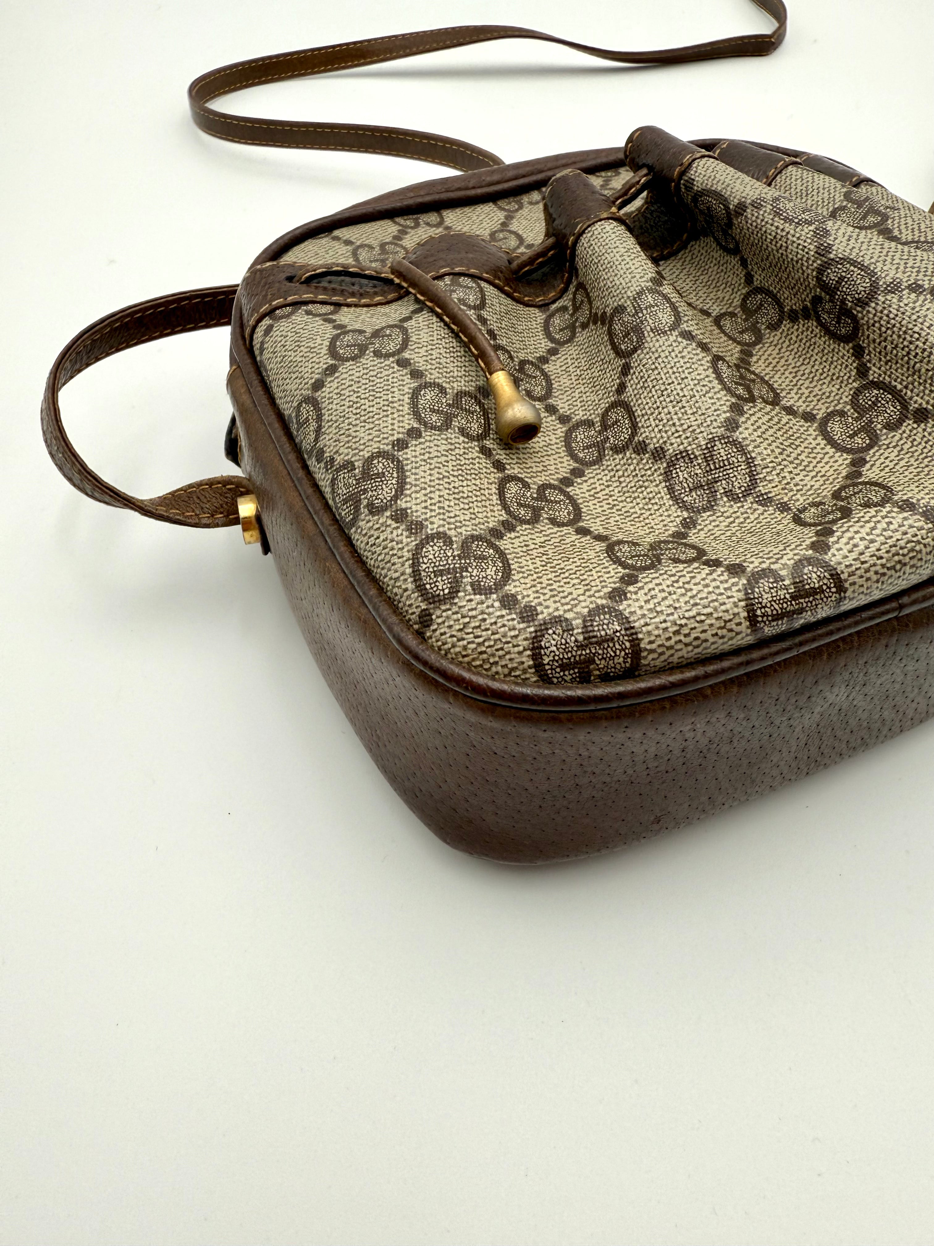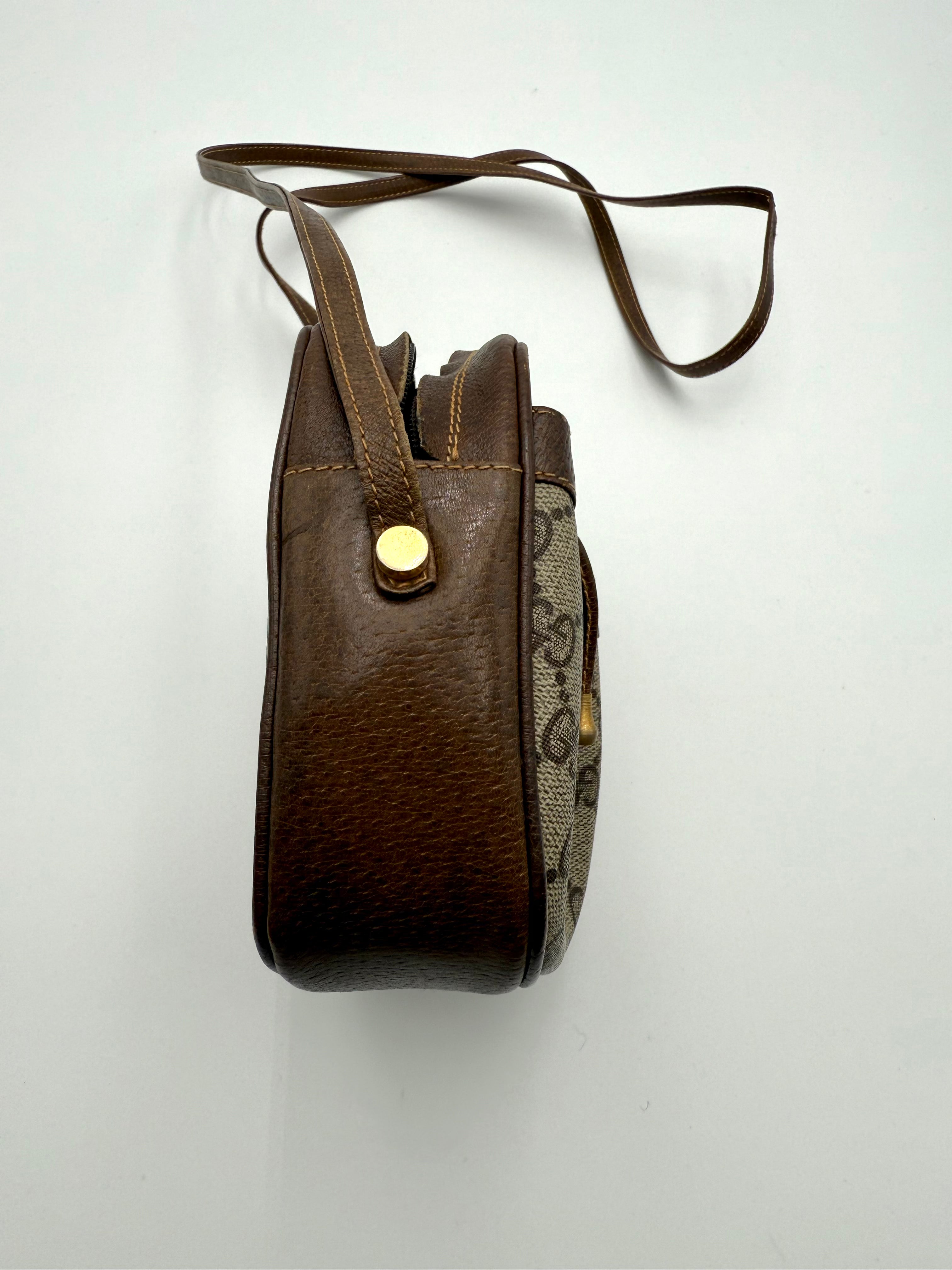 Tweedehands GUCCI canvas bag in een beige met bruine kleur. De tas is van canvas met leren hengsels en met gouden hardware. De tas sluit met een rits, beschikt over een voorvakje en één vak aan de binnenkant. Het item verkeert in een zeer goede vintage staat, met algemene gebruikssporen. De tas wordt geleverd in onze mooie Moon flower dustbag.