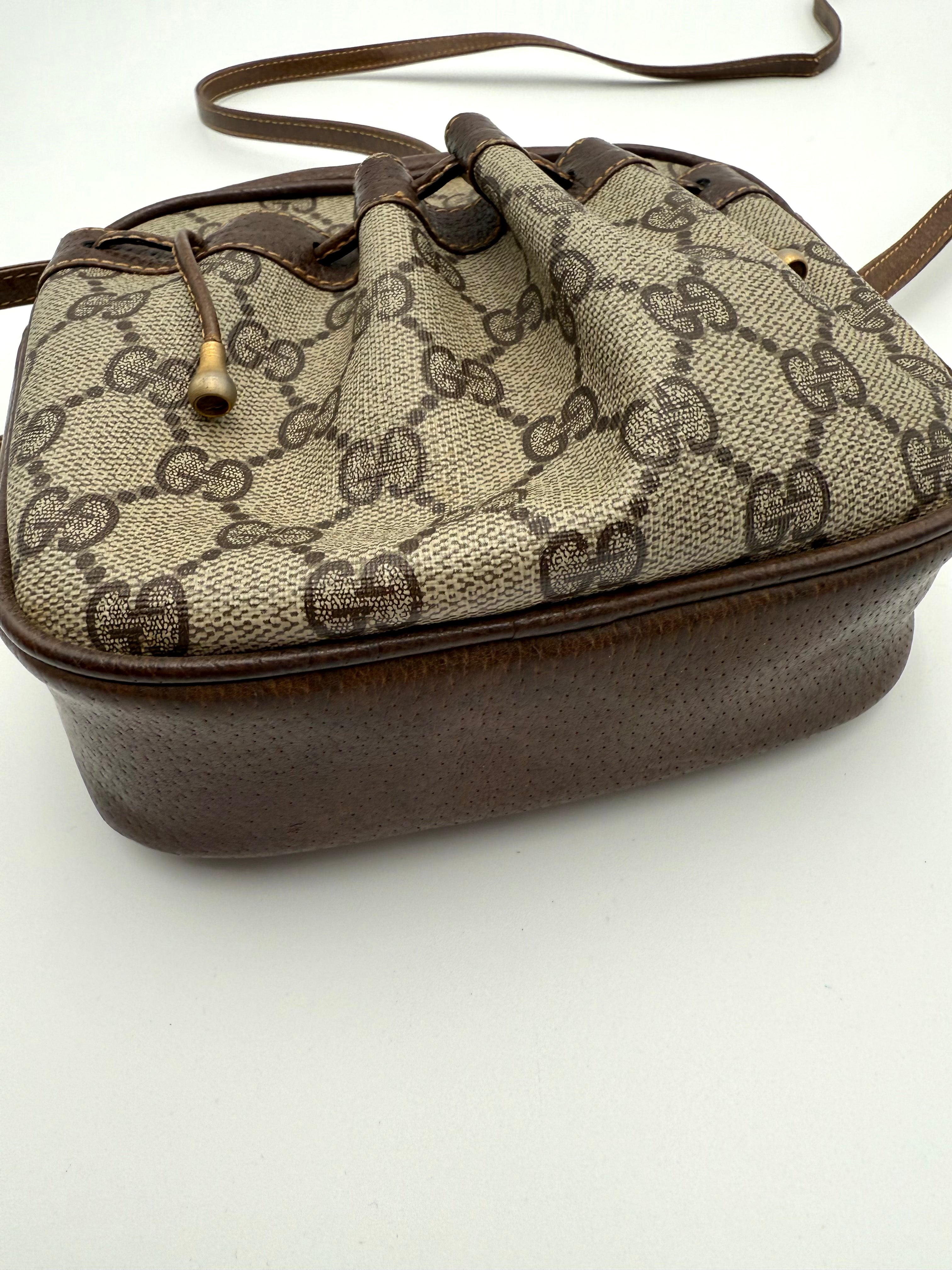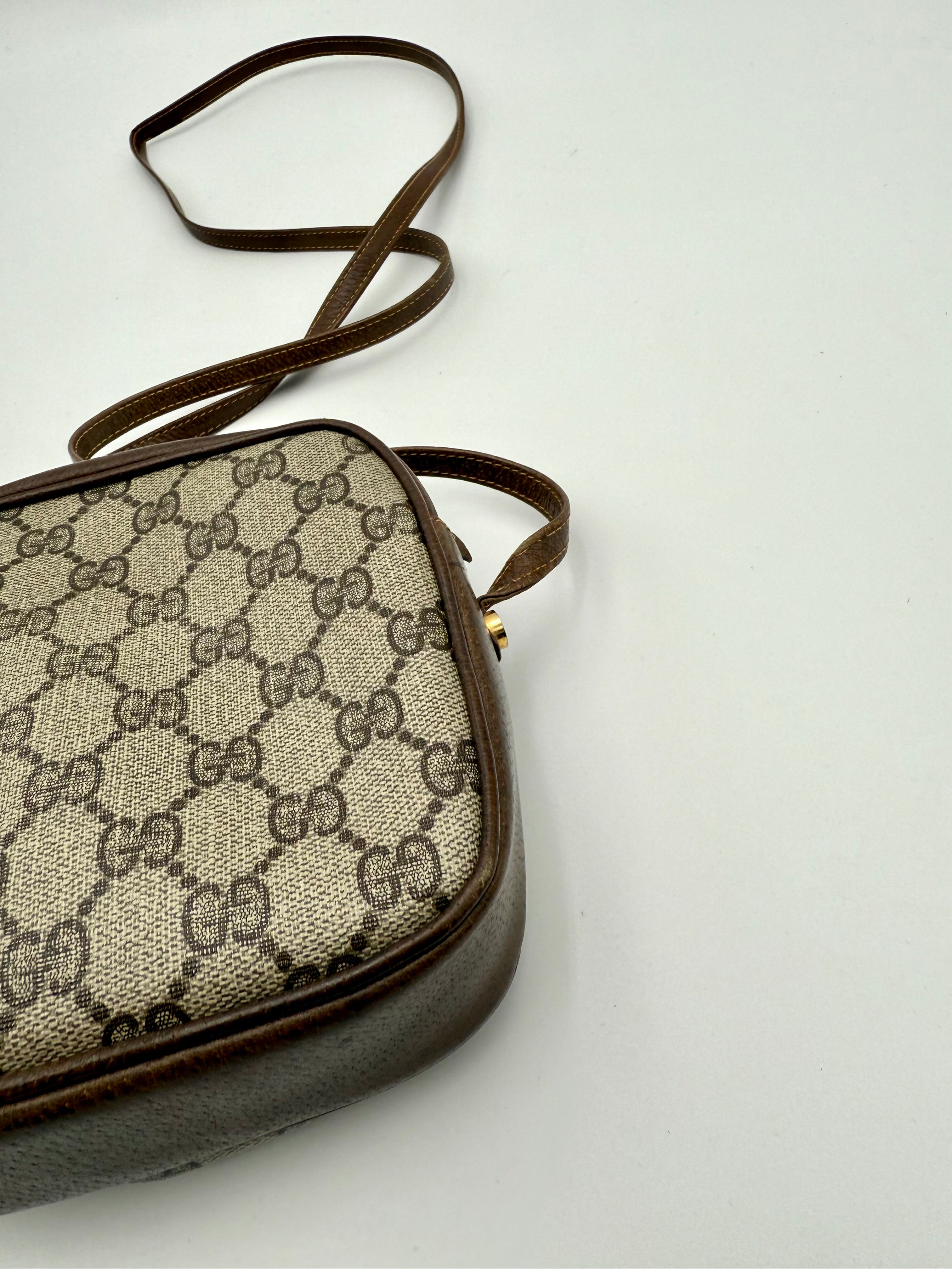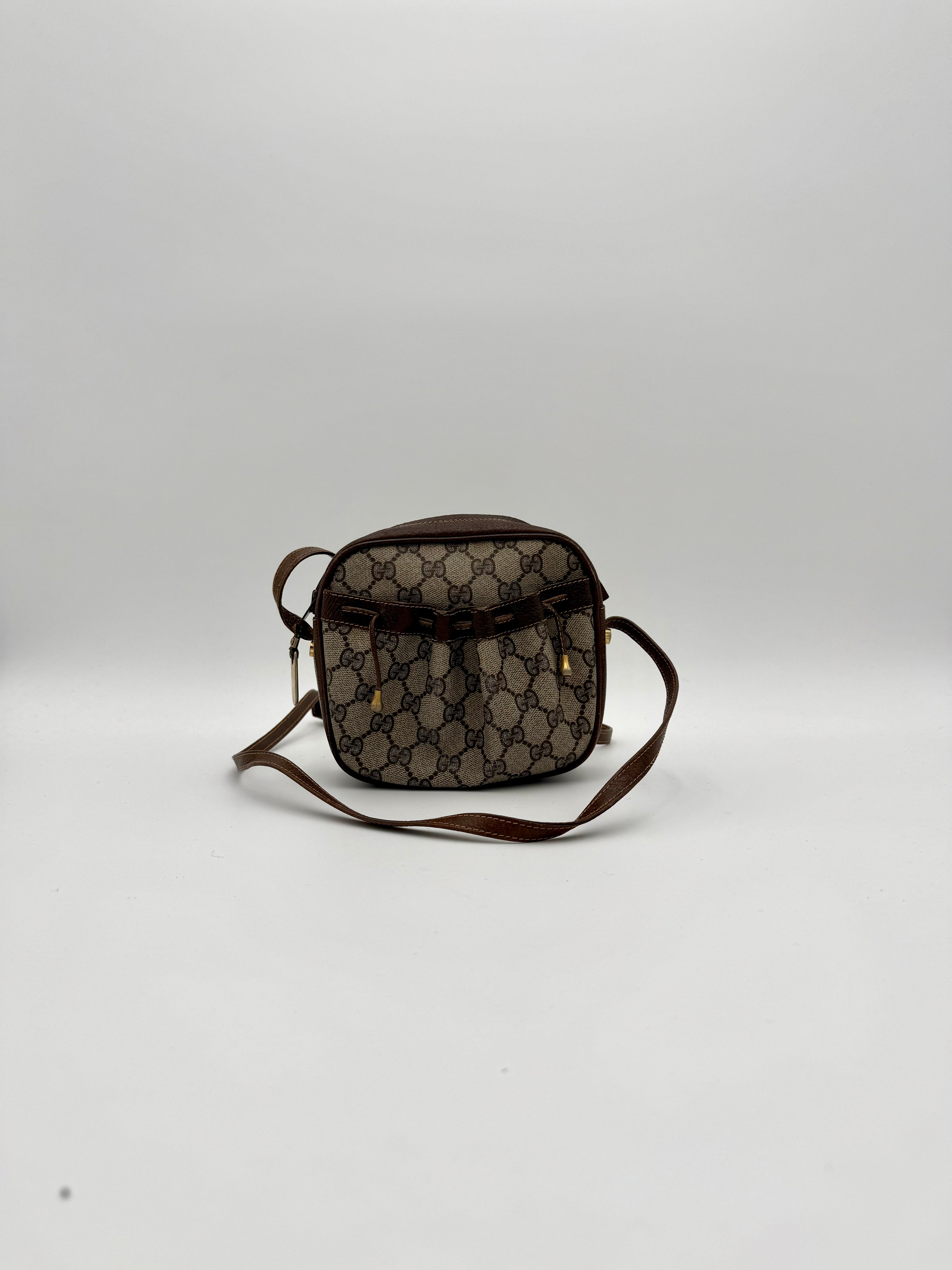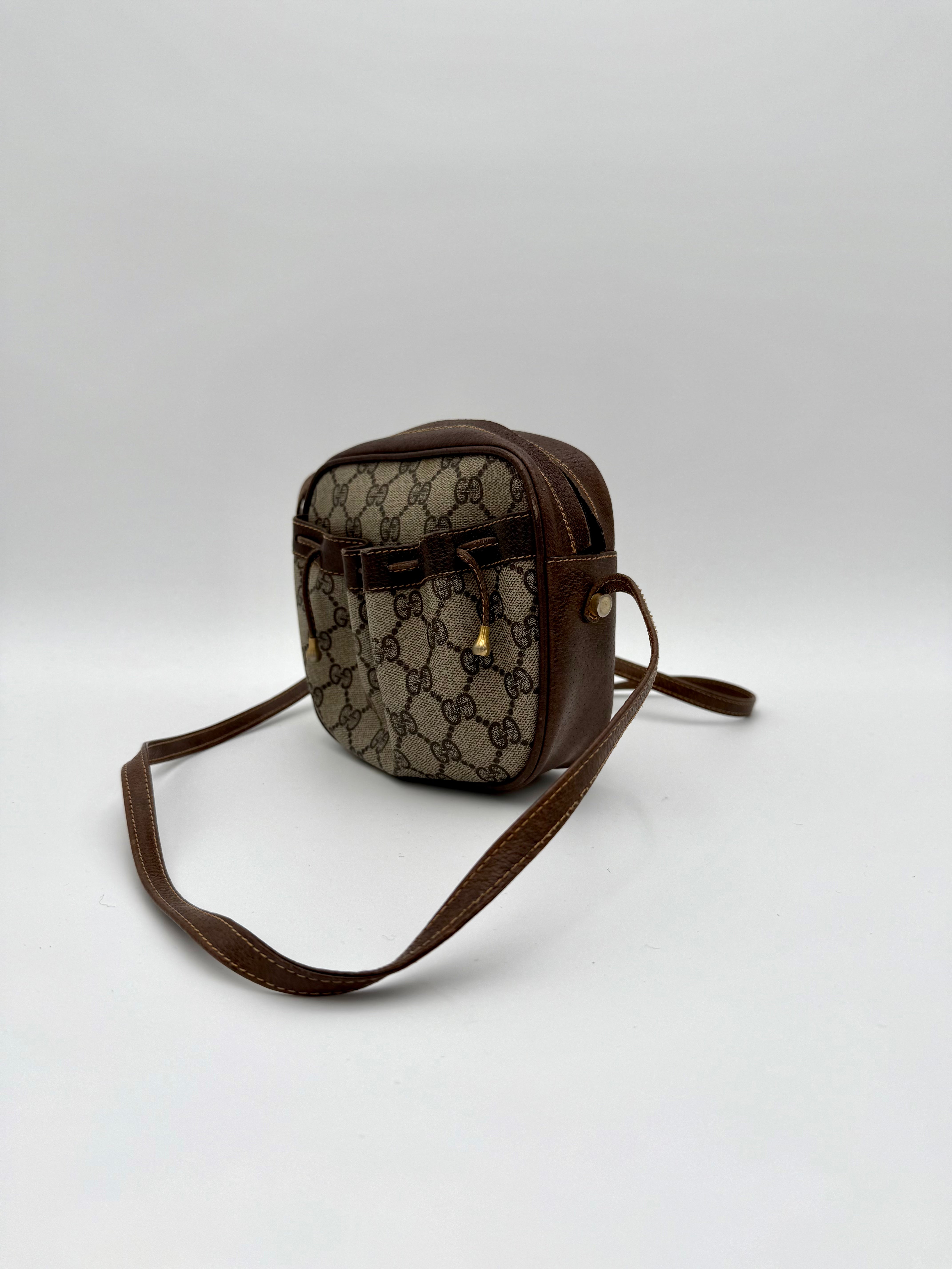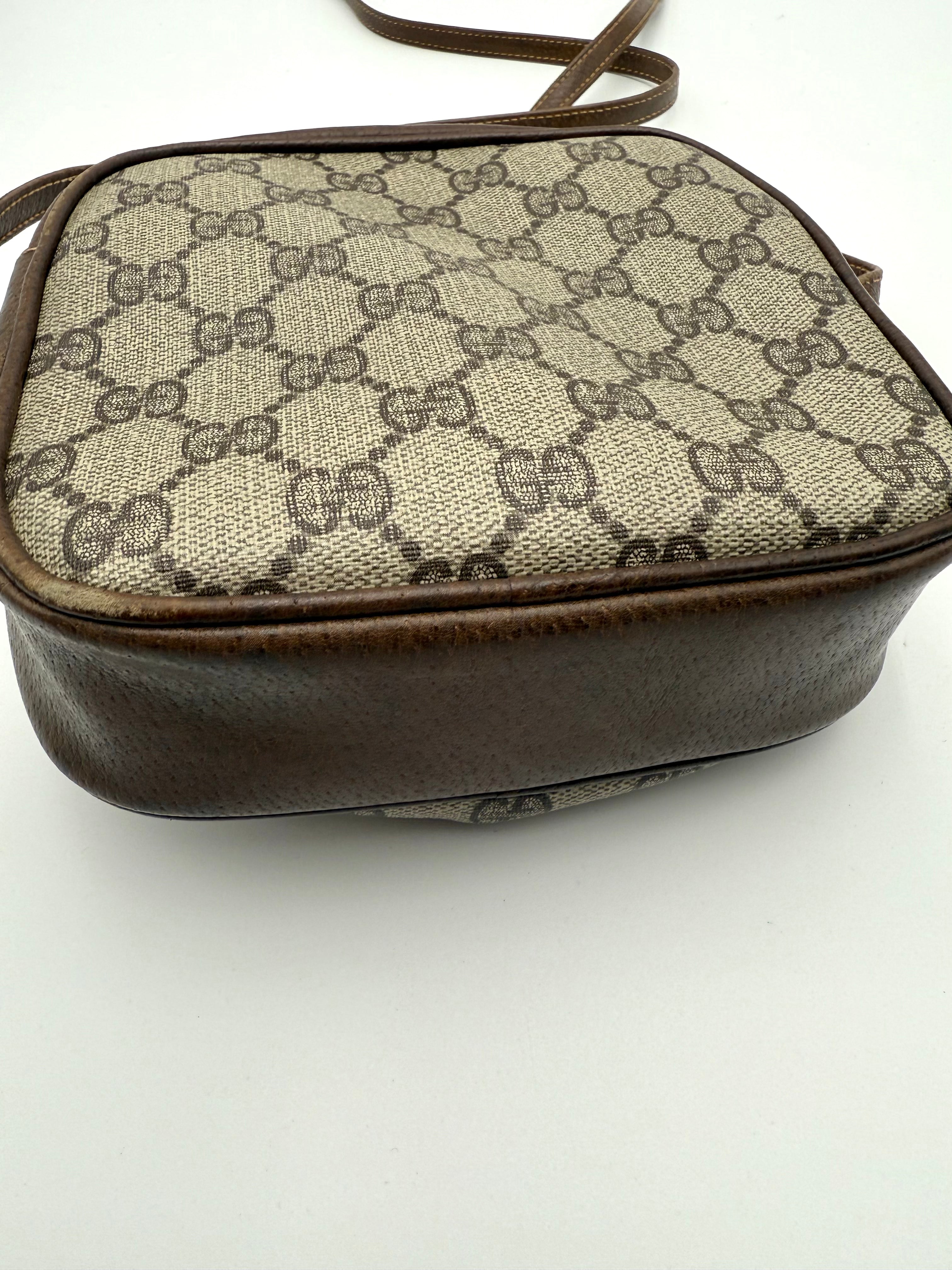 Tweedehands GUCCI canvas bag in een beige met bruine kleur. De tas is van canvas met leren hengsels en met gouden hardware. De tas sluit met een rits, beschikt over een voorvakje en één vak aan de binnenkant. Het item verkeert in een zeer goede vintage staat, met algemene gebruikssporen. De tas wordt geleverd in onze mooie Moon flower dustbag.