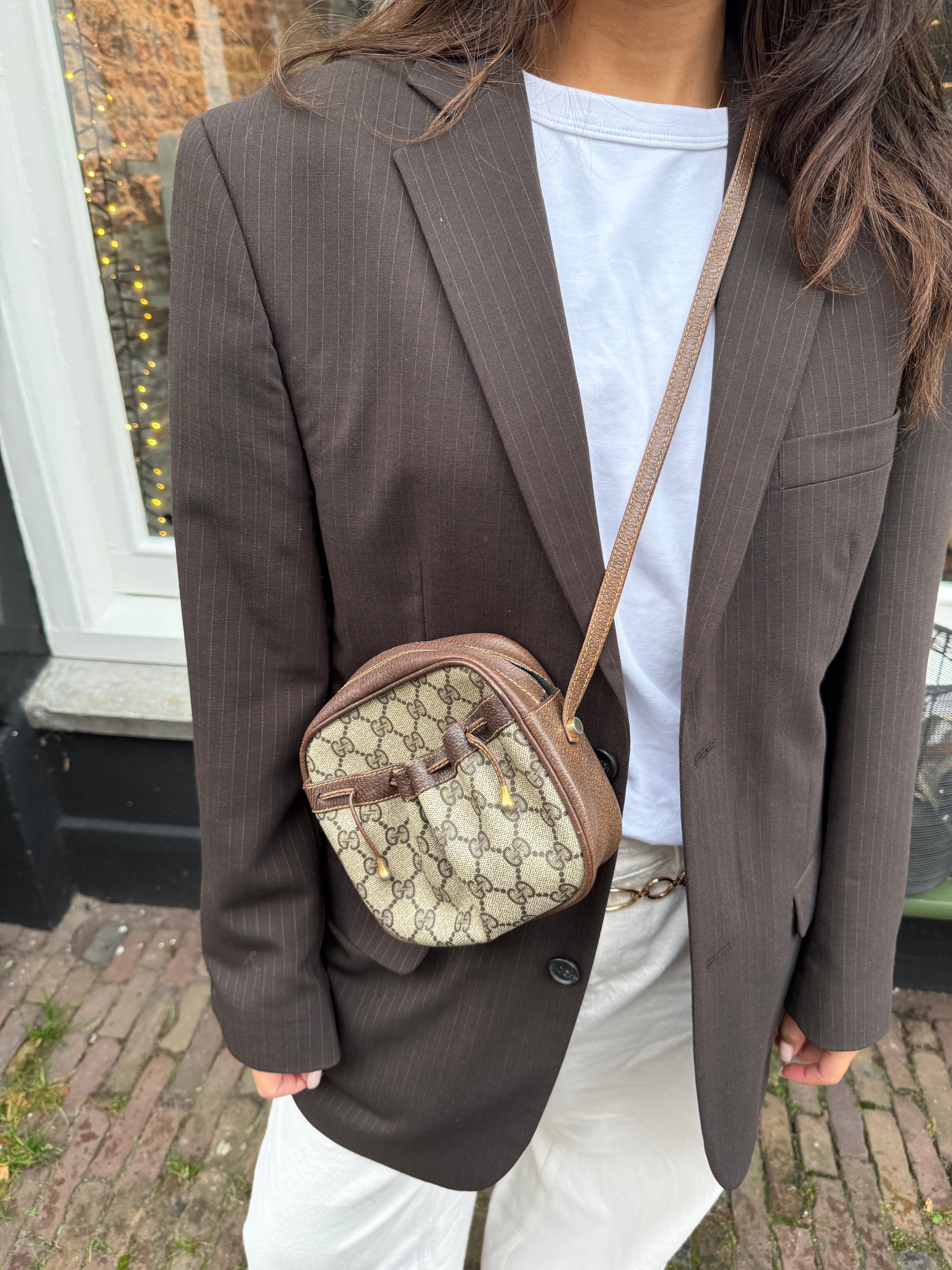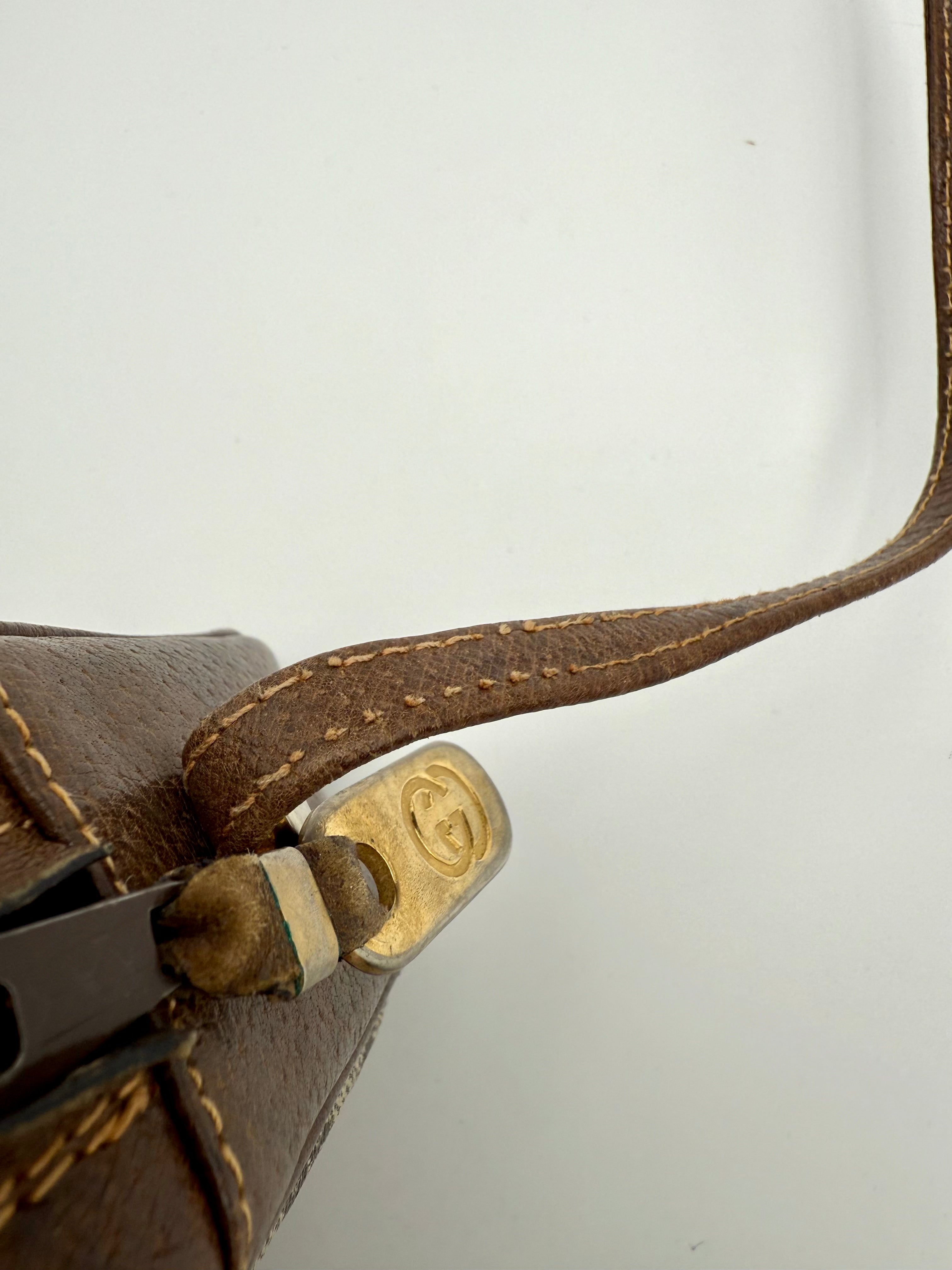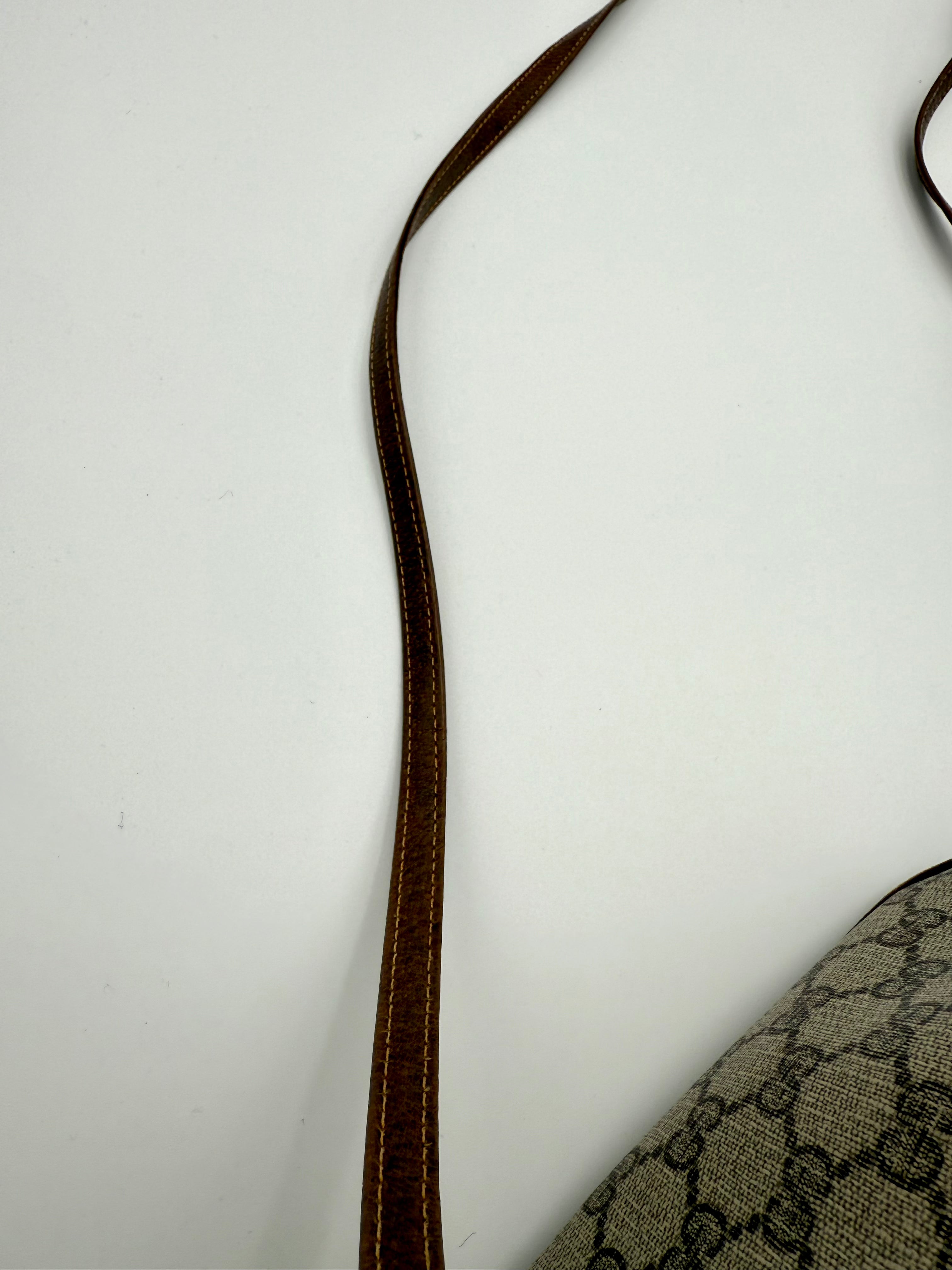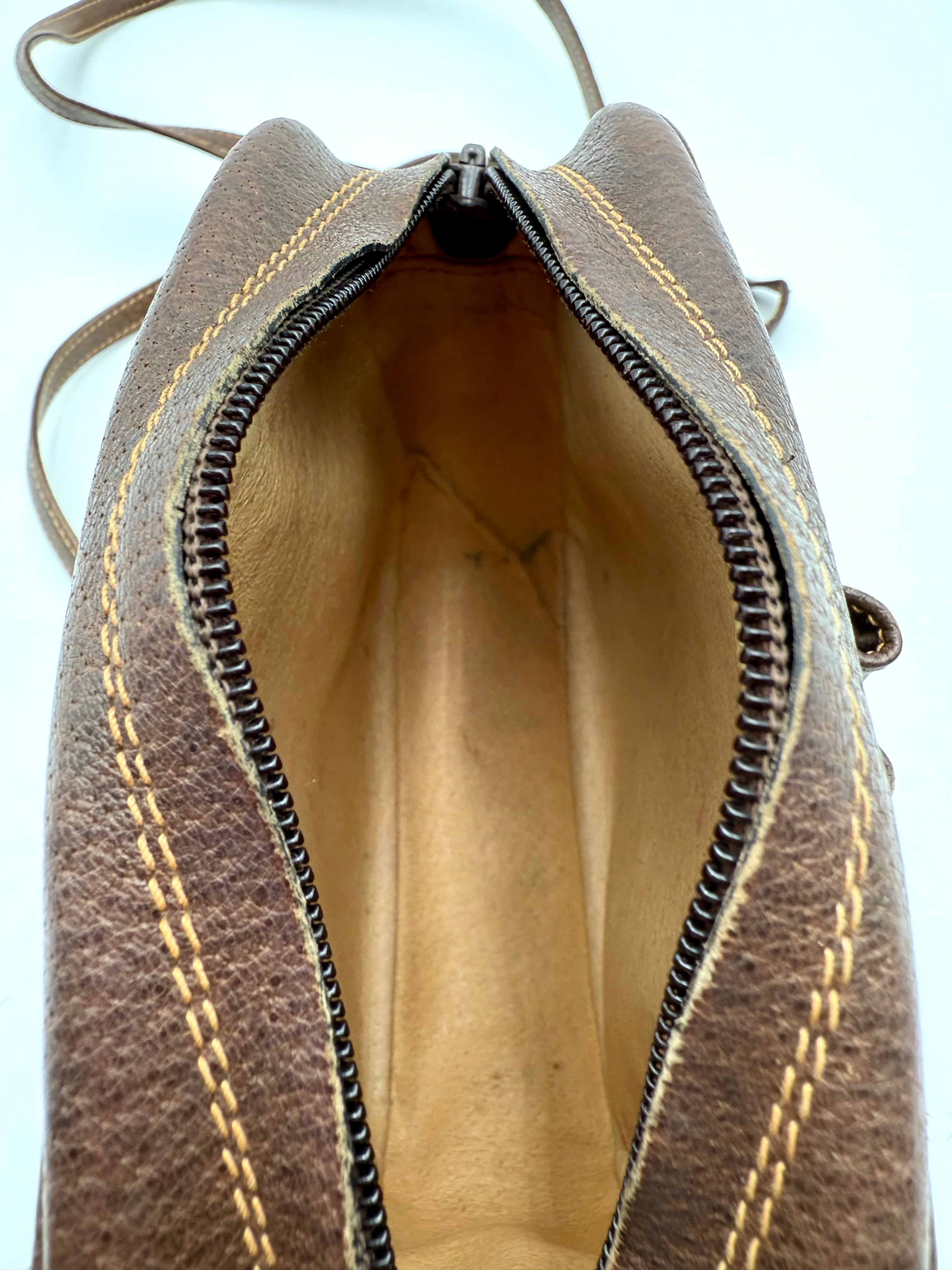 Tweedehands GUCCI canvas bag in een beige met bruine kleur. De tas is van canvas met leren hengsels en met gouden hardware. De tas sluit met een rits, beschikt over een voorvakje en één vak aan de binnenkant. Het item verkeert in een zeer goede vintage staat, met algemene gebruikssporen. De tas wordt geleverd in onze mooie Moon flower dustbag.