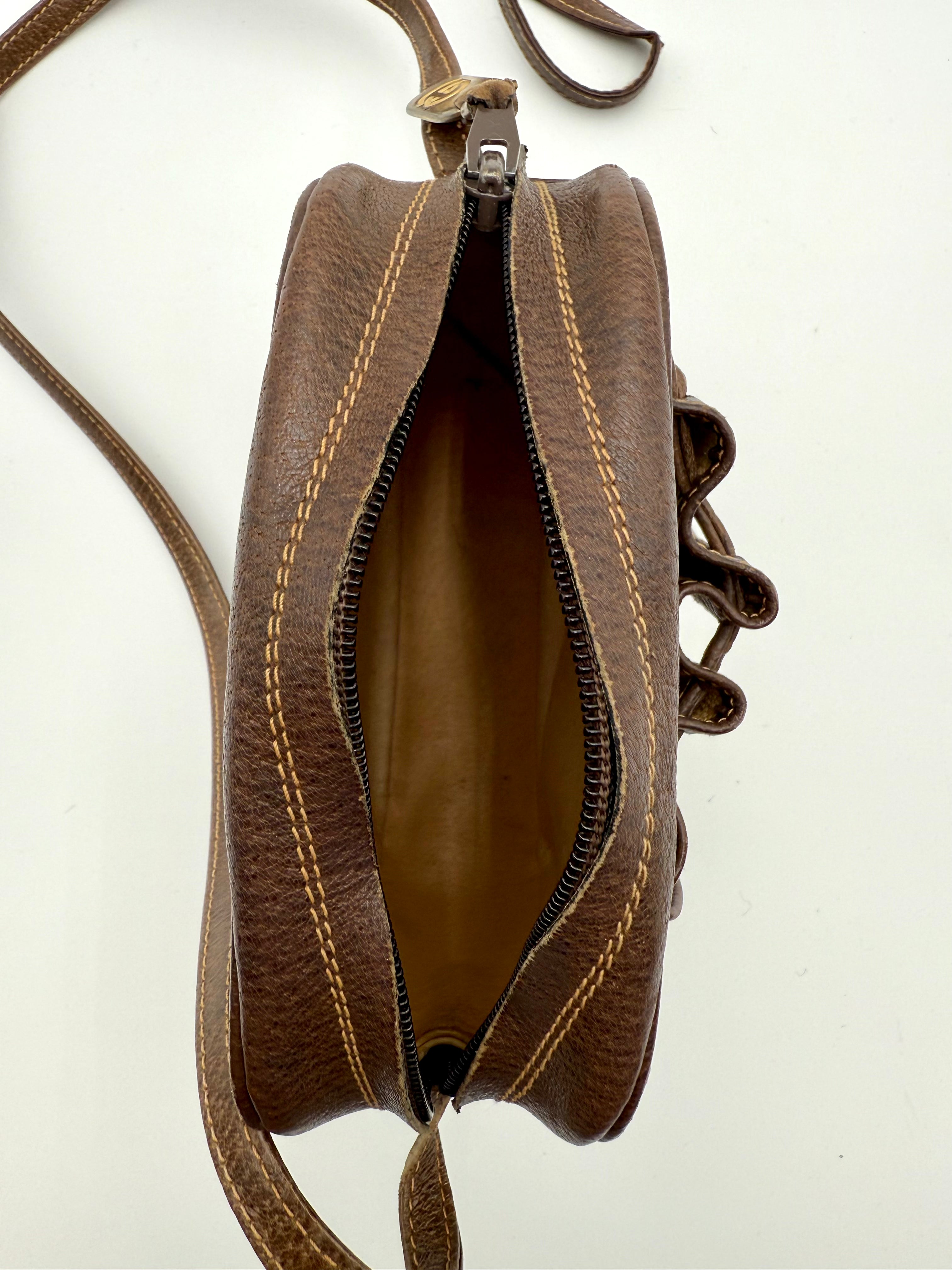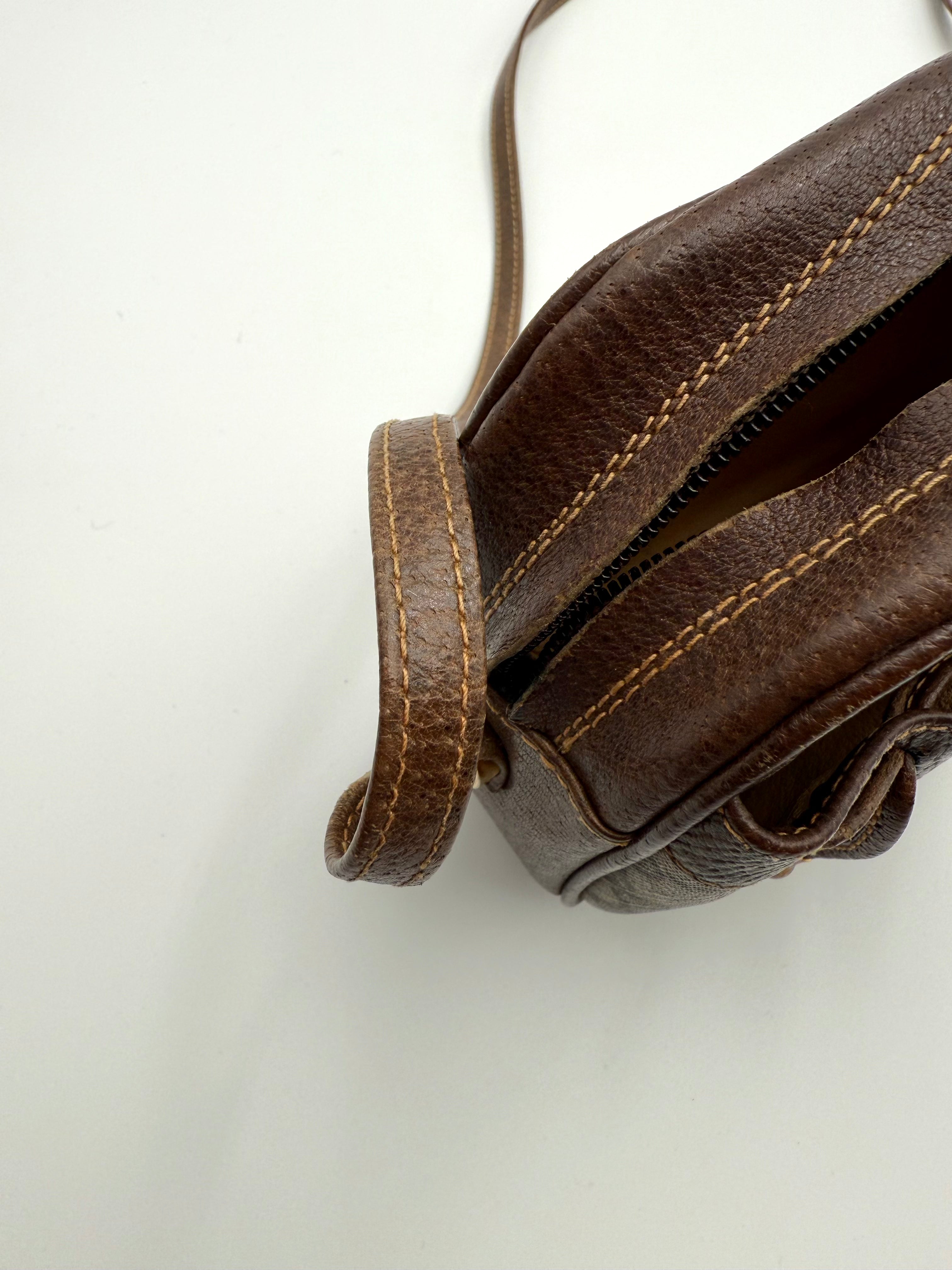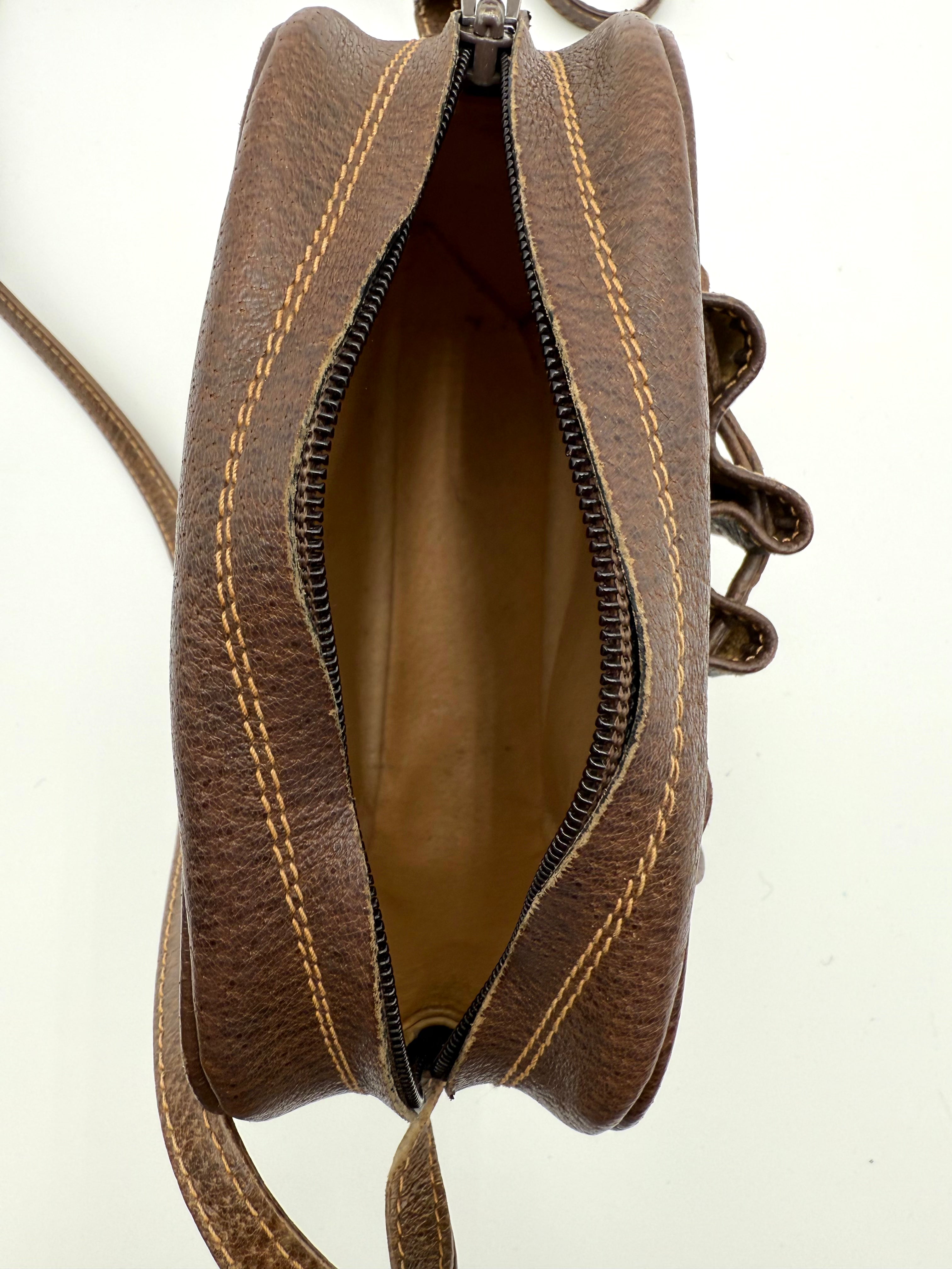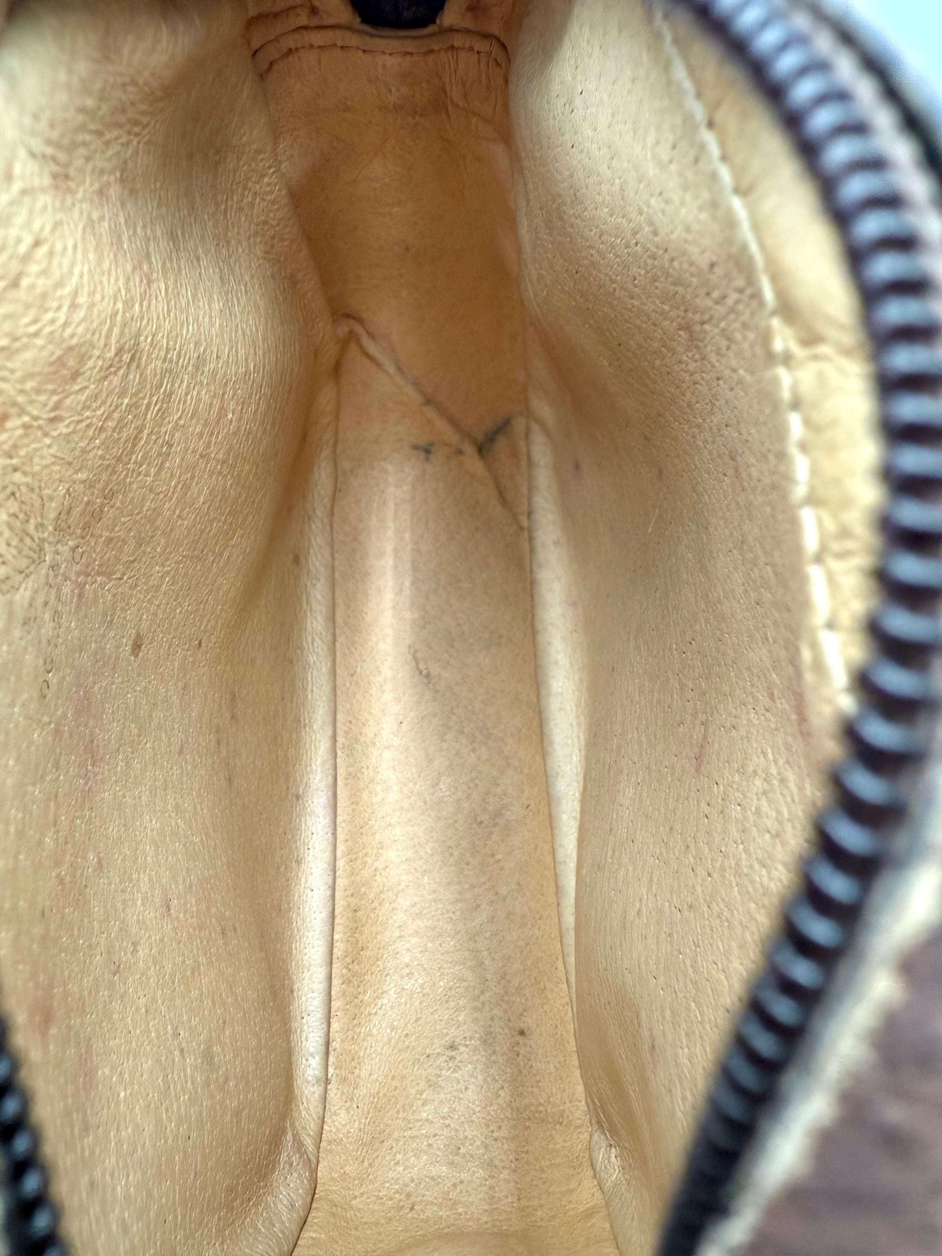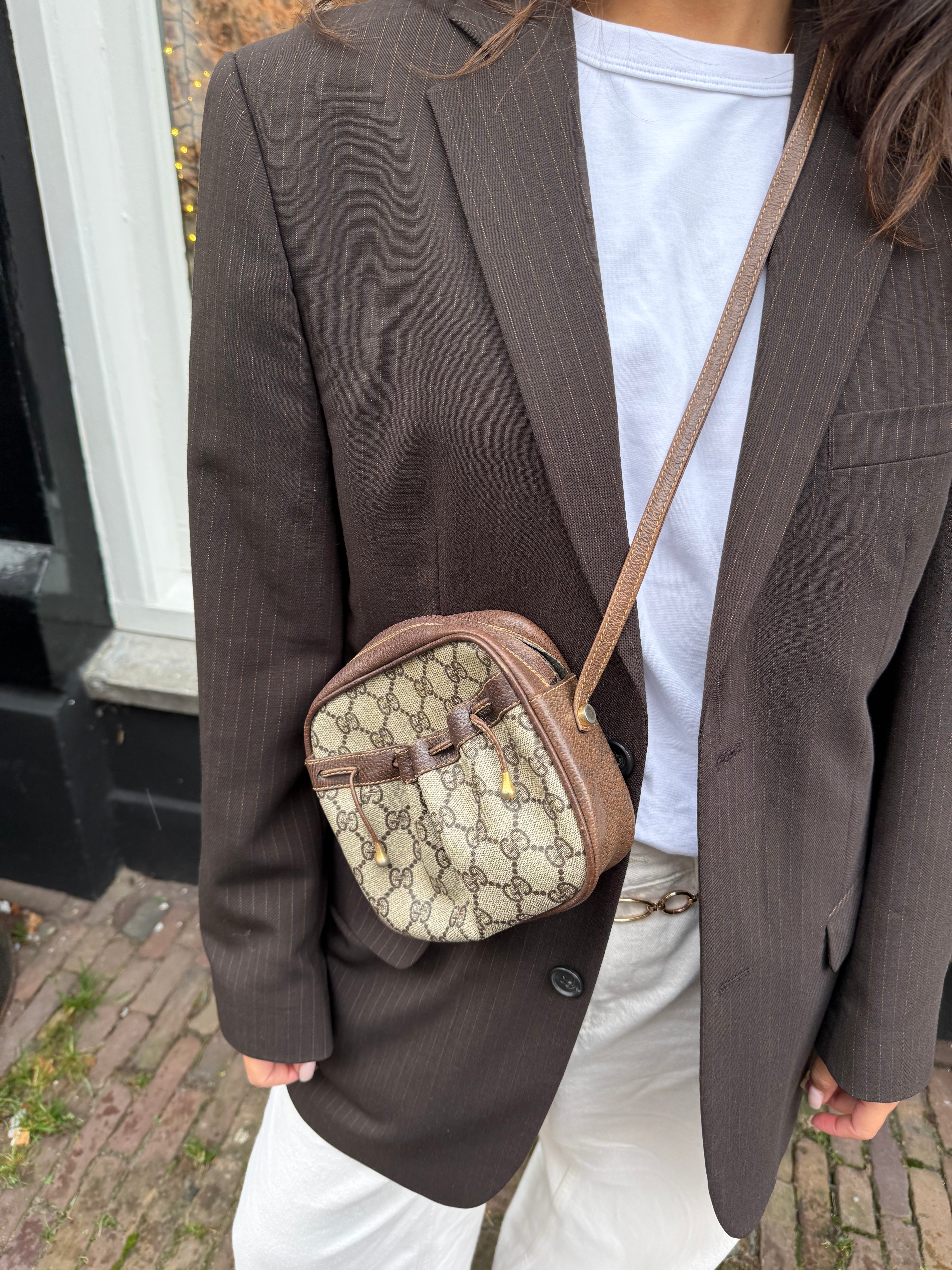 Tweedehands GUCCI canvas bag in een beige met bruine kleur. De tas is van canvas met leren hengsels en met gouden hardware. De tas sluit met een rits, beschikt over een voorvakje en één vak aan de binnenkant. Het item verkeert in een zeer goede vintage staat, met algemene gebruikssporen. De tas wordt geleverd in onze mooie Moon flower dustbag.