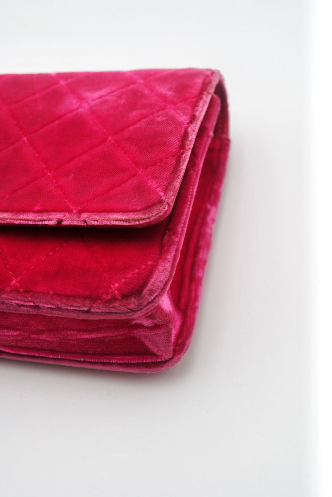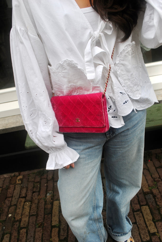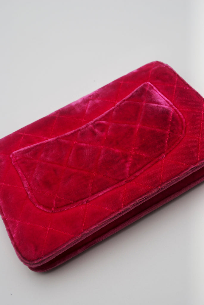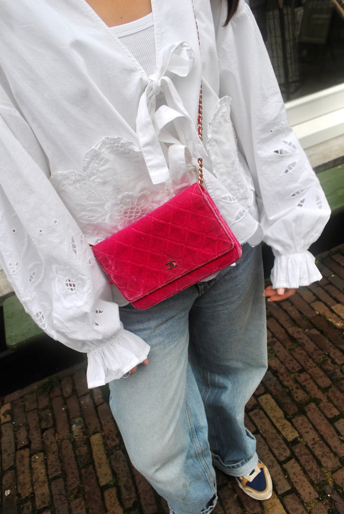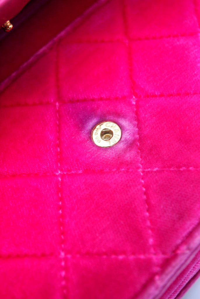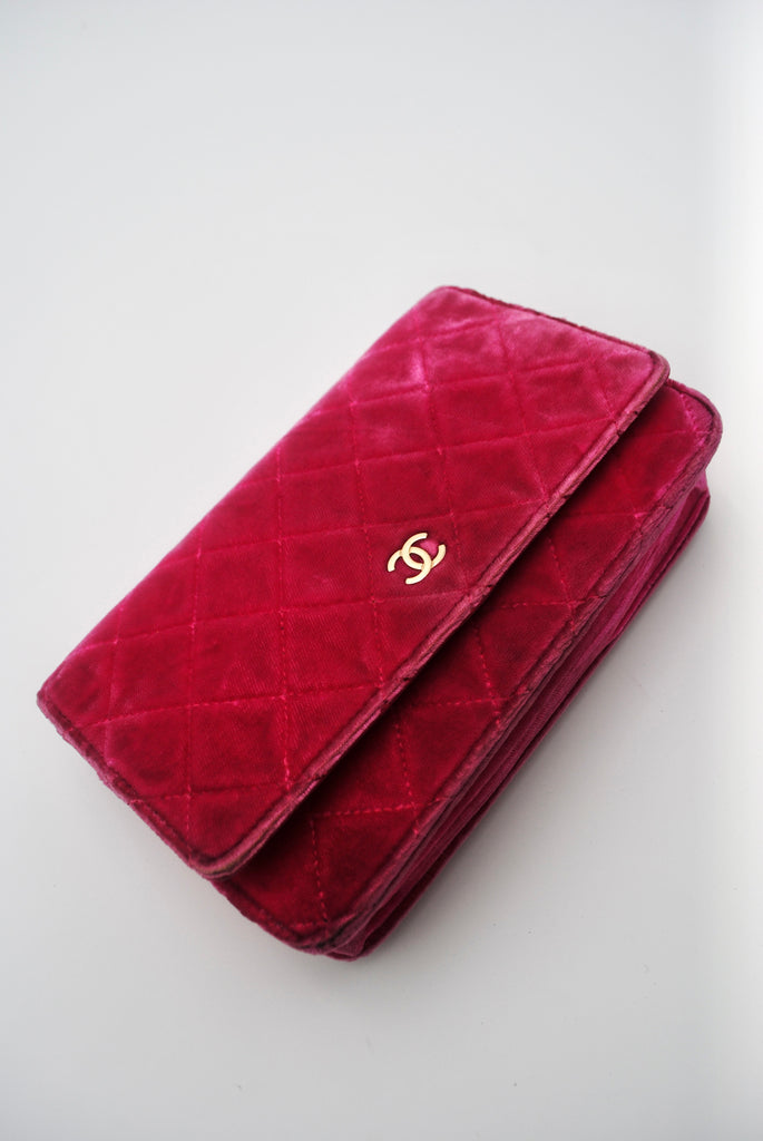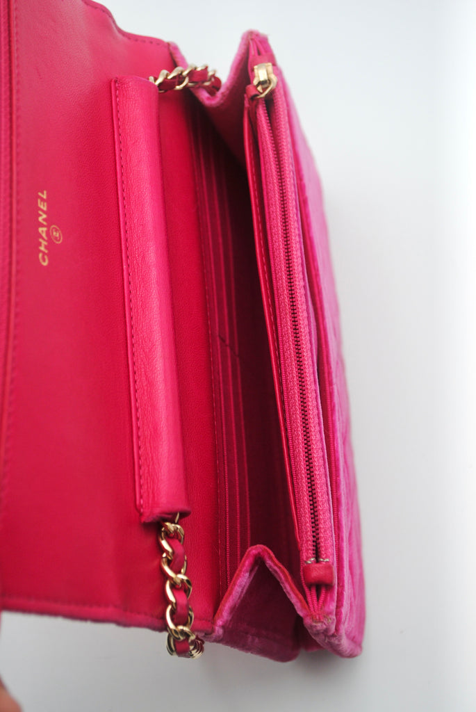 Tweedehands CHANEL Matelasse wallet on a chain bag in een prachtige roze kleur van velours stof. De tas heeft gouden hardware en sluit met een drukknoop. De tas beschikt over twee binnenvakjes met rits en verschillende vakjes waar je ook je pasjes in kan plaatsten. Je hebt geen portemonnee meer nodig met deze tas! De tas kan crossbody of als schoudertas gedragen worden. De originele sticker is nog aanwezig met code: 2149425. Het item verkeert van buiten in een zeer goede vintage staat, met algemene gebruikssporen. De tas wordt geleverd met het originele certificaat en in onze mooie Moon flower dustbag.