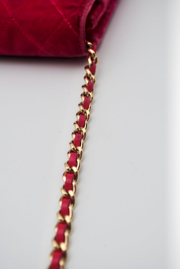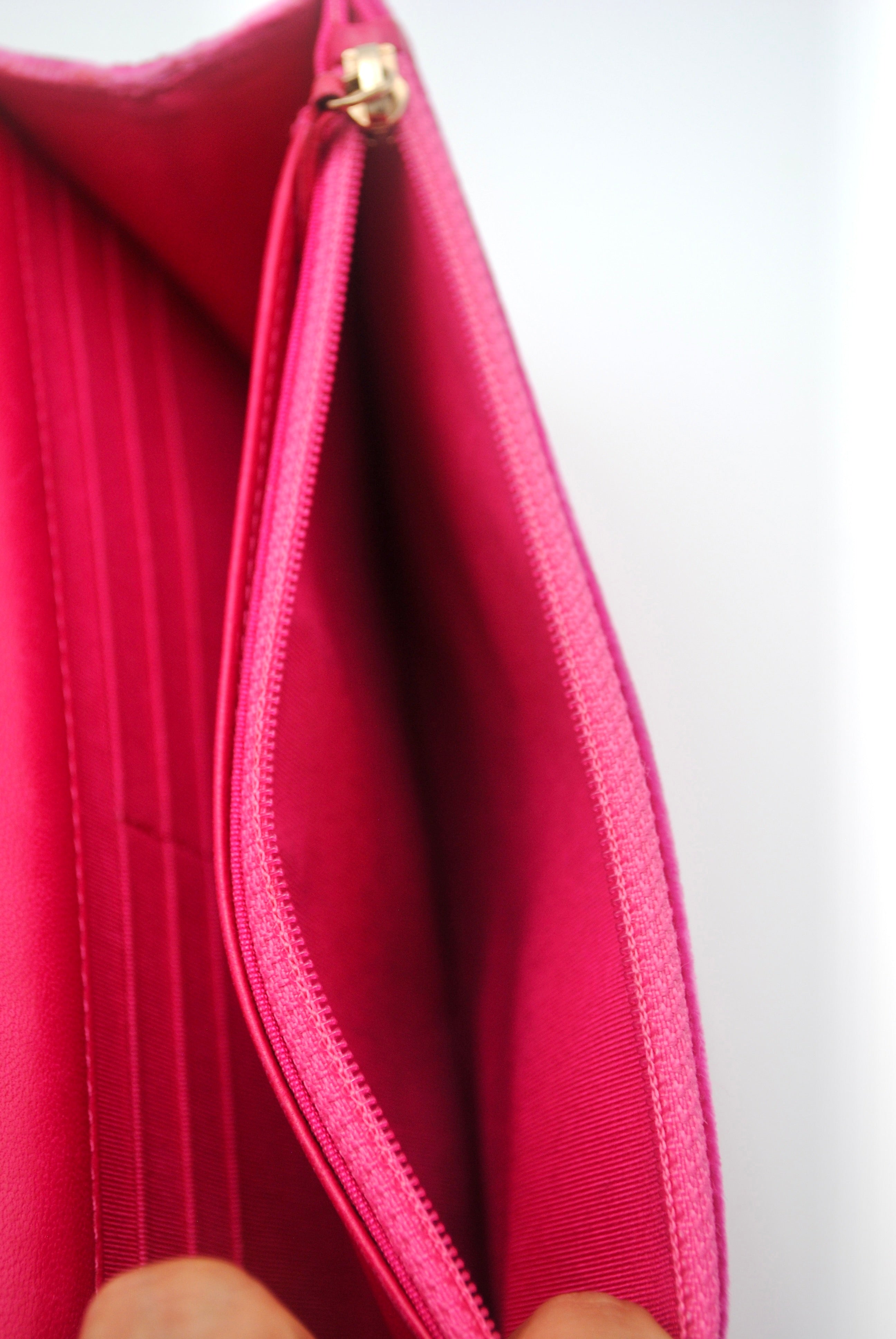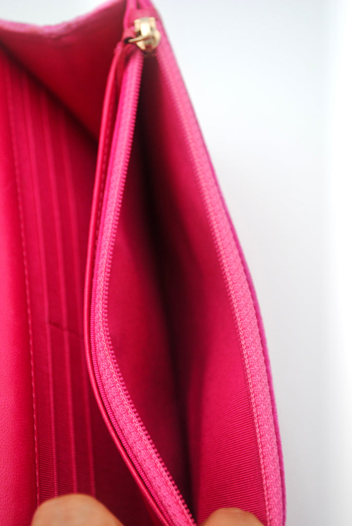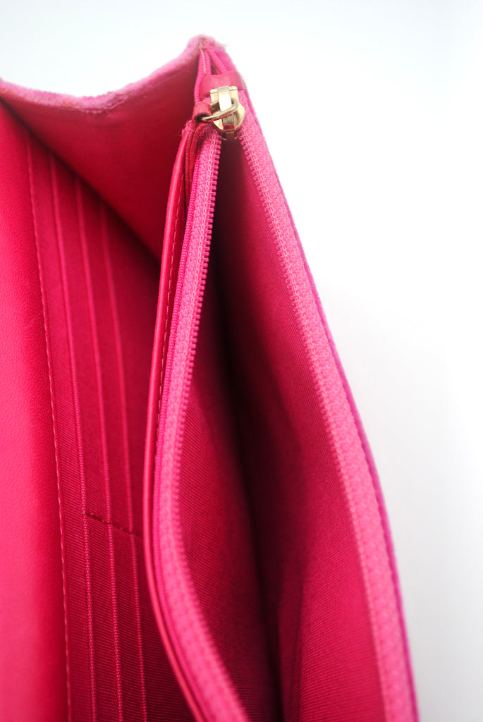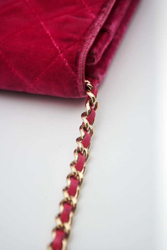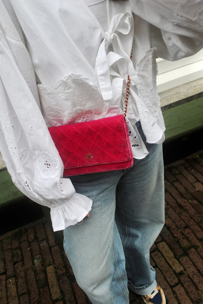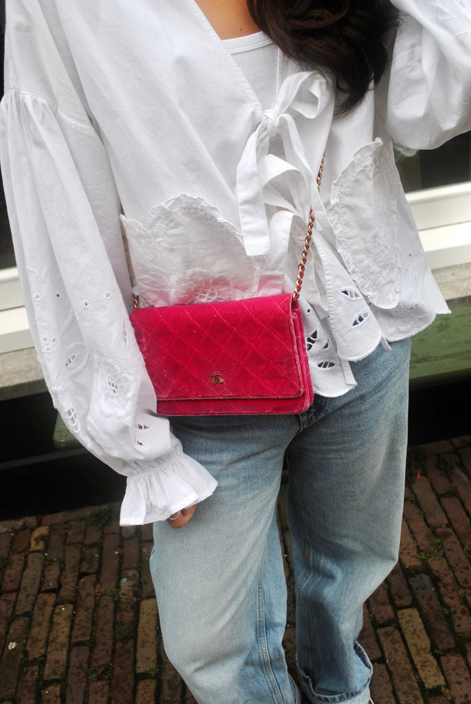 Tweedehands CHANEL Matelasse wallet on a chain bag in een prachtige roze kleur van velours stof. De tas heeft gouden hardware en sluit met een drukknoop. De tas beschikt over twee binnenvakjes met rits en verschillende vakjes waar je ook je pasjes in kan plaatsten. Je hebt geen portemonnee meer nodig met deze tas! De tas kan crossbody of als schoudertas gedragen worden. De originele sticker is nog aanwezig met code: 2149425. Het item verkeert van buiten in een zeer goede vintage staat, met algemene gebruikssporen. De tas wordt geleverd met het originele certificaat en in onze mooie Moon flower dustbag.