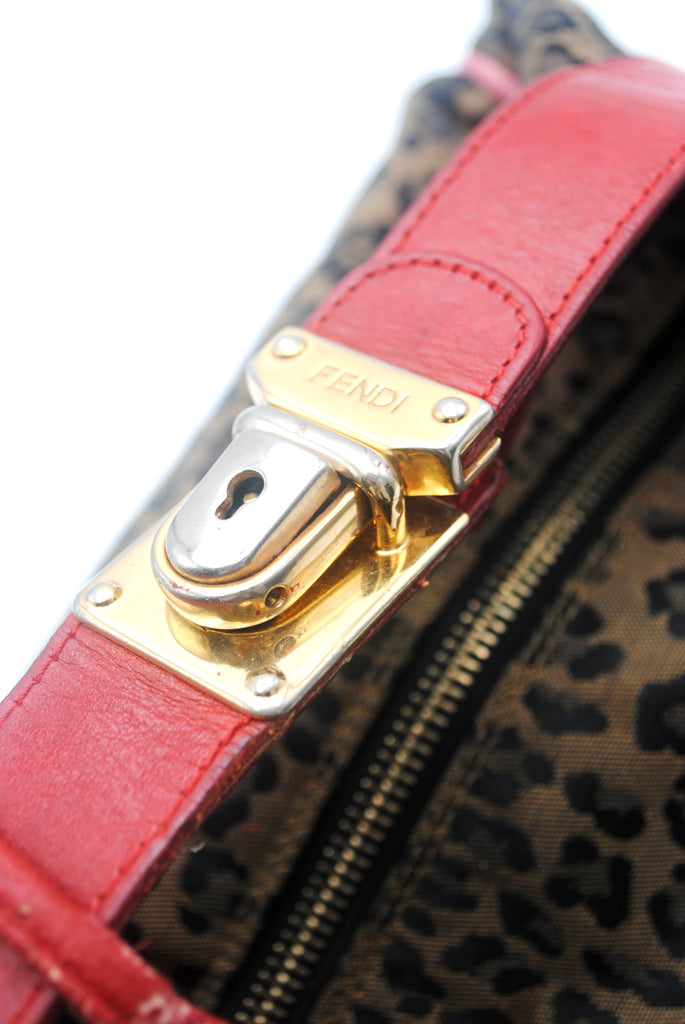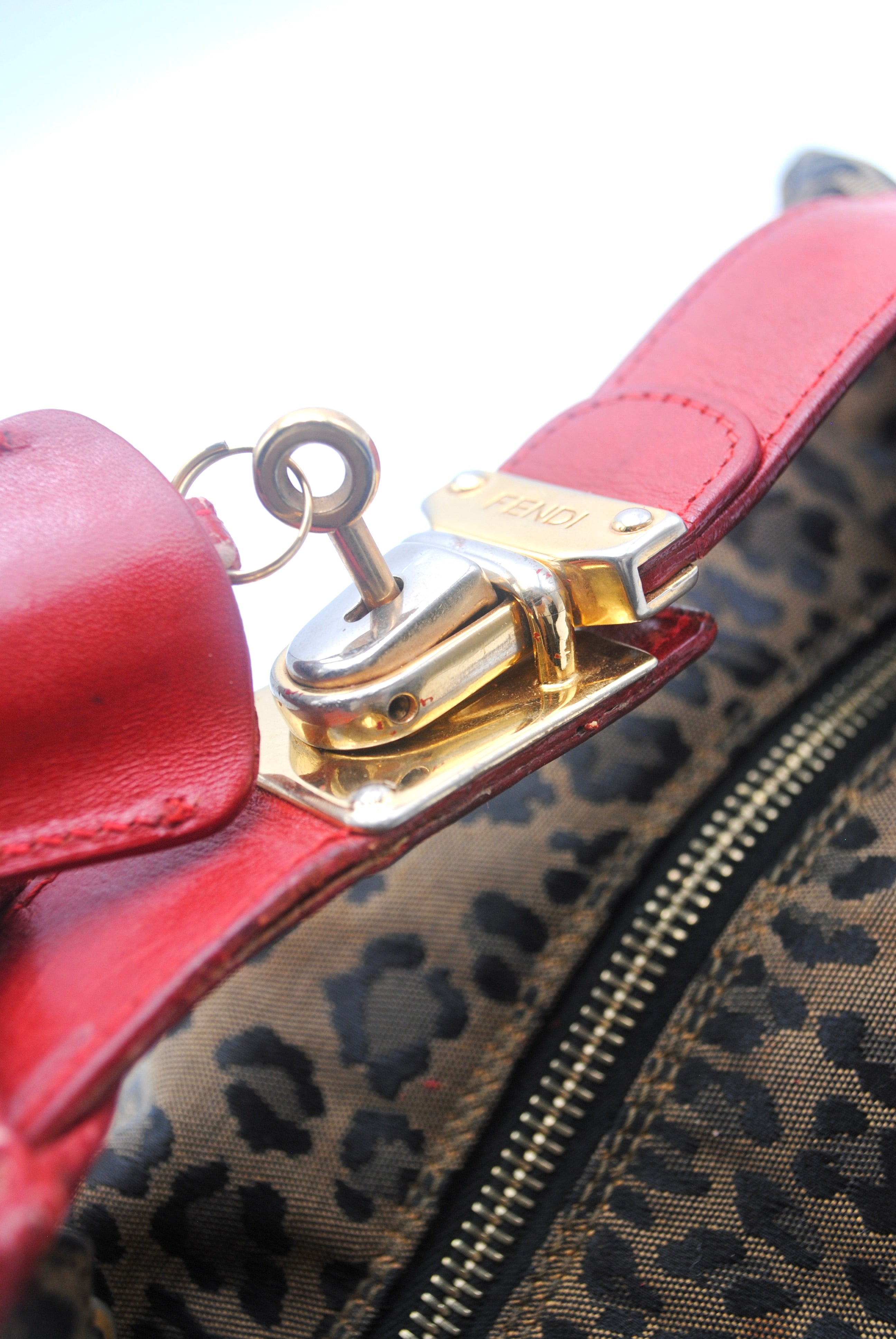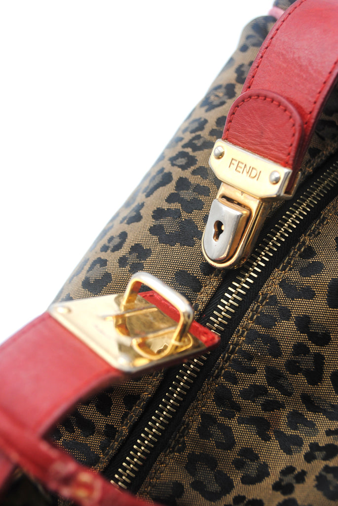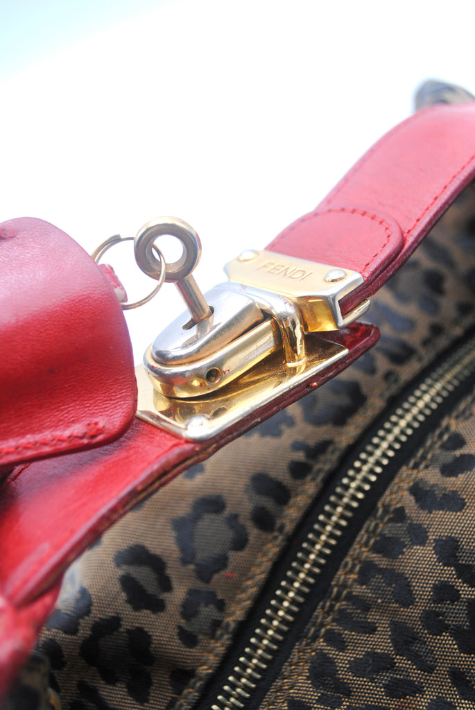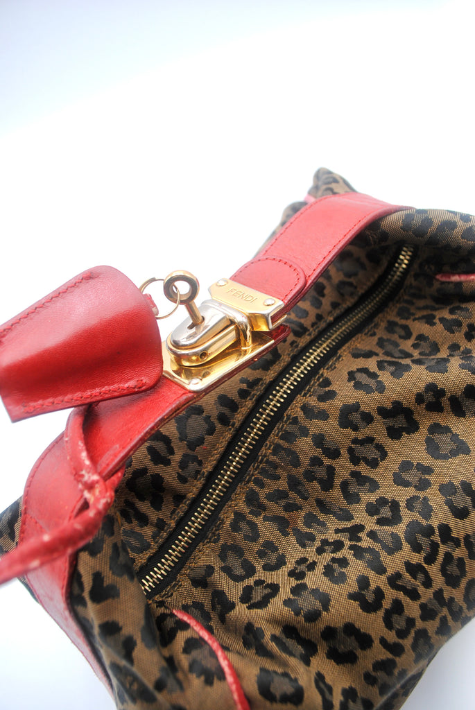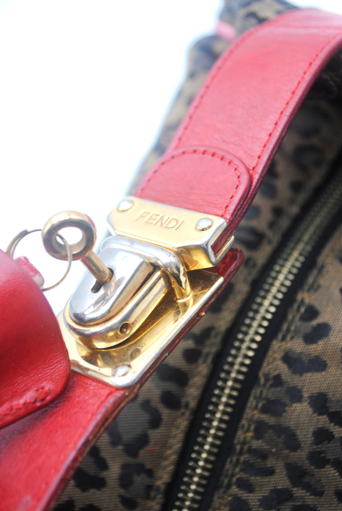 Tweedehands FENDI leopard bag met een rode leren strap met een slotje incl de sleutel, deze werkt ook nog. De tas sluit met een rits en heeft één binnenvakje met rits. Het item verkeert in een vintage staat, met gebruikssporen en wat slijtage. de tas wordt geleverd in onze mooie Moon flower dustbag.