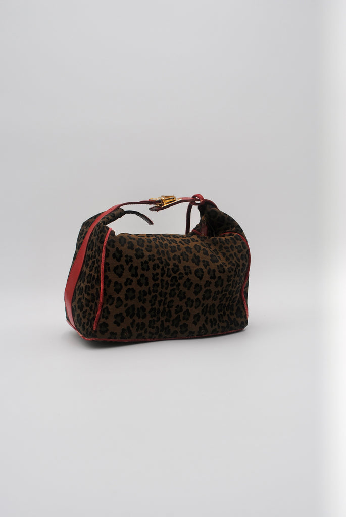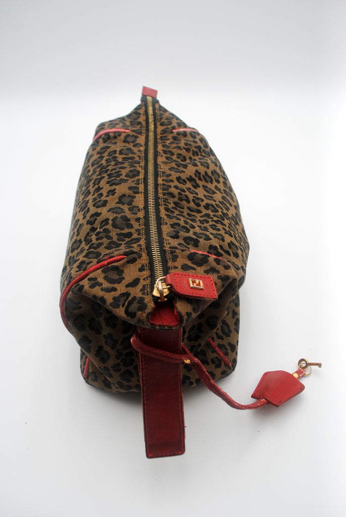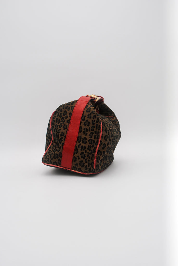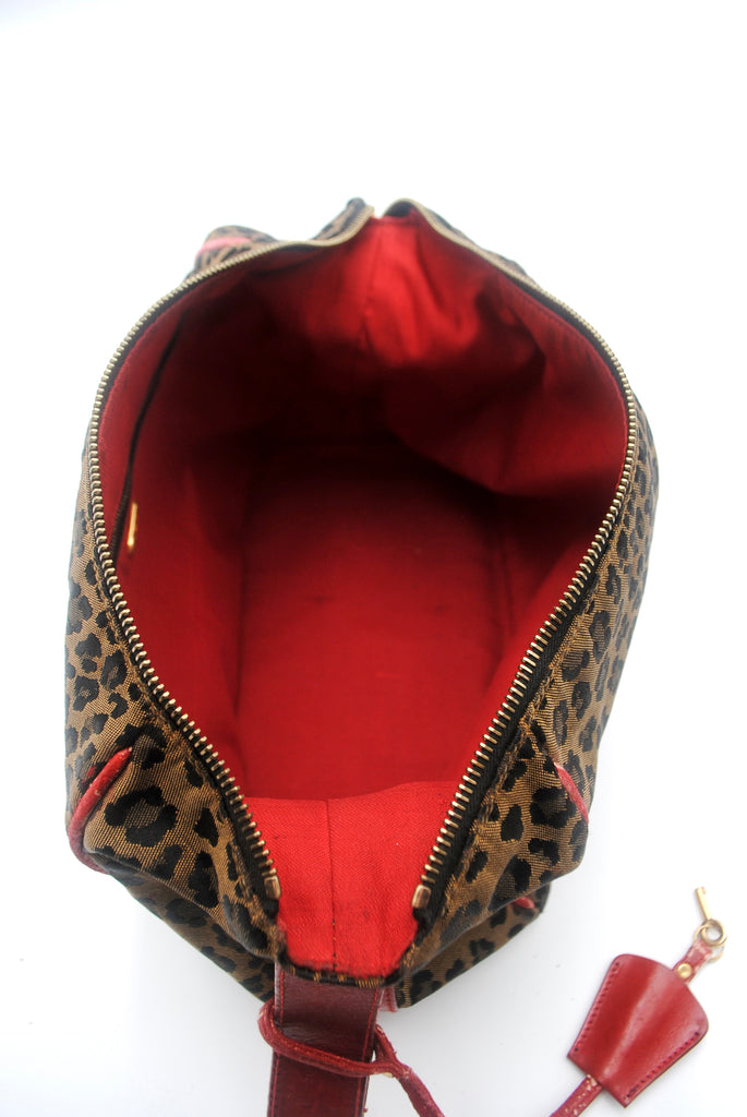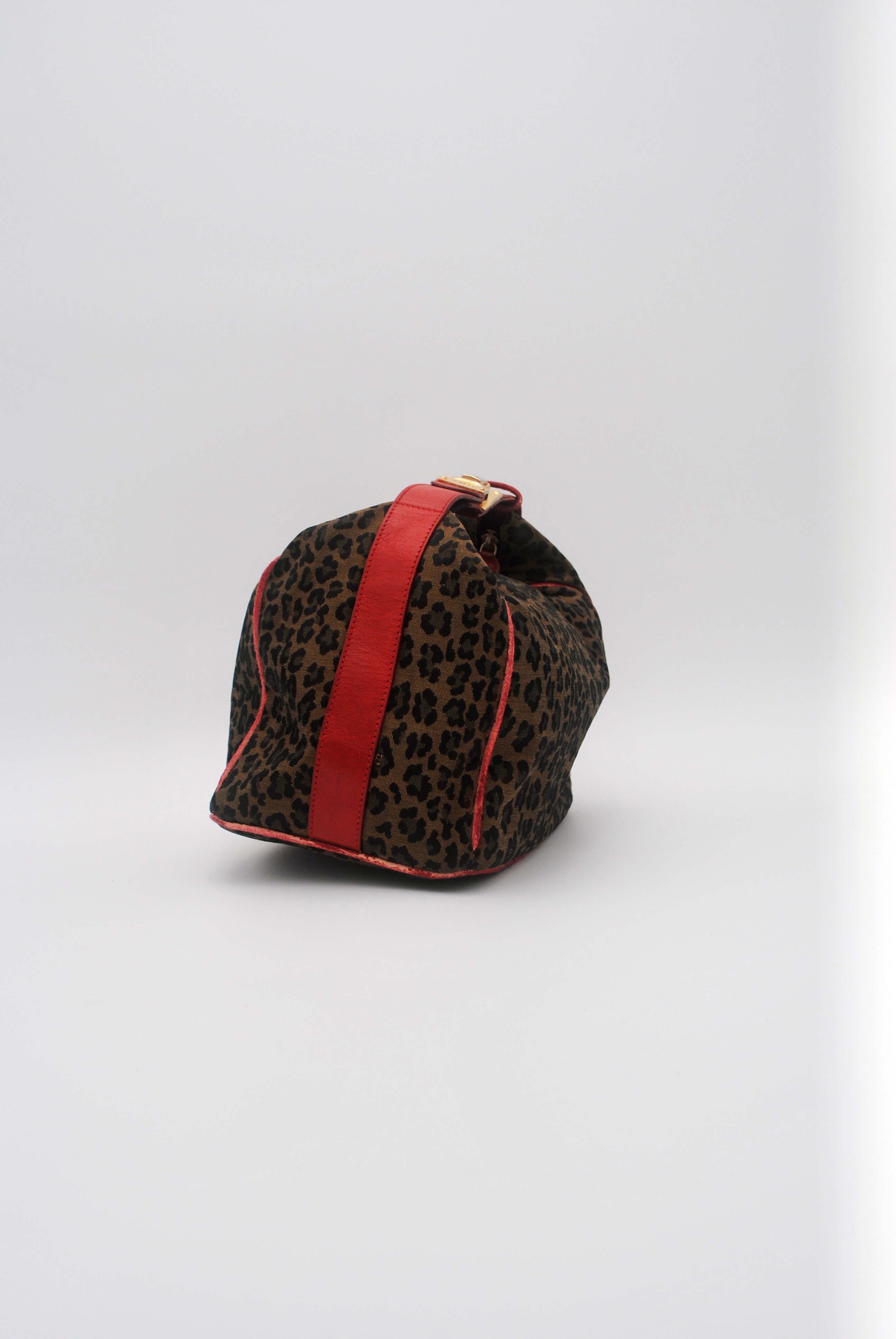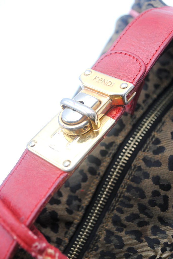 Tweedehands FENDI leopard bag met een rode leren strap met een slotje incl de sleutel, deze werkt ook nog. De tas sluit met een rits en heeft één binnenvakje met rits. Het item verkeert in een vintage staat, met gebruikssporen en wat slijtage. de tas wordt geleverd in onze mooie Moon flower dustbag.